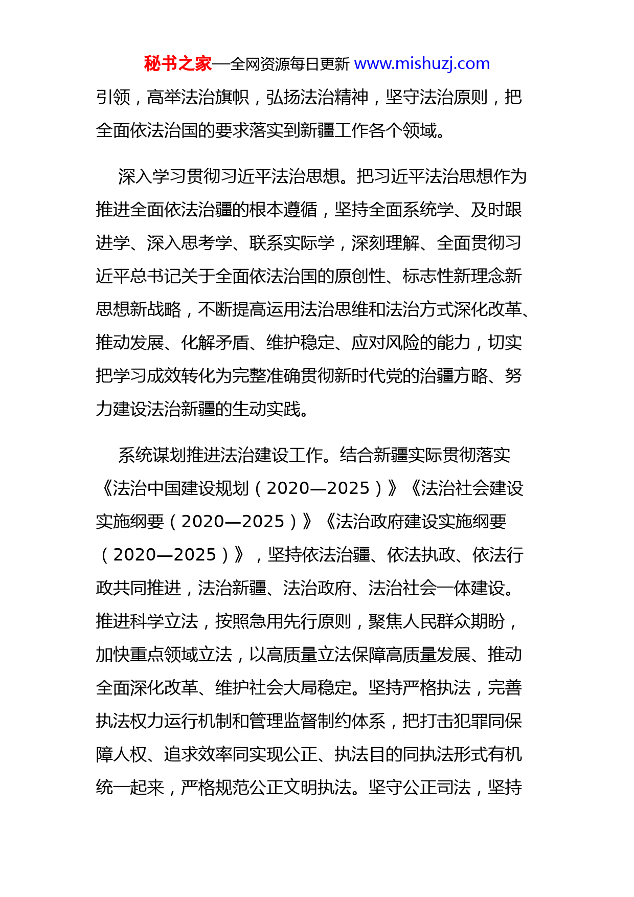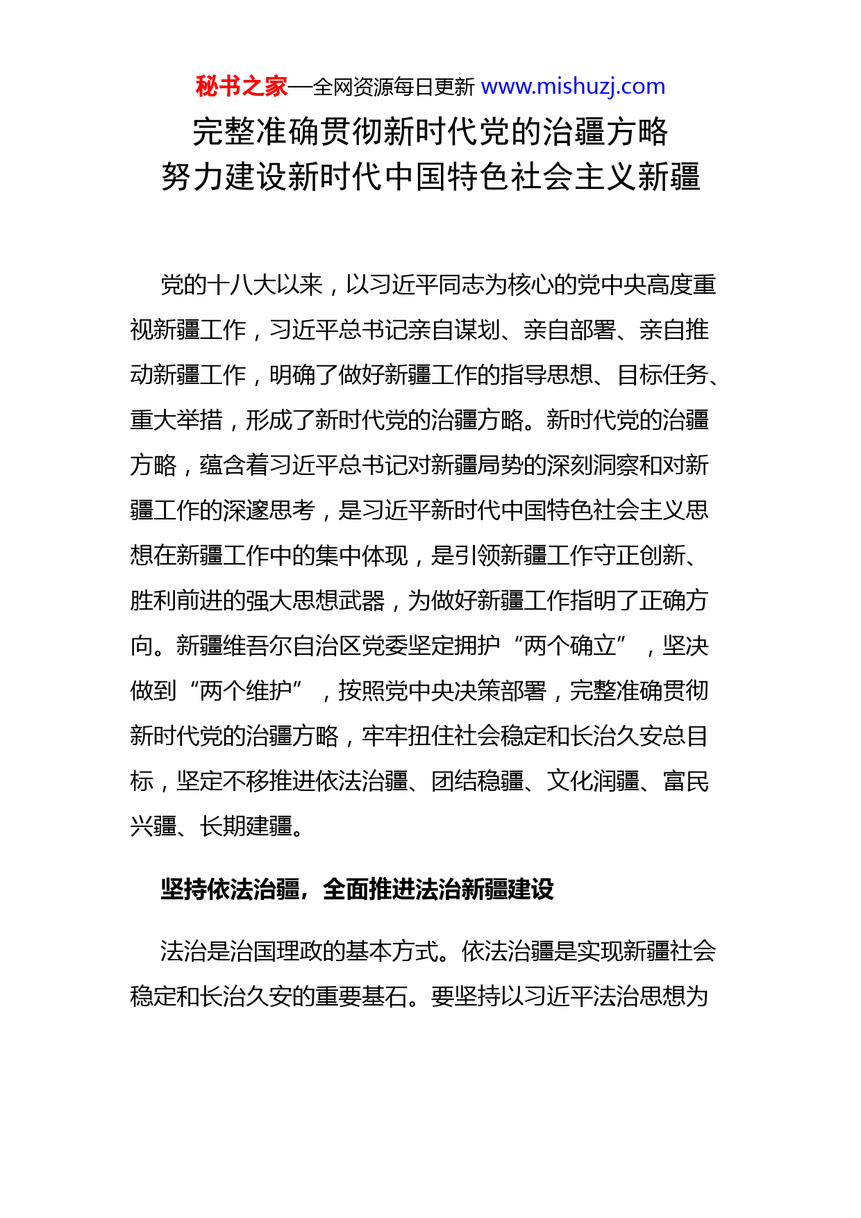 秘书之家—全网资源每日更新www.mishuzj.com完整准确贯彻新时代党的治疆方略努力建设新时代中国特色社会主义新疆党的十八大以来,以习近平同志为核心的党中央高度重视新疆工作,习近平总书记亲自谋划、亲自部署、亲自推动新疆工作,明确了做好新疆工作的指导思想、目标任务、重大举措,形成了新时代党的治疆方略。新时代党的治疆方略,蕴含着习近平总书记对新疆局势的深刻洞察和对新疆工作的深邃思考,是习近平新时代中国特色社会主义思想在新疆工作中的集中体现,是引领新疆工作守正创新、胜利前进的强大思想武器,为做好新疆工作指明了正确方向。新疆维吾尔自治区党委坚定拥护“两个确立”,坚决做到“两个维护”,按照党中央决策部署,完整准确贯彻新时代党的治疆方略,牢牢扭住社会稳定和长治久安总目标,坚定不移推进依法治疆、团结稳疆、文化润疆、富民兴疆、长期建疆。坚持依法治疆,全面推进法治新疆建设法治是治国理政的基本方式。依法治疆是实现新疆社会稳定和长治久安的重要基石。要坚持以习近平法治思想为秘书之家—全网资源每日更新www.mishuzj.com引领,高举法治旗帜,弘扬法治精神,坚守法治原则,把全面依法治国的要求落实到新疆工作各个领域。深入学习贯彻习近平法治思想。把习近平法治思想作为推进全面依法治疆的根本遵循,坚持全面系统学、及时跟进学、深入思考学、联系实际学,深刻理解、全面贯彻习近平总书记关于全面依法治国的原创性、标志性新理念新思想新战略,不断提高运用法治思维和法治方式深化改革、推动发展、化解矛盾、维护稳定、应对风险的能力,切实把学习成效转化为完整准确贯彻新时代党的治疆方略、努力建设法治新疆的生动实践。系统谋划推进法治建设工作。结合新疆实际贯彻落实《法治中国建设规划(2020—2025)》《法治社会建设实施纲要(2020—2025)》《法治政府建设实施纲要(2020—2025)》,坚持依法治疆、依法执政、依法行政共同推进,法治新疆、法治政府、法治社会一体建设。推进科学立法,按照急用先行原则,聚焦人民群众期盼,加快重点领域立法,以高质量立法保障高质量发展、推动全面深化改革、维护社会大局稳定。坚持严格执法,完善执法权力运行机制和管理监督制约体系,把打击犯罪同保障人权、追求效率同实现公正、执法目的同执法形式有机统一起来,严格规范公正文明执法。坚守公正司法,坚持秘书之家—全网资源每日更新www.mishuzj.com以提高司法公信力为根本尺度,深化司法体制改革,让各族群众在每一项法律制度、每一个执法决定、每一宗司法案件中都感受到公平正义。推动全民守法,完善公共法律服务体系、法律援助和司法救助制度,增强各族干部群众的政策观念、法治意识,推动全社会尊法学法守法用法。着力营造良好法治环境。坚持党的领导、人民当家作主、依法治疆有机统一,完善党领导立法、保证执法、支持司法、带头守法制度。抓住领导干部这个“关键少数”,切实发挥引领示范带动作用、带头厉行法治,严格按照法定权限和程序行使权力,提高党员领导干部依法履职的能力和水平。抓好普法宣传和教育培训,在法治实践中持续提升公民法治素养,加强社会主义法治文化建设,积极培育办事依法、遇事找法、解决问题用法、化解矛盾靠法的法治环境。坚持团结稳疆,维护新疆和谐稳定的好局面人心定,长治久安。新疆最大的群众工作就是民族团结和宗教和谐,各族群众最期盼的就是实现社会稳定和长治久安。要坚持以凝聚人心为根本,不断铸牢中华民族共同体意识,不断推进新疆伊斯兰教中国化,不断巩固和发展新疆和谐稳定的好局面。秘书之家—全网资源每日更新www.mishuzj.com推进反恐维稳法治化常态化。坚持依法严打方针,保持对恐怖主义和极端主义犯罪的严打高压态势不动摇,建立完善防范化解重大风险隐患机制,运用法治思维和法治方式防范风险、打击犯罪、处理问题、化解矛盾,形成党委领导、政府负责、社会协同、公众参与、法治保障的社会治理体系,打造共建共治共享的社会治理格局,保持社会大局持续稳定。铸牢中华民族共同体意识。深入学习贯彻习近平总书记关于加强和改进民族工作的重要思想,全面贯彻党的民族政策。加强铸牢中华民族共同体意识研究基地建设,深化中华民族共同体历史、中华民族多元一体格局研究;优化完善“民族团结一家亲”活动,加快构建各民族互嵌式社会结构和社区环境,加强国家通用语言文字教育,有形有感有效促进各民族交往交流交融,让各民族像石榴籽一样紧紧抱在一起。推进新疆伊斯兰教中国化。完整准确贯彻新时代党的宗教工作理论和方针政策,全面贯彻党的宗教工作基本方针,坚持保护合法、制止非法、遏制极端、抵御渗透、打击犯罪,积极引导宗教与社会主义社会相适应。深入推进新疆伊斯兰教中国化,加强党政干部培养培训,提高“导”的本领;落实伊斯兰教教职人员培养培训规划,加强新疆伊秘书之家—全网资源每日更新www.mishuzj.com斯兰教经学院建设,做好高层次人才培养;加强宗教学研究队伍建设,支持伊协更好发挥作用,深化伊斯兰教中国化经学思想建设,深入推进“去极端化”,推动新疆宗教健康发展。坚持文化润疆,深入做好意识形态领域工作文化是一个国家、一个民族的灵魂,文