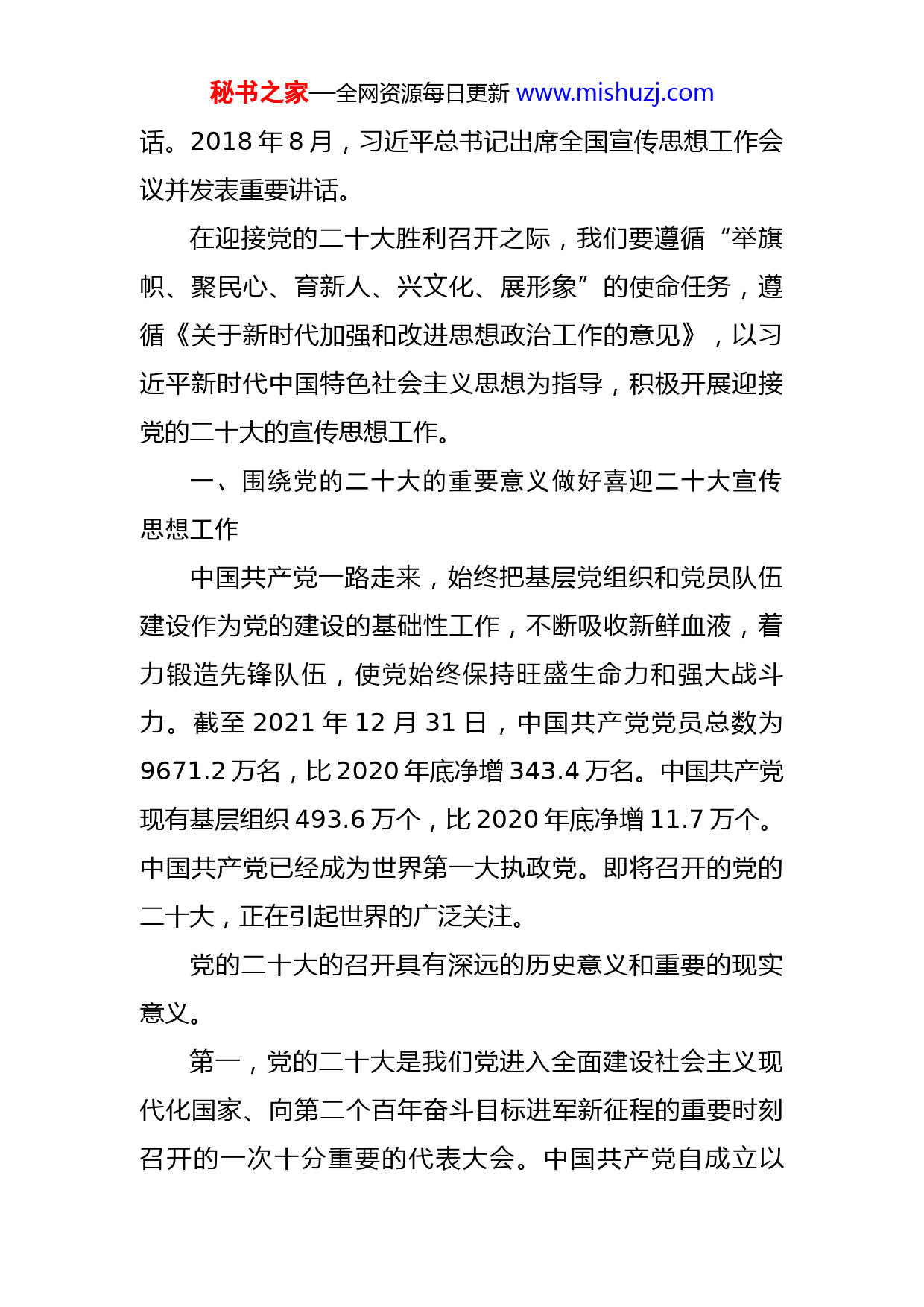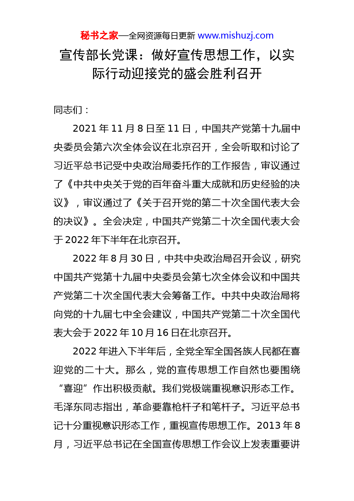 秘书之家—全网资源每日更新www.mishuzj.com宣传部长党课:做好宣传思想工作,以实际行动迎接党的盛会胜利召开同志们:2021年11月8日至11日,中国共产党第十九届中央委员会第六次全体会议在北京召开,全会听取和讨论了习近平总书记受中央政治局委托作的工作报告,审议通过了《中共中央关于党的百年奋斗重大成就和历史经验的决议》,审议通过了《关于召开党的第二十次全国代表大会的决议》。全会决定,中国共产党第二十次全国代表大会于2022年下半年在北京召开。2022年8月30日,中共中央政治局召开会议,研究中国共产党第十九届中央委员会第七次全体会议和中国共产党第二十次全国代表大会筹备工作。中共中央政治局将向党的十九届七中全会建议,中国共产党第二十次全国代表大会于2022年10月16日在北京召开。2022年进入下半年后,全党全军全国各族人民都在喜迎党的二十大。那么,党的宣传思想工作自然也要围绕“喜迎”作出积极贡献。我们党极端重视意识形态工作。毛泽东同志指出,革命要靠枪杆子和笔杆子。习近平总书记十分重视意识形态工作,重视宣传思想工作。2013年8月,习近平总书记在全国宣传思想工作会议上发表重要讲秘书之家—全网资源每日更新www.mishuzj.com话。2018年8月,习近平总书记出席全国宣传思想工作会议并发表重要讲话。在迎接党的二十大胜利召开之际,我们要遵循“举旗帜、聚民心、育新人、兴文化、展形象”的使命任务,遵循《关于新时代加强和改进思想政治工作的意见》,以习近平新时代中国特色社会主义思想为指导,积极开展迎接党的二十大的宣传思想工作。一、围绕党的二十大的重要意义做好喜迎二十大宣传思想工作中国共产党一路走来,始终把基层党组织和党员队伍建设作为党的建设的基础性工作,不断吸收新鲜血液,着力锻造先锋队伍,使党始终保持旺盛生命力和强大战斗力。截至2021年12月31日,中国共产党党员总数为9671.2万名,比2020年底净增343.4万名。中国共产党现有基层组织493.6万个,比2020年底净增11.7万个。中国共产党已经成为世界第一大执政党。即将召开的党的二十大,正在引起世界的广泛关注。党的二十大的召开具有深远的历史意义和重要的现实意义。第一,党的二十大是我们党进入全面建设社会主义现代化国家、向第二个百年奋斗目标进军新征程的重要时刻召开的一次十分重要的代表大会。中国共产党自成立以秘书之家—全网资源每日更新www.mishuzj.com来,始终把为中国人民谋幸福、为中华民族谋复兴作为自己的初心使命。我们党提出“两个一百年”奋斗目标:在中国共产党成立一百年时,全面建成小康社会;在新中国成立一百年时,建成富强民主文明和谐的社会主义现代化国家。第一个百年奋斗目标已胜利实现,创造了世界减贫史上的伟大奇迹。即将召开的党的二十大,是在进入全面建设社会主义现代化国家新征程的关键时刻召开的一次十分重要的大会,具有重要意义。第二,党的二十大是党和国家政治生活中的一件大事喜事。领导我们事业的核心力量是中国共产党。党政军民学,东西南北中,党是领导一切的。执政的中国共产党在带领全国各族人民全面建成小康社会后,就向着全面建设社会主义现代化进军。习近平总书记在省部级主要领导干部“学习习近平总书记重要讲话精神,迎接党的二十大”专题研讨班上发表重要讲话强调,即将召开的党的二十大,是在进入全面建设社会主义现代化国家新征程的关键时刻召开的一次十分重要的大会,将科学谋划未来5年乃至更长时期党和国家事业发展的目标任务和大政方针,事关党和国家事业继往开来,事关中国特色社会主义前途命运,事关中华民族伟大复兴。明确宣示党在新征程上举什么旗、走什么路、以什么样的精神状态、朝着什么样的目标继续前进,对团结和激励全国各族人民为夺取中国特色秘书之家—全网资源每日更新www.mishuzj.com社会主义新胜利而奋斗具有十分重大的意义。历史和现实都证明,没有中国共产党,就没有新中国,就没有中华民族伟大复兴。中国共产党是14亿多人民的领路人、掌舵人、主心骨,即将召开的党的二十大当然是党和国家政治生活中的一件大事喜事。党的宣传思想工作要营造氛围。除传统媒体外,还要充分利用新媒介,入情入理地加以宣传。宣传思想工作者既要会说,又要说好,要把好声音、正能量传播出去,为喜迎党的二十大胜利召开营造良好环境和浓厚氛围。二、围绕“两个确立”做好喜迎二十大宣传思想工作党的十九届六中全会指出:“党确立习近平同志党中央的核心、全党的核心地位,确立习近平新时代中国特色社会主义思想的指导地位,反映了全党全军全国各族人民共同心愿,对新时代党和国家事业发展、对推进中华民族伟大复兴历史进程具有决定性意义。”“两个确立”是党的十八大以来最重要的政治成果。要围绕“两个确立”是理论发展的必然逻辑做好宣传。一个国家、一个民族、一个政党,领导核心至关重要。坚强的领导核心和科学的理论指导,是关乎党和国家前途命运、党和人民事业成败的根本性问题。唯物史观在强调人民群众创造历史的决定作用的同时,也明确承认和充分肯定领袖人物作为人民群众的杰出代表,在推动社会秘书之家—全网资源每日更新www.mishuzj.com变革、历史发展和文明进步中具