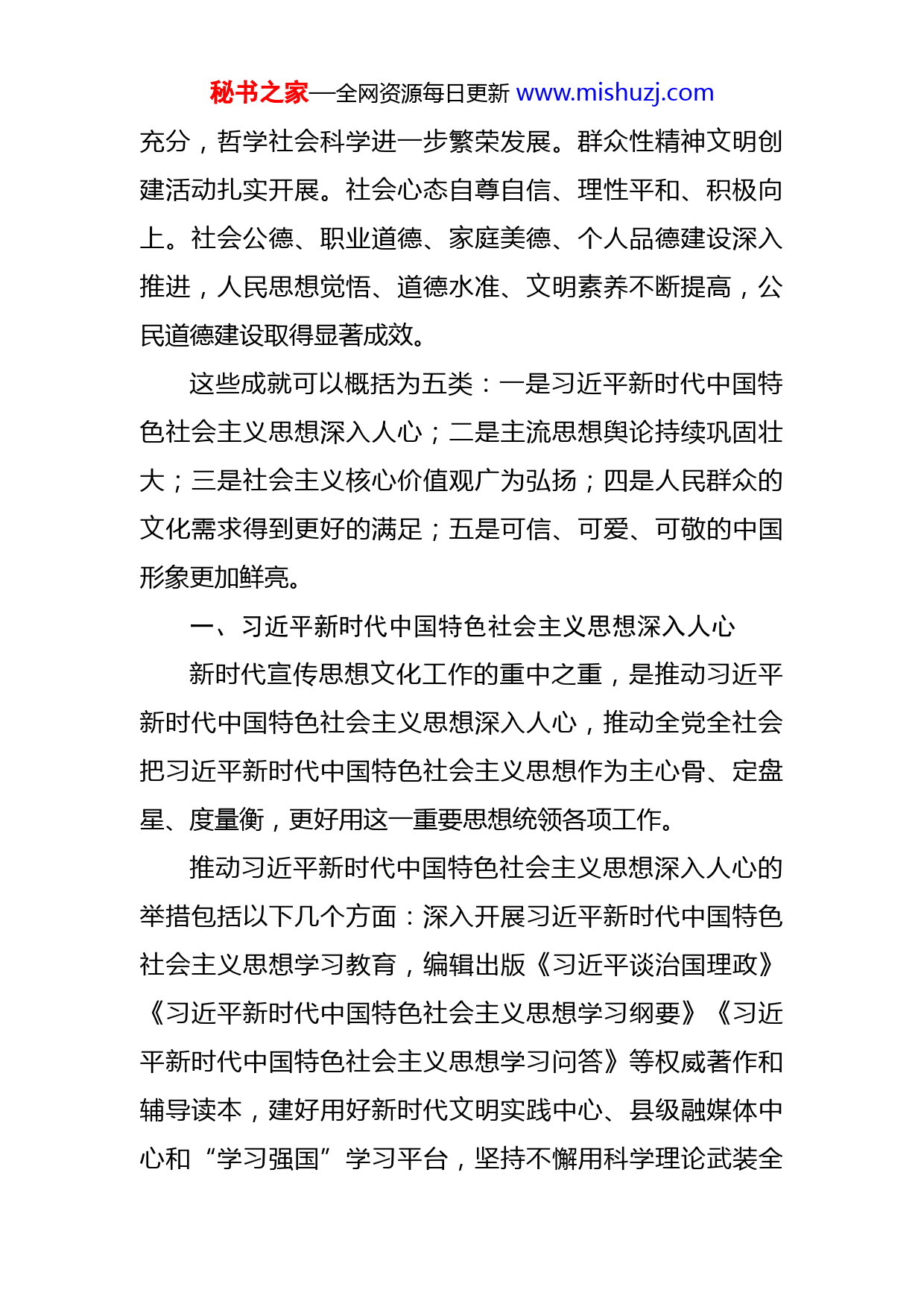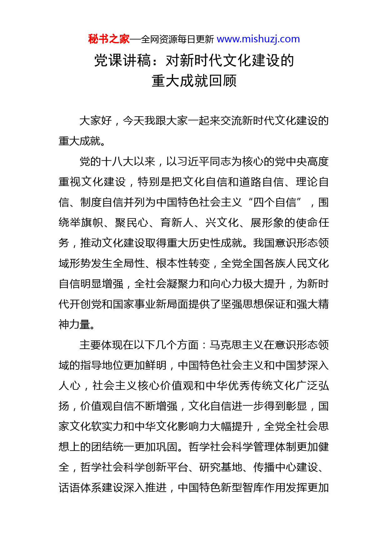 秘书之家—全网资源每日更新www.mishuzj.com党课讲稿:对新时代文化建设的重大成就回顾大家好,今天我跟大家一起来交流新时代文化建设的重大成就。党的十八大以来,以习近平同志为核心的党中央高度重视文化建设,特别是把文化自信和道路自信、理论自信、制度自信并列为中国特色社会主义“四个自信”,围绕举旗帜、聚民心、育新人、兴文化、展形象的使命任务,推动文化建设取得重大历史性成就。我国意识形态领域形势发生全局性、根本性转变,全党全国各族人民文化自信明显增强,全社会凝聚力和向心力极大提升,为新时代开创党和国家事业新局面提供了坚强思想保证和强大精神力量。主要体现在以下几个方面:马克思主义在意识形态领域的指导地位更加鲜明,中国特色社会主义和中国梦深入人心,社会主义核心价值观和中华优秀传统文化广泛弘扬,价值观自信不断增强,文化自信进一步得到彰显,国家文化软实力和中华文化影响力大幅提升,全党全社会思想上的团结统一更加巩固。哲学社会科学管理体制更加健全,哲学社会科学创新平台、研究基地、传播中心建设、话语体系建设深入推进,中国特色新型智库作用发挥更加秘书之家—全网资源每日更新www.mishuzj.com充分,哲学社会科学进一步繁荣发展。群众性精神文明创建活动扎实开展。社会心态自尊自信、理性平和、积极向上。社会公德、职业道德、家庭美德、个人品德建设深入推进,人民思想觉悟、道德水准、文明素养不断提高,公民道德建设取得显著成效。这些成就可以概括为五类:一是习近平新时代中国特色社会主义思想深入人心;二是主流思想舆论持续巩固壮大;三是社会主义核心价值观广为弘扬;四是人民群众的文化需求得到更好的满足;五是可信、可爱、可敬的中国形象更加鲜亮。一、习近平新时代中国特色社会主义思想深入人心新时代宣传思想文化工作的重中之重,是推动习近平新时代中国特色社会主义思想深入人心,推动全党全社会把习近平新时代中国特色社会主义思想作为主心骨、定盘星、度量衡,更好用这一重要思想统领各项工作。推动习近平新时代中国特色社会主义思想深入人心的举措包括以下几个方面:深入开展习近平新时代中国特色社会主义思想学习教育,编辑出版《习近平谈治国理政》《习近平新时代中国特色社会主义思想学习纲要》《习近平新时代中国特色社会主义思想学习问答》等权威著作和辅导读本,建好用好新时代文明实践中心、县级融媒体中心和“学习强国”学习平台,坚持不懈用科学理论武装全秘书之家—全网资源每日更新www.mishuzj.com党、教育人民。通过这些举措,广大干部群众对习近平新时代中国特色社会主义思想的理解更加深入、践行更加自觉。推进新时代文明实践中心建设。新时代文明实践中心建设旨在推动习近平新时代中国特色社会主义思想更加深入人心,进一步加强改进农村基层宣传思想文化工作和精神文明建设,打通宣传群众、教育群众、关心群众、服务群众的“最后一公里”。2018年8月至2019年8月期间,我们在xx等12个省(市)的50个县(市、区)进行了新时代文明实践中心建设试点工作。在试点工作基础上,逐步推开新时代文明实践中心建设。建设“学习强国”学习平台。这是贯彻落实习近平总书记关于加强学习、建设学习大国重要指示精神、推动全党大学习的有力抓手,是新形势下强化理论武装和思想教育的创新探索,是推动习近平新时代中国特色社会主义思想学习宣传贯彻不断深入的重要举措。“学习强国”学习平台是由中共中央宣传部主管,以习近平新时代中国特色社会主义思想和党的十九大精神等为主要内容,立足全体党员、面向全社会的优质平台。2019年1月1日,“学习强国”学习平台在全国上线。2019年2月17日上午,“学习强国”北京平台完成各项测试准备,在PC端和手机客户端正式同步上线。2019年2月28日,“学习强国”秘书之家—全网资源每日更新www.mishuzj.com上海学习平台在PC端、手机客户端正式上线。坚持不懈用习近平新时代中国特色社会主义思想教育党员干部,坚持集中教育和经常性教育相结合,持续抓好全党习近平新时代中国特色社会主义思想学习教育。党的十八大以来,我们先后开展了5次集中学习教育。2013年6月开始,以为民务实清廉为主要内容,党的群众路线教育实践活动自上而下分两批开展;2015年开始,围绕“严以修身、严以用权、严以律己,谋事要实、创业要实、做人要实”要求,“三严三实”专题教育在县处级以上领导干部中开展,推动党的群众路线教育实践活动延展深化;2016年开始,“学党章党规、学系列讲话,做合格党员”学习教育在全体党员中开展,党内教育从“关键少数”向广大党员拓展、从集中性教育向经常性教育延伸;2019年5月底开始,以“守初心、担使命,找差距、抓落实”为总要求,以县处级以上领导干部为重点,“不忘初心、牢记使命”主题教育在全党开展;2021年开始,党史学习教育在全党开展,要求做到学史明理、学史增信、学史崇德、学史力行,教育引导全党同志学党史、悟思想、办实事、开新局。另外,2022年3月,中共中央办公厅印发《关于推动党史学习教育常态化长效化的意见》。党的十八大以来的历次集中教育活动,都以思想教育打头,着力解决学习不深入、思想不统一、行动跟不