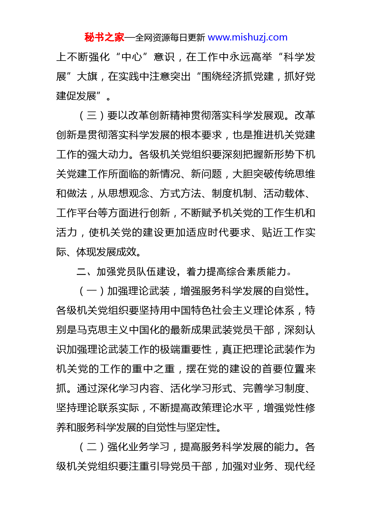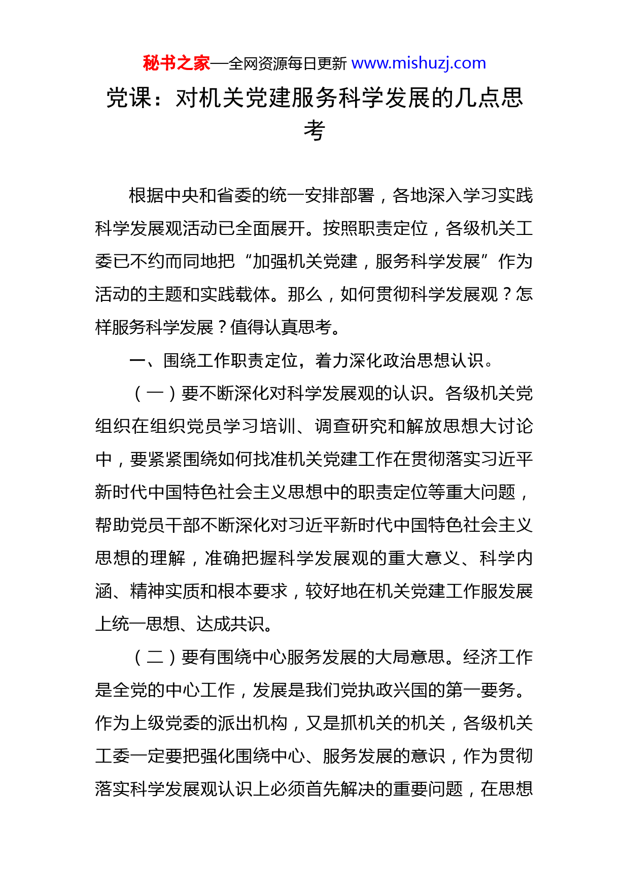 秘书之家—全网资源每日更新www.mishuzj.com党课:对机关党建服务科学发展的几点思考根据中央和省委的统一安排部署,各地深入学习实践科学发展观活动已全面展开。按照职责定位,各级机关工委已不约而同地把“加强机关党建,服务科学发展”作为活动的主题和实践载体。那么,如何贯彻科学发展观?怎样服务科学发展?值得认真思考。一、围绕工作职责定位,着力深化政治思想认识。(一)要不断深化对科学发展观的认识。各级机关党组织在组织党员学习培训、调查研究和解放思想大讨论中,要紧紧围绕如何找准机关党建工作在贯彻落实习近平新时代中国特色社会主义思想中的职责定位等重大问题,帮助党员干部不断深化对习近平新时代中国特色社会主义思想的理解,准确把握科学发展观的重大意义、科学内涵、精神实质和根本要求,较好地在机关党建工作服发展上统一思想、达成共识。(二)要有围绕中心服务发展的大局意思。经济工作是全党的中心工作,发展是我们党执政兴国的第一要务。作为上级党委的派出机构,又是抓机关的机关,各级机关工委一定要把强化围绕中心、服务发展的意识,作为贯彻落实科学发展观认识上必须首先解决的重要问题,在思想秘书之家—全网资源每日更新www.mishuzj.com上不断强化“中心”意识,在工作中永远高举“科学发展”大旗,在实践中注意突出“围绕经济抓党建,抓好党建促发展”。(三)要以改革创新精神贯彻落实科学发展观。改革创新是贯彻落实科学发展的根本要求,也是推进机关党建工作的强大动力。各级机关党组织要深刻把握新形势下机关党建工作所面临的新情况、新问题,大胆突破传统思维和做法,从思想观念、方式方法、制度机制、活动载体、工作平台等方面进行创新,不断赋予机关党的工作生机和活力,使机关党的建设更加适应时代要求、贴近工作实际、体现发展成效。二、加强党员队伍建设,着力提高综合素质能力。(一)加强理论武装,增强服务科学发展的自觉性。各级机关党组织要坚持用中国特色社会主义理论体系,特别是马克思主义中国化的最新成果武装党员干部,深刻认识加强理论武装工作的极端重要性,真正把理论武装作为机关党的工作的重中之重,摆在党的建设的首要位置来抓。通过深化学习内容、活化学习形式、完善学习制度、坚持理论联系实际,不断提高政策理论水平,增强党性修养和服务科学发展的自觉性与坚定性。(二)强化业务学习,提高服务科学发展的能力。各级机关党组织要注重引导党员干部,加强对业务、现代经秘书之家—全网资源每日更新www.mishuzj.com济、科技、社会管理和法律知识的学习,不断提高贯彻落实科学发展观的能力,增强驾驭市场经济的能力、推进自主创新的组织领导能力、管理社会的能力和依法办事的能力,努力促进经济社会又好又快发展。三、谋划机关党的建设,着力夯实为民服务基础。(一)要围绕科学发展来谋划机关党建工作。科学发展是当前一切工作的重中之重。机关党建工作在确定思路、部署任务、研究措施、推动落实上,都要自觉地围绕科学发展来思考、来谋划、来实施。否则,机关党建就难以有所作为。因此,我们在确定工作思路时,一定要有中心意识、发展意识、服务意识,这种意识,应体现在“加强机关党建,服务科学发展”上,机关党组织的全部工作都必须为实现科学发展服务,与经济工作合拍,找准党建工作为经济工作服务的结合点和切入点,全方位的服从、服务于经济建设这个中心,充分发挥党组织为经济建设的保证作用。(二)要下大力气抓好机关党的组织建设。本人认为,机关党建工作服务科学发展是通过机关党的组织实现的,机关党的组织建设是基础。因此,各级机关工委只有下大力气抓好机关党的组织建设,夯实基础,才能更好地把机关党的组织资源转化为发展资源,组织优势转化为发展优势,组织活力转化为发展活力,从而为科学发展提供秘书之家—全网资源每日更新www.mishuzj.com坚强保障。当前,务必要以开展深入学习实践科学发展观活动为契机,以创建“党建工作先进单位”和“五好”党支部为抓手,大胆开拓,真抓实干,高质量、高标准地完成机关党建各项工作任务,努力把各级机关党组织建设成为贯彻习近平新时代中国特色社会主义思想、服务科学发展的表率机关。四、广泛深入征求意见,着力查找相关工作问题。(一)征求意见,找准问题。在分析检查阶段,各级机关工委应通过发放征求意见表、意见函和召开座谈会等多种形式,广泛深入地征求方方面面的意见、建议,找准影响和制约本单位科学发展的突出问题,影响社会和谐稳定的突出问题,党性党风党纪方面群众反映强烈的突出问题。领导班子要对这些意见和建议进行认真梳理,深入分析形成问题的主客观原因,特别是主观原因,理清科学发展思路,形成领导班子贯彻落实习近平新时代中国特色社会主义情况分析检查报告,并在一定范围内公布,组织党员、群众进行评议。(二)坚持整改,抓好落实。问题找准以后,各级机关工委领导班子要及时制定整改方案,明确责任、措施和时限,抓好整改落实,集中解决突出问题,完善体制机制,扫除服务科学发展的障碍。在整个学习实践活动中,要坚持把“边学边改、边查边改、边整边改”贯穿始终。秘书之家—全网资源每日更新www.mishuzj.com五、规范