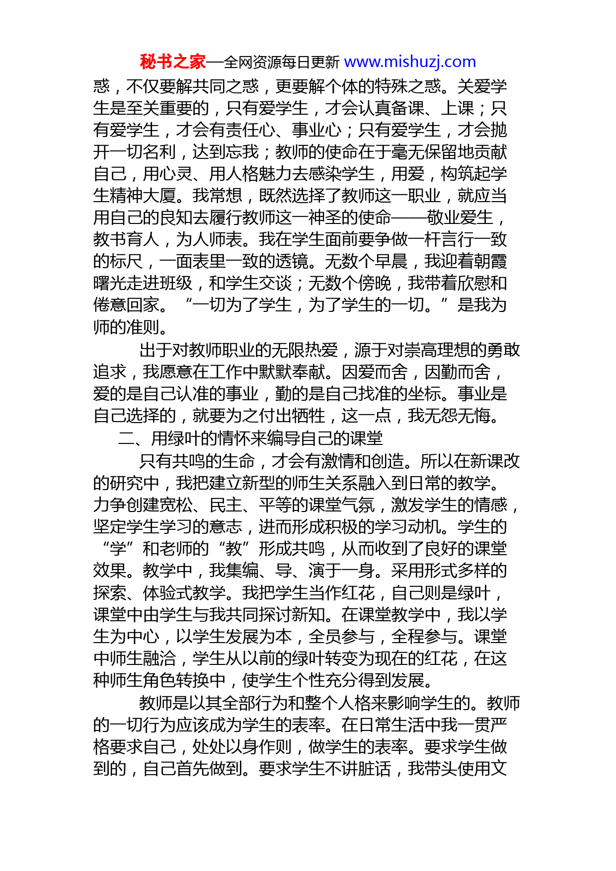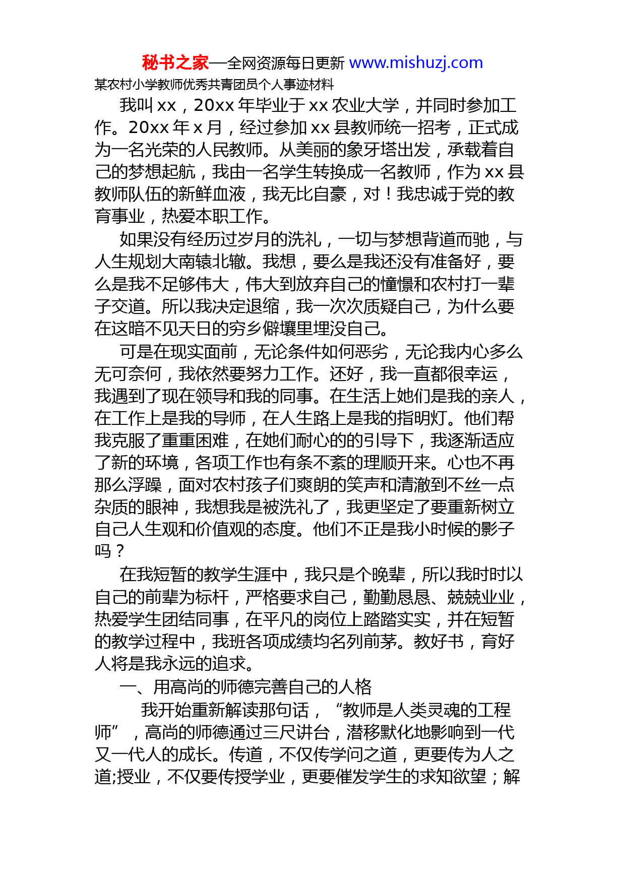 秘书之家—全网资源每日更新www.mishuzj.com某农村小学教师优秀共青团员个人事迹材料我叫xx,20xx年毕业于xx农业大学,并同时参加工作。20xx年x月,经过参加xx县教师统一招考,正式成为一名光荣的人民教师。从美丽的象牙塔出发,承载着自己的梦想起航,我由一名学生转换成一名教师,作为xx县教师队伍的新鲜血液,我无比自豪,对!我忠诚于党的教育事业,热爱本职工作。如果没有经历过岁月的洗礼,一切与梦想背道而驰,与人生规划大南辕北辙。我想,要么是我还没有准备好,要么是我不足够伟大,伟大到放弃自己的憧憬和农村打一辈子交道。所以我决定退缩,我一次次质疑自己,为什么要在这暗不见天日的穷乡僻壤里埋没自己。可是在现实面前,无论条件如何恶劣,无论我内心多么无可奈何,我依然要努力工作。还好,我一直都很幸运,我遇到了现在领导和我的同事。在生活上她们是我的亲人,在工作上是我的导师,在人生路上是我的指明灯。他们帮我克服了重重困难,在她们耐心的的引导下,我逐渐适应了新的环境,各项工作也有条不紊的理顺开来。心也不再那么浮躁,面对农村孩子们爽朗的笑声和清澈到不丝一点杂质的眼神,我想我是被洗礼了,我更坚定了要重新树立自己人生观和价值观的态度。他们不正是我小时候的影子吗?在我短暂的教学生涯中,我只是个晚辈,所以我时时以自己的前辈为标杆,严格要求自己,勤勤恳恳、兢兢业业,热爱学生团结同事,在平凡的岗位上踏踏实实,并在短暂的教学过程中,我班各项成绩均名列前茅。教好书,育好人将是我永远的追求。一、用高尚的师德完善自己的人格我开始重新解读那句话,“教师是人类灵魂的工程师”,高尚的师德通过三尺讲台,潜移默化地影响到一代又一代人的成长。传道,不仅传学问之道,更要传为人之道;授业,不仅要传授学业,更要催发学生的求知欲望;解秘书之家—全网资源每日更新www.mishuzj.com惑,不仅要解共同之惑,更要解个体的特殊之惑。关爱学生是至关重要的,只有爱学生,才会认真备课、上课;只有爱学生,才会有责任心、事业心;只有爱学生,才会抛开一切名利,达到忘我;教师的使命在于毫无保留地贡献自己,用心灵、用人格魅力去感染学生,用爱,构筑起学生精神大厦。我常想,既然选择了教师这一职业,就应当用自己的良知去履行教师这一神圣的使命——敬业爱生,教书育人,为人师表。我在学生面前要争做一杆言行一致的标尺,一面表里一致的透镜。无数个早晨,我迎着朝霞曙光走进班级,和学生交谈;无数个傍晚,我带着欣慰和倦意回家。“一切为了学生,为了学生的一切。”是我为师的准则。出于对教师职业的无限热爱,源于对崇高理想的勇敢追求,我愿意在工作中默默奉献。因爱而舍,因勤而舍,爱的是自己认准的事业,勤的是自己找准的坐标。事业是自己选择的,就要为之付出牺牲,这一点,我无怨无悔。二、用绿叶的情怀来编导自己的课堂只有共鸣的生命,才会有激情和创造。所以在新课改的研究中,我把建立新型的师生关系融入到日常的教学。力争创建宽松、民主、平等的课堂气氛,激发学生的情感,坚定学生学习的意志,进而形成积极的学习动机。学生的“学”和老师的“教”形成共鸣,从而收到了良好的课堂效果。教学中,我集编、导、演于一身。采用形式多样的探索、体验式教学。我把学生当作红花,自己则是绿叶,课堂中由学生与我共同探讨新知。在课堂教学中,我以学生为中心,以学生发展为本,全员参与,全程参与。课堂中师生融洽,学生从以前的绿叶转变为现在的红花,在这种师生角色转换中,使学生个性充分得到发展。教师是以其全部行为和整个人格来影响学生的。教师的一切行为应该成为学生的表率。在日常生活中我一贯严格要求自己,处处以身作则,做学生的表率。要求学生做到的,自己首先做到。要求学生不讲脏话,我带头使用文秘书之家—全网资源每日更新www.mishuzj.com明用语。寒冷冬日,我带头提前到校,开始时,往往是我第一个进入班级,后来,比我早的学生越来越多,整个上学期,很少有学生早读迟到。劳动、清扫我也干在前面。教育学生实事求是,自己被学生难住时,绝不装腔作势;要求学生按时完成作业,我首先做到及时批改每一份作业和试卷。要求学生讲卫生,我从不在班级吐一口痰,要求学生节简,我和学生一起将易拉罐,矿泉水瓶收集后卖出……这些做法对学生形成良好的思想品质和道德起到了潜移默化的作用,不少学生在周记中写道:“老师使我明白了不少东西,令我受益匪浅。”面对多元文化和社会对教育的冲击,面对学生日趋复杂的思想和多样的心理,仅靠对学生的关爱,仅靠时间与汗水的付出,是难以为继的。我深深的懂得,教师的职责体现在对学生的关爱,对事业的奉献,更体现在教师的专业化发展。钻研教材,研究学情,提高业务水平,是我从教以来不懈的追求。人们都说:若想给学生一杯水,教师应有一桶水。但我却力求教会学生自己去挖水。为此,我从毕业至今从未间断过自我学习、自我充电、自我加压,并珍惜每一个得来不易的学习机会,我主动积极地参与听课、评课,一丝不苟、力争尽善尽美地上好每一节实践课,获得了我校师生的一致好评。作为教师队伍明日的骨干力量,我最迫切的就是要做到克服一切困难,树立不怕吃苦,勇于向前的工作精神。作为教师队伍的高素质人才,