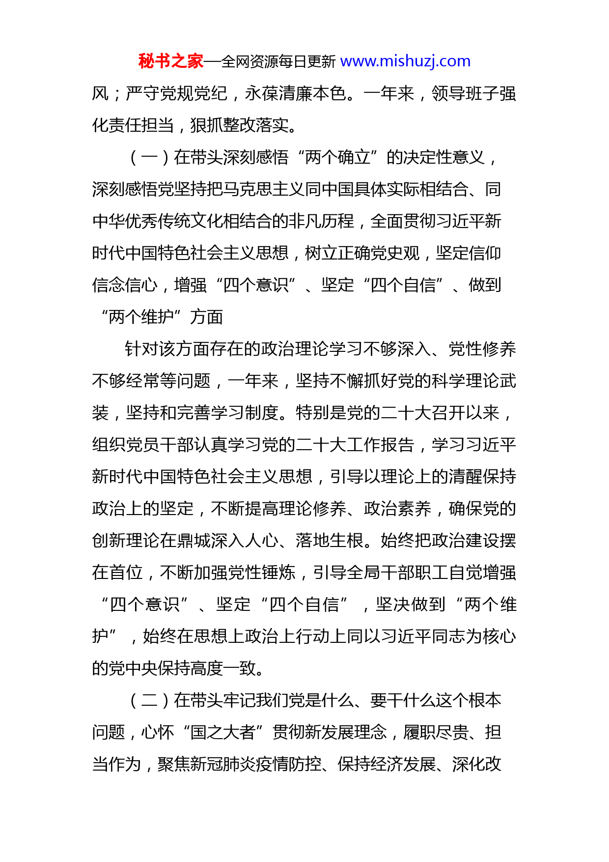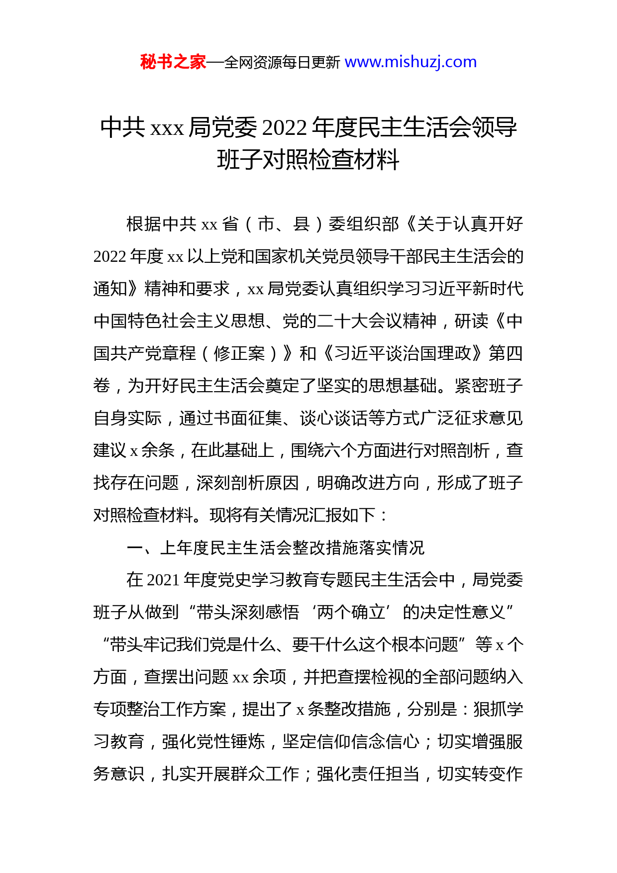 秘书之家—全网资源每日更新www.mishuzj.com中共xxx局党委2022年度民主生活会领导班子对照检查材料根据中共xx省(市、县)委组织部《关于认真开好2022年度xx以上党和国家机关党员领导干部民主生活会的通知》精神和要求,xx局党委认真组织学习习近平新时代中国特色社会主义思想、党的二十大会议精神,研读《中国共产党章程(修正案)》和《习近平谈治国理政》第四卷,为开好民主生活会奠定了坚实的思想基础。紧密班子自身实际,通过书面征集、谈心谈话等方式广泛征求意见建议x余条,在此基础上,围绕六个方面进行对照剖析,查找存在问题,深刻剖析原因,明确改进方向,形成了班子对照检查材料。现将有关情况汇报如下:一、上年度民主生活会整改措施落实情况在2021年度党史学习教育专题民主生活会中,局党委班子从做到“带头深刻感悟‘两个确立’的决定性意义”“带头牢记我们党是什么、要干什么这个根本问题”等x个方面,查摆出问题xx余项,并把查摆检视的全部问题纳入专项整治工作方案,提出了x条整改措施,分别是:狠抓学习教育,强化党性锤炼,坚定信仰信念信心;切实增强服务意识,扎实开展群众工作;强化责任担当,切实转变作秘书之家—全网资源每日更新www.mishuzj.com风;严守党规党纪,永葆清廉本色。一年来,领导班子强化责任担当,狠抓整改落实。(一)在带头深刻感悟“两个确立”的决定性意义,深刻感悟党坚持把马克思主义同中国具体实际相结合、同中华优秀传统文化相结合的非凡历程,全面贯彻习近平新时代中国特色社会主义思想,树立正确党史观,坚定信仰信念信心,增强“四个意识”、坚定“四个自信”、做到“两个维护”方面针对该方面存在的政治理论学习不够深入、党性修养不够经常等问题,一年来,坚持不懈抓好党的科学理论武装,坚持和完善学习制度。特别是党的二十大召开以来,组织党员干部认真学习党的二十大工作报告,学习习近平新时代中国特色社会主义思想,引导以理论上的清醒保持政治上的坚定,不断提高理论修养、政治素养,确保党的创新理论在鼎城深入人心、落地生根。始终把政治建设摆在首位,不断加强党性锤炼,引导全局干部职工自觉增强“四个意识”、坚定“四个自信”,坚决做到“两个维护”,始终在思想上政治上行动上同以习近平同志为核心的党中央保持高度一致。(二)在带头牢记我们党是什么、要干什么这个根本问题,心怀“国之大者”贯彻新发展理念,履职尽贵、担当作为,聚焦新冠肺炎疫情防控、保持经济发展、深化改秘书之家—全网资源每日更新www.mishuzj.com革开放、维护社会稳定等正在做的工作,不折不扣把党中央决策部署落实到位方面坚持强化对初心使命的学习和认识,通过中心组学习、专题辅导学习、个人自学等方式,引领班子成员站在党和国家事业发展大局来思考,确保学习走深走实。坚持从严从实抓好整改落实,坚持问题导向,积极整改民主生活会上检视出的突出问题,制定整改方案,建立问题清单、整改清单、责任清单,实行销号管理,把各项整改措施不折不扣落到实处。(三)在带头践行以人民为中心的发展思想,尊重群众意愿,为群众办实事解难题,有效保障改善民生,增强人民群众获得感幸福感安全感,确保党永远保持同人民群众的血肉联系方面持续整治形式主义、官僚主义突出表现,改进领导机关工作指导方式,规范会议、文电、记录,统筹下基层工作组数量和频次,进一步正规基层秩序,下大力气解决“五多”问题,切实为基层减负。常态化深入基层,倾听人民群众呼声,了解诉求,朝着人民群众反映强烈、制约xx建设发展的问题上使劲,尽心竭力地帮助解决实际困难,进一步提高了服务能力与水平。(四)在带头学习运用党在不同历史时期成功应对风险挑战的丰富经验,增强忧患意识,保持战略定力,提高秘书之家—全网资源每日更新www.mishuzj.com能力本领,敢于斗争、善于斗争,不断取得新的胜利和荣光方面坚定不移地转变能力作风。始终注重加强领导班子自身能力建设,对标新形势、新定位,主动深入学习上级的各项政策和指示要求、学习省市内兄弟单位的优势长处、学习基层单位的创新思路和做法,不断提升工作的档次和水平。针对担当意识不够强烈、忧患意识淡化、责任意识不强等问题,要求班子成员及党员干部要认真贯彻落实市xx会议确立的xxx重大战略部署,敢于担当,靠前站位,在改革发展中积极探索符合实际、解决问题的举措。(五)在带头深刻汲取党史中正反两方面经验,履行全面从严治党责任,旗帜鲜明讲政治,严守党的政治纪律和政治规矩,落实中央八项规定及其实施细则精神,持续用力纠“四风”、树新风,坚决反对形式主义官僚主义,加强对“一把手”监督和领导班子监督,坚决同一切违规违纪违法现象作斗争方面针对认识不够高、从严要求不够等问题,要求班子成员和全体党员干部认真锤炼党性,驰而不息改进工作作风坚决把全面从严治党要求落实到正风肃纪、廉洁自律上,锲而不舍抓好中央八项规定及其实施细则精神的落实,驰而不息反“四风”、转作风、树新风,加快建设法治政府服务型政府、诚信政府、廉洁政府,巩固提升风清气正的秘书之家—全网资源每日更新www.mishuzj.com良好政治生态。目前,领导班子和班子成员个人的问题整改工作已按照规定的时间节点完成。二、存在