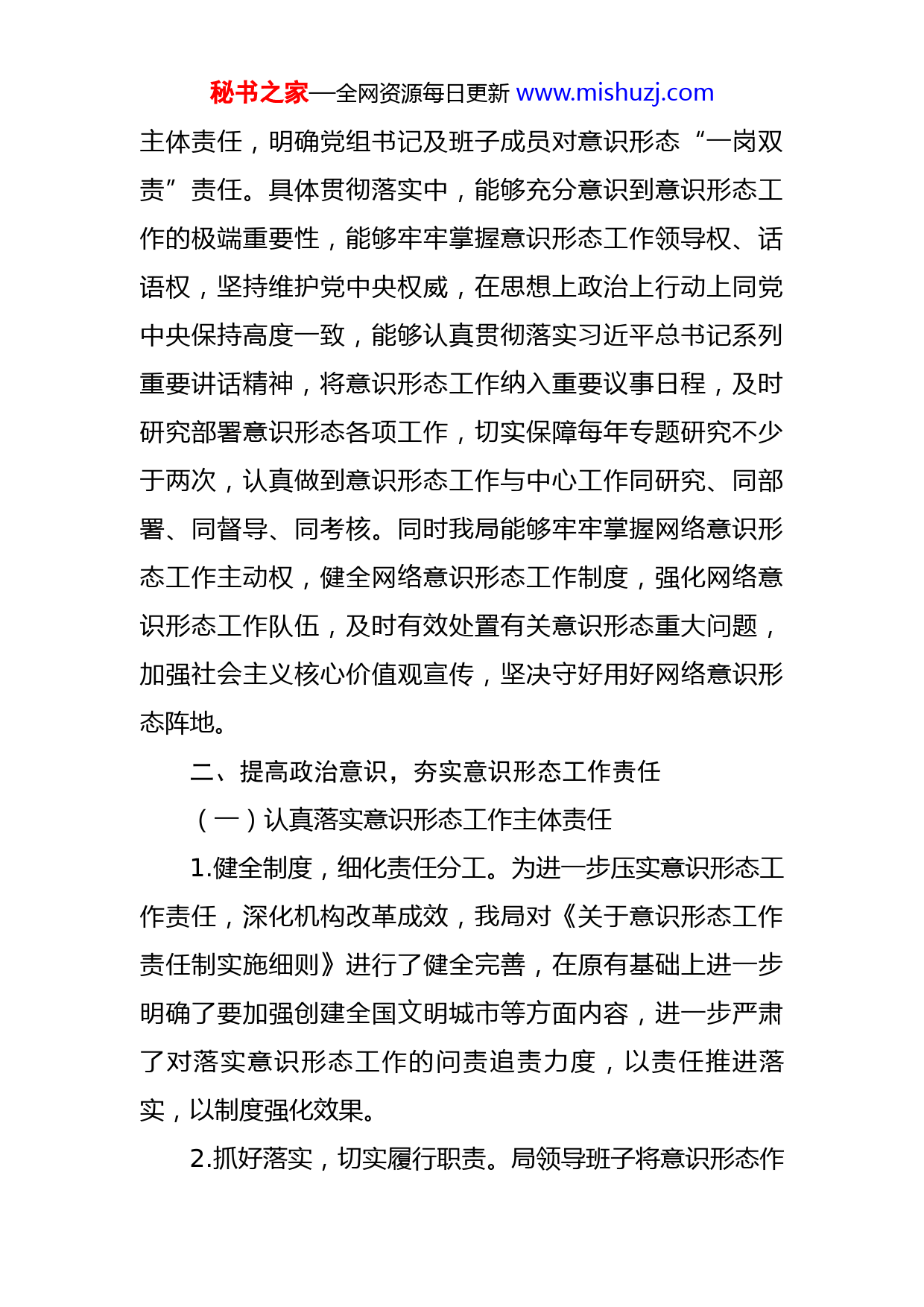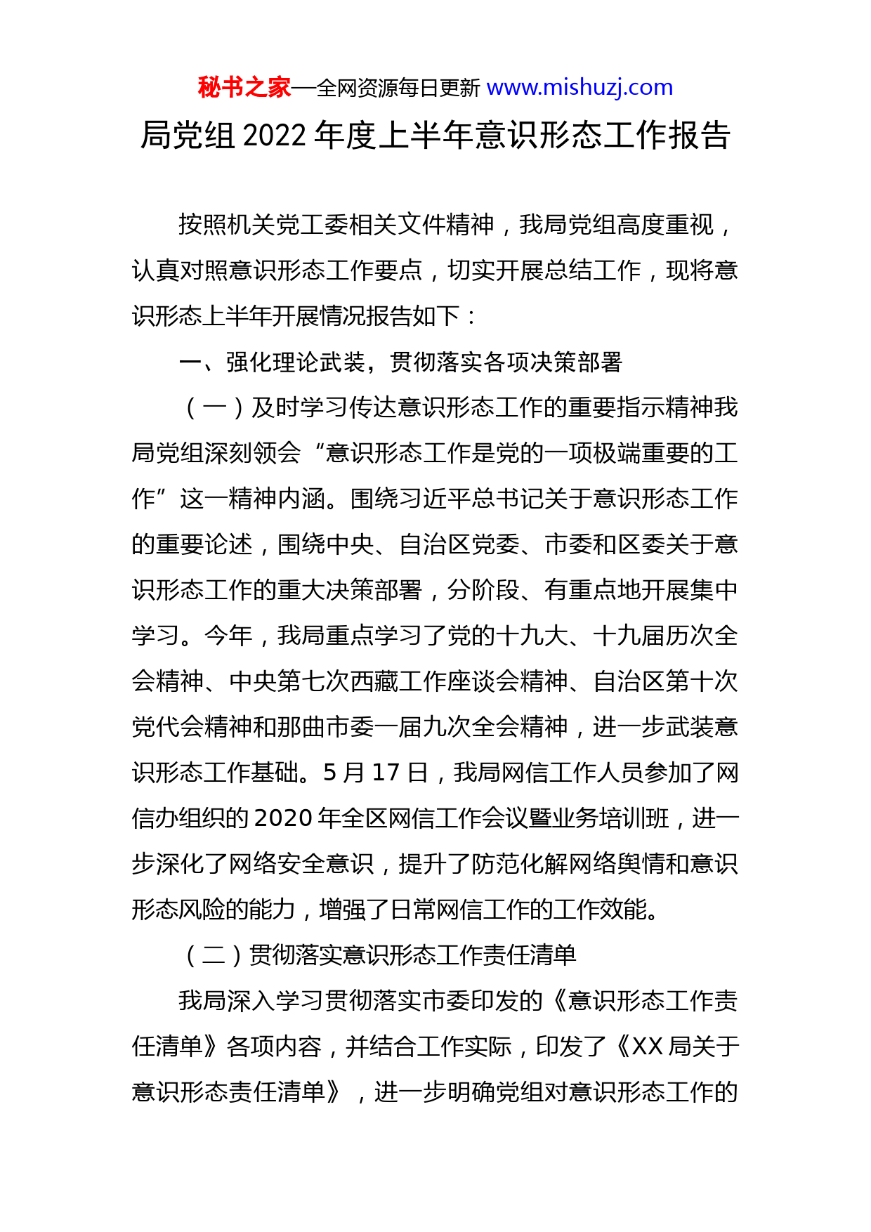 秘书之家—全网资源每日更新www.mishuzj.com局党组2022年度上半年意识形态工作报告按照机关党工委相关文件精神,我局党组高度重视,认真对照意识形态工作要点,切实开展总结工作,现将意识形态上半年开展情况报告如下:一、强化理论武装,贯彻落实各项决策部署(一)及时学习传达意识形态工作的重要指示精神我局党组深刻领会“意识形态工作是党的一项极端重要的工作”这一精神内涵。围绕习近平总书记关于意识形态工作的重要论述,围绕中央、自治区党委、市委和区委关于意识形态工作的重大决策部署,分阶段、有重点地开展集中学习。今年,我局重点学习了党的十九大、十九届历次全会精神、中央第七次西藏工作座谈会精神、自治区第十次党代会精神和那曲市委一届九次全会精神,进一步武装意识形态工作基础。5月17日,我局网信工作人员参加了网信办组织的2020年全区网信工作会议暨业务培训班,进一步深化了网络安全意识,提升了防范化解网络舆情和意识形态风险的能力,增强了日常网信工作的工作效能。(二)贯彻落实意识形态工作责任清单我局深入学习贯彻落实市委印发的《意识形态工作责任清单》各项内容,并结合工作实际,印发了《XX局关于意识形态责任清单》,进一步明确党组对意识形态工作的秘书之家—全网资源每日更新www.mishuzj.com主体责任,明确党组书记及班子成员对意识形态“一岗双责”责任。具体贯彻落实中,能够充分意识到意识形态工作的极端重要性,能够牢牢掌握意识形态工作领导权、话语权,坚持维护党中央权威,在思想上政治上行动上同党中央保持高度一致,能够认真贯彻落实习近平总书记系列重要讲话精神,将意识形态工作纳入重要议事日程,及时研究部署意识形态各项工作,切实保障每年专题研究不少于两次,认真做到意识形态工作与中心工作同研究、同部署、同督导、同考核。同时我局能够牢牢掌握网络意识形态工作主动权,健全网络意识形态工作制度,强化网络意识形态工作队伍,及时有效处置有关意识形态重大问题,加强社会主义核心价值观宣传,坚决守好用好网络意识形态阵地。二、提高政治意识,夯实意识形态工作责任(一)认真落实意识形态工作主体责任1.健全制度,细化责任分工。为进一步压实意识形态工作责任,深化机构改革成效,我局对《关于意识形态工作责任制实施细则》进行了健全完善,在原有基础上进一步明确了要加强创建全国文明城市等方面内容,进一步严肃了对落实意识形态工作的问责追责力度,以责任推进落实,以制度强化效果。2.抓好落实,切实履行职责。局领导班子将意识形态作秘书之家—全网资源每日更新www.mishuzj.com为基层党的建设的重要内容,切实履行意识形态工作责任制,党组书记作为意识形态工作“第一责任人”,切实担负起意识形态工作的主体责任,做到“三个带头三个亲自”,既“带头抓意识形态,带头管阵地、把导向、强队伍,带头批评错误观点和错误倾向”、“重要工作亲自部署、重大问题亲自过问、重要案件亲自督办”。同时党组成员认真履行“一岗双责”职责,积极指导二层单位开展意识形态工作,并组织开展意识形态专项督查,补足短板,提升基层意识形态工作水平。(二)严格执行意识形态工作报告制度我局能够认真执行区委关于意识形态工作的各项要求。一是严格执行半年总结汇报制度。结合工作实际,每半年对意识形态工作进行小结分析,保证阶段任务如期开展,工作效果达到预期,工作经验及时总结,并形成正式文件上报至市委宣传部备案。二是严格开展述职对照。党组班子及成员能够将意识形态作为民主生活会和年终述职述廉的重要内容,对标对表找差距,担当作为抓落实,以意识形态工作要点为对照,以整改台账、限时整改为方式,切实解决工作中存在的问题。三是严格开展意识形态工作责任制自查。每年以工作总结的形式,对党组、党组书记及党组班子成员落实意识形态形态工作责任制开展自查,并将自查结果向区委宣传部报告。秘书之家—全网资源每日更新www.mishuzj.com三、严格审查审核,切实管好意识形态阵地根据《XX意识形态阵地管理办法》,我局严格管理学习讲堂、党员活动室等意识形态阵地,本着“谁主办,谁负责”的原则,对学习讲堂、大型会议的会议实行“申报、审批、备案”制度,并在会议过程中认真执行记录纪实,履行好监督职责,切实做到守土有责、守土负责、守土尽责。四、发挥带头引领,妥善报告处置重大问题党组班子始终坚持党管宣传党管意识,党组书记切实发挥“第一责任人”职责,始终站在意识形态第一线,带头高举中国特色社会主义伟大旗帜,做坚定理想信念的模范,带头宣传党的方针政策,做主动发声、敢于发声、善于发声、常态发声的宣传者,带头把住媒体导向,做坚持正确政治方向的明白人,带头批评错误观点和错误倾向,做意识形态工作的主心骨。同时能够主动研判,及时向区委报告意识形态领域的重大问题并提出建设性意见。截至目前,我局所管辖的领域未发生过意识形态重大问题、重要事件。五、强化队伍建设,做强意识形态工作矩阵根据工作需要,我局配备专人开展意识形态工作,并严格按照宣传思想工作人员的选用规定,及时将人员调整动态向市委宣传部报备。今年以来,我局意识形态工作人秘书之家—全网资源每日更新