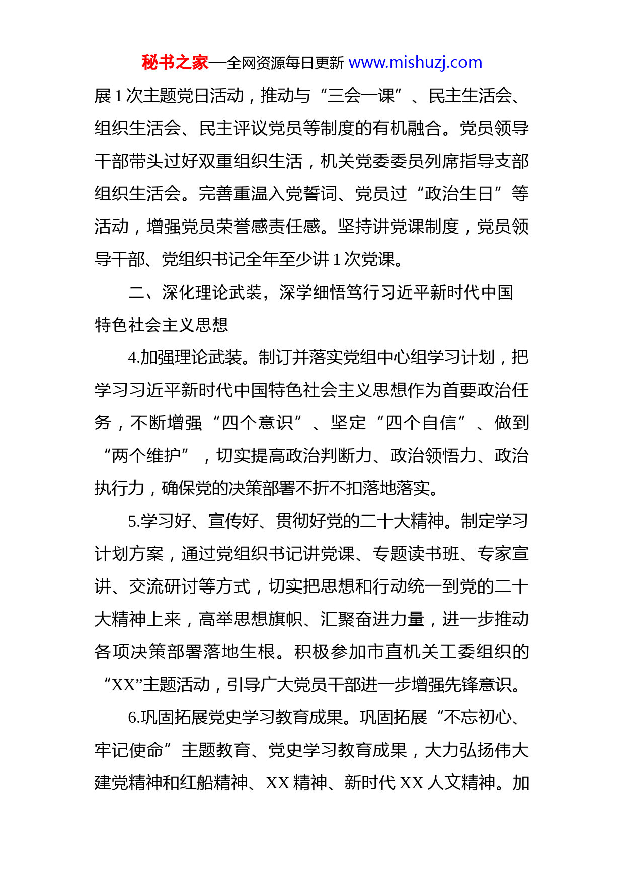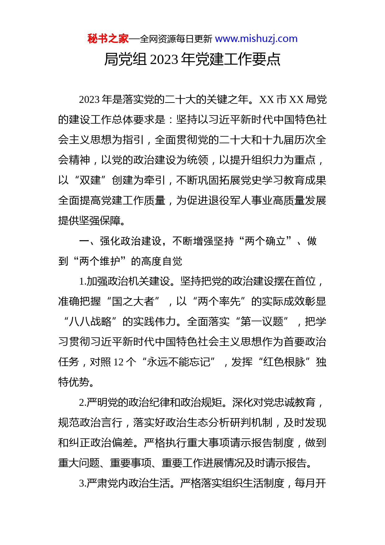 秘书之家—全网资源每日更新www.mishuzj.com局党组2023年党建工作要点2023年是落实党的二十大的关键之年。XX市XX局党的建设工作总体要求是:坚持以习近平新时代中国特色社会主义思想为指引,全面贯彻党的二十大和十九届历次全会精神,以党的政治建设为统领,以提升组织力为重点,以“双建”创建为牵引,不断巩固拓展党史学习教育成果全面提高党建工作质量,为促进退役军人事业高质量发展提供坚强保障。一、强化政治建设,不断增强坚持“两个确立”、做到“两个维护”的高度自觉1.加强政治机关建设。坚持把党的政治建设摆在首位,准确把握“国之大者”,以“两个率先”的实际成效彰显“八八战略”的实践伟力。全面落实“第一议题”,把学习贯彻习近平新时代中国特色社会主义思想作为首要政治任务,对照12个“永远不能忘记”,发挥“红色根脉”独特优势。2.严明党的政治纪律和政治规矩。深化对党忠诚教育,规范政治言行,落实好政治生态分析研判机制,及时发现和纠正政治偏差。严格执行重大事项请示报告制度,做到重大问题、重要事项、重要工作进展情况及时请示报告。3.严肃党内政治生活。严格落实组织生活制度,每月开秘书之家—全网资源每日更新www.mishuzj.com展1次主题党日活动,推动与“三会一课”、民主生活会、组织生活会、民主评议党员等制度的有机融合。党员领导干部带头过好双重组织生活,机关党委委员列席指导支部组织生活会。完善重温入党誓词、党员过“政治生日”等活动,增强党员荣誉感责任感。坚持讲党课制度,党员领导干部、党组织书记全年至少讲1次党课。二、深化理论武装,深学细悟笃行习近平新时代中国特色社会主义思想4.加强理论武装。制订并落实党组中心组学习计划,把学习习近平新时代中国特色社会主义思想作为首要政治任务,不断增强“四个意识”、坚定“四个自信”、做到“两个维护”,切实提高政治判断力、政治领悟力、政治执行力,确保党的决策部署不折不扣落地落实。5.学习好、宣传好、贯彻好党的二十大精神。制定学习计划方案,通过党组织书记讲党课、专题读书班、专家宣讲、交流研讨等方式,切实把思想和行动统一到党的二十大精神上来,高举思想旗帜、汇聚奋进力量,进一步推动各项决策部署落地生根。积极参加市直机关工委组织的“XX”主题活动,引导广大党员干部进一步增强先锋意识。6.巩固拓展党史学习教育成果。巩固拓展“不忘初心、牢记使命”主题教育、党史学习教育成果,大力弘扬伟大建党精神和红船精神、XX精神、新时代XX人文精神。加秘书之家—全网资源每日更新www.mishuzj.com强“四史”宣传教育,切实将党史学习教育激发出来的热情转化为攻坚克难、干事创业的精气神,深化“我为老兵办实事”实践活动成果,形成常态化长效化机制。7.加强意识形态工作。落实意识形态工作责任制,定期专题研究意识形态工作,紧盯重要时间节点,加强意识形态领域形势分析研判,防范化解风险隐患特别是政治风险及时报告意识形态工作情况。三、夯实基层基础,不断推动机关党组织全面进步全面过硬8.筑牢支部战斗堡垒。对标落实支部工作条例、机关基层组织工作条例及贯彻落实的具体措施,以“星级党支部”建设为载体,从思想教育、基础建设、作用发挥等方面推进党支部标准化规范化建设,着力打造政治坚定、组织健全、队伍过硬、机制完善、服务优良、保障有力的党支部。9.加强党员教育管理。加强对入党积极分子的教育、培养和考察,规范党员发展程序,坚持把政治标准摆在首位严把党员发展“入口关”,提高发展党员质量。规范党费收缴、使用和管理。坚持教育、管理、监督、服务相结合推动党员教育管理抓—5—在日常、严在经常。推行党务公开,发挥党员主体作用,认真履行义务,正确行使权利。发挥党员先锋模范作用。着眼全局、立足岗位,带头学习秘书之家—全网资源每日更新www.mishuzj.com与实践,充分发挥党员的模范带头作用,在急、新、难工作上冲锋在前。不断优化服务企业、服务退役军人、服务基层的有效路径,深入实施“三服务”2.0版。落实党员干部“一编三定”进社区服务、“网格连心、组团服务”等专项工作,组建“党员突击队”,积极参与疫情防控任务推进党员志愿服务工作机制化、常态化。四、服务中心大局,不断以高质量党建引领高质量发展11.推动党建与业务深度融合。深刻把握党建围绕中心、建设队伍、服务群众的职责定位,持续擦亮军耀南湖党建品牌,全力促进党建和业务工作一体推动、深度融合,以固根基、守底线,求精准、提质效,扬优势、创品牌为目标,以推动红船旁新时代退役军人工作高质量发展为主线围绕“七个聚焦”,实施“七大行动”,干出退役军人工作的“红船味”“军特色”。12.推进“双建”机关创建。聚焦“建设清廉机关、创建模范机关”建设,突出问题导向、目标导向,加强对“双建”效果的跟踪和评估,从严从实抓好“七张问题清单”的专项整改,做到以创促建、以创促改。深化机关服务品牌创建,进一步推动我局各项制度机制完善成熟,内部监督管理更加规范有序,实现服务退役军人更加贴心暖心、针对性有效性显着提升。秘书之家—全网资源每日更新www.mishuzj.com13.发挥群团组织政治作用。坚持党建带群建,聚焦民