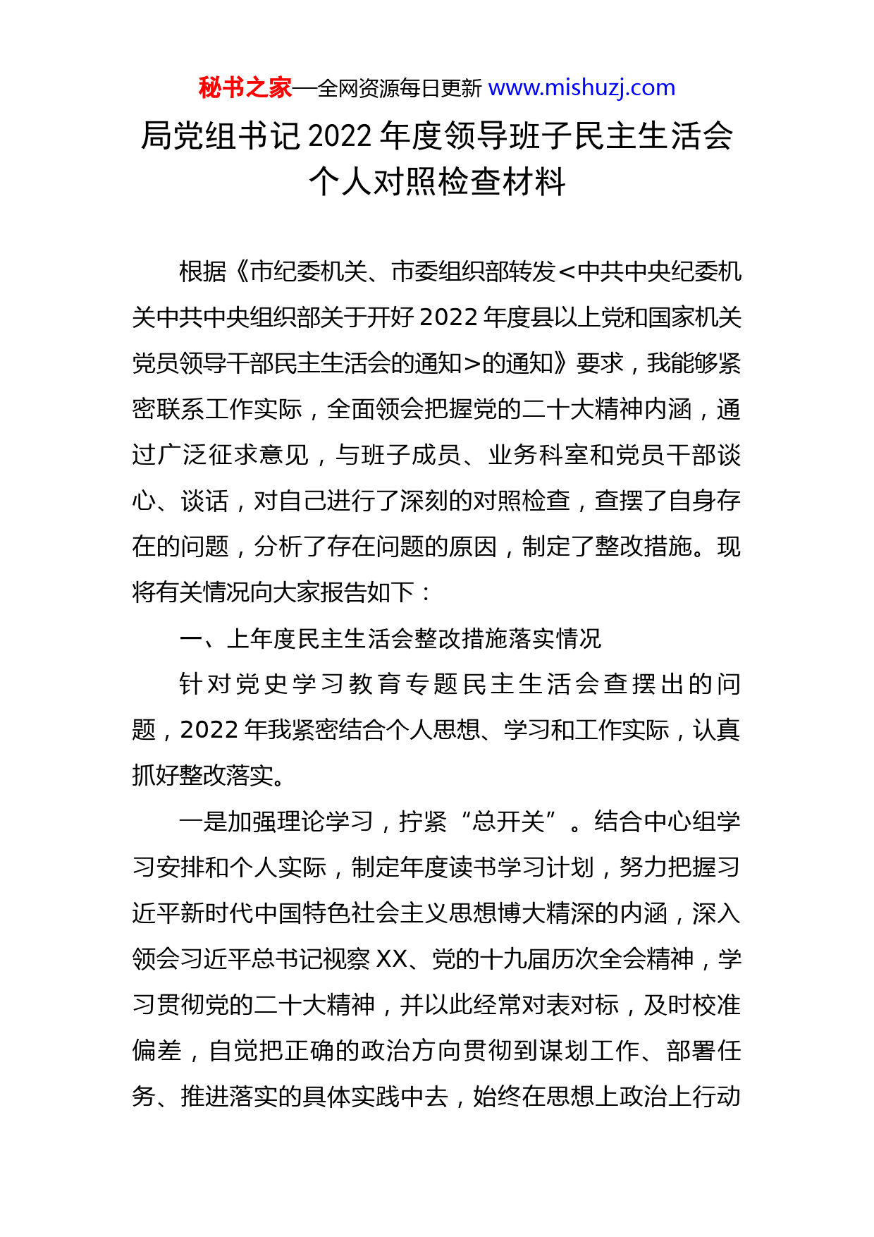 秘书之家—全网资源每日更新www.mishuzj.com局党组书记2022年度领导班子民主生活会个人对照检查材料根据《市纪委机关、市委组织部转发<中共中央纪委机关中共中央组织部关于开好2022年度县以上党和国家机关党员领导干部民主生活会的通知>的通知》要求,我能够紧密联系工作实际,全面领会把握党的二十大精神内涵,通过广泛征求意见,与班子成员、业务科室和党员干部谈心、谈话,对自己进行了深刻的对照检查,查摆了自身存在的问题,分析了存在问题的原因,制定了整改措施。现将有关情况向大家报告如下:一、上年度民主生活会整改措施落实情况针对党史学习教育专题民主生活会查摆出的问题,2022年我紧密结合个人思想、学习和工作实际,认真抓好整改落实。一是加强理论学习,拧紧“总开关”。结合中心组学习安排和个人实际,制定年度读书学习计划,努力把握习近平新时代中国特色社会主义思想博大精深的内涵,深入领会习近平总书记视察XX、党的十九届历次全会精神,学习贯彻党的二十大精神,并以此经常对表对标,及时校准偏差,自觉把正确的政治方向贯彻到谋划工作、部署任务、推进落实的具体实践中去,始终在思想上政治上行动秘书之家—全网资源每日更新www.mishuzj.com上与党中央保持高度一致。把“两个维护”作为首要任务,自觉用习近平新时代中国特色社会主义思想武装头脑,做到政治认同、思想认同、情感认同,不断增强拥护核心、跟随核心、捍卫核心的思想自觉、政治自觉、行动自觉,始终保持清醒的政治认识、坚强的政治定力。二是昂扬进取精神,展现新作为。牢记习近平总书记“幸福都是奋斗出来的”动员令,以全市XX事业发展为己任,转变工作作风,无私忘我工作,奋力创造优异成绩。高点定位目标,牢固树立争一流、扛红旗的争先意识,对市委市政府安排的任务、承担的重点工作,创新思路抓推进,全力以赴求突破,不达目标不松劲、不创一流不罢休,做到承担的发展任务见实效、出亮点,在XX市、全省有声音、有影响。积极服务中心大局,着力在双招双引、重点项目建设推进等中心工作上想尽一切办法、倾注最大精力,完成好市委市政府下达的各项工作任务,切实发挥好应有的表率作用。塑造过硬作风,坚持以问题为导向,敢于直面矛盾、躬身亲力亲为、积极破解发展难题,推动工作不折不扣落实;把实效作为检验工作的唯一标准,树立强烈的效率观念、质量观念,工作研究部署和深入基层跟踪问效“两手抓、两手硬”,重要工作坚持一线工作法,实行台账式管理,立说立行,善做善成,切实锻造“抓铁有痕、踏石留印”的工作作风,确保经手的工作件秘书之家—全网资源每日更新www.mishuzj.com件有落实、事事有回应,达到预期目标,实现新的进步。三是践行党的宗旨,提高满意度。及时跟进掌握上级大政方针、决策部署,结合工作实际,加强调查研究,加强党建工作的改革和创新,进一步改进工作作风、创新工作平台,立足群众需求,发挥XX职能,开展更多群众喜闻乐见、贴近群众现实需求的活动,加强群众身边XX场地设施建设,切实为民服务。聚焦政府工作报告、民生实事等工作,科学制定年度计划,细分工作责任,卡实节点推进,确保年初有目标、岁末见实效。四是严格遵规守纪,树立好形象。牢记习近平总书记“全面从严治党永远在路上”的教诲,把涵养政治修养、提高政治定力作为贯彻终生的必修课,自觉把“讲规矩”作为政治道路上的“安全带”“护身符”,把“守纪律”作为干事创业的“紧箍咒”“安全线”,常修从政之德,常怀律己之心,常思贪欲之害,常弃非分之想,清白做人、干净做事,成为遵规守纪、组织放心、群众放心的好党员。始终明大德、守公德、严私德,保持“俯首甘为孺子牛”的公仆情怀,为人民掌好权、用好权,做到权为民所用、情为民所系、利为民所谋。事事处处保持一种如履薄冰、如临深渊的警醒意识,自觉地净化自己的朋友圈、生活圈、交友圈,“勿以善小而不为,勿以恶小而为之”,做到慎独慎欲、慎初慎微、慎言慎行,严格在法律秘书之家—全网资源每日更新www.mishuzj.com和纪律规矩的框架内做事,不跨权力边界,不越廉政红线。认真履行党风廉政建设一岗双责,加强联系乡镇和分管部门的调度,了解基层党员干部的思想动态,引导广大党员干部坚定理想信念,筑牢拒腐防线,做到政治上坚定,思想上清醒,行动上干净,树立党员干部为民务实清廉的良好形象。二、本次民主生活会准备情况2022年,通过党组中心组集中研讨及个人自学等方式,我认真学习了党章、党的二十大报告以及习近平总书记在党的二十届一中全会上的重要讲话精神。通过深入调研,广泛征求了党员干部对我的意见建议,同其他班子成员相互开展了谈心谈话。在此基础上,对照习近平总书记关于严肃党内政治生活的重要指示精神,对照党章党规党纪,重点查摆了6个方面的问题,深刻分析了产生问题的原因,明确了改进的方向。三、查摆出的突出问题(一)在带头深刻领悟“两个确立”的决定性意义,增强“四个意识”、坚定“四个自信”、做到“两个维护”方面。1.政治站位不高。在政治建设上主要关注的是站好自己的位、扫好门前的雪,在联系直属单位工作中,还局限在疫情防控、安全生产、、党风廉政建设、备战参赛等方秘书之家—全网资源每日更新www.mishuz