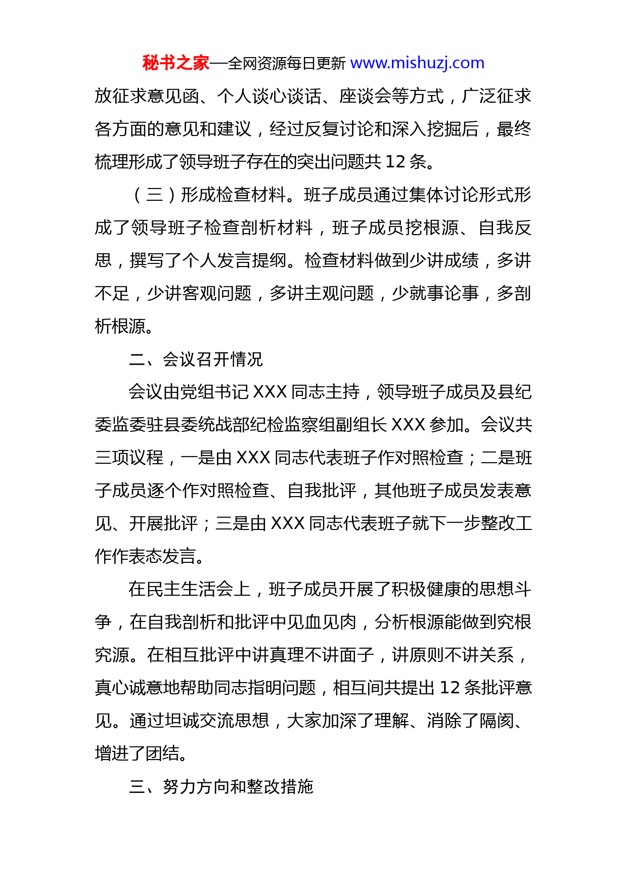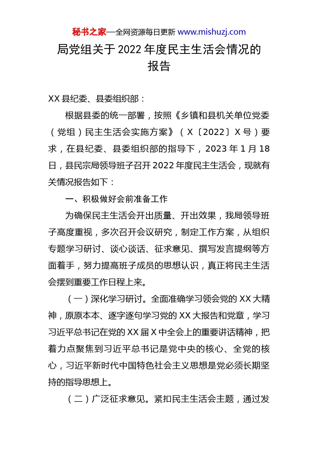 秘书之家—全网资源每日更新www.mishuzj.com局党组关于2022年度民主生活会情况的报告XX县纪委、县委组织部:根据县委的统一部署,按照《乡镇和县机关单位党委(党组)民主生活会实施方案》(X〔2022〕X号)要求,在县纪委、县委组织部的指导下,2023年1月18日,县民宗局领导班子召开2022年度民主生活会,现就有关情况报告如下:一、积极做好会前准备工作为确保民主生活会开出质量、开出效果,我局领导班子高度重视,多次召开会议研究,制定工作方案,从组织专题学习研讨、谈心谈话、征求意见、撰写发言提纲等方面着手,努力提高班子成员的思想认识,真正将民主生活会摆到重要工作日程上来。(一)深化学习研讨。全面准确学习领会党的XX大精神,原原本本、逐字逐句学习党的XX大报告和党章,学习习近平总书记在党的XX届X中全会上的重要讲话精神,把着力点聚焦到习近平总书记是党中央的核心、全党的核心,习近平新时代中国特色社会主义思想是党必须长期坚持的指导思想上。(二)广泛征求意见。紧扣民主生活会主题,通过发秘书之家—全网资源每日更新www.mishuzj.com放征求意见函、个人谈心谈话、座谈会等方式,广泛征求各方面的意见和建议,经过反复讨论和深入挖掘后,最终梳理形成了领导班子存在的突出问题共12条。(三)形成检查材料。班子成员通过集体讨论形式形成了领导班子检查剖析材料,班子成员挖根源、自我反思,撰写了个人发言提纲。检查材料做到少讲成绩,多讲不足,少讲客观问题,多讲主观问题,少就事论事,多剖析根源。二、会议召开情况会议由党组书记XXX同志主持,领导班子成员及县纪委监委驻县委统战部纪检监察组副组长XXX参加。会议共三项议程,一是由XXX同志代表班子作对照检查;二是班子成员逐个作对照检查、自我批评,其他班子成员发表意见、开展批评;三是由XXX同志代表班子就下一步整改工作作表态发言。在民主生活会上,班子成员开展了积极健康的思想斗争,在自我剖析和批评中见血见肉,分析根源能做到究根究源。在相互批评中讲真理不讲面子,讲原则不讲关系,真心诚意地帮助同志指明问题,相互间共提出12条批评意见。通过坦诚交流思想,大家加深了理解、消除了隔阂、增进了团结。三、努力方向和整改措施秘书之家—全网资源每日更新www.mishuzj.com我局将以对党忠诚的态度,把抓好民主生活会整改工作作为一项严肃的政治任务,明确任务,细化举措,确保整改到位、问题清零。(一)强化理想信念,完善常态化学习机制。继续坚持把党的政治建设摆在首位,把加强政治理论学习作为提高政治素养、改进工作作风的重要手段,进一步提高学习的主动性,增强指导实践的针对性。严格落实理论中心组学习制度,改进学习方法,创新学习载体,提高学习效果。深入学习领会习近平新时代中国特色社会主义思想,让新思想往深里走,往心里走,往实里走。系统学习习近平新时代中国特色社会主义思想和党的XX大精神,融会贯通学、持之以恒学,真正使之沉淀在血液里,植入到灵魂中。建立健全理论学习机制。(二)强化责任担当,锤炼精品服务意识。在各项业务工作推进的同时,强化干部作风建设、强调工作精品意识,深化“做实、做细、做精、做好”的思想理念,使每一名党员干部都能把稳规矩底线,把“一事一调研”“遇事必调研”的务实工作作风落到实处,从实际出发群策群力谋划改革创新举措,优化民宗事务管理。拓宽视野,积极向周边地区学习先进的工作方式方法,推进局机关干部综合工作能力、履职效能有效提升。严格自我约束,增进团队意识和服务意识,践行能吃苦、愿吃苦,不推诿、不秘书之家—全网资源每日更新www.mishuzj.com拖拉的踏实工作作风,把工作的每一个环节都做到最优、最好。(三)强化宗旨意识,提升为民务实成效。带头践行以人民为中心的发展思想,在科学理论的指导下,坚持问题导向,结合民宗工作实际,主动积极走向基层听取群众意见,多了解基层人员的实际困难,多听听信教群众和少数民族群众的心声,在发现问题中推动“铸牢中华民族共同体意识”“宗教中国化”“宗教事务治理现代化”等重点工作共同发展,提升安全管理能力,让群众获得满意感。同时,积极开展助企惠企“三服务”,组织全体干部积极参与更广泛的政策精神宣讲、文明城市创建等各类社会志愿服务,在方方面面的工作、生活中践行为民服务宗旨。(四)强化纪律意识,锻造坚强自律的民宗铁军。完善谈心谈话制度,坚持问题导向原则,加强对全体干部的日常谈心教育,加深谈心谈话的内涵深度。在召开民主生活会和组织生活会时,加强批评和自我批评的武器运用,健全民主监督与保障机制。严格贯彻落实县委、县政府重要工作部署,严格执行局机关内部各项规章制度,规范和加强“第一种形态”的运用,把纪律和规矩“挺在前面”。坚持民主集中制,贯彻落实党内监督,统筹落实全面从严治党和机构编制各项工作任务,全面提升纪律要秘书之家—全网资源每日更新www.mishuzj.com求。