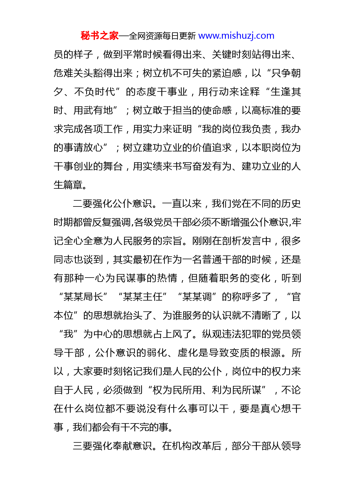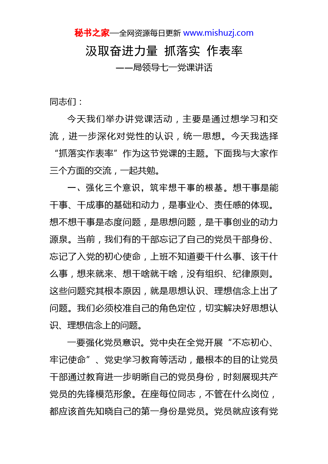 秘书之家—全网资源每日更新www.mishuzj.com汲取奋进力量抓落实作表率——局领导七一党课讲话同志们:今天我们举办讲党课活动,主要是通过想学习和交流,进一步深化对党性的认识,统一思想。今天我选择“抓落实作表率”作为这节党课的主题。下面我与大家作三个方面的交流,一起共勉。一、强化三个意识,筑牢想干事的根基。想干事是能干事、干成事的基础和动力,是事业心、责任感的体现。想不想干事是态度问题,是思想问题,是干事创业的动力源泉。当前,我们有的干部忘记了自己的党员干部身份、忘记了入党的初心使命,上班不知道要干什么事、该干什么事,想来就来、想干啥就干啥,没有组织、纪律原则。这些问题究其根本原因,就是思想认识、理想信念上出了问题。我们必须校准自己的角色定位,切实解决好思想认识、理想信念上的问题。一要强化党员意识。党中央在全党开展“不忘初心、牢记使命”、党史学习教育等活动,最根本的目的让党员干部通过教育进一步明晰自己的党员身份,时刻展现共产党员的先锋模范形象。在座每位同志,不管在什么岗位,都应该首先知晓自己的第一身份是党员。党员就应该有党秘书之家—全网资源每日更新www.mishuzj.com员的样子,做到平常时候看得出来、关键时刻站得出来、危难关头豁得出来;树立机不可失的紧迫感,以“只争朝夕、不负时代”的态度干事业,用行动来诠释“生逢其时、用武有地”;树立敢于担当的使命感,以高标准的要求完成各项工作,用实力来证明“我的岗位我负责,我办的事请放心”;树立建功立业的价值追求,以本职岗位为干事创业的舞台,用实绩来书写奋发有为、建功立业的人生篇章。二要强化公仆意识。一直以来,我们党在不同的历史时期都曾反复强调,各级党员干部必须不断增强公仆意识,牢记全心全意为人民服务的宗旨。刚刚在剖析发言中,很多同志也谈到,其实最初在作为一名普通干部的时候,还是有那种一心为民谋事的热情,但随着职务的变化,听到“某某局长”“某某主任”“某某调”的称呼多了,“官本位”的思想就抬头了、为谁服务的认识就不清晰了,以“我”为中心的思想就占上风了。纵观违法犯罪的党员领导干部,公仆意识的弱化、虚化是导致变质的根源。所以,大家要时刻铭记我们是人民的公仆,岗位中的权力来自于人民,必须做到“权为民所用、利为民所谋”,不论在什么岗位都不要说没有什么事可以干,要是真心想干事,我们都会有干不完的事。三要强化奉献意识。在机构改革后,部分干部从领导秘书之家—全网资源每日更新www.mishuzj.com岗位上退了下来,晋升了职级调研员,个别同志就认为退出科级领导岗位等于“退休”,干事创业就与我无关了,把自己“挂起”,整天无所事事。大家看到的,冯少权同志退伍不褪色,十多年自始自终坚持讲政治、守规矩,严格执行请示报告制度,党组安排什么就担当什么,尽职尽责、毫无怨言,认真负责地高质量完成承担的各项任务;曾幼专同志,虽然市委已经安排在市委重点督查组工作,但对于局党组安排参加会议、开展督查等工作,从来不推辞;杨琳和李晓林同志,虽然机构改革后就没再担任科长,但依然按照党组的安排继续高质量承担了科博会高层次人才交流系列活动、全省第三届工匠杯职业技能大赛筹备工作。大家都清楚,局系统各单位人员编制都很紧张,单位的编制数是因承担的工作任务、工作量确定的,每一个编制都对应了一名干事的工作人员。编办绝不会给任何一个单位几个养“闲人”的编制。我们在座的每位同志都是编制中的一员,我们都是人社这驾马车上的螺丝钉,掉一颗都不配套、不协调,运转都会不通畅。因此,大家必须向先进看齐,积极主动承担工作,努力做到在编一天,履职一天,奉献一天。二、处理好三层关系,找准能干事的方法。一分部署、九分落实。当前局系统的干部在抓落实上总体表现比较好,绝大部分工作做到了落地落实,取得了显著成效。秘书之家—全网资源每日更新www.mishuzj.com但也有一些工作最后却落了空,没有达到预期的效果。究其原因,主要是方式方法上出了问题。对我们在座的干部来讲,干事业必须要处理好三层关系。一要处理好带头和指导的关系。当前个别县级干部在抓落实中,习惯于安排部署,不善于跟踪问效。一些工作领导签批给科长、科长转交给副科长、副科长安排给办事员,层层签批、层层转办,最终交出的结果就只有办事员的水平。这样的抓落实是典型的“传话筒式”抓落实。大家作为县以上干部,抓落实既要安排部署、也要跟踪问效;既要安排工作谁去干、也要指导工作怎么干;既要挂帅、也要出征。对一些难点问题、敏感问题,甚至还必须冲在前,与分管科室、单位一起认真研究,真正以身先士卒、攻坚克难的状态推动各项工作高标准、高水平落实。二要处理好牵头和配合的关系。分工负责是我们党的重要组织原则,虽然根据三定方案确定了各自的职责,但很多具体工作单打独斗是难以高质量完成的,所以,一般会确定某位同志牵头负责,其余同志配合落实。现实中,有这样一种现象,一些同志认为反正有牵头的顶到,协同配合工作就不主动、不积极。大家要牢固树立整体意识、一盘棋思想,一方面要分工负责把自己的工作干好,另一方面要加强协调配合,遇事多沟通、多协商、多补台,做到