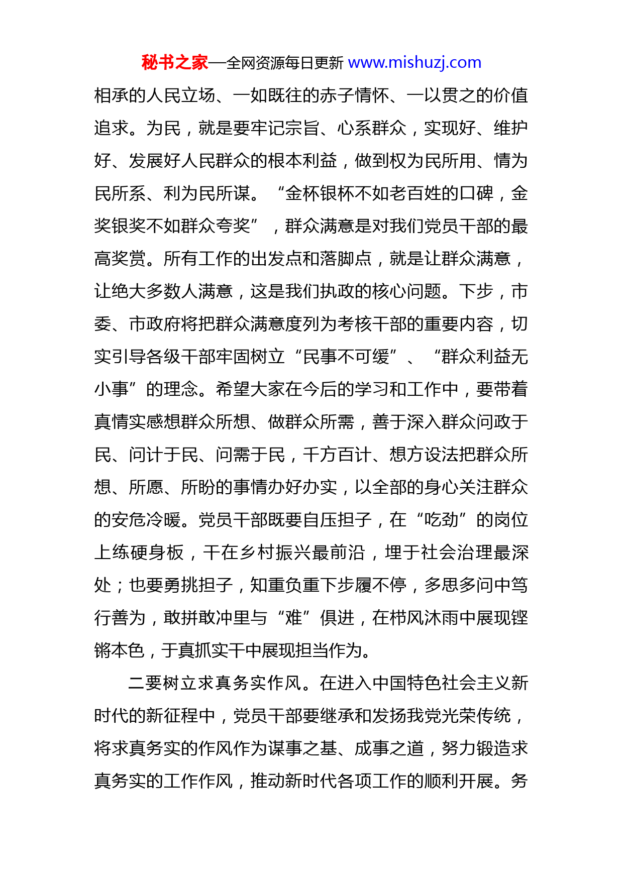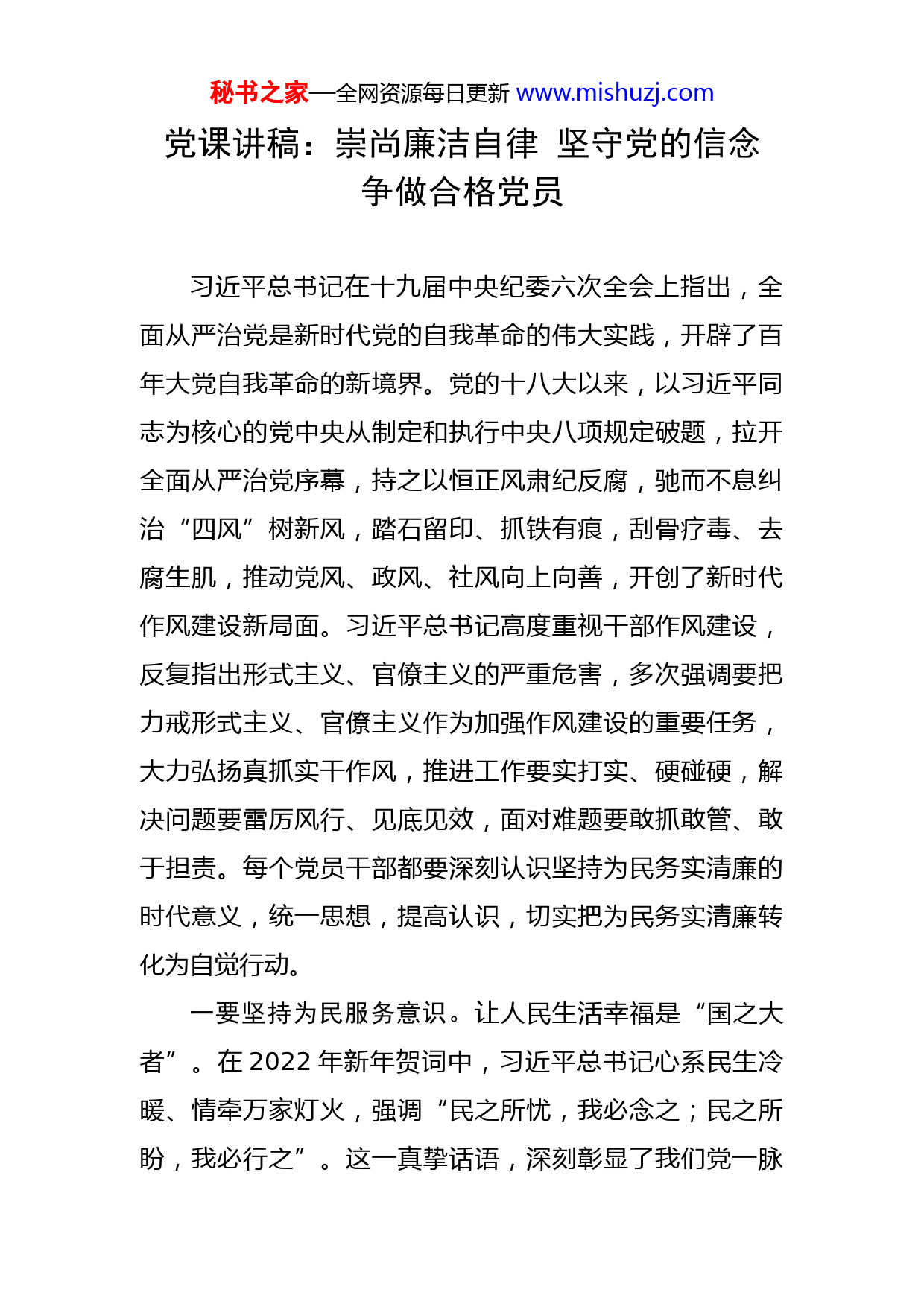 秘书之家—全网资源每日更新www.mishuzj.com党课讲稿:崇尚廉洁自律坚守党的信念争做合格党员习近平总书记在十九届中央纪委六次全会上指出,全面从严治党是新时代党的自我革命的伟大实践,开辟了百年大党自我革命的新境界。党的十八大以来,以习近平同志为核心的党中央从制定和执行中央八项规定破题,拉开全面从严治党序幕,持之以恒正风肃纪反腐,驰而不息纠治“四风”树新风,踏石留印、抓铁有痕,刮骨疗毒、去腐生肌,推动党风、政风、社风向上向善,开创了新时代作风建设新局面。习近平总书记高度重视干部作风建设,反复指出形式主义、官僚主义的严重危害,多次强调要把力戒形式主义、官僚主义作为加强作风建设的重要任务,大力弘扬真抓实干作风,推进工作要实打实、硬碰硬,解决问题要雷厉风行、见底见效,面对难题要敢抓敢管、敢于担责。每个党员干部都要深刻认识坚持为民务实清廉的时代意义,统一思想,提高认识,切实把为民务实清廉转化为自觉行动。一要坚持为民服务意识。让人民生活幸福是“国之大者”。在2022年新年贺词中,习近平总书记心系民生冷暖、情牵万家灯火,强调“民之所忧,我必念之;民之所盼,我必行之”。这一真挚话语,深刻彰显了我们党一脉秘书之家—全网资源每日更新www.mishuzj.com相承的人民立场、一如既往的赤子情怀、一以贯之的价值追求。为民,就是要牢记宗旨、心系群众,实现好、维护好、发展好人民群众的根本利益,做到权为民所用、情为民所系、利为民所谋。“金杯银杯不如老百姓的口碑,金奖银奖不如群众夸奖”,群众满意是对我们党员干部的最高奖赏。所有工作的出发点和落脚点,就是让群众满意,让绝大多数人满意,这是我们执政的核心问题。下步,市委、市政府将把群众满意度列为考核干部的重要内容,切实引导各级干部牢固树立“民事不可缓”、“群众利益无小事”的理念。希望大家在今后的学习和工作中,要带着真情实感想群众所想、做群众所需,善于深入群众问政于民、问计于民、问需于民,千方百计、想方设法把群众所想、所愿、所盼的事情办好办实,以全部的身心关注群众的安危冷暖。党员干部既要自压担子,在“吃劲”的岗位上练硬身板,干在乡村振兴最前沿,埋于社会治理最深处;也要勇挑担子,知重负重下步履不停,多思多问中笃行善为,敢拼敢冲里与“难”俱进,在栉风沐雨中展现铿锵本色,于真抓实干中展现担当作为。二要树立求真务实作风。在进入中国特色社会主义新时代的新征程中,党员干部要继承和发扬我党光荣传统,将求真务实的作风作为谋事之基、成事之道,努力锻造求真务实的工作作风,推动新时代各项工作的顺利开展。务秘书之家—全网资源每日更新www.mishuzj.com实,就是要求真务实、真抓实干,坚持重实际、鼓实劲、求实效,扎扎实实地把各项工作落到实处。“空谈误国,实干兴邦”。干事业就是要有“踏石留印、抓铁有痕”的劲头和“钉钉子精神”,对确定的目标,定下来的工作要抓住不放,锲而不舍,不管困难和压力多大,都不退缩,不动摇,一诺千金,一抓到底,永不言败。每一项工作都至关重要,都需要把“真”和“实”作为践行落实工作的生命线,推动各项工作力度再加大、进度再加快、质效再提升;要有“功成不必在我”的境界和“不贪一时之功,不图一时之名”的实干精神,立务实之心、讲务实之言、做务实之事、求务实之绩,保持一届接着一届干的稳定性和连续性,积极化解前任没有解决的矛盾,不搞脱离实际、劳民伤财的政绩工程,真正把精力用在办实事、求实效上,多做打基础、利长远的工作,努力创造经得起历史、实践和人民群众检验的政绩。要坚持目标导向,挂图作战,务实践行;都需要尊重规律、尊重实际,依法依规办事,确保说一件、干一件、成一件,不搞“假把式”、不打折扣、不搞变通,每项工作都能见底到位、落地见效。三要筑牢廉洁自律防线。没有规矩,不成方圆。对于一名党员,纪律是高压线;对于一个政党,纪律是生命线。作为党员干部,要时刻绷紧纪律这根弦,严以修身、秘书之家—全网资源每日更新www.mishuzj.com严以用权、严以律己,不断筑牢拒腐防变的思想防线,守住清正廉洁的政治底线。清廉,就是要树立公仆意识,厉行勤俭节约,坚持严格自律,树立共产党员的良好形象。公生明,廉生威,“吏不畏吾严而畏吾廉,民不服吾威而服吾公”,清正廉洁是党和人民对党员干部最起码的要求,是党员干部应具备的基本素质。我们每一位党员干部都要时刻牢记“一要干事,二要干净”的廉政准则,从点滴做起,从小事做起,时时处处严格要求自己,坚决守住拒腐防变的底线,做到不义之财不取,不清之地不去,不正之友不交,不净之欲不求,不实之名不图,做一名组织放心、人民满意、家人安心的好干部。终始终秉持廉洁自律相关规定,树立正确的世界观、人生观、价值观,自重、自省、自律,常思贪欲之害,常怀律己之心,在工作中增强政治责任意识,在其位、谋其政、负其责、尽其力,时刻牢记党和人民赋予的重托。同志们,生逢盛世当不负盛世,可为时代当作有为之人。在这个新时代,作为青年人,我们应当奋进新征程,建功新时代,以永不懈怠、只争朝夕的精神状态,埋头苦干、勇毅前行,我们以“不到长城非好汉”的顽强斗志、“不畏风雨我扬帆”的奋斗激情、“不