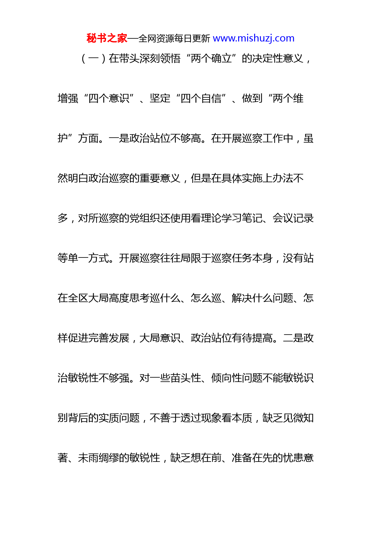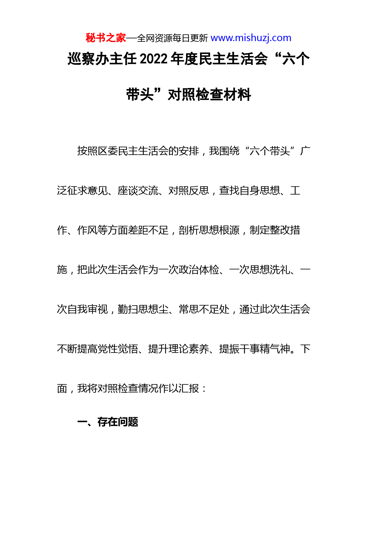 秘书之家—全网资源每日更新www.mishuzj.com巡察办主任2022年度民主生活会“六个带头”对照检查材料按照区委民主生活会的安排,我围绕“六个带头”广泛征求意见、座谈交流、对照反思,查找自身思想、工作、作风等方面差距不足,剖析思想根源,制定整改措施,把此次生活会作为一次政治体检、一次思想洗礼、一次自我审视,勤扫思想尘、常思不足处,通过此次生活会不断提高党性觉悟、提升理论素养、提振干事精气神。下面,我将对照检查情况作以汇报:一、存在问题秘书之家—全网资源每日更新www.mishuzj.com(一)在带头深刻领悟“两个确立”的决定性意义,增强“四个意识”、坚定“四个自信”、做到“两个维护”方面。一是政治站位不够高。在开展巡察工作中,虽然明白政治巡察的重要意义,但是在具体实施上办法不多,对所巡察的党组织还使用看理论学习笔记、会议记录等单一方式。开展巡察往往局限于巡察任务本身,没有站在全区大局高度思考巡什么、怎么巡、解决什么问题、怎样促进完善发展,大局意识、政治站位有待提高。二是政治敏锐性不够强。对一些苗头性、倾向性问题不能敏锐识别背后的实质问题,不善于透过现象看本质,缺乏见微知著、未雨绸缪的敏锐性,缺乏想在前、准备在先的忧患意秘书之家—全网资源每日更新www.mishuzj.com识,往往事情发生了才意识到,思想意识滞后,底线意识缺乏。对巡察中发现有的单位信访问题较多,简单认为是信访问题解决不到位,没有看到信访问题背后存在的不作为、慢作为、乱作为问题。(二)在带头用习近平新时代中国特色社会主义思想凝心铸魂方面。一是理论学习系统性不足。在理论学习方面往往是掌握关键词,重点学习与自己工作结合紧密的部分内容,没有从整体上系统掌握深刻内涵。在如何把理论结合实际、指导实践方面缺乏精准的举措,不能融会贯通地应用。对巡察工作的理论内容掌握的较好,对于巡察之外的内容则是通读一遍,没有深入的学习领会,没有将其秘书之家—全网资源每日更新www.mishuzj.com与巡察工作一体思考运用。二是思想政治贯穿性不够。在开展巡察工作中,思想政治工作运用显得不足,尤其在与被巡察单位人员谈话了解情况时,多是问一些问题,对一些人思想上存在的偏差认为是党组织教育不够,没有一边开展巡察一边做思想政治工作,没有把思想政治建设贯穿巡察工作全过程。(三)在带头坚持和加强党的全面领导方面。一是决策科学化水平不够高。在安排部署巡察工作中,主要是按照上级要求去做,征集意见范围不够宽,主要局限于政府各部门,直接听取基层群众的意见建议不够多。巡察的的方向没有完全放在基层,没有完全在群众身边开展巡察,秘书之家—全网资源每日更新www.mishuzj.com民主集中制作用发挥不够充分。二是党建工作与巡察工作结合不够紧密。党建工作与巡察业务工作做到了一同部署,但没有做到一同落实。曾经计划组织巡察办党员到红色基地开展主题党日活动,在巡察任务紧时没有按计划开展,党组织活动质量不高。(四)在带头坚持以人民为中心的发展思想方面。一是解决群众“急难愁盼”不到位。巡察工作对民生领域聚焦不够,存在避重就轻的问题,尤其对历史遗留问题督促整改解决力度不够,一些职能部门以历史原因为由,久拖不改。二是深入调研不到位。没有按照计划深入基层调研,即使去了也是开座谈会听汇报,没有实地去看,没有秘书之家—全网资源每日更新www.mishuzj.com走到群众中与群众面对面交流,获得第一手资料,听取群众呼声不够直接深入,对群众反映强烈的问题了解有所偏差,巡察重点没有贴近群众诉求。(五)在带头发扬斗争精神发面。一是斗争勇气不够。对身边及抖音等网上不当言论针锋相对的斗争显得乏力,主动斗争精神不够饱满,在如何弘扬正能量方面缺乏有效办法,在网上发声不够,引领舆论方向做得不到位。在巡察过程中,针对一些人对巡察工作的错误认识,蜻蜓点水地讲一讲,没有进行严肃地批评纠正,存在怕得罪人的思想,斗争不够大胆。二是深巡力度不够。在巡察工作中,有时碍于情面,没有深入到底,浅尝辄止、浮于表秘书之家—全网资源每日更新www.mishuzj.com面,巡不透、察不深,满足于完成任务,没有深挖问题线索,缺乏真刀真枪的斗争精神,巡察利剑作用没有充分发挥出来。(六)在带头落实全面从严治党政治责任方面。一是监督贯通不够。把巡察监督与其他监督贯通协同不够,出现各自为战情况,重复协调,多头监督,统筹协调机制没有完全运行起来,监督合力不够,监督资源没有共享,巡察监督实效有待加强。二是履职尽责不实。虽然按照上级和区委要求开展巡察,但对一些被巡察单位业务不够熟悉,专业化水平不高,出现外行巡察内行的问题,巡察发现的问题没有打在关键点上。对巡察工作因地制宜、结合秘书之家—全网资源每日更新www.mishuzj.com实际做得不到位,出现一刀切情况,影响了巡察的精准性、针对性。二、原因剖析一是思想认识有待提高。对理论学习浮于表面,满足于形式,内容掌握不透,没有内化于心,转化成指导实践的强大理论动力。对复杂问题从现象到本质上的认识不足,不善于从纷繁的现象中理清认识问题的思路。二是政治站位有待提高。从政治上看问题的意识不强,在如何把旗帜鲜明讲政治的要求转化为实际的办