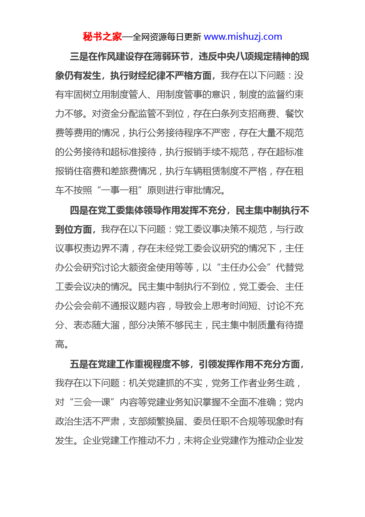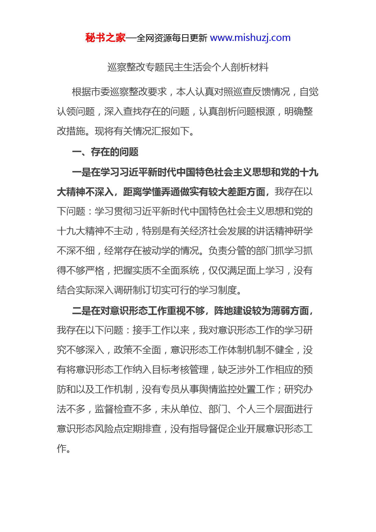 秘书之家—全网资源每日更新www.mishuzj.com巡察整改专题民主生活会个人剖析材料根据市委巡察整改要求,本人认真对照巡查反馈情况,自觉认领问题,深入查找存在的问题,认真剖析问题根源,明确整改措施。现将有关情况汇报如下。一、存在的问题一是在学习习近平新时代中国特色社会主义思想和党的十九大精神不深入,距离学懂弄通做实有较大差距方面,我存在以下问题:学习贯彻习近平新时代中国特色社会主义思想和党的十九大精神不主动,特别是有关经济社会发展的讲话精神研学不深不细,经常存在被动学的情况。负责分管的部门抓学习抓得不够严格,把握实质不全面系统,仅仅满足面上学习,没有结合实际深入调研制订切实可行的学习制度。二是在对意识形态工作重视不够,阵地建设较为薄弱方面,我存在以下问题:接手工作以来,我对意识形态工作的学习研究不够深入,政策不全面,意识形态工作体制机制不健全,没有将意识形态工作纳入目标考核管理,缺乏涉外工作相应的预防和以及工作机制,没有专员从事舆情监控处置工作;研究办法不多,监督检查不多,未从单位、部门、个人三个层面进行意识形态风险点定期排查,没有指导督促企业开展意识形态工作。秘书之家—全网资源每日更新www.mishuzj.com三是在作风建设存在薄弱环节,违反中央八项规定精神的现象仍有发生,执行财经纪律不严格方面,我存在以下问题:没有牢固树立用制度管人、用制度管事的意识,制度的监督约束力不够。对资金分配监管不到位,存在白条列支招商费、餐饮费等费用的情况,执行公务接待程序不严密,存在大量不规范的公务接待和超标准接待,执行报销手续不规范,存在超标准报销住宿费和差旅费情况,执行车辆租赁制度不严格,存在租车不按照“一事一租”原则进行审批情况。四是在党工委集体领导作用发挥不充分,民主集中制执行不到位方面,我存在以下问题:党工委议事决策不规范,与行政议事权责边界不清,存在未经党工委会议研究的情况下,主任办公会研究讨论大额资金使用等等,以“主任办公会”代替党工委会议决的情况。民主集中制执行不到位,党工委会、主任办公会会前不通报议题内容,导致会上思考时间短、讨论不充分、表态随大溜,部分决策不够民主,民主集中制质量有待提高。五是在党建工作重视程度不够,引领发挥作用不充分方面,我存在以下问题:机关党建抓的不实,党务工作者业务生疏,对“三会一课”内容等党建业务知识掌握不全面不准确;党内政治生活不严肃,支部频繁换届、委员任职不合规等现象时有发生。企业党建工作推动不力,未将企业党建作为推动企业发秘书之家—全网资源每日更新www.mishuzj.com展的有力抓手,工作指导落后,目前仅有4家企业成立党支部,在历年党建工作考核方案未针对企业党支部制定考核内容、未实行督导检查。六是在管党治党偏于宽松,责任落实不够有力方面,我存在以下问题:落实全面从严治党监督责任不到位,用心用力不足,主责主业不突出,没能更好地把主要精力和工作重心放到监督执纪问责上来,日常监督宽松软。主动融入中心、服务全区大局的意识不强,没有针对重要岗位、重点环节梳理制定切实有效的廉政风险防控措施,廉政谈话开展缺乏时效性、针对性,压力传导不到位。二、存在问题的原因剖析一是统筹协调的能力不够。面对所处的新时代要求,面对园区发展面临的多变形势多重任务,在处理分管领域工作时需要有很强的统筹协调能力,而我仍达不到标准,在多项工作中难免存在厚此薄彼的情况,不能把工作抓全抓好,能力上存在短板。这里既有岗位历练不足的客观原因,也有不断提升能力本领的主动性不强,以至于出现本领恐慌。二是锲而不舍的精神不强。在今年的党史学习教育系列活动中,通过不断学习老一辈革命家矢志不渝、努力奋斗、始终牢记和践行党的初心和使命的事迹,我对自身缺乏吃苦耐劳、锲而不舍、一抓到底精神的体会更加深刻,吃苦在前、享受在后秘书之家—全网资源每日更新www.mishuzj.com的思想有所淡化,还是存在满足当下、享受生活的思想,深感自己锲而不舍的“钻劲儿”没有完全内化于心、外化于行。三是学习能力有所欠缺。对理论学习重视不够,投入精力和时间不足,把理论学习作为一种任务而不是一种习惯,导致理论学习缺乏长期性;没有将理论学习内容与全区、与机关党建和纪检监察工作结合起来,缺少对园区发展、经济工作的学习研究,导致视野上有局限。四是敢于担当的锐气不足。自我反思,还是存在年轻干部普遍存在的“爱惜羽毛”的思想,怕触及矛盾、不敢啃硬骨头,在敢于监督、敢于监督方面怕“得罪人”、怕“伤和气”。有时候面对工作任务,缺乏对现实情况的了解和复杂情况的判断,怕有风险,不敢创新突破,不敢大胆尝试,缺少大刀阔斧、奋力开拓、勇于担当的锐气。三、整改措施一是提高政治站位,加强理论学习。持续深入学习贯彻习近平新时代中国特色社会主义思想和党的十九大精神,在学懂弄通上下功夫。积极参加全区集中学习、领导干部上讲台、理论中心组学习,认真撰写学习笔记和发言材料,提高个人自学能力,确保学习入脑入心。学深学透国家、省市委有关政策文件,深入发展一线,思考全区发展规划,形成高质量的调研报告,秘书之家—全网资源每日更新www.mishuz