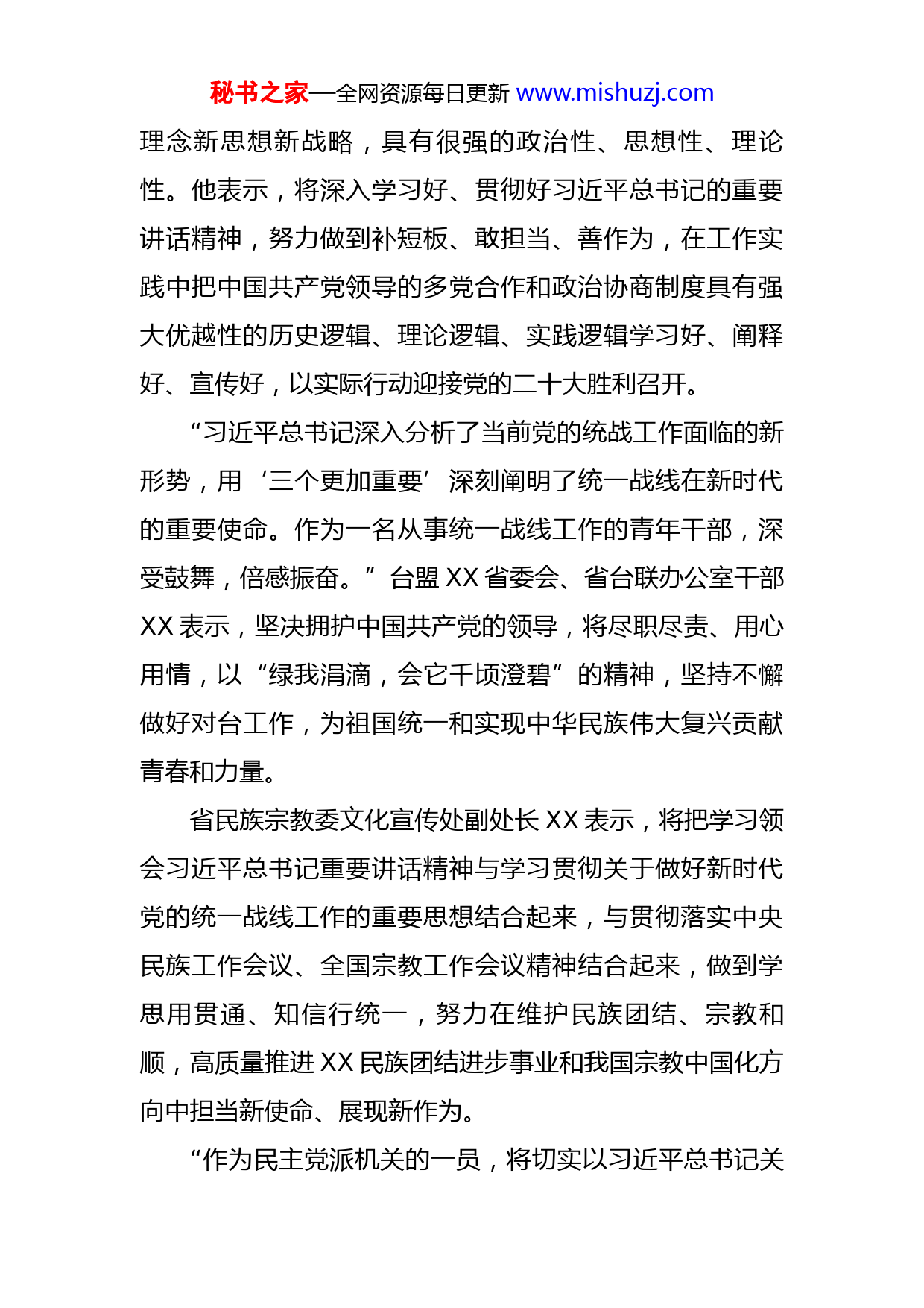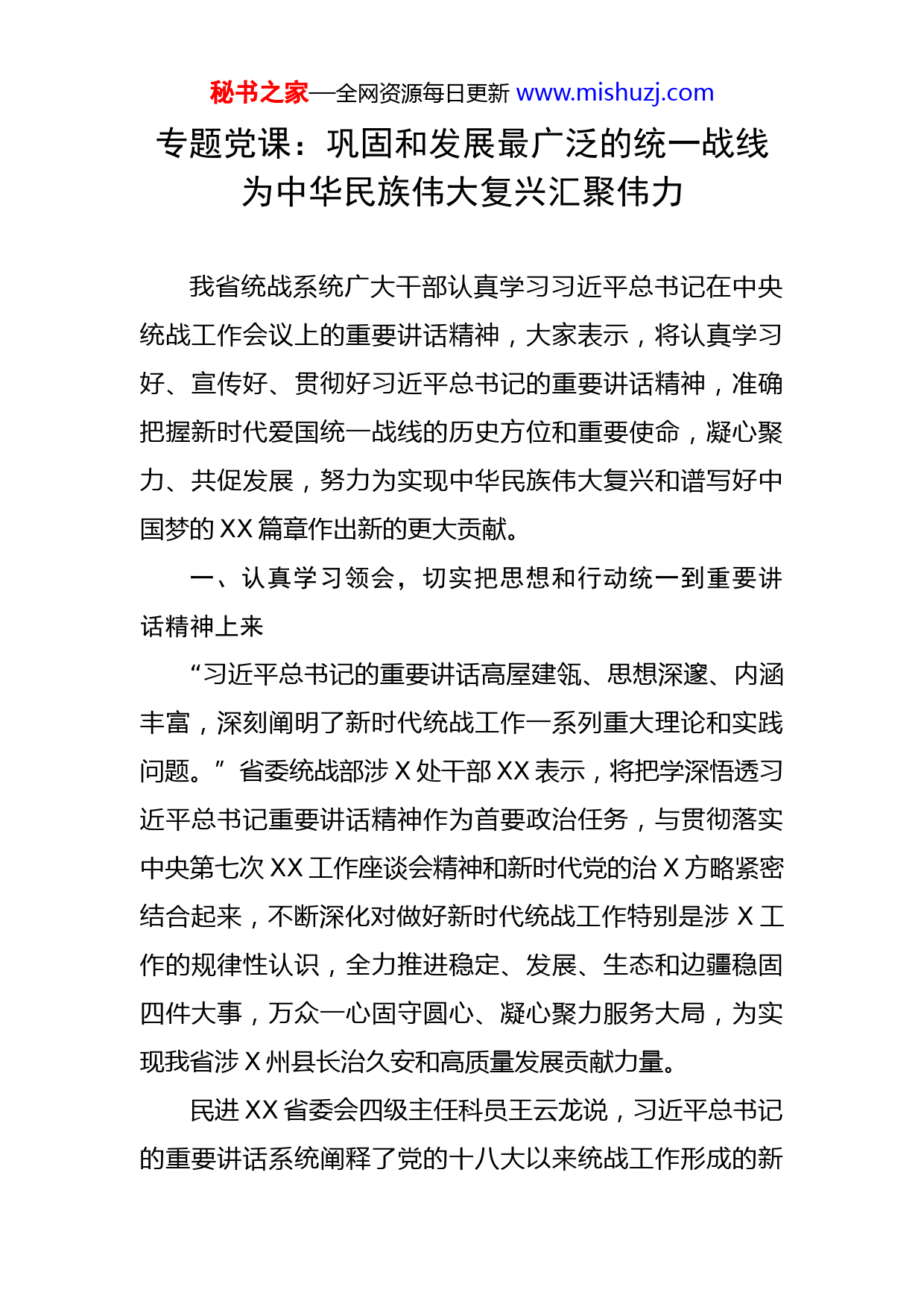 秘书之家—全网资源每日更新www.mishuzj.com专题党课:巩固和发展最广泛的统一战线为中华民族伟大复兴汇聚伟力我省统战系统广大干部认真学习习近平总书记在中央统战工作会议上的重要讲话精神,大家表示,将认真学习好、宣传好、贯彻好习近平总书记的重要讲话精神,准确把握新时代爱国统一战线的历史方位和重要使命,凝心聚力、共促发展,努力为实现中华民族伟大复兴和谱写好中国梦的XX篇章作出新的更大贡献。一、认真学习领会,切实把思想和行动统一到重要讲话精神上来“习近平总书记的重要讲话高屋建瓴、思想深邃、内涵丰富,深刻阐明了新时代统战工作一系列重大理论和实践问题。”省委统战部涉X处干部XX表示,将把学深悟透习近平总书记重要讲话精神作为首要政治任务,与贯彻落实中央第七次XX工作座谈会精神和新时代党的治X方略紧密结合起来,不断深化对做好新时代统战工作特别是涉X工作的规律性认识,全力推进稳定、发展、生态和边疆稳固四件大事,万众一心固守圆心、凝心聚力服务大局,为实现我省涉X州县长治久安和高质量发展贡献力量。民进XX省委会四级主任科员王云龙说,习近平总书记的重要讲话系统阐释了党的十八大以来统战工作形成的新秘书之家—全网资源每日更新www.mishuzj.com理念新思想新战略,具有很强的政治性、思想性、理论性。他表示,将深入学习好、贯彻好习近平总书记的重要讲话精神,努力做到补短板、敢担当、善作为,在工作实践中把中国共产党领导的多党合作和政治协商制度具有强大优越性的历史逻辑、理论逻辑、实践逻辑学习好、阐释好、宣传好,以实际行动迎接党的二十大胜利召开。“习近平总书记深入分析了当前党的统战工作面临的新形势,用‘三个更加重要’深刻阐明了统一战线在新时代的重要使命。作为一名从事统一战线工作的青年干部,深受鼓舞,倍感振奋。”台盟XX省委会、省台联办公室干部XX表示,坚决拥护中国共产党的领导,将尽职尽责、用心用情,以“绿我涓滴,会它千顷澄碧”的精神,坚持不懈做好对台工作,为祖国统一和实现中华民族伟大复兴贡献青春和力量。省民族宗教委文化宣传处副处长XX表示,将把学习领会习近平总书记重要讲话精神与学习贯彻关于做好新时代党的统一战线工作的重要思想结合起来,与贯彻落实中央民族工作会议、全国宗教工作会议精神结合起来,做到学思用贯通、知信行统一,努力在维护民族团结、宗教和顺,高质量推进XX民族团结进步事业和我国宗教中国化方向中担当新使命、展现新作为。“作为民主党派机关的一员,将切实以习近平总书记关秘书之家—全网资源每日更新www.mishuzj.com于做好新时代党的统一战线工作的重要思想武装头脑、指导实践、推动工作,不断提高政治素养,坚定理想信念,弘扬优良传统,认真履职尽责,不负时代、担当作为,努力为XX经济社会发展、文化全面繁荣贡献力量。”民盟XX省委会宣传部干部XX说。二、抓好贯彻落实,努力为谱写好中国梦的XX篇章贡献统战智慧和力量党的十八大以来,党中央统筹中华民族伟大复兴战略全局和世界百年未有之大变局,从治国理政的战略高度对统战工作作出全面部署,推动统战工作取得历史性成就,统一战线呈现出团结、奋进、开拓、活跃的良好局面。“XX市统一战线深入学习贯彻习近平总书记关于加强和改进统一战线工作的重要思想,紧扣中心工作,聚焦凝聚人心这个根本,突出思想政治引领,着力破解重点难点问题,以钉钉子精神推动党中央决策部署和省委、市委工作要求落地见效。”XX市委统战部副部长、市工商联党组书记XX表示,将充分发挥民营经济统战工作协调机制作用,推动营商环境优化、惠企政策落实,助推民营经济高质量发展;积极支持民营企业积极参与“万企兴万村”行动、光彩事业和其它公益慈善事业,为推动乡村振兴、促进共同富裕作出新的贡献。“习近平总书记的重要讲话让我们进一步加深了对基层秘书之家—全网资源每日更新www.mishuzj.com统战工作的认识和把握,我们要切实抓好贯彻落实,推动全州统战工作再上新台阶。”红河哈尼族彝族自治州委统战部副部长XX表示,将以夯实基层统战工作基础为目标,充分整合和统筹各方资源,在社区、村组、民营企业、非公经济组织、新的社会阶层人士实践创新基地打造一批基层统战工作示范点,推动全州构建“部”(县市统战部)、“办”(乡镇统战工作办公室)、“站”(村组、社会组织统战工作站)为主,“点”(重点统战工作联系点)为补充的基层统战工作格局,推动统战工作在基层沉下去、实起来,更好地服务全州经济社会高质量发展。近年来,全省各级侨联组织通过广泛的海外人脉资源,在海外侨务外宣工作方面进行了一系列积极探索,为促进与周边国家民心相通,增进传统友谊发挥了重要作用。“侨联工作的根基在国内,优势在海外,渠道在民间。”省侨联海外交流部部长XX表示,将有效统筹整合侨务资源,加强新时代海外侨务工作,推动民间外交和民间外宣取得新突破,推进海外华文教育可持续发展,传播中国声音、讲好中国故事,努力推动海外侨务工作取得新成效。民建XX省委会干部XX表示,将进一步坚守合作初心,主动学习,积极联系广大会员及界别群众,充分发挥民建密切联系经济界的特色优势,坚持调查研究更细一秘书之家—全网资
