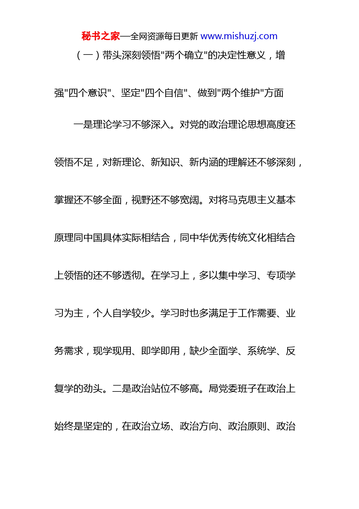 秘书之家—全网资源每日更新www.mishuzj.com市场监督管理局党委班子2022年度“六个带头”民主生活会对照检查材料XX市场监管局党委班子认真学习贯彻落实XXX精神,以习近平新时代中国特色社会主义思想为指导,紧紧围绕推进市场监管现代化、服务XX高质量发展战略要求,立足于找准问题、查摆问题、解决问题,紧盯全局政治建设、组织建设、作风建设、纪律建设,集中学习研讨,广泛征求意见,深入谈心谈话,细致严肃做好会前准备工作。现对照检查如下:一、对照检查情况秘书之家—全网资源每日更新www.mishuzj.com(一)带头深刻领悟"两个确立"的决定性意义,增强"四个意识"、坚定"四个自信"、做到"两个维护"方面一是理论学习不够深入。对党的政治理论思想高度还领悟不足,对新理论、新知识、新内涵的理解还不够深刻,掌握还不够全面,视野还不够宽阔。对将马克思主义基本原理同中国具体实际相结合,同中华优秀传统文化相结合上领悟的还不够透彻。在学习上,多以集中学习、专项学习为主,个人自学较少。学习时也多满足于工作需要、业务需求,现学现用、即学即用,缺少全面学、系统学、反复学的劲头。二是政治站位不够高。局党委班子在政治上始终是坚定的,在政治立场、政治方向、政治原则、政治秘书之家—全网资源每日更新www.mishuzj.com道路上同以习近平同志为核心的党中央保持高度一致,在大是大非面前立场坚定,旗帜鲜明。但在日常生活中,在网络信息上,对于不涉及市场监管队伍和业务领域的一些负面报道和不理智言论,往往认为与自己没有太大关联,没有在第一时间予以坚决驳斥和正向引导,对于各类"灰犀牛"事件的警惕性还不足,政治站位还需进一步提升。(二)带头用习近平新时代中国特色社会主义思想凝心铸魂方面一是学习内容还不够全面。多数时间只紧盯与市场监管工作紧密相关的内容学习,围绕全面建设社会主义现代化国家、全面深化改革、全面依法治国、全面从严治党、秘书之家—全网资源每日更新www.mishuzj.com贯彻新发展理念等相关内容学习次数较多,学习内容较细,理解较为深入,并能坚持以此指导各项业务工作开展。而对于强军目标、新型国际关系等涉及的内容学习次数较少,学习知识面相对较窄,对相关内容只满足于熟悉了解,缺乏深度思考。二是对新发展理念把握还不够准确。在把握好习近平新时代中国特色社会主义思想的世界观和方法论,坚持好、运用好贯穿其中的立场观点方法上还不够深入,理解的还不够准确。在守正创新方面,创新意识还有所欠缺,对所面临的新形势认识还不到位。在某些业务领域还存在不敢秘书之家—全网资源每日更新www.mishuzj.com创新、不善创新的情况,对于新发展理念、新兴事物的理解、落实较为缓慢。(三)带头坚持和加强党的全面领导方面一是党建工作缺乏系统规划。党建工作的系统性、互动性、长期性活动还有所缺乏,抓严抓实还不够,工作体系、专项监督问效机制还不够健全。由于本年度疫情防控工作压力较大,党委班子更多时候只是单纯提要求、定目标,一定程度上造成了实际工作中出现"急活急干"的情况,对"小个专"企业党建工作指导还不够深入。二是党建活动载体较为单一。对党建活动开展情况的调研还不精细,没有充分引导基层党组织开拓思路,致使一些基层的党建活动秘书之家—全网资源每日更新www.mishuzj.com多数时候还停留在开好三会一课、开展谈话谈心等形式上,党建工作形式创新不足,交流学习、互动提升不够。受疫情影响,一些原计划较大规模的培训、交流、实地学习未能开展。三是党建工作水平还不均衡。党委班子成员对分管的分局党建活动参加还不够经常,指导还不够全面,致使各分局党建活动成效存在差异。部分基层单位党建工作还存在重业务、轻党建的思想,党支部学习方式单一,项目进展较慢。(四)带头坚持以人民为中心的发展思想,推动改革发展稳定方面秘书之家—全网资源每日更新www.mishuzj.com一是改革创新思维还需进一步拓展。目前XX、XX等工作推进有序,取得初步成效,但还需不断扩大覆盖面,提升整体使用效能,计划在今年逐步向XX推广。同时,认证认可、标准化、计量、知识产权等专项业务开展进度还相对缓慢,工作亮点还不够突出,整体工作成效还不够明显,需要不断创新工作方式,加强工作力度。二是解决群众日常问题的能力有待提升。宗旨意识还不够强烈,对干部的日常培训还不够到位,导致在处理12315、12345投诉举报信息等工作时,有时还存在业务能力不精、专业水平不强、协调方式单一等情况,对政策法规、制度细节考秘书之家—全网资源每日更新www.mishuzj.com虑较多,在服务群众需求,柔性处置问题等方面考虑不足,影响了工作成效和群众获得感。(五)在带头发扬斗争精神,防范化解风险挑战方面一是对干部大局意识的培养还不够到位。导致个别同志在面对突发状况、急难险重问题时,斗争意识、担当意识、大局观念不足,存在一定畏难情绪,缺乏迎难而上的魄力和灵活应变的能力。二是抓干部综合能力提升的力度还不强。导致个别干部满足于现有工作成绩,未能积极适应全面深化改革发展大势,适应当前发展催人、形势逼人的环境形势,面对风险挑战和困难,缺乏政治定力和主动作为、主动应对的态度,仍然采取旧的思维模式和工作方秘书之家—