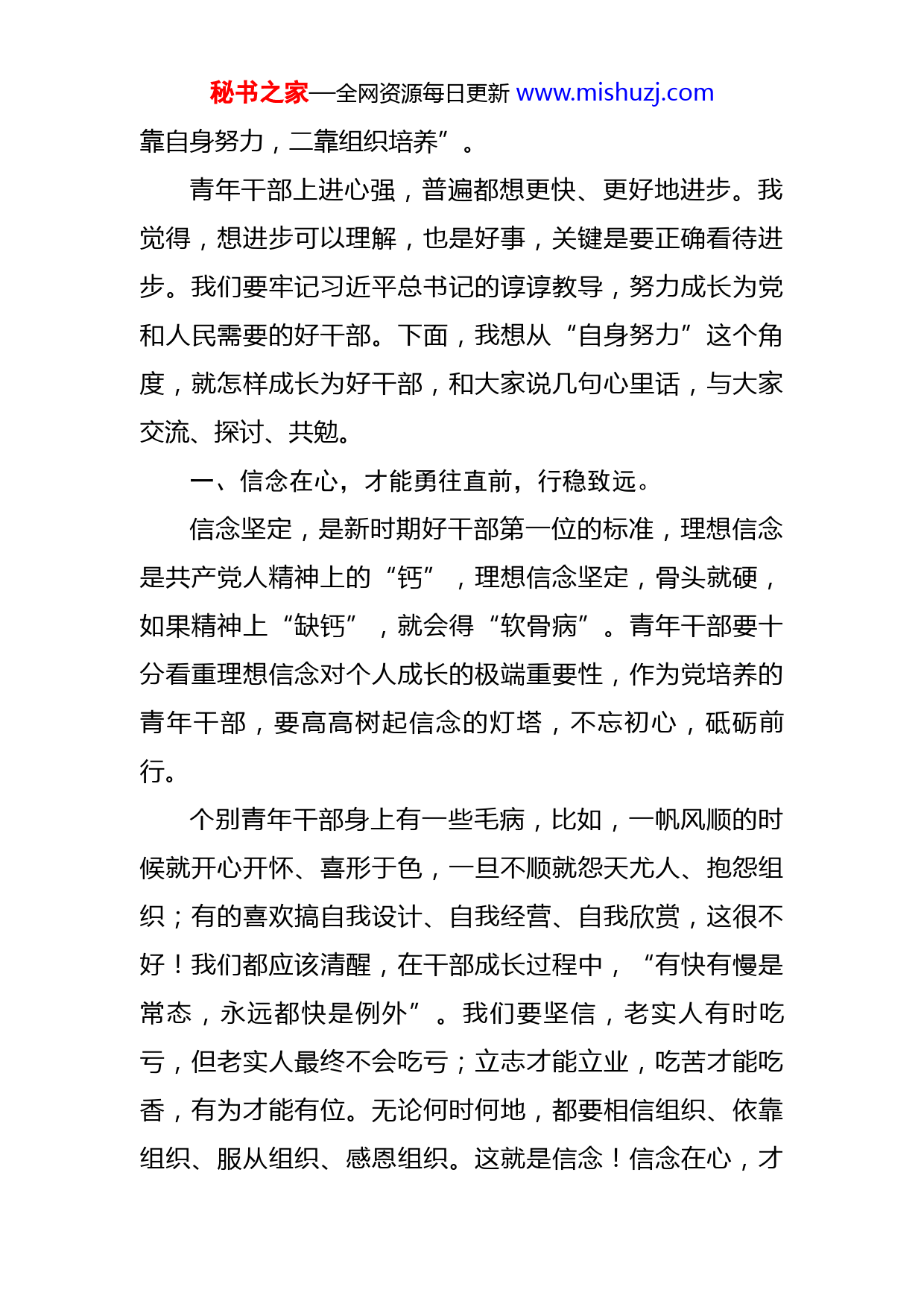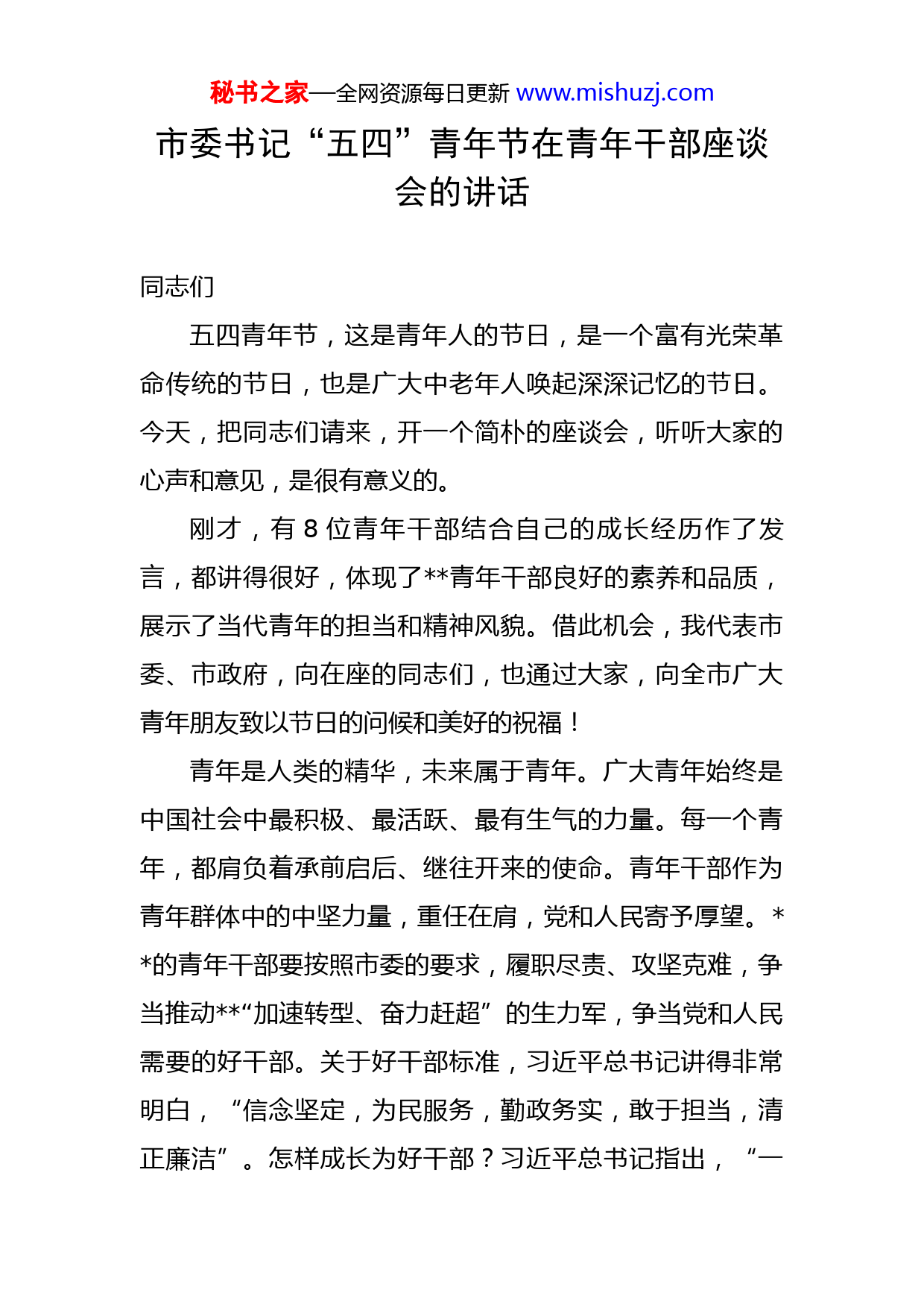 秘书之家—全网资源每日更新www.mishuzj.com市委书记“五四”青年节在青年干部座谈会的讲话同志们五四青年节,这是青年人的节日,是一个富有光荣革命传统的节日,也是广大中老年人唤起深深记忆的节日。今天,把同志们请来,开一个简朴的座谈会,听听大家的心声和意见,是很有意义的。刚才,有8位青年干部结合自己的成长经历作了发言,都讲得很好,体现了青年干部良好的素养和品质,展示了当代青年的担当和精神风貌。借此机会,我代表市委、市政府,向在座的同志们,也通过大家,向全市广大青年朋友致以节日的问候和美好的祝福!青年是人类的精华,未来属于青年。广大青年始终是中国社会中最积极、最活跃、最有生气的力量。每一个青年,都肩负着承前启后、继往开来的使命。青年干部作为青年群体中的中坚力量,重任在肩,党和人民寄予厚望。的青年干部要按照市委的要求,履职尽责、攻坚克难,争当推动“加速转型、奋力赶超”的生力军,争当党和人民需要的好干部。关于好干部标准,习近平总书记讲得非常明白,“信念坚定,为民服务,勤政务实,敢于担当,清正廉洁”。怎样成长为好干部?习近平总书记指出,“一秘书之家—全网资源每日更新www.mishuzj.com靠自身努力,二靠组织培养”。青年干部上进心强,普遍都想更快、更好地进步。我觉得,想进步可以理解,也是好事,关键是要正确看待进步。我们要牢记习近平总书记的谆谆教导,努力成长为党和人民需要的好干部。下面,我想从“自身努力”这个角度,就怎样成长为好干部,和大家说几句心里话,与大家交流、探讨、共勉。一、信念在心,才能勇往直前,行稳致远。信念坚定,是新时期好干部第一位的标准,理想信念是共产党人精神上的“钙”,理想信念坚定,骨头就硬,如果精神上“缺钙”,就会得“软骨病”。青年干部要十分看重理想信念对个人成长的极端重要性,作为党培养的青年干部,要高高树起信念的灯塔,不忘初心,砥砺前行。个别青年干部身上有一些毛病,比如,一帆风顺的时候就开心开怀、喜形于色,一旦不顺就怨天尤人、抱怨组织;有的喜欢搞自我设计、自我经营、自我欣赏,这很不好!我们都应该清醒,在干部成长过程中,“有快有慢是常态,永远都快是例外”。我们要坚信,老实人有时吃亏,但老实人最终不会吃亏;立志才能立业,吃苦才能吃香,有为才能有位。无论何时何地,都要相信组织、依靠组织、服从组织、感恩组织。这就是信念!信念在心,才秘书之家—全网资源每日更新www.mishuzj.com能披荆斩棘、勇往直前,才能行稳致远、健康成长。二、干任何工作有滋有味,去任何岗位才会有为有位。有些干部工作的“蜜月期”太短,图新鲜,犯“冷热病”,新的岗位呆的时间不长就没有激情和斗志了,得过且过,混日子。有的对岗位挑肥拣瘦,总觉得这个太清闲、没有实权,那个责任太大、有风险。岗位不是商品,不可能任由挑选,也不存在只有权力、没有责任的岗位。广大青年干部要始终听从组织的召唤,党叫干啥就干啥;始终爱岗敬业,履职尽责,干一行,爱一行;始终用快乐的心情去干工作,全身心地投入,把所有的工作干得有滋有味。工作有滋有味,成效就会有声有色。这样的干部,组织上把他放到任何地方、任何岗位,他都会奋发有为、大有作为。三、撸起袖子,扑下身子,才能改变样子。有的青年干部心态浮躁,思想浮浅,工作浮夸。沉不下身,静不下心;常常怀才不遇,却又眼高手低,大事做不了、小事不想做;夸夸其谈、好高骛远,嘴上功夫不错,但是做的功夫很差,想法很多、办法很少。我们干工作,一定要撸起袖子、甩开膀子、扑下身子,苦干实干,把心思、精力、智慧全部用在工作上。这样久久为功,绵绵用力,你就会改变一个单位、一个地方秘书之家—全网资源每日更新www.mishuzj.com的样子,年年有新气象,年年有新进步,人民群众的满意度也会年年提高。改变样子,还有一个含义,就是塑造你的个人形象。用心干事的过程,也是塑造个人形象的过程。你的付出和努力,群众看在眼里、记在心里,自然就会改变对你的看法,从而塑造一个务实的形象,一个能干的形象,一个敢于担当的形象。四、学会在“磨炼”中成长,防止在“锻炼”中镀金。“锻炼”不同于“磨炼”,“锻炼”的时间概念很短,而“磨炼”的时间概念很长。人们常说,“十年磨一剑”,“宝剑锋从磨砺出”,讲的就是这个道理。我们看一个干部,不光看他的履历简历,看他当过什么,还要看他干过什么、干成过什么。广大青年干部要多在做实事、办大事、了难事中磨炼自己,在复杂的岗位、复杂的地方摔打,增长才干,提高本领。在一个地方工作,要尽量做到少出事、不出大事,但有时出事又难免。出事不可怕,可怕的是出事之后不敢处理,不善于处理。不怕这事那事,就怕没有本事。在复杂的矛盾面前,我们既要敢于出手,又要善于出手,成事不坏事,无事不惹事,遇事不怕事,坏事变好事。在座的青年干部,大家都要淡化“锻炼”的概念,防止为了“镀金”去“锻炼”,要强化“磨炼”的意识,在“劳其筋骨、苦其心志”的“磨炼”中健秘书之家—全网资源每日更新www.mishuzj.com康成长。五、自己不攀比,组织挑选时肯定有对比。我认为,当干部要有一个健康的从政心态,理性平和地看自己、看他人、看组织、看社会,千万不要攀比。有些事可以攀比,但是做官不能攀比。有