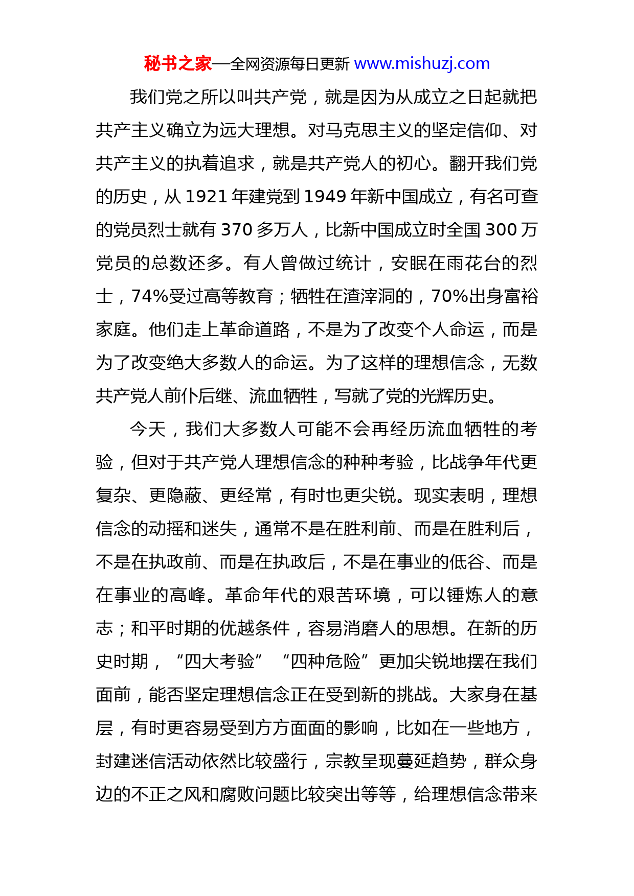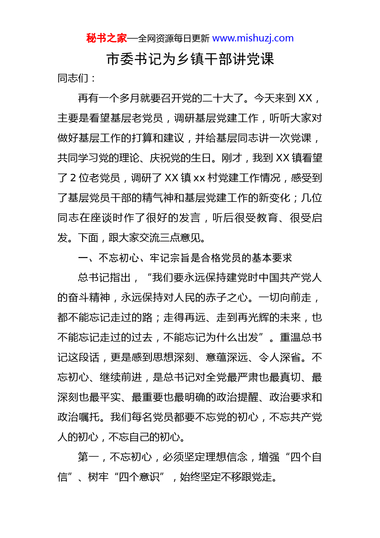 秘书之家—全网资源每日更新www.mishuzj.com市委书记为乡镇干部讲党课同志们:再有一个多月就要召开党的二十大了。今天来到XX,主要是看望基层老党员,调研基层党建工作,听听大家对做好基层工作的打算和建议,并给基层同志讲一次党课,共同学习党的理论、庆祝党的生日。刚才,我到XX镇看望了2位老党员,调研了XX镇xx村党建工作情况,感受到了基层党员干部的精气神和基层党建工作的新变化;几位同志在座谈时作了很好的发言,听后很受教育、很受启发。下面,跟大家交流三点意见。一、不忘初心、牢记宗旨是合格党员的基本要求总书记指出,“我们要永远保持建党时中国共产党人的奋斗精神,永远保持对人民的赤子之心。一切向前走,都不能忘记走过的路;走得再远、走到再光辉的未来,也不能忘记走过的过去,不能忘记为什么出发”。重温总书记这段话,更是感到思想深刻、意蕴深远、令人深省。不忘初心、继续前进,是总书记对全党最严肃也最真切、最深刻也最平实、最重要也最明确的政治提醒、政治要求和政治嘱托。我们每名党员都要不忘党的初心,不忘共产党人的初心,不忘自己的初心。第一,不忘初心,必须坚定理想信念,增强“四个自信”、树牢“四个意识”,始终坚定不移跟党走。秘书之家—全网资源每日更新www.mishuzj.com我们党之所以叫共产党,就是因为从成立之日起就把共产主义确立为远大理想。对马克思主义的坚定信仰、对共产主义的执着追求,就是共产党人的初心。翻开我们党的历史,从1921年建党到1949年新中国成立,有名可查的党员烈士就有370多万人,比新中国成立时全国300万党员的总数还多。有人曾做过统计,安眠在雨花台的烈士,74%受过高等教育;牺牲在渣滓洞的,70%出身富裕家庭。他们走上革命道路,不是为了改变个人命运,而是为了改变绝大多数人的命运。为了这样的理想信念,无数共产党人前仆后继、流血牺牲,写就了党的光辉历史。今天,我们大多数人可能不会再经历流血牺牲的考验,但对于共产党人理想信念的种种考验,比战争年代更复杂、更隐蔽、更经常,有时也更尖锐。现实表明,理想信念的动摇和迷失,通常不是在胜利前、而是在胜利后,不是在执政前、而是在执政后,不是在事业的低谷、而是在事业的高峰。革命年代的艰苦环境,可以锤炼人的意志;和平时期的优越条件,容易消磨人的思想。在新的历史时期,“四大考验”“四种危险”更加尖锐地摆在我们面前,能否坚定理想信念正在受到新的挑战。大家身在基层,有时更容易受到方方面面的影响,比如在一些地方,封建迷信活动依然比较盛行,宗教呈现蔓延趋势,群众身边的不正之风和腐败问题比较突出等等,给理想信念带来秘书之家—全网资源每日更新www.mishuzj.com了冲击。这些问题,如果不去正视、不去反思、不去警醒,我们的红色基因就有变异的危险。我们每一位共产党人,都要把坚定理想信念作为必修课,深入学习党的理论特别是习近平总书记系列重要讲话精神和治国理政新理念新思想新战略,增强“四个自信”、树牢“四个意识”,始终保持政治上的清醒和坚定。要把坚定理想信念与做好本职工作紧密结合,对党忠诚、为党分忧、为党担责、为党尽责,竭尽全力完成党交给的职责和任务。有这么一则寓言:一位智者路过烈日下的一个工地,所有人都在那儿汗流浃背地搬砖。智者问第一个人在干什么,那人特别没好气地回答“我在搬砖”。智者问第二个人在干什么,那人态度平和地说“我在砌墙”。智者问第三个人的时候,那人很骄傲地说“我在盖一座伟大的建筑”。我们每名党员都要像这则寓言里的第三个人那样,把自己的工作放在党的事业大局之中,立足本职岗位,为党的事业这座高楼大厦添砖加瓦。第二,不忘初心,必须牢记党的宗旨,永葆公仆本色、恪尽为民之责,持续提升群众获得感。《中国共产党章程》明确指出,“党除了工人阶级和最广大人民群众的利益,没有自己特殊的利益”。全心全意为人民服务,是我们党的宗旨,也是共产党人的初心。新的历史时期不忘初心,就是要不忘我们党为人民谋利益秘书之家—全网资源每日更新www.mishuzj.com而不是为自身谋利益的初衷,不忘人民群众对美好生活的向往就是我们的奋斗目标,自觉做到心中有民、甘当公仆。其实,这个道理大家都懂,很多同志也经常挂在嘴上,但有的却言行不一、光说不做。大家想一想,为什么现在政策越来越好、生活越来越好,一些群众还“端起碗来吃肉,放下筷子骂娘”?为什么党委政府为群众办了那么多实事好事,一些地方的信访问题却依然比较突出?为什么一些党员干部觉得自己工作很辛苦,却得不到群众的认可?究其原因,就在于一些党员干部没有摆正自己与群众的关系,没有把群众当主人、把自己当公仆,习惯于高高在上“当官做老爷”。有的为群众办了一些事,却没有办到群众的心坎上,甚至只是为了出政绩、出形象;有的为群众办事时带着一种居高临下的“恩赐”心理,没有发自真心地做到“群众有所呼、政府有所应,群众有所需、政府有所为”。这些,都是世界观、人生观、价值观和政绩观出了问题。大家身在基层,处在联系服务群众的第一线,更要始终在心里装着群众,多为群众办实事。只有这样,才能干事创业有激情、化解矛盾有热情、扶贫济困有温情,才能赢得群众的理解和支持。希望大家