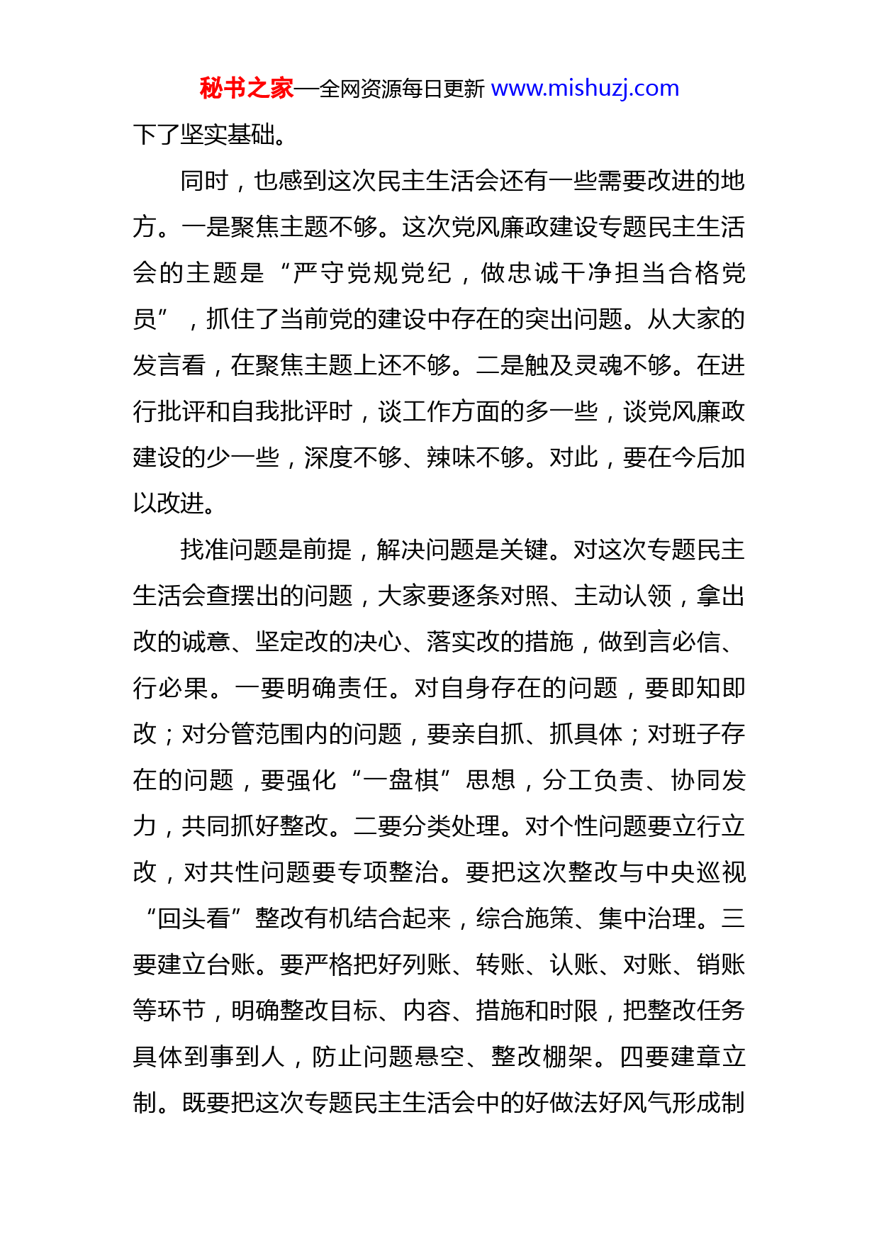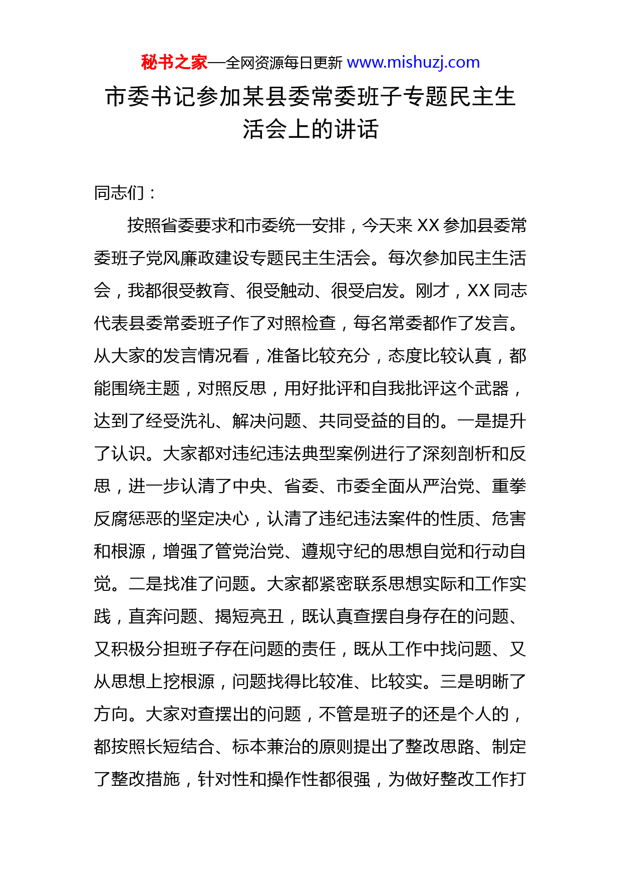 秘书之家—全网资源每日更新www.mishuzj.com市委书记参加某县委常委班子专题民主生活会上的讲话同志们:按照省委要求和市委统一安排,今天来XX参加县委常委班子党风廉政建设专题民主生活会。每次参加民主生活会,我都很受教育、很受触动、很受启发。刚才,XX同志代表县委常委班子作了对照检查,每名常委都作了发言。从大家的发言情况看,准备比较充分,态度比较认真,都能围绕主题,对照反思,用好批评和自我批评这个武器,达到了经受洗礼、解决问题、共同受益的目的。一是提升了认识。大家都对违纪违法典型案例进行了深刻剖析和反思,进一步认清了中央、省委、市委全面从严治党、重拳反腐惩恶的坚定决心,认清了违纪违法案件的性质、危害和根源,增强了管党治党、遵规守纪的思想自觉和行动自觉。二是找准了问题。大家都紧密联系思想实际和工作实践,直奔问题、揭短亮丑,既认真查摆自身存在的问题、又积极分担班子存在问题的责任,既从工作中找问题、又从思想上挖根源,问题找得比较准、比较实。三是明晰了方向。大家对查摆出的问题,不管是班子的还是个人的,都按照长短结合、标本兼治的原则提出了整改思路、制定了整改措施,针对性和操作性都很强,为做好整改工作打秘书之家—全网资源每日更新www.mishuzj.com下了坚实基础。同时,也感到这次民主生活会还有一些需要改进的地方。一是聚焦主题不够。这次党风廉政建设专题民主生活会的主题是“严守党规党纪,做忠诚干净担当合格党员”,抓住了当前党的建设中存在的突出问题。从大家的发言看,在聚焦主题上还不够。二是触及灵魂不够。在进行批评和自我批评时,谈工作方面的多一些,谈党风廉政建设的少一些,深度不够、辣味不够。对此,要在今后加以改进。找准问题是前提,解决问题是关键。对这次专题民主生活会查摆出的问题,大家要逐条对照、主动认领,拿出改的诚意、坚定改的决心、落实改的措施,做到言必信、行必果。一要明确责任。对自身存在的问题,要即知即改;对分管范围内的问题,要亲自抓、抓具体;对班子存在的问题,要强化“一盘棋”思想,分工负责、协同发力,共同抓好整改。二要分类处理。对个性问题要立行立改,对共性问题要专项整治。要把这次整改与中央巡视“回头看”整改有机结合起来,综合施策、集中治理。三要建立台账。要严格把好列账、转账、认账、对账、销账等环节,明确整改目标、内容、措施和时限,把整改任务具体到事到人,防止问题悬空、整改棚架。四要建章立制。既要把这次专题民主生活会中的好做法好风气形成制秘书之家—全网资源每日更新www.mishuzj.com度、固化下来,又要从自己分管领域出发反思问题、归纳总结、完善制度,既要建好制度,又要强化执行,真正做到标本兼治。在我们党的组织结构和国家政权结构中,县一级处在承上启下的关键环节。“郡县治,天下安”,只有把县一级抓好了,党的各项事业才能稳步推进;只有每个县(市、区)都把全面从严治党要求落到实处,全市党建水平才能不断提升。大家作为县委常委班子成员,岗位特殊、作用重要,是全县70万人民的主心骨,一定要按照习近平总书记提出的“不忘初心、继续前进”要求,切实把管党治党的责任扛起来,不断加强班子自身建设,推动全面从严治党向纵深推进、向基层延伸,更好地肩负起推动一方发展、造福一方百姓的使命责任。借此机会,就进一步加强党风廉政建设、推进全面从严治党,我讲三点意见,与大家交流。一、坚持以责促行,把主体责任扛牢扛实主体责任不落实,从严治党就落空。剖析近年来发生在我们身边的严重违纪违法案件,背后都存在主体责任缺失的问题,该管的不管,该严的不严。这个问题,市级层面存在,县级层面也存在,一定程度上基层更为突出。必须牢固树立“抓好党建是最大政绩”的思想,进一步强化主责主业意识,以开展“主体责任深化年”活动为抓手,秘书之家—全网资源每日更新www.mishuzj.com切实将责任落到实处。一要带头知责履责。党要管党,首先是党委要管、书记要管。目前,一些地方存在“重业务、轻党建”的现象,党建工作说的多、做的少;一些干部存在好人主义思想,监督执纪抹不开面子、怕得罪人,这些现象必须坚决予以纠正。要带头强化责任担当,认真履行党委主体责任、书记第一责任人责任和班子成员“一岗双责”。要认识到,党风廉政建设的好与坏,县委书记是全县的第一责任人,人大、政府、政协党组书记是所在系统的第一责任人,各委局党组书记是所在部门的第一责任人,必须把管党治党的责任扛起来。只有这样,才能始终保持管党治党不放松、正风肃纪不停步、反腐惩恶不手软的战略定力,真管真严、敢管敢严、长管长严,使管党治党真正从宽松软走向严紧硬。二要层层明责尽责。目前,无论全市还是XX,管党治党责任都存在层层衰减的问题,总体而言,党组不如党委、乡镇不如市县、市直单位不如县区、县直单位不如乡镇。甚至在一些地方,党组织软弱涣散、形同虚设。要逐级传导压力、层层压实责任,进一步扣紧管党治党责任链条,把从严要求落实到每一级党组织、每个班子、每名党员,决不能“上面九级大风,下面纹丝不动”。尤其要夯实县直单位和乡镇、村的管党治党责任,着力加强薄弱环秘书之家—全网资源每日更