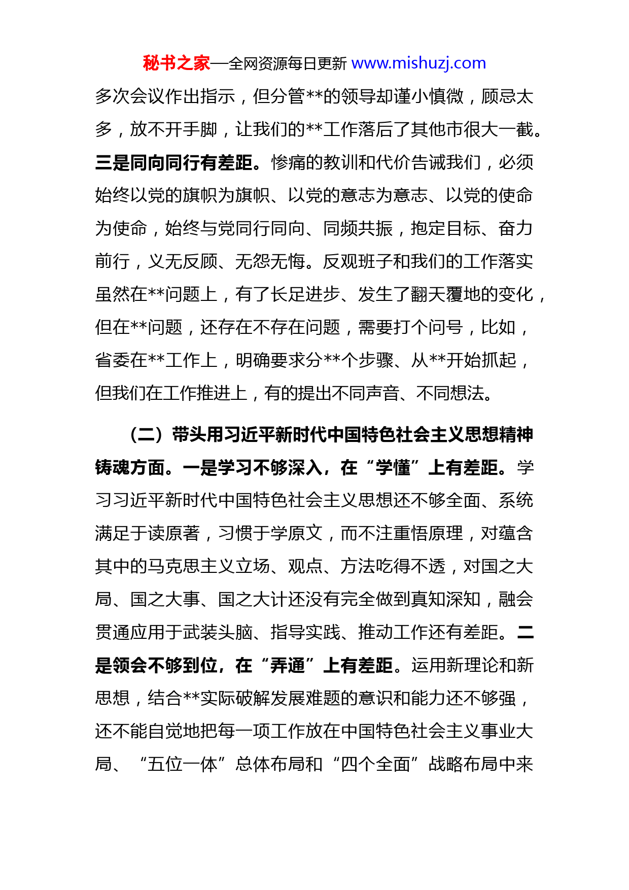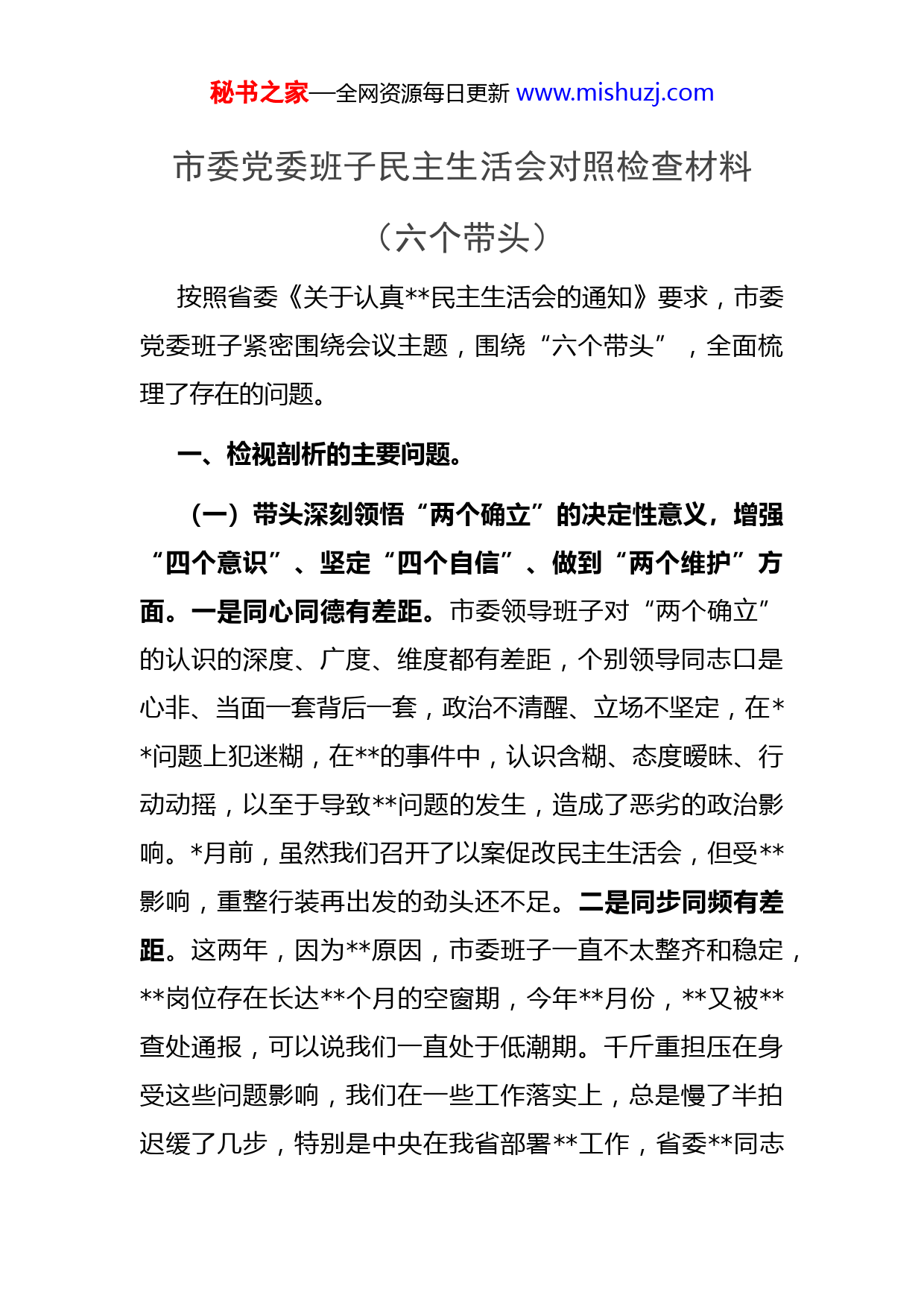 秘书之家—全网资源每日更新www.mishuzj.com市委党委班子民主生活会对照检查材料(六个带头)按照省委《关于认真民主生活会的通知》要求,市委党委班子紧密围绕会议主题,围绕“六个带头”,全面梳理了存在的问题。一、检视剖析的主要问题。(一)带头深刻领悟“两个确立”的决定性意义,增强“四个意识”、坚定“四个自信”、做到“两个维护”方面。一是同心同德有差距。市委领导班子对“两个确立”的认识的深度、广度、维度都有差距,个别领导同志口是心非、当面一套背后一套,政治不清醒、立场不坚定,在问题上犯迷糊,在的事件中,认识含糊、态度暧昧、行动动摇,以至于导致问题的发生,造成了恶劣的政治影响。月前,虽然我们召开了以案促改民主生活会,但受影响,重整行装再出发的劲头还不足。二是同步同频有差距。这两年,因为原因,市委班子一直不太整齐和稳定,岗位存在长达个月的空窗期,今年月份,又被查处通报,可以说我们一直处于低潮期。千斤重担压在身受这些问题影响,我们在一些工作落实上,总是慢了半拍迟缓了几步,特别是中央在我省部署工作,省委同志秘书之家—全网资源每日更新www.mishuzj.com多次会议作出指示,但分管的领导却谨小慎微,顾忌太多,放不开手脚,让我们的工作落后了其他市很大一截。三是同向同行有差距。惨痛的教训和代价告诫我们,必须始终以党的旗帜为旗帜、以党的意志为意志、以党的使命为使命,始终与党同行同向、同频共振,抱定目标、奋力前行,义无反顾、无怨无悔。反观班子和我们的工作落实虽然在问题上,有了长足进步、发生了翻天覆地的变化,但在问题,还存在不存在问题,需要打个问号,比如,省委在工作上,明确要求分个步骤、从开始抓起,但我们在工作推进上,有的提出不同声音、不同想法。(二)带头用习近平新时代中国特色社会主义思想精神铸魂方面。一是学习不够深入,在“学懂”上有差距。学习习近平新时代中国特色社会主义思想还不够全面、系统满足于读原著,习惯于学原文,而不注重悟原理,对蕴含其中的马克思主义立场、观点、方法吃得不透,对国之大局、国之大事、国之大计还没有完全做到真知深知,融会贯通应用于武装头脑、指导实践、推动工作还有差距。二是领会不够到位,在“弄通”上有差距。运用新理论和新思想,结合实际破解发展难题的意识和能力还不够强,还不能自觉地把每一项工作放在中国特色社会主义事业大局、“五位一体”总体布局和“四个全面”战略布局中来秘书之家—全网资源每日更新www.mishuzj.com研究思路、提出对策,贯彻新发展理念有差距,有时没有站在党和国家经济发展全局高度观大势、谋大事。三是践行不够彻底,在“做实”上有差距。改造思想、党性锻炼不够经常,不善于从一般事务中发现政治问题,从倾向性苗头性问题中发现政治端倪,认识事物很多时候只停留在表面,科学把握形势变化、精准识别现象本质、有效抵御风险挑战的能力还不够强;看齐追随停留在理论上、情感上多,贯彻到行动中、实践中少,距离内化于心、外化于行要求还有较大差距。省委巡视指出了个具体问题,根子都在党委。(三)带头坚持和加强党的全面领导方面。一是对工作的全面领导还不够有力。对“党政军民学、东西南北中,党是领导一切的”认识还不够深刻全面,抓党务和政务“一头冷一头热”,不善于统揽工作全局,党的领导整体性不强;对自身建设抓得还不够紧,执行民主集中制不够到位,斗争性还不强,开展批评与自我批评时红脸出汗不够;贯彻落实习近平总书记重要指示批示、党中央决策部署和上级指示精神的力度还不够,有时把不准切入点和着力点,习惯于原文下发、摘要学习、领导传阅,贯彻措施大而化之、结合实际不紧。二是对党组织的督促指导还不够深入。落实党委抓建党支部制度不够严格,帮建支部工秘书之家—全网资源每日更新www.mishuzj.com作中不注重把党组织履行管党治党责任情况作为重要内容突出出来,导致有的党支部贯彻执行组织生活制度不严肃“一岗双责”程式化、“三会一课”形式化、党内生活随意化的现象还比较普遍;对市委、市政府机关党的建设指导不够有力,还存在“灯下黑”现象,党组织功能部门化的问题客观存在。三是对党员的教育引导还不够走心。党管干部、党管党员的办法举措不多,导致部分党员党章意识、党员意识观念淡薄,对利益得失看得过重,对个人成长进步关注过多,心浮气躁、精力外移、心思不稳,工作不够安心尽心,2022年,系统发生腐败问题,教训极其深刻、造成恶劣影响;个别的党员同志不注重加强自省自警,还没有养成老老实实按制度规矩办事的行为习惯,依然抱着“小节无害”的麻痹心理、“下不为例”的试探心理和“不为人知”的侥幸心理。今年以来多名干部因违反“六大纪律”受到党纪政纪处分和组织处理。(四)带头坚持以人民为中心的发展思想,推动改革发展稳定方面。一是服务发展理念还有差距。站在的高度、实现发展的高度发挥基层县、乡、村三级区域经济发展地位作用的理念树得不牢,指导基层构建经济发展能力体系认识还不够深、紧迫感不够强,市委顶层设计不够班子成员缺乏深思熟虑。二是调查研究作风还有差距。党秘书之家—全网资源每日更新www.mishuzj.com委班子成员调查研究之风不够