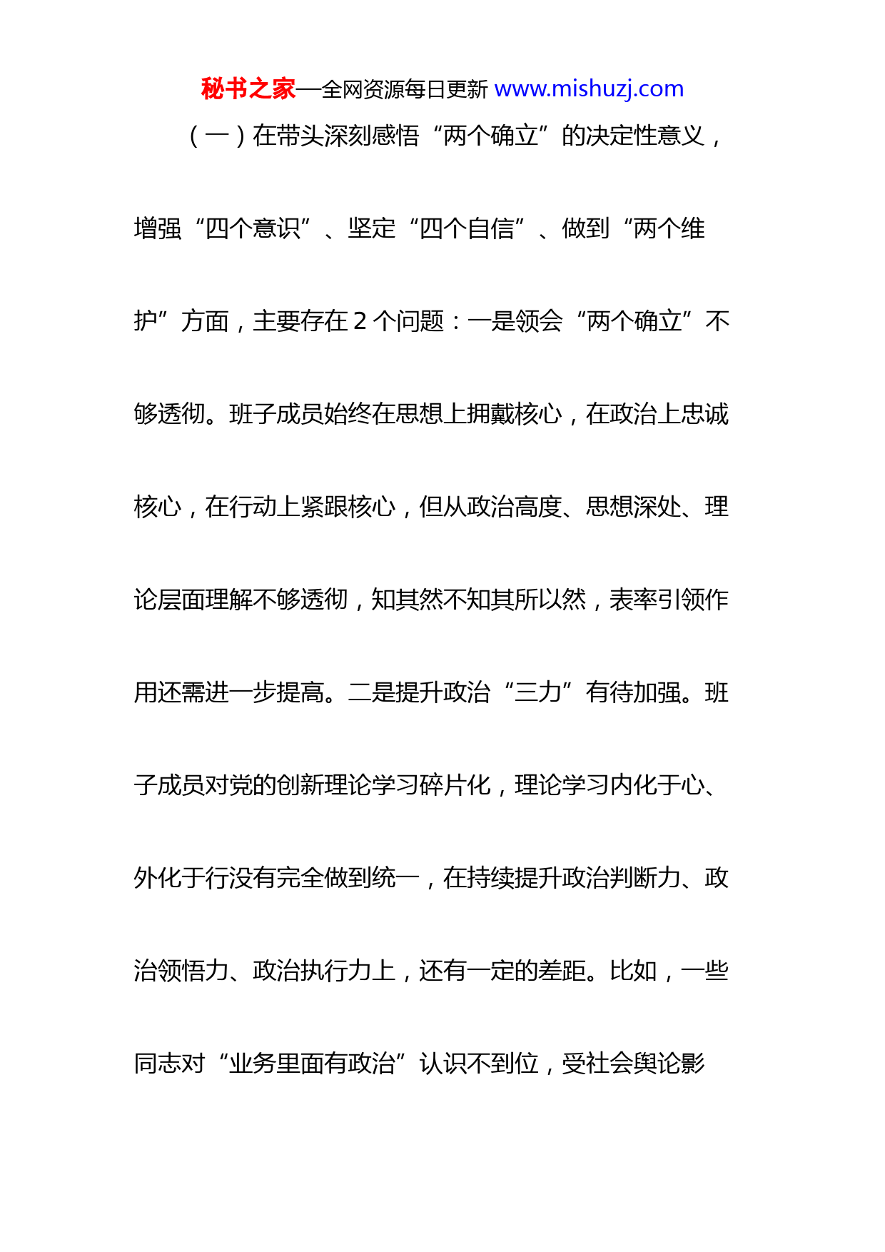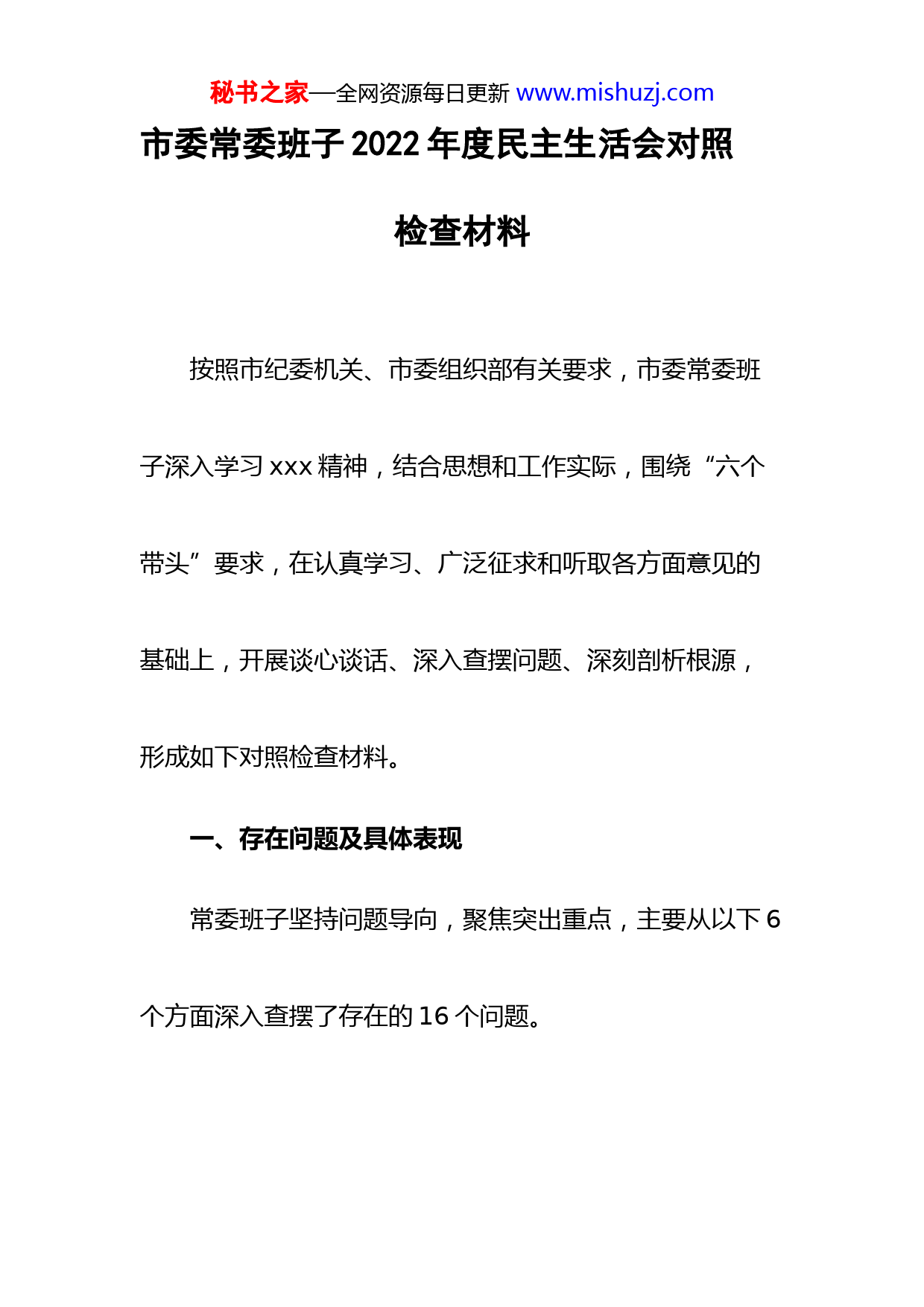 秘书之家—全网资源每日更新www.mishuzj.com市委常委班子2022年度民主生活会对照检查材料按照市纪委机关、市委组织部有关要求,市委常委班子深入学习xxx精神,结合思想和工作实际,围绕“六个带头”要求,在认真学习、广泛征求和听取各方面意见的基础上,开展谈心谈话、深入查摆问题、深刻剖析根源,形成如下对照检查材料。一、存在问题及具体表现常委班子坚持问题导向,聚焦突出重点,主要从以下6个方面深入查摆了存在的16个问题。秘书之家—全网资源每日更新www.mishuzj.com(一)在带头深刻感悟“两个确立”的决定性意义,增强“四个意识”、坚定“四个自信”、做到“两个维护”方面,主要存在2个问题:一是领会“两个确立”不够透彻。班子成员始终在思想上拥戴核心,在政治上忠诚核心,在行动上紧跟核心,但从政治高度、思想深处、理论层面理解不够透彻,知其然不知其所以然,表率引领作用还需进一步提高。二是提升政治“三力”有待加强。班子成员对党的创新理论学习碎片化,理论学习内化于心、外化于行没有完全做到统一,在持续提升政治判断力、政治领悟力、政治执行力上,还有一定的差距。比如,一些同志对“业务里面有政治”认识不到位,受社会舆论影秘书之家—全网资源每日更新www.mishuzj.com响,对春节期间禁燃禁放等要求理解不深,时效和标准有打折扣现象。(二)在带头用习近平新时代中国特色社会主义思想凝心铸魂方面,主要存在2个问题:一是理论学习不够深入。常委班子严格落实常委会会前集体学习制度,坚持集中学和自学相结合,但对标学懂弄通做实要求还有差距,对xxx提出的许多新观点、新论断、新要求,研究得还不够深、不够透。二是学用结合不够紧密。有的班子成员在知行合一、以知促行上做得不够,不能及时将党的最新理论成果转化为高质量发展的思路和举措。比如,xxx报告秘书之家—全网资源每日更新www.mishuzj.com提出要奋进中国式现代化,但在如何贯彻落实上思考研究不够,没有结合实际细化为具体的措施。(三)在带头坚持和加强党的全面领导方面,主要存在3个问题:一是基层党建推进不够均衡。常委班子认真履行“把方向、管大局、作决策、保落实”的职责,把党的领导贯穿到工作的全过程各领域,但推动基层党建工作存在着方法相对单一、手段相对陈旧的现象。比如,在今年党建述职评议考核会议上,夏书记就指出我们一些社区物业党建联建机制不健全,“小个专”党建工作力度不够,两新组织党的工作覆盖质量不高的问题。二是党建作用发挥不够充分。在基层党建工作中,有时片面追求工作秘书之家—全网资源每日更新www.mishuzj.com载体创新、形式创新,忽略了党建联系服务、教育引导群众的目的,基层党组织的凝聚力和战斗力还不够强。三是协同联动机制不够有力。多部门协作机制、沟通机制、责任机制还不健全,在面对一些需要多部门共同参与的综合性工作时,有时存在补位不够及时的现象。(四)在带头坚持以人民为中心的发展思想,推动改革发展稳定方面,主要存在3个问题:一是联系群众不够紧密。常委班子深入践行以人民为中心的发展思想,但深入基层一线倾听群众意见还不够深入、经常,没有真正与群众面对面沟通、心贴心交流,没有完全把基层情况和群众思想吃准、摸透。二是服务群众不够有力。有的班子成秘书之家—全网资源每日更新www.mishuzj.com员对基层群众诉求关注少,在破解民生问题上缺少思路,在兴办民生实事上缺少举措,尽管可能做了许多工作,但没有给群众带来实实在在的获得感。三是回应群众不够高效。有的班子成员缺少“群众情怀”,没有真正做到问需于民、问计于民、问效于民,没有把市委的决策部署给群众讲清讲透,在征地拆迁、疫情防控等工作上,群众开始不理解,后期才有所认可。(五)在带头发扬斗争精神,防范化解风险挑战方面,主要存在3个问题:一是改革创新的思路不宽。常委班子带头发扬斗争精神,增强斗争本领,关键时刻站得出来、豁得出去,但面对新形势的发展要求,思路不够开秘书之家—全网资源每日更新www.mishuzj.com阔,系统性、整体性、协同性推进高质量发展的能力仍需加强。二是敢闯敢试的锐气不足。有的班子成员在急难险重问题面前,存在畏难情绪,缺乏攻坚克难的志气、敢闯敢试的锐气、大胆负责的勇气。比如,一些同志面对改革发展任务,不敢啃“硬骨头”,工作畏首畏尾,对于历史遗留问题绕道走。三是应对风险的能力不强。有的班子成员在防范化解重大风险上存在侥幸心理,对一些倾向性问题反应不够敏锐,对分管领域的情况不明、底数不清,在社会稳定、突发事件、信访积案化解等方面缺乏经验。(六)在带头落实全面从严治党政治责任方面,主要存在3个问题:一是落实“一岗双责”不够有力。常委班秘书之家—全网资源每日更新www.mishuzj.com子始终保持自我革命的清醒和坚定,纵深推进全面从严治党,但在落实“一岗双责”上还有差距,一些班子成员存在“老好人思想”,对分管领域干部存在的缺点和错误提醒不够多、批评教育不力。二是纠治“四风”问题不够彻底。有的班子成员抓落实标准不高,跳不出以会议贯彻、以文件落实的思维定势,满足于会开了、文发了,多少存在一些形式主义倾向。三是干部管理监督不够严格。基层单位财务管理制度不规范,对