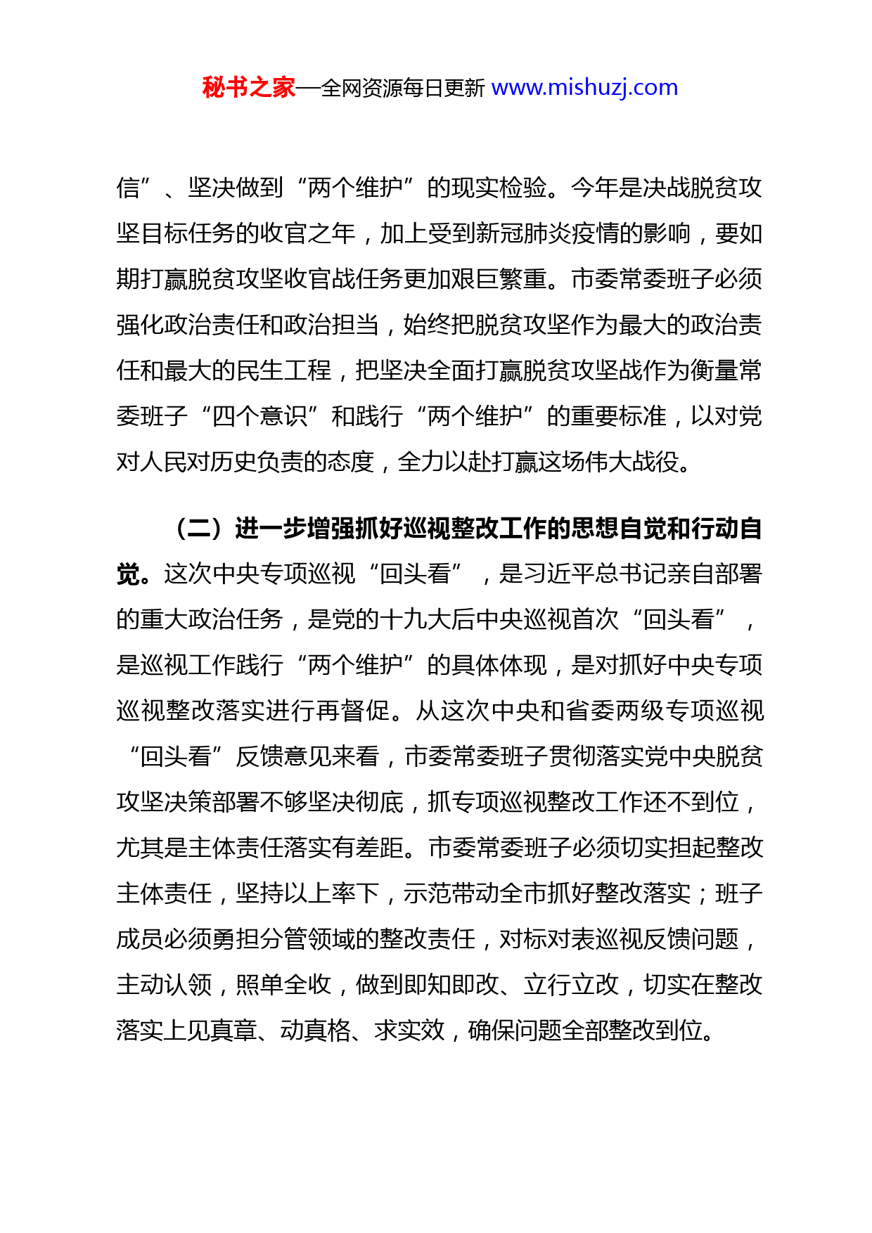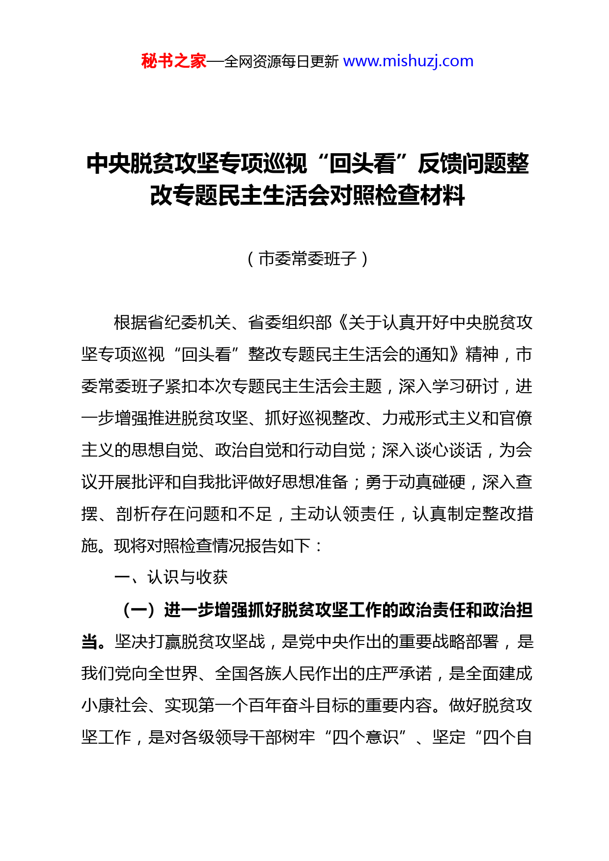秘书之家—全网资源每日更新www.mishuzj.com中央脱贫攻坚专项巡视“回头看”反馈问题整改专题民主生活会对照检查材料(市委常委班子)根据省纪委机关、省委组织部《关于认真开好中央脱贫攻坚专项巡视“回头看”整改专题民主生活会的通知》精神,市委常委班子紧扣本次专题民主生活会主题,深入学习研讨,进一步增强推进脱贫攻坚、抓好巡视整改、力戒形式主义和官僚主义的思想自觉、政治自觉和行动自觉;深入谈心谈话,为会议开展批评和自我批评做好思想准备;勇于动真碰硬,深入查摆、剖析存在问题和不足,主动认领责任,认真制定整改措施。现将对照检查情况报告如下:一、认识与收获(一)进一步增强抓好脱贫攻坚工作的政治责任和政治担当。坚决打赢脱贫攻坚战,是党中央作出的重要战略部署,是我们党向全世界、全国各族人民作出的庄严承诺,是全面建成小康社会、实现第一个百年奋斗目标的重要内容。做好脱贫攻坚工作,是对各级领导干部树牢“四个意识”、坚定“四个自秘书之家—全网资源每日更新www.mishuzj.com信”、坚决做到“两个维护”的现实检验。今年是决战脱贫攻坚目标任务的收官之年,加上受到新冠肺炎疫情的影响,要如期打赢脱贫攻坚收官战任务更加艰巨繁重。市委常委班子必须强化政治责任和政治担当,始终把脱贫攻坚作为最大的政治责任和最大的民生工程,把坚决全面打赢脱贫攻坚战作为衡量常委班子“四个意识”和践行“两个维护”的重要标准,以对党对人民对历史负责的态度,全力以赴打赢这场伟大战役。(二)进一步增强抓好巡视整改工作的思想自觉和行动自觉。这次中央专项巡视“回头看”,是习近平总书记亲自部署的重大政治任务,是党的十九大后中央巡视首次“回头看”,是巡视工作践行“两个维护”的具体体现,是对抓好中央专项巡视整改落实进行再督促。从这次中央和省委两级专项巡视“回头看”反馈意见来看,市委常委班子贯彻落实党中央脱贫攻坚决策部署不够坚决彻底,抓专项巡视整改工作还不到位,尤其是主体责任落实有差距。市委常委班子必须切实担起整改主体责任,坚持以上率下,示范带动全市抓好整改落实;班子成员必须勇担分管领域的整改责任,对标对表巡视反馈问题,主动认领,照单全收,做到即知即改、立行立改,切实在整改落实上见真章、动真格、求实效,确保问题全部整改到位。秘书之家—全网资源每日更新www.mishuzj.com(三)进一步坚定打赢脱贫攻坚收官战的信心决心。通过这次中央和省委专项巡视“回头看”,让市委常委班子更加清楚地认识到全市脱贫攻坚工作还有很多短板弱项需要补齐建强,还有很多突出问题需要持续深化整改落实。目前,全市尚有XX个贫困县、XX个贫困村、XX万贫困人口未脱贫摘帽,这些都是贫中之贫、困中之困、坚中之坚,是最难啃的“硬骨头”,如果还任由各类问题堆积,不抓好补短板强弱项的工作,全市必将无法打赢脱贫攻坚收官战。市委常委班子必须坚定信心决心,采取超常规举措,着力整改问题,加快补齐短板弱项,坚决啃下“硬骨头”,确保全市如期全面打赢脱贫攻坚战。二、存在的突出问题(一)对照中央脱贫攻坚专项巡视“回头看”反馈意见1.在“落实巡视整改主体责任仍存在不足”方面。我们坚持以巡视反馈问题为镜鉴,坚决扛起巡视整改主体责任,把巡视整改与中央、省各级各类督查考评发现问题整改,以及开展“不忘初心、牢记使命”主题教育有机结合起来,发扬斗争精神,增强斗争本领,推进自我革命,切实解决自身存在的突出问题和群众反映强烈的热点难点问题,以实实在在的整改成效检验脱贫攻坚工作成效。但通过认真查摆,仍存在一些问题:秘书之家—全网资源每日更新www.mishuzj.com一是整改责任落实还不够到位。虽然全市各级各部门强化政治担当,聚焦问题、聚焦要求、聚焦进度,狠抓问题整改落实,但也还存在不到位的情况。比如,部分县区脱贫攻坚责任未压紧压实,XX。二是抓重点工作整改还不够到位。我市围绕专项巡视反馈的XX等重点问题整改工作,虽然出台了一系列政策措施,但政策落实力度不够强。比如,XX;充分利用国家政策红利的能力有待进一步提高,与国家、省的沟通汇报还不充分,信息、资源的整合利用还没有发挥出最佳效果,对重点工作与国家层面重大战略、重大专项规划进行有效衔接方面还有待加强。三是稳定脱贫的基础还不够牢靠。比如,目前全市扶贫产业覆盖率为XX%,但产业组织化程度低、产业链短,且受疫情影响,特色农产品市场消费低迷,贫困群众的稳定收入来源受到影响。又如,抓党建促脱贫攻坚工作效果有待提升。XX。再如,脱贫攻坚成果巩固有待加强。XX。2.在“巡视整改监督责任落实还不够”方面。我们坚持把全面从严治党要求贯穿脱贫攻坚全过程,加强领导指导,压紧压实纪检监察监督职责和各职能部门监管责任,强化扶贫领域腐败和作风问题专项治理,着力营造风清气正的良好政治生态,切实为脱贫攻坚提供坚强保障。但通过认真查摆,仍存在一些问题:一是整改日常监督不够到位。比如,对整改的日常秘书之家—全网资源每日更新www.mishuzj.com监督有时还存在“一督了之”现象,对各级党委(党组)传导压力不够到位,监督发现问题提出整改意见后,不持续跟踪,不掌握进展情况,对于整改落实不到位,提醒不够,问责较少X