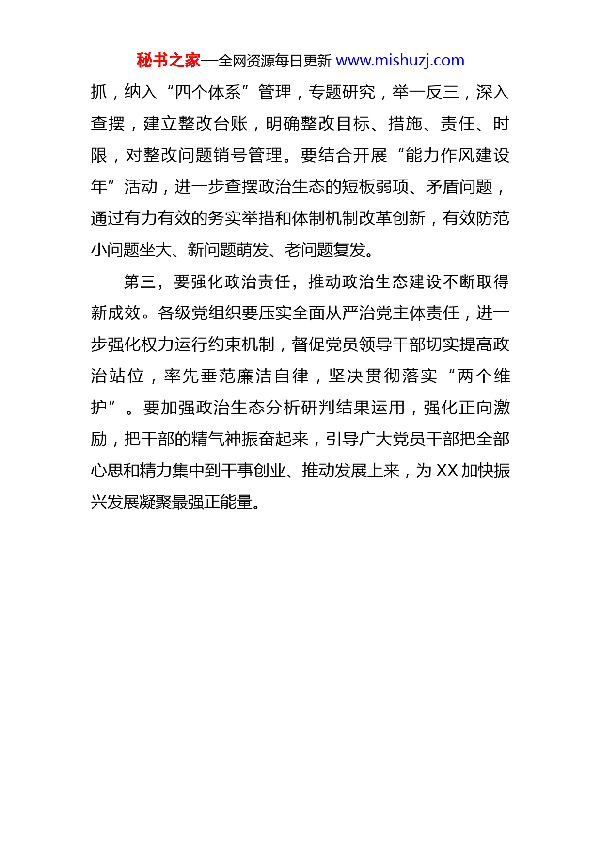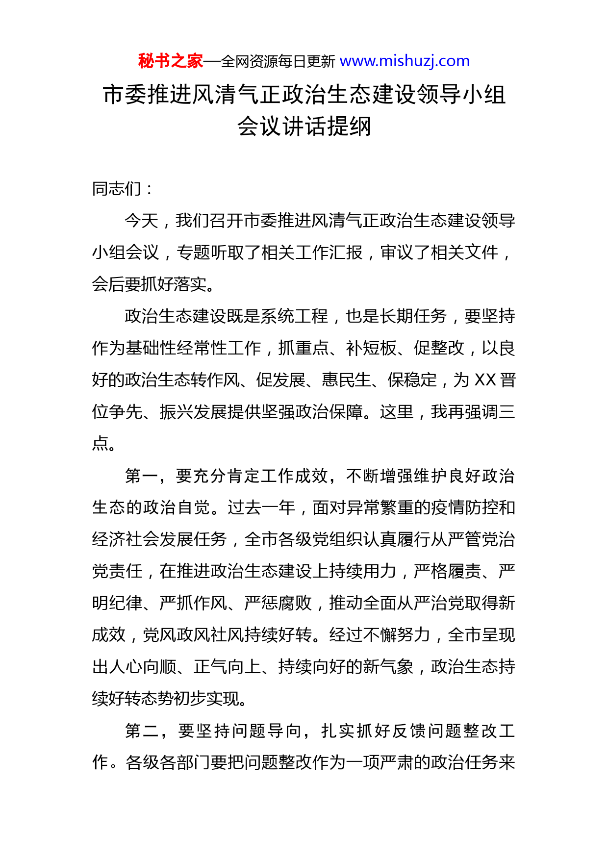 秘书之家—全网资源每日更新www.mishuzj.com市委推进风清气正政治生态建设领导小组会议讲话提纲同志们:今天,我们召开市委推进风清气正政治生态建设领导小组会议,专题听取了相关工作汇报,审议了相关文件,会后要抓好落实。政治生态建设既是系统工程,也是长期任务,要坚持作为基础性经常性工作,抓重点、补短板、促整改,以良好的政治生态转作风、促发展、惠民生、保稳定,为XX晋位争先、振兴发展提供坚强政治保障。这里,我再强调三点。第一,要充分肯定工作成效,不断增强维护良好政治生态的政治自觉。过去一年,面对异常繁重的疫情防控和经济社会发展任务,全市各级党组织认真履行从严管党治党责任,在推进政治生态建设上持续用力,严格履责、严明纪律、严抓作风、严惩腐败,推动全面从严治党取得新成效,党风政风社风持续好转。经过不懈努力,全市呈现出人心向顺、正气向上、持续向好的新气象,政治生态持续好转态势初步实现。第二,要坚持问题导向,扎实抓好反馈问题整改工作。各级各部门要把问题整改作为一项严肃的政治任务来秘书之家—全网资源每日更新www.mishuzj.com抓,纳入“四个体系”管理,专题研究,举一反三,深入查摆,建立整改台账,明确整改目标、措施、责任、时限,对整改问题销号管理。要结合开展“能力作风建设年”活动,进一步查摆政治生态的短板弱项、矛盾问题,通过有力有效的务实举措和体制机制改革创新,有效防范小问题坐大、新问题萌发、老问题复发。第三,要强化政治责任,推动政治生态建设不断取得新成效。各级党组织要压实全面从严治党主体责任,进一步强化权力运行约束机制,督促党员领导干部切实提高政治站位,率先垂范廉洁自律,坚决贯彻落实“两个维护”。要加强政治生态分析研判结果运用,强化正向激励,把干部的精气神振奋起来,引导广大党员干部把全部心思和精力集中到干事创业、推动发展上来,为XX加快振兴发展凝聚最强正能量。