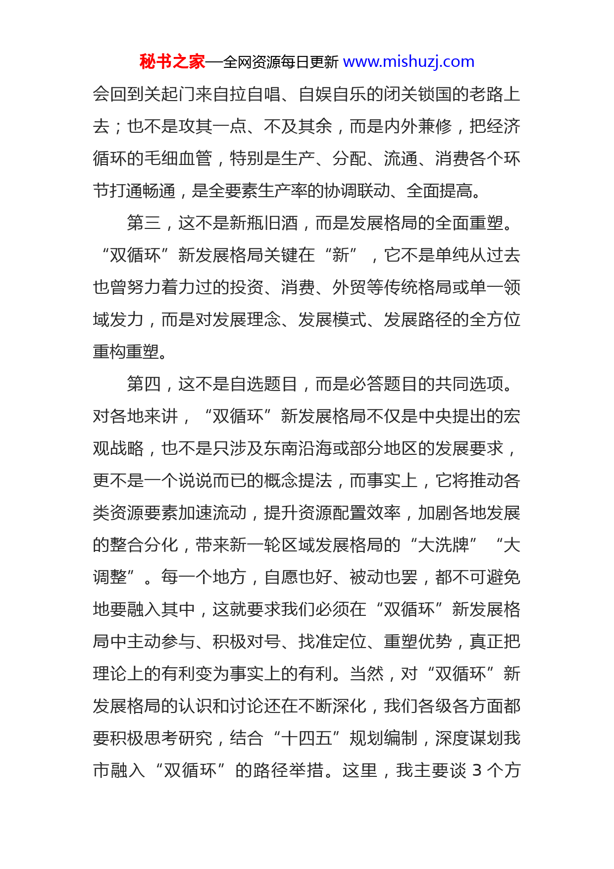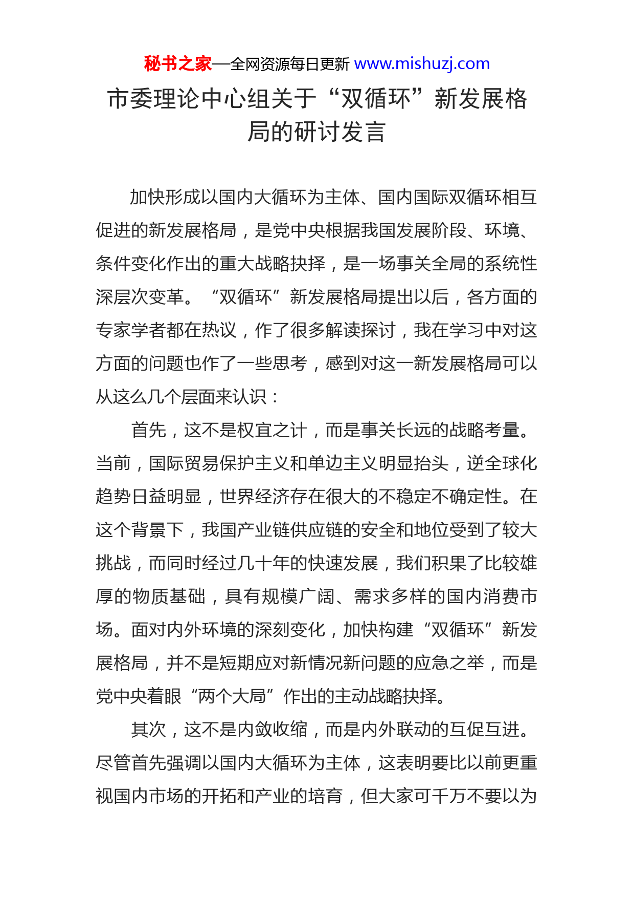秘书之家—全网资源每日更新www.mishuzj.com市委理论中心组关于“双循环”新发展格局的研讨发言加快形成以国内大循环为主体、国内国际双循环相互促进的新发展格局,是党中央根据我国发展阶段、环境、条件变化作出的重大战略抉择,是一场事关全局的系统性深层次变革。“双循环”新发展格局提出以后,各方面的专家学者都在热议,作了很多解读探讨,我在学习中对这方面的问题也作了一些思考,感到对这一新发展格局可以从这么几个层面来认识:首先,这不是权宜之计,而是事关长远的战略考量。当前,国际贸易保护主义和单边主义明显抬头,逆全球化趋势日益明显,世界经济存在很大的不稳定不确定性。在这个背景下,我国产业链供应链的安全和地位受到了较大挑战,而同时经过几十年的快速发展,我们积果了比较雄厚的物质基础,具有规模广阔、需求多样的国内消费市场。面对内外环境的深刻变化,加快构建“双循环”新发展格局,并不是短期应对新情况新问题的应急之举,而是党中央着眼“两个大局”作出的主动战略抉择。其次,这不是内敛收缩,而是内外联动的互促互进。尽管首先强调以国内大循环为主体,这表明要比以前更重视国内市场的开拓和产业的培育,但大家可千万不要以为秘书之家—全网资源每日更新www.mishuzj.com会回到关起门来自拉自唱、自娱自乐的闭关锁国的老路上去;也不是攻其一点、不及其余,而是内外兼修,把经济循环的毛细血管,特别是生产、分配、流通、消费各个环节打通畅通,是全要素生产率的协调联动、全面提高。第三,这不是新瓶旧酒,而是发展格局的全面重塑。“双循环”新发展格局关键在“新”,它不是单纯从过去也曾努力着力过的投资、消费、外贸等传统格局或单一领域发力,而是对发展理念、发展模式、发展路径的全方位重构重塑。第四,这不是自选题目,而是必答题目的共同选项。对各地来讲,“双循环”新发展格局不仅是中央提出的宏观战略,也不是只涉及东南沿海或部分地区的发展要求,更不是一个说说而已的概念提法,而事实上,它将推动各类资源要素加速流动,提升资源配置效率,加剧各地发展的整合分化,带来新一轮区域发展格局的“大洗牌”“大调整”。每一个地方,自愿也好、被动也罢,都不可避免地要融入其中,这就要求我们必须在“双循环”新发展格局中主动参与、积极对号、找准定位、重塑优势,真正把理论上的有利变为事实上的有利。当然,对“双循环”新发展格局的认识和讨论还在不断深化,我们各级各方面都要积极思考研究,结合“十四五”规划编制,深度谋划我市融入“双循环”的路径举措。这里,我主要谈3个方秘书之家—全网资源每日更新www.mishuzj.com面:一要找准优势。只有找准自身参与“双循环”的优势在哪里,我们才能握有本钱,占领制高点,下好先手棋。我体会,我市的优势主要在这样几个方面。首先一个是悠久的文明文化。这是我们最重要的优势、最大的“本钱”,觉得最显著的是古老、厚重、多元三大特点。说它古老,主要表现在是华夏文明的重要发祥地(大地湾文化8000年就是明证),是追寻人文始祖的寻根地(三皇五帝首推伏载就是标志),是周人秦人定鼎中原的崛起地,是我国古代文明的重要标本地,是多元宗教文化的早期传播流行地,是李氏祖根的所在地。这不是我们自卖自夸,著名历史学家李学勤先生就曾说过:“中国历史文化早期的一系列核心疑问和谜团,恐怕都不得不求解于。”说它厚重,主要表现在“先河”“先祖”“先资”“先烈”四先上。先河:新石器时代文明之先河。发现的大地湾新石器遣址,保存了我国最早形成系列的原始建筑群,有中国最早的果、最早的彩陶、最早的官脱式建筑、最早的“混凝土”地面和最早的地面绘画等六项“中国之最”。同时,中华医学中的《黄帝内经》是中国最早的典籍之一,《针灸甲乙经》是中国第一部针灸学的专秘书之家—全网资源每日更新www.mishuzj.com著,这两部具有重大奠基性的著作都产生在。先祖:有人文始祖伏羲、轩辕黄帝、周秦先祖等。先贤:自古多名流,据史料记载,自远古至清代,在国内乃至世界范国内具有一定影响的历史人物大约有1400多人,功臣、战将、诗人、学者群星璀璨。先烈:是一片红色热土,刘志丹、谢子长、习仲勋为代表的老一辈无产阶级革命家,创建了的陕甘边革命根据地,并在此建立了陕甘边区苏维埃政府,在中国革命史上具有极其重要的地位。红军长征2年多,有1年多在我省,红军足迹遍布我市所有县区,范围最广、时间最长,为党中央最终在陕北立足作出了重大的不可替代不可磨灭的贡献。说它多元,至少体现在这么四个方面,一是地处黄土高原、青藏高原、内蒙古高原三大高原“交汇处”,地形地貌多元;二是整个大陆6种气候中我市是4种气候的“交叉带”,物种物象多元;三是4大古文明、6大宗教的“交汇地”,文明文化多元;四是地处我国农牧“交错带”,生产生活方式多元。我们把文化放在打造“五个制高点”第一位、把文化旅游作为十大生态产业首位产业,就是因为这是我们不可多得的立足之本。第二是富集的能源矿产。除上面我讲到的能源外,我市还有丰富的有色金属、稀有金属等矿产资源,特别是煤炭、石油储量巨大,随着“双循环”新发展格局的加快形秘书之家—全网资源每日更新www.mishuzj.com成