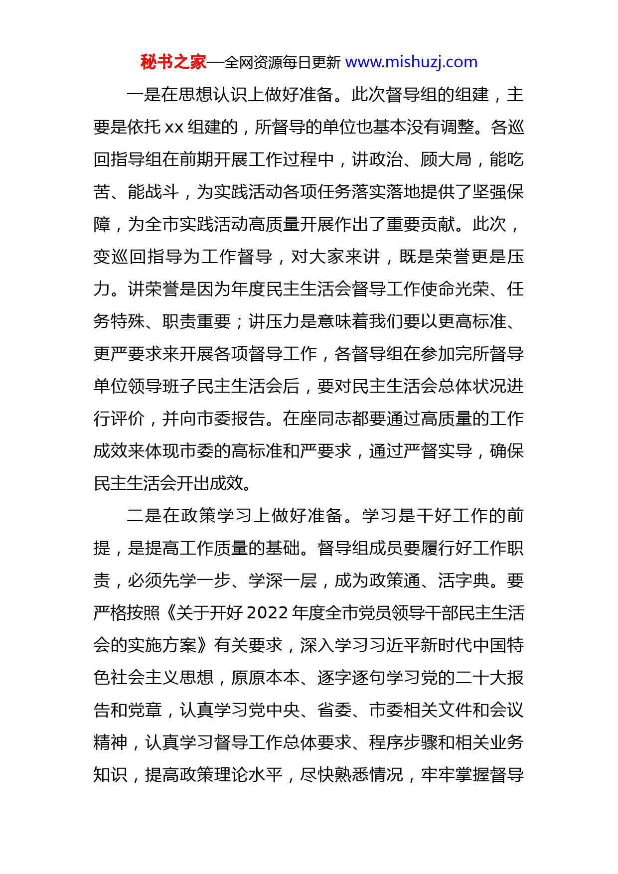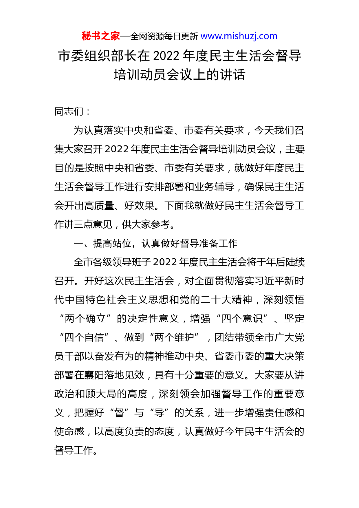 秘书之家—全网资源每日更新www.mishuzj.com市委组织部长在2022年度民主生活会督导培训动员会议上的讲话同志们:为认真落实中央和省委、市委有关要求,今天我们召集大家召开2022年度民主生活会督导培训动员会议,主要目的是按照中央和省委、市委有关要求,就做好年度民主生活会督导工作进行安排部署和业务辅导,确保民主生活会开出高质量、好效果。下面我就做好民主生活会督导工作讲三点意见,供大家参考。一、提高站位,认真做好督导准备工作全市各级领导班子2022年度民主生活会将于年后陆续召开。开好这次民主生活会,对全面贯彻落实习近平新时代中国特色社会主义思想和党的二十大精神,深刻领悟“两个确立”的决定性意义,增强“四个意识”、坚定“四个自信”、做到“两个维护”,团结带领全市广大党员干部以奋发有为的精神推动中央、省委市委的重大决策部署在襄阳落地见效,具有十分重要的意义。大家要从讲政治和顾大局的高度,深刻领会加强督导工作的重要意义,把握好“督”与“导”的关系,进一步增强责任感和使命感,以高度负责的态度,认真做好今年民主生活会的督导工作。秘书之家—全网资源每日更新www.mishuzj.com一是在思想认识上做好准备。此次督导组的组建,主要是依托xx组建的,所督导的单位也基本没有调整。各巡回指导组在前期开展工作过程中,讲政治、顾大局,能吃苦、能战斗,为实践活动各项任务落实落地提供了坚强保障,为全市实践活动高质量开展作出了重要贡献。此次,变巡回指导为工作督导,对大家来讲,既是荣誉更是压力。讲荣誉是因为年度民主生活会督导工作使命光荣、任务特殊、职责重要;讲压力是意味着我们要以更高标准、更严要求来开展各项督导工作,各督导组在参加完所督导单位领导班子民主生活会后,要对民主生活会总体状况进行评价,并向市委报告。在座同志都要通过高质量的工作成效来体现市委的高标准和严要求,通过严督实导,确保民主生活会开出成效。二是在政策学习上做好准备。学习是干好工作的前提,是提高工作质量的基础。督导组成员要履行好工作职责,必须先学一步、学深一层,成为政策通、活字典。要严格按照《关于开好2022年度全市党员领导干部民主生活会的实施方案》有关要求,深入学习习近平新时代中国特色社会主义思想,原原本本、逐字逐句学习党的二十大报告和党章,认真学习党中央、省委、市委相关文件和会议精神,认真学习督导工作总体要求、程序步骤和相关业务知识,提高政策理论水平,尽快熟悉情况,牢牢掌握督导秘书之家—全网资源每日更新www.mishuzj.com工作的主动权。三是在工作统筹上做好准备。根据工作安排,每个督导组将督导8到9个左右的地方和单位。大家要统筹好本职工作和督导工作,弹好钢琴,科学制定督导工作方案,细化工作安排,明确责任分工。根据以往的经验,大家可以提前与被督导地方进行沟通,审定相关材料,提出明确具体指导意见,及时帮助纠正偏差,持续传导工作压力,为后续督导工作奠定坚实基础,对工作责任落实不力或不重视的,要及早指出,严肃批评教育。二、聚焦任务,扎实做好重点环节督导工作2022年度全市党员领导干部民主生活会实施方案已经下发,我们对各个环节任务进行了统筹安排,请各督导组提前研学,认真抓好督办落实。(一)关于学习研讨。督查所督导单位党员领导干部系统深入学习习近平新时代中国特色社会主义思想和党的二十大精神等情况,看是不是进行了个人自学、是不是开展了集体研讨、是不是做到了读原著学原文悟原理、是不是联系了思想和工作实际,对没有达到要求的及时督促补课,学习研讨质量不高的,不能召开民主生活会。(二)关于征求意见。督促指导所督导单位党委(党组)广泛听取党员、干部和群众的意见,党委(党组)班子成员认真听取下级组织、分管领域和党员群众的意见建秘书之家—全网资源每日更新www.mishuzj.com议。征求意见务必具体明确、有的放矢,防止空对空、搞形式。凡是问题不聚焦、重点不突出的,要重新征求意见。(三)关于谈心谈话。要督促指导主要负责同志与班子成员,班子成员相互之间,班子成员与分管单位主要负责同志,主要负责同志、班子成员与本人组织关系所在党支部党员代表谈心谈话。坚持时间服从质量,对搞形式、走过场的,要立即提出批评,责成重来,切实防止落虚落空、形式主义。没有开展谈心谈话,或者谈心谈话没有谈开谈透的不得召开民主生活会。(四)关于审阅会议材料。一是认真审阅民主生活会方案。重点审核会议主题、时间安排、会议议程、工作准备,会前征求意见、相互谈心谈话,会上开展批评和自我批评的初步安排等,提出明确指导意见,并督促以正式文件在会前10天报市纪委机关、市委组织部和市委督导组审核。二是认真审阅整改落实情况报告。审阅所督导单位党史学习教育专题民主生活会和有关年度民主生活会整改措施落实情况,以及省、市委巡视巡察反馈问题和年度民主生活会整改措施是否一一落实到位。民主生活会上,督促党委(党组)主要负责同志代表领导班子就民主生活会整改落实情况进行通报。三是认真审阅对照检查材料和个人发言提纲。对领导班子对照检查材料和班子成员个人发言秘书之家—全网资源每日更新www.mishuzj.com提纲重点关注“