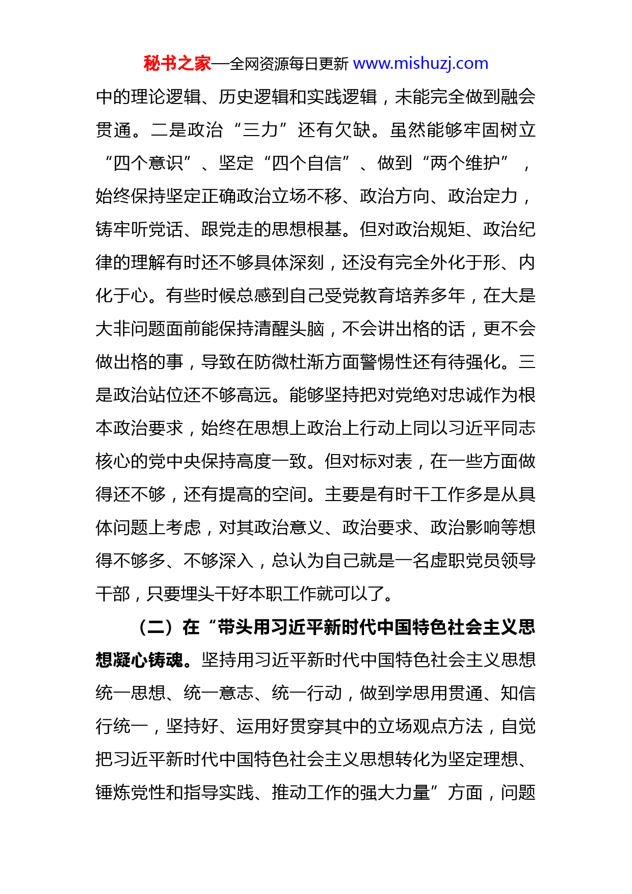 秘书之家—全网资源每日更新www.mishuzj.com市局军转干部2022年度民主生活会对照检查发言提纲根据局党组关于2022年度党员领导干部民主生活会的总体工作部署,在深入开展学习研讨、认真进行谈心谈话、广泛征求意见建议的基础上,对照党的二十大精神和党章党规党纪,结合自身实际,深入查找六个方面存在的突出问题,深刻剖析根源,制定整改措施,明确努力方向。现将个人对照检查情况报告如下:一、存在的主要问题(一)在“带头深刻领悟“两个确立”的决定性意义,增强“四个意识”、坚定“四个自信”、做到“两个维护”。严明政治纪律和政治规矩,提高政治判断力、政治领悟力、政治执行力,始终在政治立场、政治方向、政治原则、政治道路上同以习近平同志为核心的党中央保持高度一致”方面,问题主要表现在:一是对“两个确立”认识还不够深刻。“两个确立”是党的十八大以来党的建设最重大的政治成果,是新时代引领党和国家事业从胜利走向新的胜利的政治保证,是时代的呼唤、是历史的选择、是大家的期盼,但对照更高的标准和要求,对“两个确立”中蕴含的科学内涵、阐释的深刻道理,学习思考得还不够全面透彻,对“两个确立”秘书之家—全网资源每日更新www.mishuzj.com中的理论逻辑、历史逻辑和实践逻辑,未能完全做到融会贯通。二是政治“三力”还有欠缺。虽然能够牢固树立“四个意识”、坚定“四个自信”、做到“两个维护”,始终保持坚定正确政治立场不移、政治方向、政治定力,铸牢听党话、跟党走的思想根基。但对政治规矩、政治纪律的理解有时还不够具体深刻,还没有完全外化于形、内化于心。有些时候总感到自己受党教育培养多年,在大是大非问题面前能保持清醒头脑,不会讲出格的话,更不会做出格的事,导致在防微杜渐方面警惕性还有待强化。三是政治站位还不够高远。能够坚持把对党绝对忠诚作为根本政治要求,始终在思想上政治上行动上同以习近平同志核心的党中央保持高度一致。但对标对表,在一些方面做得还不够,还有提高的空间。主要是有时干工作多是从具体问题上考虑,对其政治意义、政治要求、政治影响等想得不够多、不够深入,总认为自己就是一名虚职党员领导干部,只要埋头干好本职工作就可以了。(二)在“带头用习近平新时代中国特色社会主义思想凝心铸魂。坚持用习近平新时代中国特色社会主义思想统一思想、统一意志、统一行动,做到学思用贯通、知信行统一,坚持好、运用好贯穿其中的立场观点方法,自觉把习近平新时代中国特色社会主义思想转化为坚定理想、锤炼党性和指导实践、推动工作的强大力量”方面,问题秘书之家—全网资源每日更新www.mishuzj.com主要表现在:一是新思想学习的系统性不够。新思想是我们新时代的指导思想、理论武装、行动指南。个人对他的学习非常地重视,在学懂弄通方面确实也下了不少功夫,但深刻反思,自身对新思想的学习还是存在零打碎敲、浅尝辄止的问题,学习的全面性、系统性、精深程度远远不够,比如,对构成新思想主要内容的“十个明确”“十四个坚持”“十三个方面成就”的学习,往往将重点放在了体悟其中的具体内容上,但对于三者之间的内在联系以及新思想的形成、发展历程,缺少系统性的思考研究,特别是面对二十报告提出的“六个坚持”的重大理论创新时,由于之前学习的不系统,使自己未能及时有效地理解、把握、消化贯穿其中的立场、观点和方法。二是新思想学习的党性锻炼不够。学习新思想是滋养初心、淬炼党性、砥砺品格的重要途径。反思自身,个人距离常学常思常悟的新思想学习要求还有不小的差距,存在学思悟脱节的现象。比照伟大建党精神、中国共产党人的精神谱系、新时代先进典型等,自身在信念坚定、政治品格、价值追求、精神风范,使命担当等方面还是做得非常地的不够,在情感上对以身许党、以身许民的感悟还不是很充分很彻底,传承红色基因、庚续红色血脉还没有完全融入到个人思想、工作、生活等方方面面。三是新思想学习的实践运用不够。秘书之家—全网资源每日更新www.mishuzj.com理论的价值在于指导实践,学习的目的全在于运用。反躬自省,在对新思想的学习贯彻上还存在学用结合不紧、理论联系实际不够、学以致用和学用相长不足等问题,具体表现就是用党的创新理论观察新形势、研究新情况、解决新问题的能力水平不高,工作方法、思维层次还不能达到体现时代性、把握规律性、富于创造性的要求。(三)在“带头坚持和加强党的全面领导。认真贯彻民主集中制,创新和改进领导方式,增强党组织政治功能和组织功能,不折不扣把党中央决策部署和习近平总书记关于xx工作的重要指示批示精神贯彻落实好,把各领域广大群众组织凝聚好,夯实党执政的根基”方面,问题主要表现在:一是贯彻执行民主集中制有差距。民主集中制是我们党的根本组织原则和领导制度,是马克思主义政党区别于其他政党的重要标志。对照民主集中制“十六字”方针反思,个人觉得自身在贯彻执行民主集中制方面还存主动性、自觉性、坚定性不够的问题,主要表现在作为局虚职领导班子成员列席局党组会集体研究工作时,有些时候不讲意见,只讲服从,不提出自己的见解和建议;有些时候即使发表意见,也是浮于表面,较少从