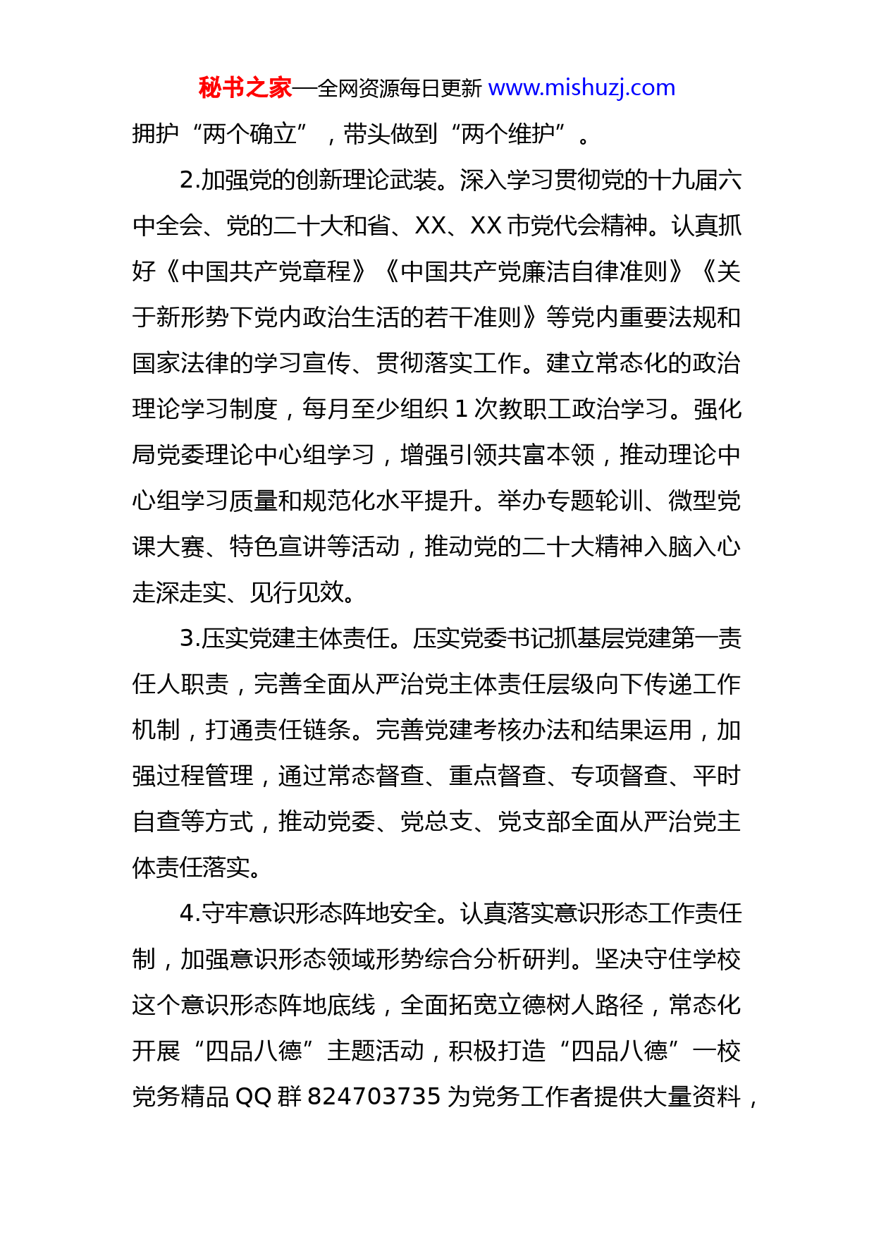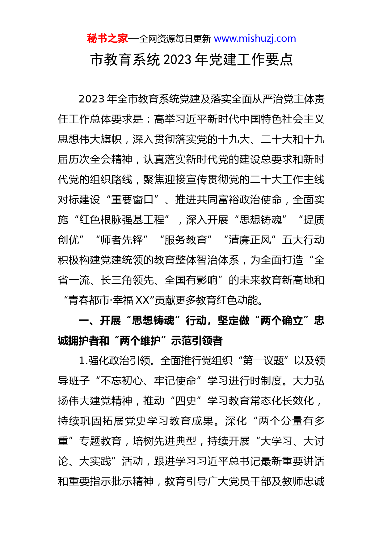 秘书之家—全网资源每日更新www.mishuzj.com市教育系统2023年党建工作要点2023年全市教育系统党建及落实全面从严治党主体责任工作总体要求是:高举习近平新时代中国特色社会主义思想伟大旗帜,深入贯彻落实党的十九大、二十大和十九届历次全会精神,认真落实新时代党的建设总要求和新时代党的组织路线,聚焦迎接宣传贯彻党的二十大工作主线对标建设“重要窗口”、推进共同富裕政治使命,全面实施“红色根脉强基工程”,深入开展“思想铸魂”“提质创优”“师者先锋”“服务教育”“清廉正风”五大行动积极构建党建统领的教育整体智治体系,为全面打造“全省一流、长三角领先、全国有影响”的未来教育新高地和“青春都市·幸福XX”贡献更多教育红色动能。一、开展“思想铸魂”行动,坚定做“两个确立”忠诚拥护者和“两个维护”示范引领者1.强化政治引领。全面推行党组织“第一议题”以及领导班子“不忘初心、牢记使命”学习进行时制度。大力弘扬伟大建党精神,推动“四史”学习教育常态化长效化,持续巩固拓展党史学习教育成果。深化“两个分量有多重”专题教育,培树先进典型,持续开展“大学习、大讨论、大实践”活动,跟进学习习近平总书记最新重要讲话和重要指示批示精神,教育引导广大党员干部及教师忠诚秘书之家—全网资源每日更新www.mishuzj.com拥护“两个确立”,带头做到“两个维护”。2.加强党的创新理论武装。深入学习贯彻党的十九届六中全会、党的二十大和省、XX、XX市党代会精神。认真抓好《中国共产党章程》《中国共产党廉洁自律准则》《关于新形势下党内政治生活的若干准则》等党内重要法规和国家法律的学习宣传、贯彻落实工作。建立常态化的政治理论学习制度,每月至少组织1次教职工政治学习。强化局党委理论中心组学习,增强引领共富本领,推动理论中心组学习质量和规范化水平提升。举办专题轮训、微型党课大赛、特色宣讲等活动,推动党的二十大精神入脑入心走深走实、见行见效。3.压实党建主体责任。压实党委书记抓基层党建第一责任人职责,完善全面从严治党主体责任层级向下传递工作机制,打通责任链条。完善党建考核办法和结果运用,加强过程管理,通过常态督查、重点督查、专项督查、平时自查等方式,推动党委、党总支、党支部全面从严治党主体责任落实。4.守牢意识形态阵地安全。认真落实意识形态工作责任制,加强意识形态领域形势综合分析研判。坚决守住学校这个意识形态阵地底线,全面拓宽立德树人路径,常态化开展“四品八德”主题活动,积极打造“四品八德”一校党务精品QQ群824703735为党务工作者提供大量资料,秘书之家—全网资源每日更新www.mishuzj.com每天更新50多篇,请加QQ:962665491进行咨询!一品。坚持党管媒体,加强对疫情防控、志愿服务、攻坚克难等工作中涌现出来的身边典型和先进事迹的宣传和报道,提升教育系统党建宣传阵地的传播力和影响力。持续加大对下属学校(单位)意识形态工作的监督指导力度,要求各基层党组织每年至少研究意识形态及网络意识形态工作2次。二、开展“提质创优”行动,全面夯实基层党组织战斗堡垒5.促进支部规范提升。持续推动党内政治生活制度化规范化严肃化,全面落实“三会一课”、主题党日、组织生活会等基本制度。加强对学校党组织按期换届、党费使用管理情况督促检查,持续做好基层党组织到期换届柔性提醒。积极参与市直机关“四化”党支部擂台赛活动,推动“四化”支部示范引领、党建全域提升,打造一批最强支部。强化数字赋能,试点铺开“hui服务”系统,以数字化手段强化日常督导和规范化建设。6.深化党建品牌内涵。继续投入资金用于党建品牌建设,创建一批“可学、可看、可复制”的基层党组织示范点,打造教育系统党建品牌X校。构建立体党建品牌体系,以学段为特色,将学校党建品牌纳入整体体系,开展教育系统党建品牌(清廉学校)系列宣传展示,积极参与XX市教秘书之家—全网资源每日更新www.mishuzj.com育系统新时代党建“三化一创”活动,不断提升XX教育党建的整体影响力、鲜明辨识度、广泛美誉度。7.积极推行中小学校党组织领导的校长负责制。持续在学校党组织职责定位、学校党政主要负责人选配、学校议事决策机制和管理体制建设、党组织活动开展等方面开展积极探索,推动学校治理体系创新,夯实学校党建工作基础,强化党组织战斗堡垒作用。8.做强民办学校党建。坚持民办学校社会主义办学方向,持续推进民办学校“党建入章”工作。调整民办学校党组织覆盖情况,强化民办学校党的组织建设和工作有效覆盖加强民办学校党建品牌建设,开展民办学校党建品牌创建系列活动,努力打造民办学校党建的“XX模式”。加大民办学校党组织规范指导力度,充分发挥选派党员作用,做好“结对帮扶”后半篇文章,以公带民、以公助民,提高民办学校党内组织生活规范,提升民办学校党建工作质量。三、开展“师者先锋”行动,充分发挥党员先锋模范作用9.打造过硬头雁。组织开展基层党组织书记和班子成员培训班、党支部班子成员培训班等活动,完成教育系统基层党组织书记轮训,努力培养打造一支会创新、敢破难、讲奉献的领头雁队伍。深入拓展“书记办实事”,以党组织书记为主体,聚焦数字