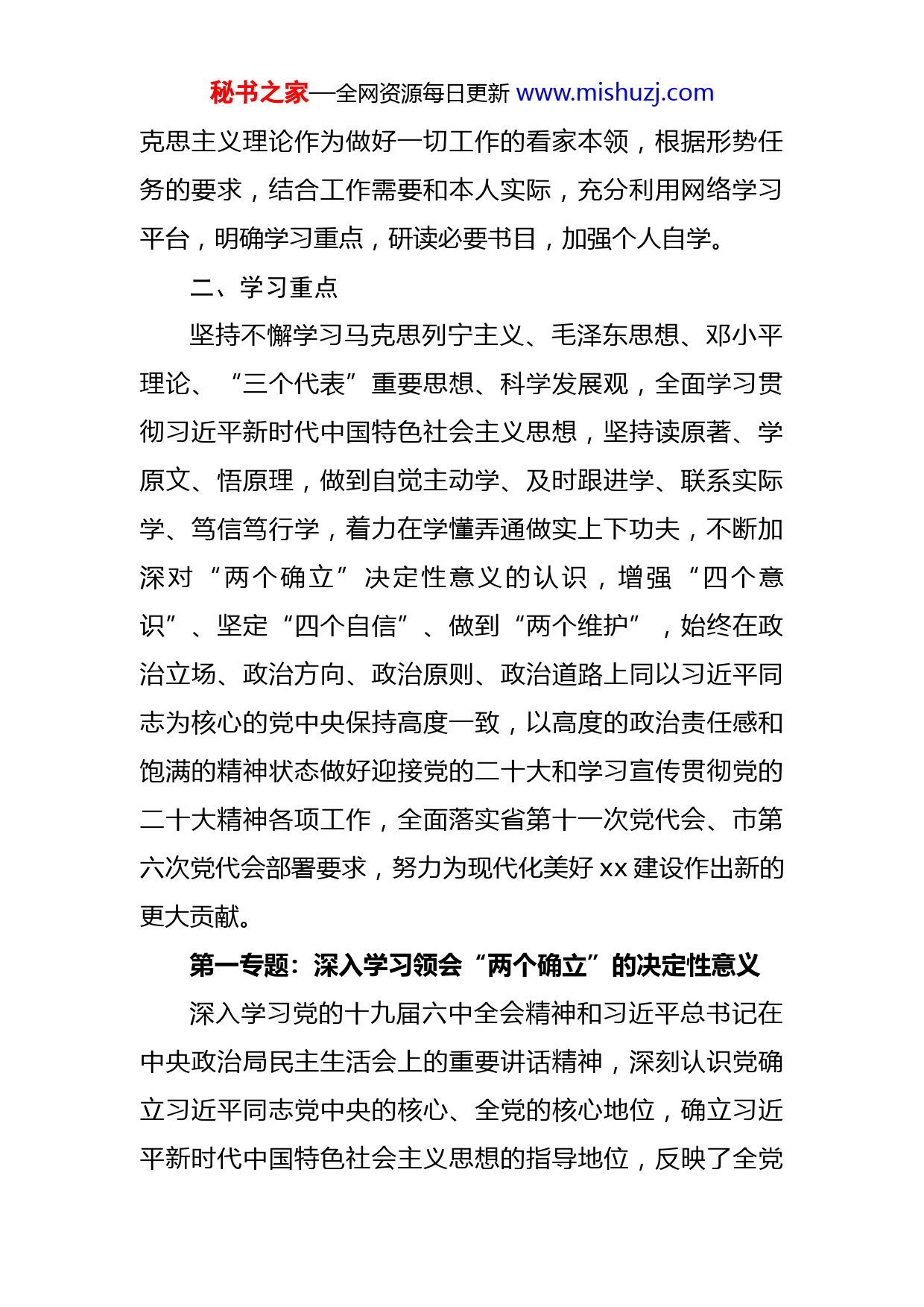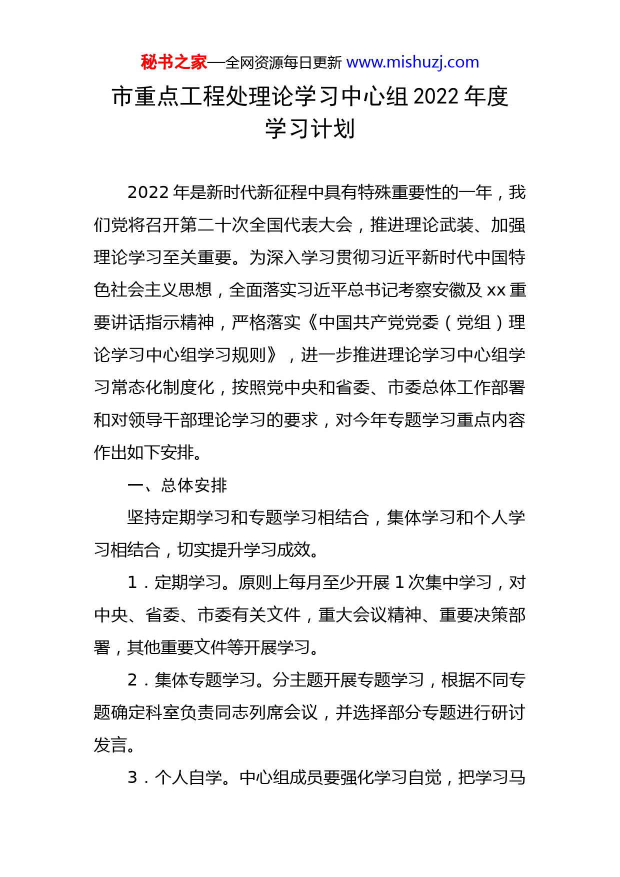 秘书之家—全网资源每日更新www.mishuzj.com市重点工程处理论学习中心组2022年度学习计划2022年是新时代新征程中具有特殊重要性的一年,我们党将召开第二十次全国代表大会,推进理论武装、加强理论学习至关重要。为深入学习贯彻习近平新时代中国特色社会主义思想,全面落实习近平总书记考察安徽及xx重要讲话指示精神,严格落实《中国共产党党委(党组)理论学习中心组学习规则》,进一步推进理论学习中心组学习常态化制度化,按照党中央和省委、市委总体工作部署和对领导干部理论学习的要求,对今年专题学习重点内容作出如下安排。一、总体安排坚持定期学习和专题学习相结合,集体学习和个人学习相结合,切实提升学习成效。1.定期学习。原则上每月至少开展1次集中学习,对中央、省委、市委有关文件,重大会议精神、重要决策部署,其他重要文件等开展学习。2.集体专题学习。分主题开展专题学习,根据不同专题确定科室负责同志列席会议,并选择部分专题进行研讨发言。3.个人自学。中心组成员要强化学习自觉,把学习马秘书之家—全网资源每日更新www.mishuzj.com克思主义理论作为做好一切工作的看家本领,根据形势任务的要求,结合工作需要和本人实际,充分利用网络学习平台,明确学习重点,研读必要书目,加强个人自学。二、学习重点坚持不懈学习马克思列宁主义、毛泽东思想、邓小平理论、“三个代表”重要思想、科学发展观,全面学习贯彻习近平新时代中国特色社会主义思想,坚持读原著、学原文、悟原理,做到自觉主动学、及时跟进学、联系实际学、笃信笃行学,着力在学懂弄通做实上下功夫,不断加深对“两个确立”决定性意义的认识,增强“四个意识”、坚定“四个自信”、做到“两个维护”,始终在政治立场、政治方向、政治原则、政治道路上同以习近平同志为核心的党中央保持高度一致,以高度的政治责任感和饱满的精神状态做好迎接党的二十大和学习宣传贯彻党的二十大精神各项工作,全面落实省第十一次党代会、市第六次党代会部署要求,努力为现代化美好xx建设作出新的更大贡献。第一专题:深入学习领会“两个确立”的决定性意义深入学习党的十九届六中全会精神和习近平总书记在中央政治局民主生活会上的重要讲话精神,深刻认识党确立习近平同志党中央的核心、全党的核心地位,确立习近平新时代中国特色社会主义思想的指导地位,反映了全党秘书之家—全网资源每日更新www.mishuzj.com全军全国各族人民共同心愿,对新时代党和国家事业发展、对推进中华民族伟大复兴历史进程具有决定性意义。带头维护习近平总书记党中央的核心、全党的核心地位,带头学习贯彻习近平新时代中国特色社会主义思想,进一步增强忠诚核心、拥戴核心、维护核心的政治自觉、思想自觉和行动自觉,真正把践行“两个维护”落实到坚决贯彻执行党中央决策部署的行动上。学习形式:集体学习研讨。第二专题:深入学习领会习近平总书记关于党的百年奋斗重大成就和历史经验的重要论述进一步深入系统学习习近平总书记在党的十九届六中全会上的重要讲话精神和全会通过的决议,学习习近平总书记在省部级主要领导干部学习贯彻党的十九届六中全会精神专题研讨班开班式上的重要讲话精神,不断深化对党的百年奋斗的初心使命和重大成就、历史意义和历史经验的认识,深刻理解以史为鉴、开创未来的重要要求,进一步做到学史明理、学史增信、学史崇德、学史力行。以常态化长效化制度机制巩固拓展党史学习教育成果,更好把握和运用党的百年奋斗历史经验,努力把党史学习教育的思想成果、政治成果、制度成果和实践成果转化为推动重点工程建设管理事业更高质量发展、满腔热情为群众办实事解难事、扎实推进机关党建的实际成效。秘书之家—全网资源每日更新www.mishuzj.com学习形式:集体学习研讨。第三专题:深入学习领会习近平新时代中国特色社会主义思想的基本精神、基本内容、基本要求深入学习《习近平谈治国理政》(第一至四卷),用好习近平新时代中国特色社会主义思想和系列分领域思想学习纲要、学习问答,深刻认识习近平新时代中国特色社会主义思想是当代中国马克思主义、21世纪马克思主义,是中华文化和中国精神的时代精华,实现了马克思主义中国化新的飞跃。坚持用党的创新理论最新成果武装头脑、指导实践、推动工作,不断提高运用习近平新时代中国特色社会主义思想分析、研究和解决实际问题的能力,在重点工程建设一线唱响学思想、用思想的时代最强音,更有力有效地用党的创新理论统一思想、统一意志、统一行动。学习形式:集中学习研讨。第四专题:深入学习领会党的二十大精神深刻认识召开党的二十大是党和国家政治生活中的头等大事,必将对党和国家事业发展产生重大而深远的影响。原原本本、全面准确学习领会习近平总书记在党的二十大上的报告和大会精神,深刻理解把握党的二十大提出的一系列重大思想理论、重大方针政策、重大工作部署,自觉把思想统一到党的二十大精神上来,把力量凝聚到贯秘书之家—全网资源每日更新www.mishuzj.com彻落实大会提出的各项重大部署上来,在全处兴起学习宣传贯彻党的二十大精神的热潮。学习形式:集体学习研讨。第五专题:重温习近平总书记考察