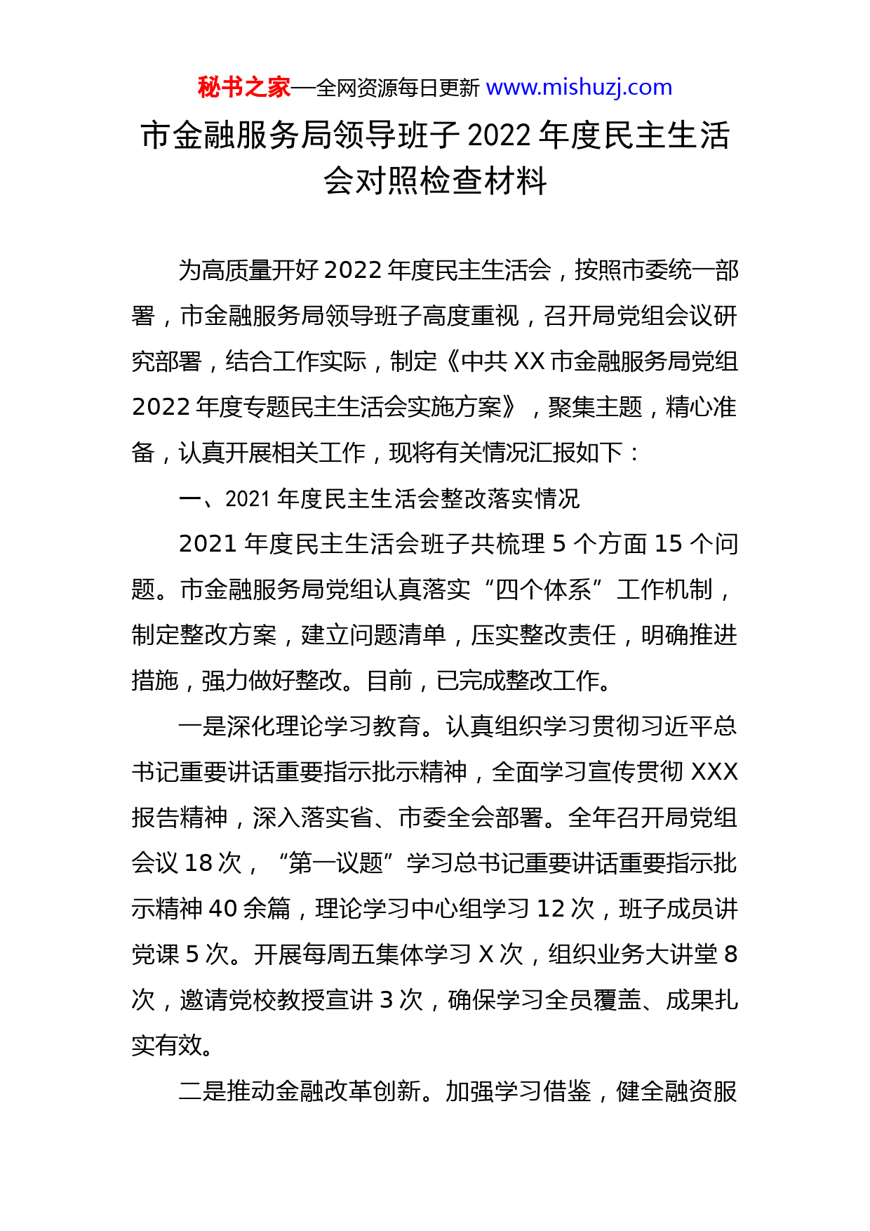 秘书之家—全网资源每日更新www.mishuzj.com市金融服务局领导班子2022年度民主生活会对照检查材料为高质量开好2022年度民主生活会,按照市委统一部署,市金融服务局领导班子高度重视,召开局党组会议研究部署,结合工作实际,制定《中共XX市金融服务局党组2022年度专题民主生活会实施方案》,聚集主题,精心准备,认真开展相关工作,现将有关情况汇报如下:一、2021年度民主生活会整改落实情况2021年度民主生活会班子共梳理5个方面15个问题。市金融服务局党组认真落实“四个体系”工作机制,制定整改方案,建立问题清单,压实整改责任,明确推进措施,强力做好整改。目前,已完成整改工作。一是深化理论学习教育。认真组织学习贯彻习近平总书记重要讲话重要指示批示精神,全面学习宣传贯彻XXX报告精神,深入落实省、市委全会部署。全年召开局党组会议18次,“第一议题”学习总书记重要讲话重要指示批示精神40余篇,理论学习中心组学习12次,班子成员讲党课5次。开展每周五集体学习X次,组织业务大讲堂8次,邀请党校教授宣讲3次,确保学习全员覆盖、成果扎实有效。二是推动金融改革创新。加强学习借鉴,健全融资服秘书之家—全网资源每日更新www.mishuzj.com务对接工作机制,不断提高融资便利度。建立政银企对接联席会、银行机构考评办法及金融业联合党委等机制,组建首贷续贷服务中心,常态化收集汇总融资需求,促成X家企业获得X亿元信贷支持。全市银行机构共对接企业X家次,累计放款X亿元;对接小微企业主及个体工商户X万家次,累计放款X亿元。三是加力推进企业上市。全市共筛选上市后备企业28家,较年初净增6户。XXX、XXX均已申请XXX证监局辅导备案,企业上市取得突破性进展。对后备库企业实施领导包联,重点企业实施驻企服务,协调帮助XXX等企业解决问题11个。多次赴XXX、XXX等重点企业上门服务,组织推动市县两级共18个部门现场办公,帮助XXX肉业开具合规合法证明。邀请上交所、省证监局专家深入重点企业上门指导。全年深入企业调研8次,走访企业20余家次;组织参加培训6次,累计培训近200人次。四是加强班子队伍建设。深入开展“能力作风建设年”活动,制定“1+8”工作方案,努力推动全局党员干部提能力、转作风、抓落实。坚决履行党的建设责任,认真做好党员发展培养工作。严格执行“三会一课”制度,坚持民主集中制,落实意识形态工作责任制。健全完善局党组议事规则,局主要领导末位表态发言,“三重一大”事项邀请派驻纪检组全程监督。发挥党组织战斗堡垒作用,秘书之家—全网资源每日更新www.mishuzj.com深入帮联村屯、社区开展宣传活动4次、帮扶志愿服务4次。班子全员上阵,带领10余名党员坚守小区疫情防控“一线”,负责小区被列入首批“无疫小区”名单。二、存在问题按照有关要求,会前市金融服务局班子认真开展理论学习,深入开展研究研讨,广泛征求意见,组织谈心谈话,重点围绕6个方面进行对照检查。具体情况如下:(一)在带头深刻领悟“两个确立”的决定性意义,增强“四个意识”、坚定“四个自信”、做到“两个维护”方面。局班子认真落实“第一议题”学习制度,加强理论学习,深刻学习领会“两个确立”的决定性意义,始终在政治立场、政治方向、政治原则、政治道路上同党中央保持高度一致。但也存在:一是感悟深度还不够到位。虽然在思想上紧跟、行动上紧随,但站位国际、国内两个大局考虑,存在思想站位还不够高的局限,思维有时限于工作领领域,对“两个确立”的决定性意义领悟还不持续加深。二是领会广度还够全面。班子研究部署全局工作中,始终坚持把讲政治摆在首位,但存在对分管科室加强思想政治建设方面工作抓得还不够全面、不够经常,部署工作细致严谨,思想政治引领还要加强。三是政治敏锐性还不够高。推动实际工作不能时刻同总书记关于金融工作的要求、同省市委锚定的目标进行对标对表,不能全面同秘书之家—全网资源每日更新www.mishuzj.com全国和省内发展好的地方进行对比对照,小富即安、浅尝辄止,世界眼光、国际标准和争先精神、晋位意识还不够。(二)在“带头用习近平新时代中国特色社会主义思想凝心铸魂”方面。局班子坚持运用习近平新时代中国特色社会主义思想统一思想、统一意志、统一行动,运用贯穿其中的立场观点方法武装头脑、指导实践、推动工作。但也存在:一是对XXX精神领悟不够透彻。对XXX提出的新思想新论断、作出的新部署新要求,系统研究还不够深刻,掌握的全面性还不够深入,领悟还不够透彻,在学深悟透上仍要持续发力。二是学习成果转化还不够全面。对于进一步发挥金融作用,更好服务以中国式现代化推进中华民族伟大复兴的伟大实践,具体的思路还不够清晰明确,开展的探索实践还不够多。三是系统观念还不够强。面对金融工作实践中遇到的新问题、改革发展稳定存在的深层次问题、人民群众急难愁盼问题,在全局和局部、当前和长远、宏观和微观、主要矛盾和次要矛盾等方面的整体把握还不够。(三)在“带头坚持和加强党的全面领导”方面。局班子坚持认真贯彻民主集中制,创新和改进领导方式,增强党组织政治功能和组织功能,深入学习贯彻习近平总书记重要讲话重要指示批示精神,坚决落实落靠市委、市政秘书之家—全网资源每日更新www.mishuzj.