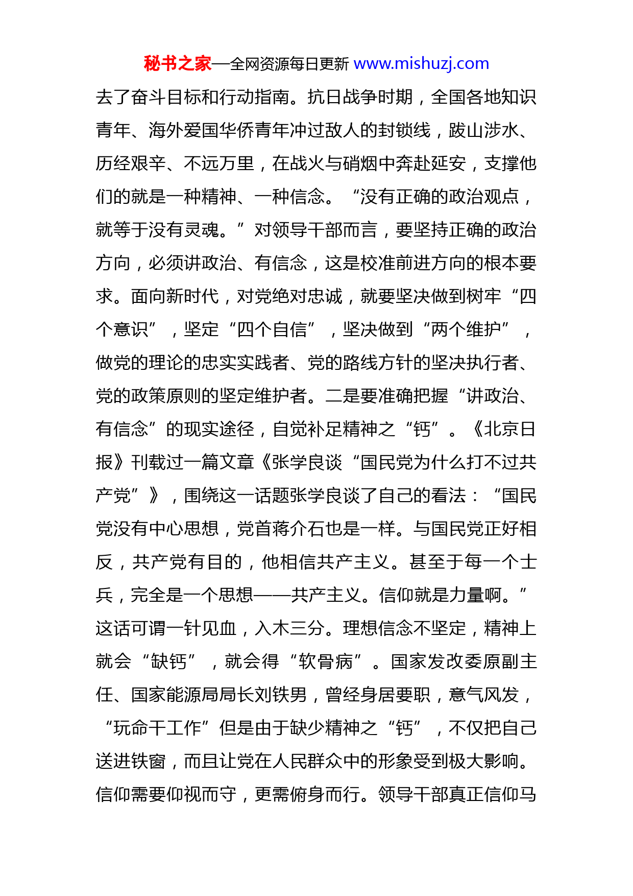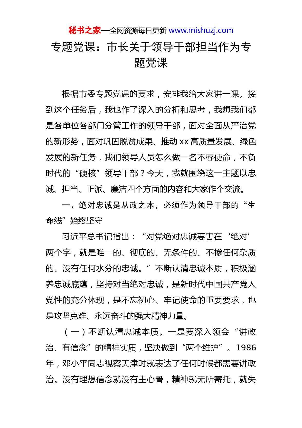 秘书之家—全网资源每日更新www.mishuzj.com专题党课:市长关于领导干部担当作为专题党课根据市委专题党课的要求,安排我给大家讲一课。接到这个任务后,我也作了深入的分析和思考,我想我们都是各单位各部门分管工作的领导干部,面对全面从严治党的新形势,面对巩固脱贫成果、推动xx高质量发展、绿色发展的新任务,我们领导人员怎么做一名不辱使命,不负时代的“硬核”领导干部?今天,我就围绕这一主题以忠诚、担当、正派、廉洁四个方面的内容和大家作个交流。一、绝对忠诚是从政之本,必须作为领导干部的“生命线”始终坚守习近平总书记指出:“对党绝对忠诚要害在‘绝对’两个字,就是唯一的、彻底的、无条件的、不掺任何杂质的、没有任何水分的忠诚。”不断认清忠诚本质,积极涵养忠诚底蕴,坚持对当绝对忠诚,是新时代中国共产党人党性的充分体现,是不忘初心、牢记使命的重要要求,也是攻坚克难、永远奋斗的强大精神力量。(一)不断认清忠诚本质。一是要深入领会“讲政治、有信念”的精神实质,坚决做到“两个维护”。1986年,邓小平同志视察天津时就表达了任何时候都需要讲政治。没有理想信念就没有主心骨,精神就无所寄托,就失秘书之家—全网资源每日更新www.mishuzj.com去了奋斗目标和行动指南。抗日战争时期,全国各地知识青年、海外爱国华侨青年冲过敌人的封锁线,跋山涉水、历经艰辛、不远万里,在战火与硝烟中奔赴延安,支撑他们的就是一种精神、一种信念。“没有正确的政治观点,就等于没有灵魂。”对领导干部而言,要坚持正确的政治方向,必须讲政治、有信念,这是校准前进方向的根本要求。面向新时代,对党绝对忠诚,就要坚决做到树牢“四个意识”,坚定“四个自信”,坚决做到“两个维护”,做党的理论的忠实实践者、党的路线方针的坚决执行者、党的政策原则的坚定维护者。二是要准确把握“讲政治、有信念”的现实途径,自觉补足精神之“钙”。《北京日报》刊载过一篇文章《张学良谈“国民党为什么打不过共产党”》,围绕这一话题张学良谈了自己的看法:“国民党没有中心思想,党首蒋介石也是一样。与国民党正好相反,共产党有目的,他相信共产主义。甚至于每一个士兵,完全是一个思想——共产主义。信仰就是力量啊。”这话可谓一针见血,入木三分。理想信念不坚定,精神上就会“缺钙”,就会得“软骨病”。国家发改委原副主任、国家能源局局长刘铁男,曾经身居要职,意气风发,“玩命干工作”但是由于缺少精神之“钙”,不仅把自己送进铁窗,而且让党在人民群众中的形象受到极大影响。信仰需要仰视而守,更需俯身而行。领导干部真正信仰马秘书之家—全网资源每日更新www.mishuzj.com克思主义,真正爱党爱国爱人民,在大是大非面前旗帜鲜明,在风浪考验面前无所畏惧,在各种诱惑面前立场坚定,做到知行合一、笃志躬行,勇于担当、率先垂范。三是正确认识“讲政治、有信念”的现实要求,充分发挥“关键少数”的作用。“政治路线确定之后,干部就是决定的因素”。任何宏伟的目标都是在解决现实问题中一步步实现的,越是任务艰巨、矛盾复杂,越要靠“关键少数”发挥关键作用。无论是在革命战争年代、和平建设时期,还是在改革开放新时期,一代代优秀共产党人鞠躬尽瘁、以身作则、率先垂范,始终把自己的个人命运与国家、民族的兴衰紧密联系在一起,用自己的辛勤汗水、聪明才智,乃至热血和生命,赢得了广大人民群众的爱戴、信任和拥护,产生了巨大的感召力、凝聚力,为我们党的事业顺利推进、兴旺发达提供了榜样力量和精神宝库。“火车跑得快,全靠车头带”。作为领导干部,我们决不能浮在面上、挂在口头上,决不能“手电筒只照别人不照自己”,决不能把自己当旁观者,而是要当好干事创业的践行者、示范者,引导广大党员干部见贤思齐,使学先进、当先进、赶超先进成为时代风尚。(二)积极涵养忠诚底蕴。一是强化理论修养。政治上的坚定、党性上的坚定都离不开理论上的坚定。领导干部时刻牢记使命职责,必须以发展的眼光看待自己掌握的秘书之家—全网资源每日更新www.mishuzj.com知识,清醒看到自身理论修养的不足。真学。在学习上不能滥竽充数、自欺欺人,而应真正摒弃那种“屁股坐不住、精力不集中、读书走过场”的浮躁作风,克服心不在焉,一目十行,盲人摸象,学而不思等“假学”现象,甘于寂寞、善于钻研,坐得下来,钻得进去,通过“真学”达到“学真”。深学。蜻蜓点水、浮光掠影、浅尝辄止不是行家里手的共享词。领导干部确实要克服理论武装上的满足情绪和松懈思想,自觉排除各种干扰,真正静下心来学深一些、学透一些。善学。坚持“干什么学什么、缺什么补什么”学习原则,向书本学、向实践学,向人民群众学,力求掌握好领导工作、做到干中学、学中干,学以致用、用以促学、学用相长。二是坚持表里如一。习近平总书记指出:“对党绝对忠诚要害在‘绝对’两个字,就是唯一的、彻底的、无条件的、不掺任何杂质的、没有任何水分的忠诚。”军委原副主席徐才厚表里不一,“坚决拥护”的调门唱得比谁都高,“步调一致”的口号喊得比谁都响,但实际上搞阳奉阴违、口是心非,成为“只动嘴不动心”的“戏精”。“姓党”而不在党言党、在党忧党和在党为党,