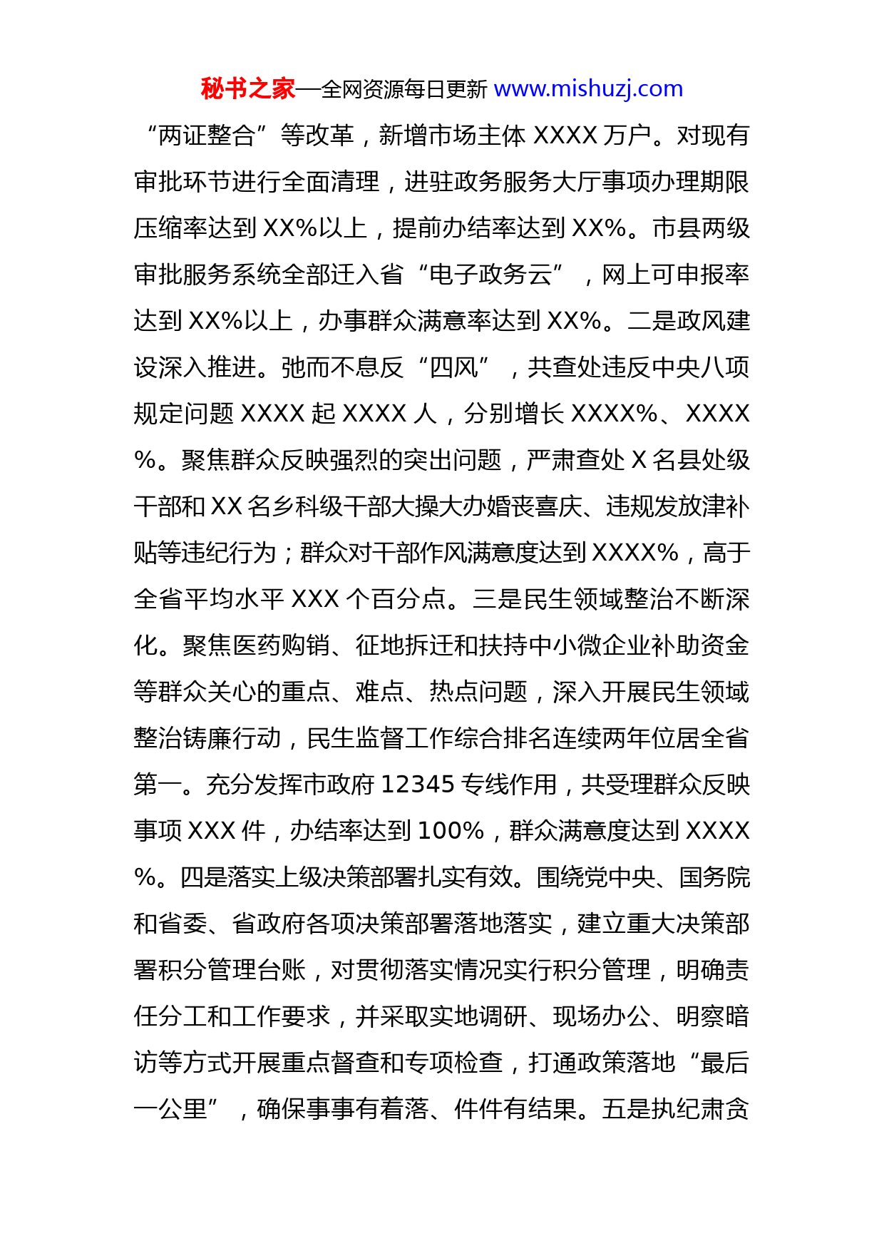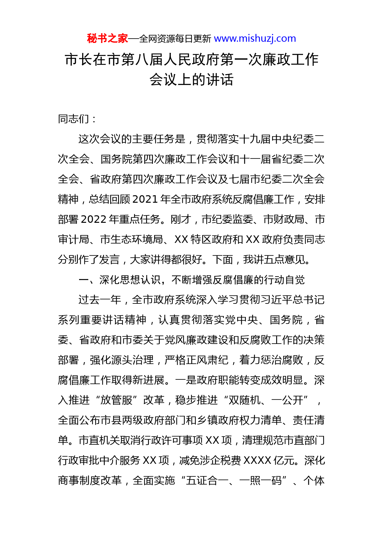 秘书之家—全网资源每日更新www.mishuzj.com市长在市第八届人民政府第一次廉政工作会议上的讲话同志们:这次会议的主要任务是,贯彻落实十九届中央纪委二次全会、国务院第四次廉政工作会议和十一届省纪委二次全会、省政府第四次廉政工作会议及七届市纪委二次全会精神,总结回顾2021年全市政府系统反腐倡廉工作,安排部署2022年重点任务。刚才,市纪委监委、市财政局、市审计局、市生态环境局、XX特区政府和XX政府负责同志分别作了发言,大家讲得都很好。下面,我讲五点意见。一、深化思想认识,不断增强反腐倡廉的行动自觉过去一年,全市政府系统深入学习贯彻习近平总书记系列重要讲话精神,认真贯彻落实党中央、国务院,省委、省政府和市委关于党风廉政建设和反腐败工作的决策部署,强化源头治理,严格正风肃纪,着力惩治腐败,反腐倡廉工作取得新进展。一是政府职能转变成效明显。深入推进“放管服”改革,稳步推进“双随机、一公开”,全面公布市县两级政府部门和乡镇政府权力清单、责任清单。市直机关取消行政许可事项XX项,清理规范市直部门行政审批中介服务XX项,减免涉企税费XXXX亿元。深化商事制度改革,全面实施“五证合一、一照一码”、个体秘书之家—全网资源每日更新www.mishuzj.com“两证整合”等改革,新增市场主体XXXX万户。对现有审批环节进行全面清理,进驻政务服务大厅事项办理期限压缩率达到XX%以上,提前办结率达到XX%。市县两级审批服务系统全部迁入省“电子政务云”,网上可申报率达到XX%以上,办事群众满意率达到XX%。二是政风建设深入推进。弛而不息反“四风”,共查处违反中央八项规定问题XXXX起XXXX人,分别增长XXXX%、XXXX%。聚焦群众反映强烈的突出问题,严肃查处X名县处级干部和XX名乡科级干部大操大办婚丧喜庆、违规发放津补贴等违纪行为;群众对干部作风满意度达到XXXX%,高于全省平均水平XXX个百分点。三是民生领域整治不断深化。聚焦医药购销、征地拆迁和扶持中小微企业补助资金等群众关心的重点、难点、热点问题,深入开展民生领域整治铸廉行动,民生监督工作综合排名连续两年位居全省第一。充分发挥市政府12345专线作用,共受理群众反映事项XXX件,办结率达到100%,群众满意度达到XXXX%。四是落实上级决策部署扎实有效。围绕党中央、国务院和省委、省政府各项决策部署落地落实,建立重大决策部署积分管理台账,对贯彻落实情况实行积分管理,明确责任分工和工作要求,并采取实地调研、现场办公、明察暗访等方式开展重点督查和专项检查,打通政策落地“最后一公里”,确保事事有着落、件件有结果。五是执纪肃贪秘书之家—全网资源每日更新www.mishuzj.com形成强大震慑。各级政府和部门党组认真落实管党治党主体责任,按照无禁区、全覆盖、零容忍的要求,着力遏制腐败滋生蔓延势头。全市各级纪检监察机关共立案XXXX件,党政纪处分XXXX人,移送司法机关XX人;群众对反腐败工作成效满意度达到XXXX%,较上年提升XXXX个百分点。看到成绩的同时,我们也要清醒地认识到,全市政府系统党风廉政建设和反腐败工作还存在一些突出问题。一是主体责任压得还不够实。个别地方和单位党组的领导核心作用发挥不充分、党章党规党纪执行不力,还存在重发展轻党建、重业务轻党务的问题。一些单位班子成员“一岗双责”履行不到位,对重要事项、关键环节、重点人群疏于监管,对苗头性、倾向性问题处置不够及时有效。二是政府职能转变仍不到位。一些部门对“放管服”改革重视不够,对现有行政审批事项放哪些、如何放、放后如何监管等研究得还不深;有的放权配套政策不完善,导致下级接不住、接不好;有的部门对项目审批标准和要求互为前置,“蛋生鸡、鸡生蛋”,互踢皮球、推诿扯皮;有的部门和单位门好进了、脸好看了,但事更难办了。三是“四风”问题有禁不止。在一些地方和单位,“四风”问题穿上了“隐身衣”、躲进了“青纱帐”、玩起了“障眼法”、打起了“游击战”,防止反弹回潮任务艰巨。2021秘书之家—全网资源每日更新www.mishuzj.com年,全市查处违反中央八项规定问题中,违规收送礼品礼金、违规发放津补贴、违规配备使用公务用车等问题突出,出现了私车公养、虚构办公用品支出购买高档烟酒、“转移支付”等隐身变异的新问题。四是重点领域腐败时有发生。在反腐高压态势下,少数领导干部不收敛、不收手,漠视法纪、顶风作案。在2021年查处的案件中,首次违纪行为发生在二十大后的有XXX件,占总数的XXXX%。征地拆迁、土地出让、工程建设等领域仍然是腐败的重灾区。民生领域腐败问题突出,少数基层干部在民生资金分配管理中优亲厚友、吃拿卡要、虚报冒领、贪污私分,侵害群众利益,出现小官大贪、村官大腐等案件。五是部分干部缺乏担当精神。有的干部不敢担当,见到矛盾推、遇到问题躲、碰到难事拖;有的干部工作浮在面上、停在纸上,不督查就不落实、不过问就不反馈,有的甚至督促跟踪了也迟迟听不到回音。2021年,全市共立案查处失职渎职案件XXX件,占案件总数的XXX%,增长XXXX%。习近平总书记强调,“全面从严治党仍然任重道远,从宽松软走向严紧硬需要经历砥砺淬炼的过程。”我们必须保持清醒头脑,以更加坚决的态度、更加有力的措施,推动全市政府系统党风廉政建设