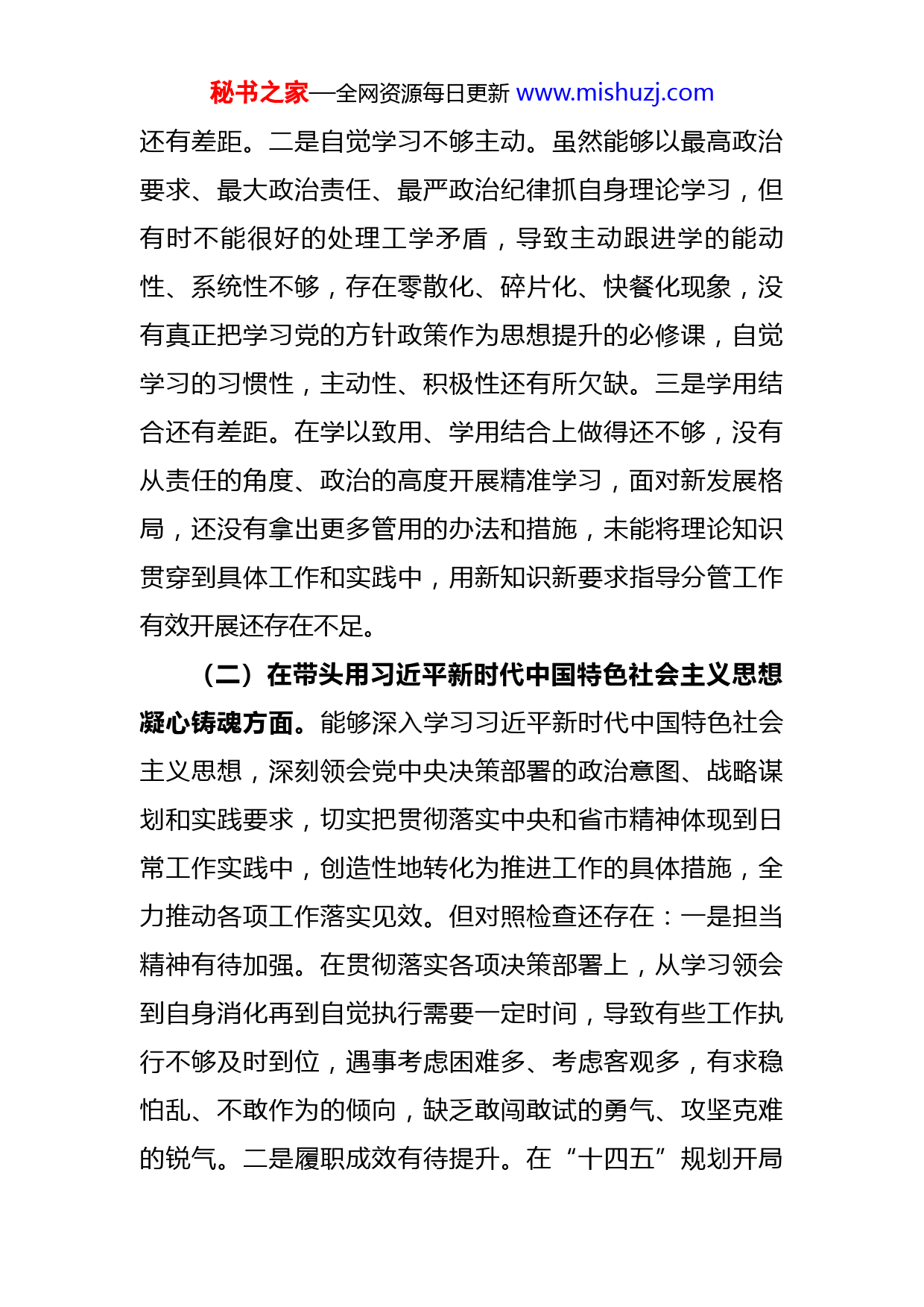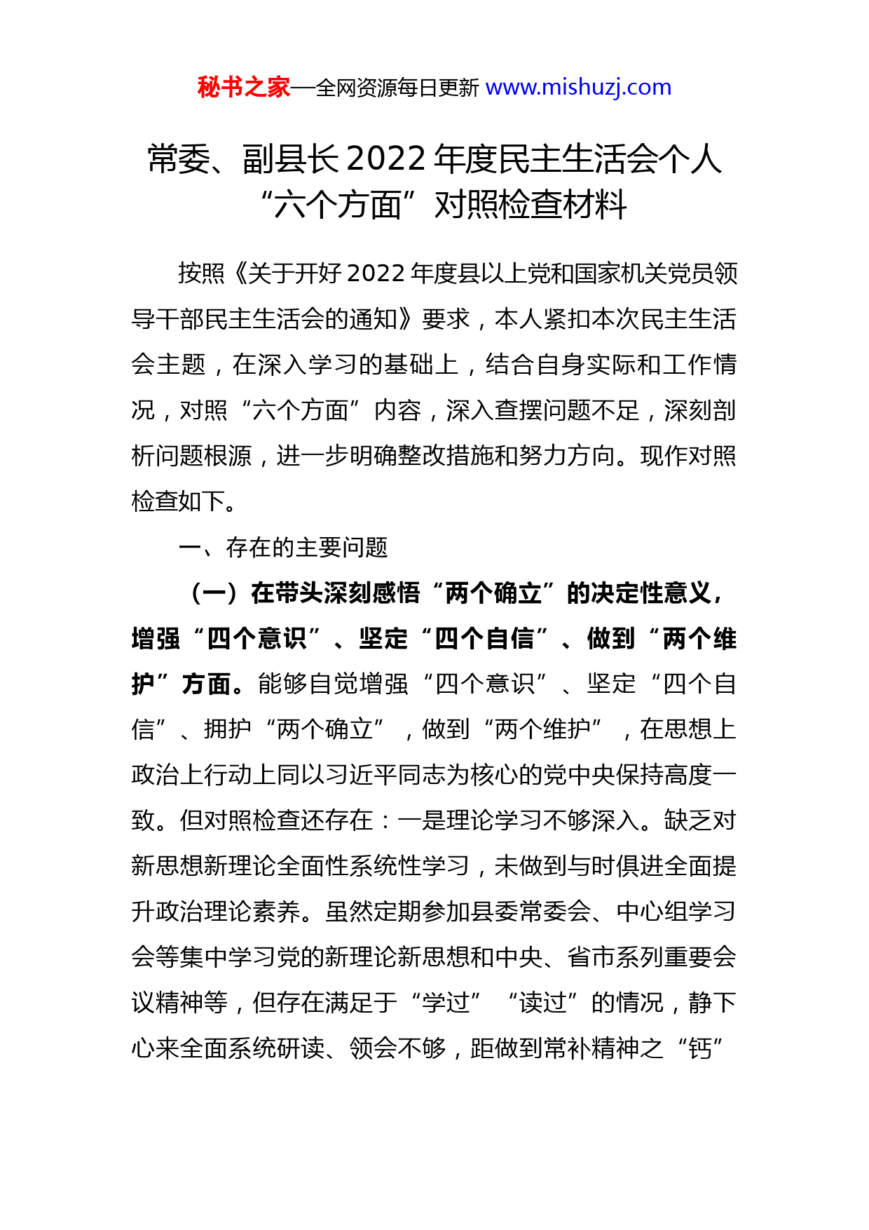 秘书之家—全网资源每日更新www.mishuzj.com常委、副县长2022年度民主生活会个人“六个方面”对照检查材料按照《关于开好2022年度县以上党和国家机关党员领导干部民主生活会的通知》要求,本人紧扣本次民主生活会主题,在深入学习的基础上,结合自身实际和工作情况,对照“六个方面”内容,深入查摆问题不足,深刻剖析问题根源,进一步明确整改措施和努力方向。现作对照检查如下。一、存在的主要问题(一)在带头深刻感悟“两个确立”的决定性意义,增强“四个意识”、坚定“四个自信”、做到“两个维护”方面。能够自觉增强“四个意识”、坚定“四个自信”、拥护“两个确立”,做到“两个维护”,在思想上政治上行动上同以习近平同志为核心的党中央保持高度一致。但对照检查还存在:一是理论学习不够深入。缺乏对新思想新理论全面性系统性学习,未做到与时俱进全面提升政治理论素养。虽然定期参加县委常委会、中心组学习会等集中学习党的新理论新思想和中央、省市系列重要会议精神等,但存在满足于“学过”“读过”的情况,静下心来全面系统研读、领会不够,距做到常补精神之“钙”秘书之家—全网资源每日更新www.mishuzj.com还有差距。二是自觉学习不够主动。虽然能够以最高政治要求、最大政治责任、最严政治纪律抓自身理论学习,但有时不能很好的处理工学矛盾,导致主动跟进学的能动性、系统性不够,存在零散化、碎片化、快餐化现象,没有真正把学习党的方针政策作为思想提升的必修课,自觉学习的习惯性,主动性、积极性还有所欠缺。三是学用结合还有差距。在学以致用、学用结合上做得还不够,没有从责任的角度、政治的高度开展精准学习,面对新发展格局,还没有拿出更多管用的办法和措施,未能将理论知识贯穿到具体工作和实践中,用新知识新要求指导分管工作有效开展还存在不足。(二)在带头用习近平新时代中国特色社会主义思想凝心铸魂方面。能够深入学习习近平新时代中国特色社会主义思想,深刻领会党中央决策部署的政治意图、战略谋划和实践要求,切实把贯彻落实中央和省市精神体现到日常工作实践中,创造性地转化为推进工作的具体措施,全力推动各项工作落实见效。但对照检查还存在:一是担当精神有待加强。在贯彻落实各项决策部署上,从学习领会到自身消化再到自觉执行需要一定时间,导致有些工作执行不够及时到位,遇事考虑困难多、考虑客观多,有求稳怕乱、不敢作为的倾向,缺乏敢闯敢试的勇气、攻坚克难的锐气。二是履职成效有待提升。在“十四五”规划开局秘书之家—全网资源每日更新www.mishuzj.com起步的新形势、新背景下,所分管领域的工作面临越来越多的新情况新问题新考验,对待工作有时只满足于完成上级和领导交办的任务,在全县稳定、生态、发展、民生工作中新思路新办法不多,求稳保底的思想抑制了创新发展思维。三是责任落实有待细化。存在重安排、轻落实,重强调、轻检查的问题,工作中遇到繁琐、复杂的事情,有时会采取逃避的方法,主体责任未完全发挥,投入精力不够,部分职能工作任务没有真正抓在手上,放在心上,扛在肩上。(三)在带头坚持和加强党的全面领导方面。主要存在:对党建工作的重要性和紧迫性的认识和理解还需进一步提高,有时存在重经济、轻党建的倾向,受事务性工作影响,对党建应付抓、被动抓的时候多,没能将年度工作计划、贯彻上级重大决策、阶段性重大工作同党建工作齐抓共管,造成党建工作与业务工作分离脱节。(四)在带头学习坚持以人民为中心的发展思想,推动改革发展稳定方面。一是深入基层调研不够经常。客观上业务工作比较忙、时间相对紧张,主观上服务群众意识树立的不够牢。存在习惯于通过电话了解、办公室听取汇报的工作方式去了解基层情况,了解面上情况多,发现深层次问题少。没有真正扑下身子,走进群众身边,走进群众心间,群众的真实情况掌握不全面。二是学习贯彻落实秘书之家—全网资源每日更新www.mishuzj.com不够到位。对新发展理念的贯彻落实还不到位,没有真正践行以人民为中心的发展思想,分管的教体、卫生等工作与人民群众的根本利益结合不够紧密。对身边干部同事帮扶指导较少,要求工作结果较多,听取工作过程较少。三是服务群众思想不够牢固。对基层鲜活的典型经验学习和总结的不够,指导工作主观意志成份多,对群众反映的难点热点问题,拓思路、出点子还不够。在实际工作中,重心更多倾向于落实上级部署和保障分管工作日常运转上,为民服务的宗旨意识不强,在做决策、办事情上,对解决群众身边“小事”下力气不够。(五)在带头深入发扬斗争精神,防范化解风险挑战方面。一是学用结合有待提高。对党在不同历史时期成功应对风险挑战的丰富经验,能够做到经常深入学习领会,但对其中伟大精神、宝贵经验实践运用还不到位,仍需要进一步传承和弘扬。二是斗争精神发挥不够。缺乏重大事件历练、重大风险考验、重大危险淬炼,在应对纷繁复杂的形势变化面前,干事缺少激情,过于求稳,少了一些敢于担当、敢于奋斗、敢于斗争的精神。三是日常工作创新不足。主要表现为战略定力不足,不善于从全局、从长远角度出发思考问题,距离“重规范,转作风,求创新,提效能”的要求还有很大差距。自我突破,