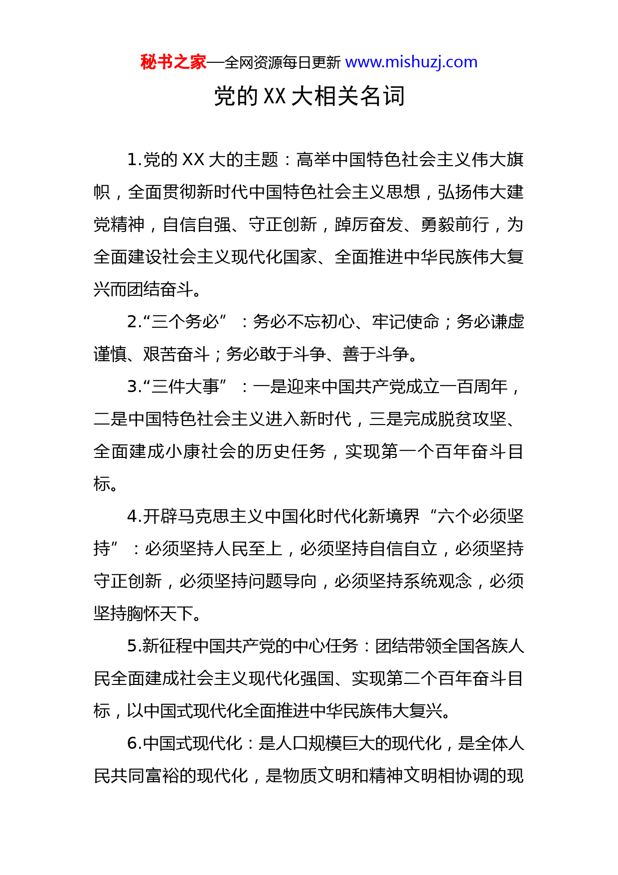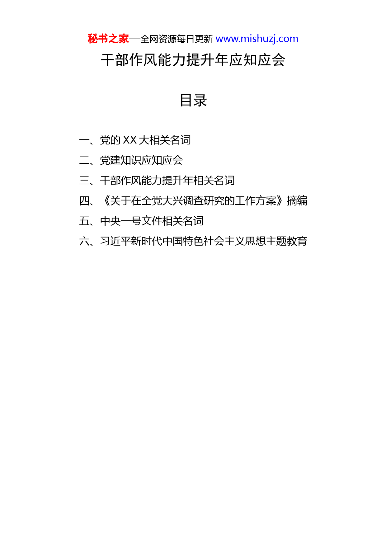 秘书之家—全网资源每日更新www.mishuzj.com干部作风能力提升年应知应会目录一、党的XX大相关名词二、党建知识应知应会三、干部作风能力提升年相关名词四、《关于在全党大兴调查研究的工作方案》摘编五、中央一号文件相关名词六、习近平新时代中国特色社会主义思想主题教育秘书之家—全网资源每日更新www.mishuzj.com党的XX大相关名词1.党的XX大的主题:高举中国特色社会主义伟大旗帜,全面贯彻新时代中国特色社会主义思想,弘扬伟大建党精神,自信自强、守正创新,踔厉奋发、勇毅前行,为全面建设社会主义现代化国家、全面推进中华民族伟大复兴而团结奋斗。2.“三个务必”:务必不忘初心、牢记使命;务必谦虚谨慎、艰苦奋斗;务必敢于斗争、善于斗争。3.“三件大事”:一是迎来中国共产党成立一百周年,二是中国特色社会主义进入新时代,三是完成脱贫攻坚、全面建成小康社会的历史任务,实现第一个百年奋斗目标。4.开辟马克思主义中国化时代化新境界“六个必须坚持”:必须坚持人民至上,必须坚持自信自立,必须坚持守正创新,必须坚持问题导向,必须坚持系统观念,必须坚持胸怀天下。5.新征程中国共产党的中心任务:团结带领全国各族人民全面建成社会主义现代化强国、实现第二个百年奋斗目标,以中国式现代化全面推进中华民族伟大复兴。6.中国式现代化:是人口规模巨大的现代化,是全体人民共同富裕的现代化,是物质文明和精神文明相协调的现秘书之家—全网资源每日更新www.mishuzj.com代化,是人与自然和谐共生的现代化,是走和平发展道路的现代化。7.中国式现代化的本质要求:坚持中国共产党领导,坚持中国特色社会主义,实现高质量发展,发展全过程人民民主,丰富人民精神世界,实现全体人民共同富裕,促进人与自然和谐共生,推动构建人类命运共同体,创造人类文明新形态。8.全面建成社会主义现代化强国“两步走”战略安排:从二〇二〇年到二〇三五年基本实现社会主义现代化;从二〇三五年到本世纪中叶把我国建成富强民主文明和谐美丽的社会主义现代化强国。9.中国式现代化的重大原则:坚持和加强党的全面领导,坚持中国特色社会主义道路,坚持以人民为中心的发展思想,坚持深化改革开放,坚持发扬斗争精神。10.全面建设社会主义现代化国家的首要任务:高质量发展是全面建设社会主义现代化国家的首要任务。11.全面建设社会主义现代化国家的基础性、战略性支撑:教育、科技、人才。科技是第一生产力、人才是第一资源、创新是第一动力。12.社会主义民主政治的本质属性:全过程人民民主。13.“三个区分开来”:把干部在推进改革中因缺乏经验、先行先试出现的失误和错误,同明知故犯的违纪违法秘书之家—全网资源每日更新www.mishuzj.com行为区分开来;把上级尚无明确限制的探索性试验中的失误和错误,同上级明令禁止后依然我行我素的违纪违法行为区分开来;把为推动发展的无意过失,同为谋取私利的违纪违法行为区分开来。14.“五个必由之路”:坚持党的全面领导是坚持和发展中国特色社会主义的必由之路,中国特色社会主义是实现中华民族伟大复兴的必由之路,团结奋斗是中国人民创造历史伟业的必由之路,贯彻新发展理念是新时代我国发展壮大的必由之路,全面从严治党是党永葆生机活力、走好新的赶考之路的必由之路。15.伟大建党精神:坚持真理、坚守理想,践行初心、担当使命,不怕牺牲、英勇斗争,对党忠诚、不负人民。16.延安精神:坚定正确的政治方向、解放思想实事求是的思想路线、全心全意为人民服务的根本宗旨、自力更生艰苦奋斗的创业精神。17.合格党员标准:践行“四讲四有”,做到“四个合格”,是合格党员的标准。18.四讲四有:讲政治、有信念;讲规矩、有纪律;讲道德、有品行;讲奉献、有作为。19.“四个合格”:政治合格、执行纪律合格、品德合格、发挥作用合格。20.四个服从:党员个人服从党的组织,少数服从多秘书之家—全网资源每日更新www.mishuzj.com数,下级组织服从上级组织,全党各个组织和全体党员服从党的全国代表大会和中央委员会。21.心中“四有”:心中有党、心中有民、心中有责、心中有戒。22.好干部标准:信念坚定、为民服务、勤政务实、敢于担当、清正廉洁。23.领导干部要做到的“五个过硬”:信念过硬、政治过硬、责任过硬、能力过硬、作风过硬。24.强化激励约束推动作风建设八项措施:①加强干部作风培养锤炼。②加大干部作风考核力度。③及时开展作风专项研判。④大力选拔使用担当作为好干部。⑤突出对干部作风问题的举报受理。⑥严肃处理作风不严不实的干部。⑦切实为敢于担当的干部担当。⑧建立作风建设情况报告督导制度。25.“十个坚持、十个反对”:①坚持对党忠诚,反对“两面人”;②坚持胸怀大局,反对“局外人”;③坚持真抓实干,反对“找借口”;④坚持攻坚克难,反对“等靠要”;⑤坚持改革创新,反对“凭经验”;⑥坚持细致精致,反对“差不多”;⑦坚持实事求是,反对“一刀切”;⑧坚持为民服务,反对“不尽责”;⑨坚持服从组织,反对“讲条件”;⑩坚持廉洁自律,反对“潜规则”。秘书之家—全网资源每日更新www.mishuzj.com26.市委“十项重点任务”:坚定不移做强工业行动。集中精力建设交通枢纽行动。打造生态之城美丽宝鸡行动。提高城镇规划建设