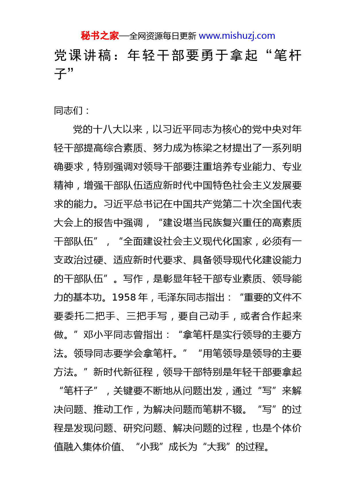 秘书之家—全网资源每日更新www.mishuzj.com党课讲稿:年轻干部要勇于拿起“笔杆子”同志们:党的十八大以来,以习近平同志为核心的党中央对年轻干部提高综合素质、努力成为栋梁之材提出了一系列明确要求,特别强调对领导干部要注重培养专业能力、专业精神,增强干部队伍适应新时代中国特色社会主义发展要求的能力。习近平总书记在中国共产党第二十次全国代表大会上的报告中强调,“建设堪当民族复兴重任的高素质干部队伍”,“全面建设社会主义现代化国家,必须有一支政治过硬、适应新时代要求、具备领导现代化建设能力的干部队伍”。写作,是彰显年轻干部专业素质、领导能力的基本功。1958年,毛泽东同志指出:“重要的文件不要委托二把手、三把手写,要自己动手,或者合作起来做。”邓小平同志曾指出:“拿笔杆是实行领导的主要方法。领导同志要学会拿笔杆。”“用笔领导是领导的主要方法。”新时代新征程,领导干部特别是年轻干部要拿起“笔杆子”,关键要不断地从问题出发,通过“写”来解决问题、推动工作,为解决问题而笔耕不辍。“写”的过程是发现问题、研究问题、解决问题的过程,也是个体价值融入集体价值、“小我”成长为“大我”的过程。秘书之家—全网资源每日更新www.mishuzj.com一、在拿起“笔杆子”过程中发现问题、调查研究问题就是矛盾,矛盾无处不在。调查研究是发现工作中的问题和矛盾的有效途径。1930年5月,毛泽东在《反对本本主义》一文中指出,“没有调查,没有发言权”,“深切地了解一处地方或者一个问题了,往后调查别处地方、别个问题,便容易找到门路了”。正确的观点、主张是从实际问题中来的,“没有调查就没有文字权”。(一)发现问题习近平同志主政浙江期间,曾连续在《浙江日报》“之江新语”专栏发表短论232篇,对全省党员干部进行思想教育引导,并出版《之江新语》,今天仍具有十分重要的现实指导意义。发现问题,就要从实际出发,实事求是,多触碰实际问题,并发扬“短实新”的文风。现实中矛盾和问题总是层出不穷,只有与时俱进地去发现问题,敢于直面矛盾和问题,勇于接“烫手山芋”、乐于钻“矛盾窝”,才能正确认清新的形势和任务。一定意义上讲,看不到问题或矛盾就无法写出有意义的文章。领导干部拿起“笔杆子”写的文章不是杂文、小说,而是公文,想的是天下计,解的是百姓忧,字字是家国大情怀,句句是责任大担当。起草公文时,切忌“东一榔头西一棒子”,而要抽丝剥茧、层层深究,把一件事写透后再写另一件事,把一个观点阐明后再阐述另一个观点,防止材料和观点重秘书之家—全网资源每日更新www.mishuzj.com复。文章是用来指导工作、解决问题的,绝不能似是而非、空穴来风。理从事出,片言成典。好的文章都有很强说服力,常常有拨云见日、豁然开朗和醍醐灌顶之感。讲清道理是门学问,需要深入浅出,不管思想内容多么艰深的问题,到了笔下和嘴里,都要变得非常容易懂。比如,“不管白猫黑猫,抓住老鼠就是好猫”,邓小平同志用简单朴实的比喻来说明经济制度和社会制度的评价标准;“国家好,民族好,大家才会好”,习近平总书记用真切动人的话,来阐明个人的前途命运与国家和民族的前途命运紧密相连的关系,都是讲清道理的典型范例。实践告诉我们,写文章不仅仅是亲手动笔那么简单,更重要的是做到不唯书、不唯上、只唯实,一切从问题着眼,一切从实效入手,一切从实际出发,发现问题的真谛,客观科学地进行分析判断,必须在思考的道路上挖掘真知灼见。(二)调查研究年轻干部拿起“笔杆子”要善于从小切口入手,选准题目,深入基层、深入一线,全面深刻地掌握第一手资料,在研究新情况、新问题,探索新思路、新举措上下真功夫。概念的形成、判断的形成、推理的过程,离不开调查研究的过程。只有熟悉问题和把握全面情况,知全局、识大局、善谋势,做到了然于胸,深入浅出,才能完成从感性认识到理性认识的转变,才会形成从理性认识向理论秘书之家—全网资源每日更新www.mishuzj.com高度的升华。否则,“闭门造车”“走马观花”就不会写出高质量、有价值的文章。评论文章好与不好、有没有价值,郑板桥有句名言讲得很透,“隔靴搔痒赞何益,入木三分骂亦精”。一般来说,题目越大、越宽,写起来就越难以深入细致,容易泛泛而论;而题目越小、越窄,就越易于驾驭,容易写深写透。在文章选题上,笔者比较倾向“小题大做”。比如,撰写民营经济方面的文章,如果立题“加快民营经济发展的建议”,需要从不同层面、不同角度进行全面分析研究,驾驭起来就比较困难;而如果立题“谈民营经济发展的资金瓶颈破解”,就将笔墨集中到资金这一点上,驾驭起来就容易多了。一篇文章,小题大做,就容易瞄准、聚焦关键,几千字就能将问题讲明白;反之,泛泛而论,问题不仅难以分析透,对策建议也难有针对性,整个文章也就失去了价值。当然题目大点好还是小点好,每个人情况不同,难以一概而论。如果理论素养好,情况了解多,文字水平较高,可以选择大一点的题目。二、在拿起“笔杆子”过程中分析问题、提出对策(一)发现问题发现问题是分析问题、提出对策的前提和基础,提出对策就要善于抓主要矛盾和抓矛盾的主要方面,其主要目的就是解决现实问题。毛泽东同志在《反对党