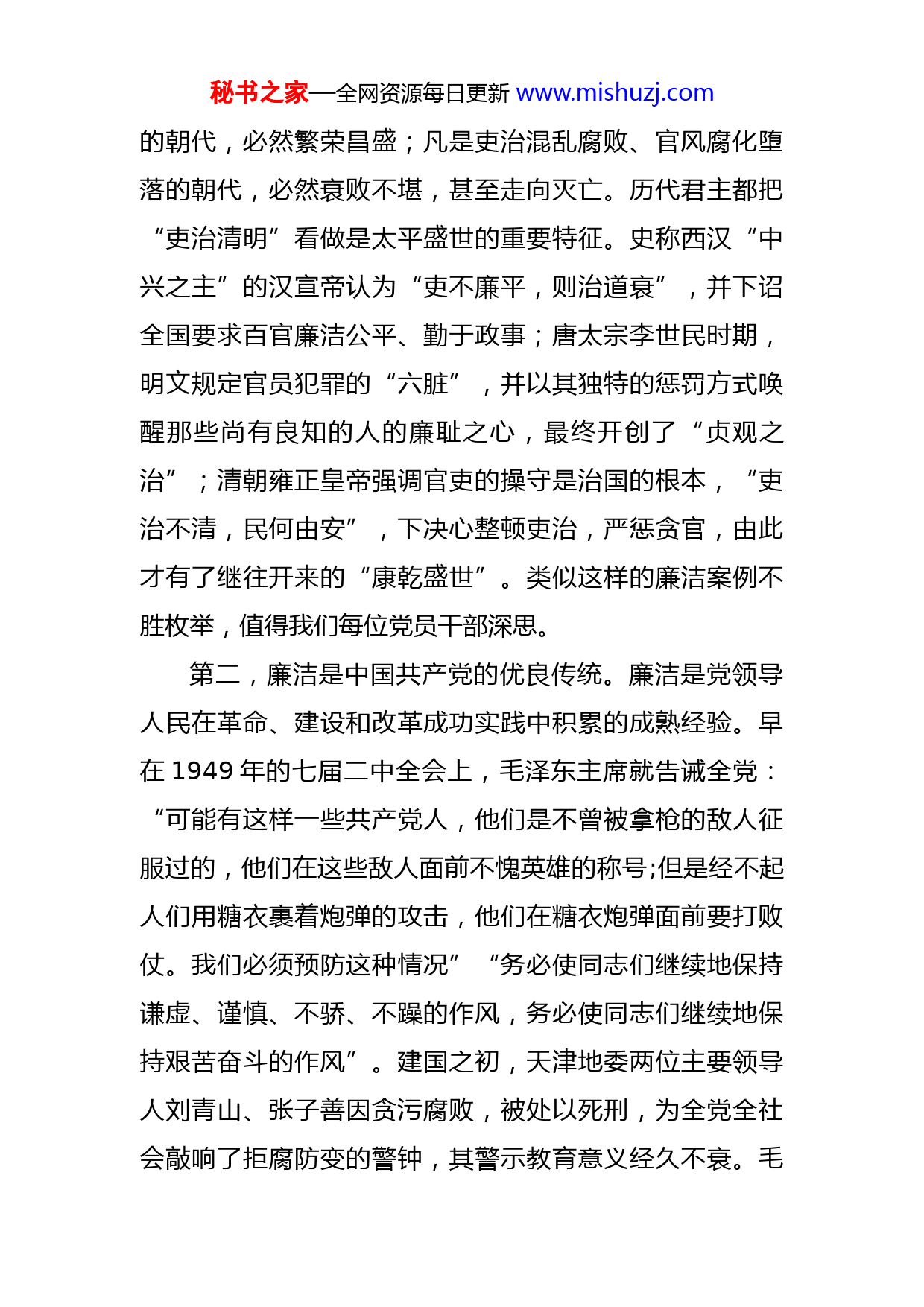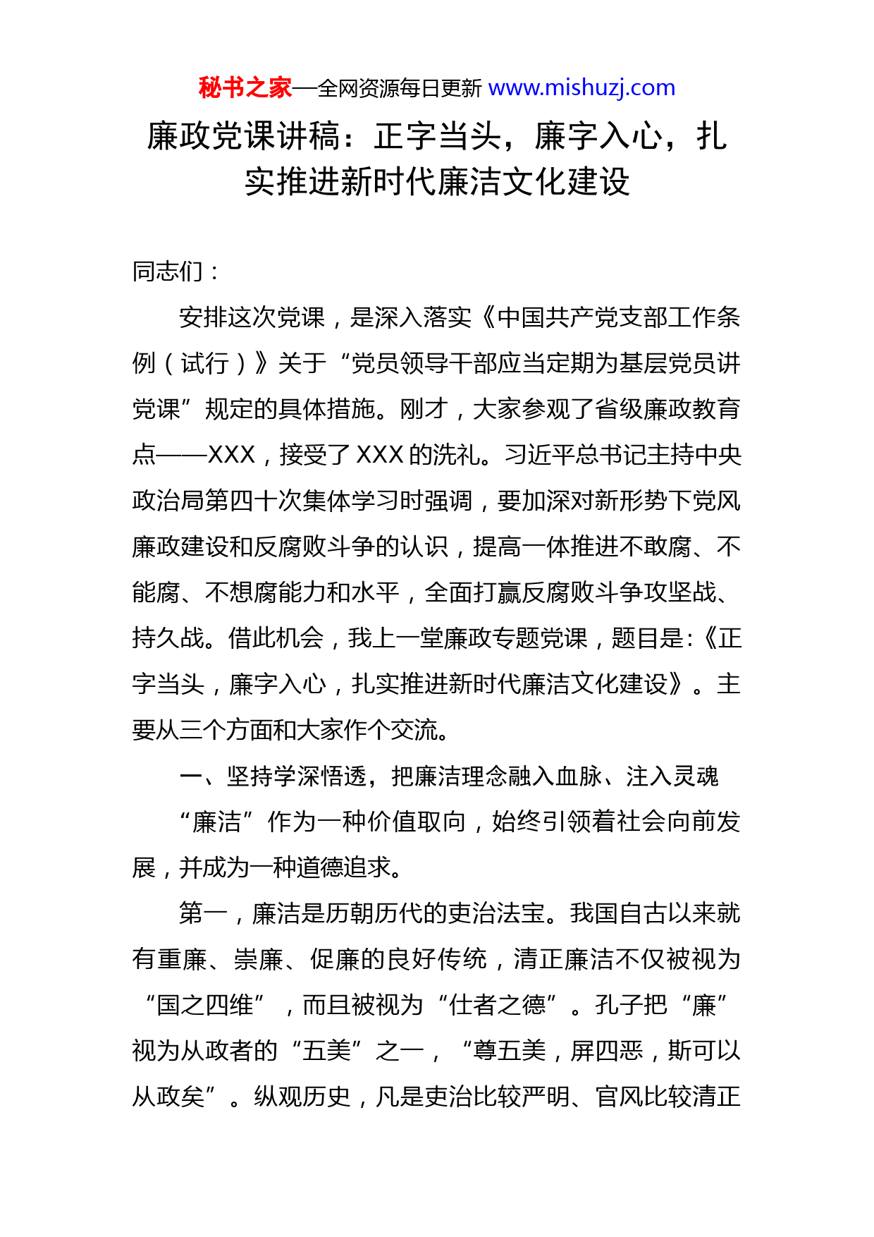 秘书之家—全网资源每日更新www.mishuzj.com廉政党课讲稿:正字当头,廉字入心,扎实推进新时代廉洁文化建设同志们:安排这次党课,是深入落实《中国共产党支部工作条例(试行)》关于“党员领导干部应当定期为基层党员讲党课”规定的具体措施。刚才,大家参观了省级廉政教育点——XXX,接受了XXX的洗礼。习近平总书记主持中央政治局第四十次集体学习时强调,要加深对新形势下党风廉政建设和反腐败斗争的认识,提高一体推进不敢腐、不能腐、不想腐能力和水平,全面打赢反腐败斗争攻坚战、持久战。借此机会,我上一堂廉政专题党课,题目是:《正字当头,廉字入心,扎实推进新时代廉洁文化建设》。主要从三个方面和大家作个交流。一、坚持学深悟透,把廉洁理念融入血脉、注入灵魂“廉洁”作为一种价值取向,始终引领着社会向前发展,并成为一种道德追求。第一,廉洁是历朝历代的吏治法宝。我国自古以来就有重廉、崇廉、促廉的良好传统,清正廉洁不仅被视为“国之四维”,而且被视为“仕者之德”。孔子把“廉”视为从政者的“五美”之一,“尊五美,屏四恶,斯可以从政矣”。纵观历史,凡是吏治比较严明、官风比较清正秘书之家—全网资源每日更新www.mishuzj.com的朝代,必然繁荣昌盛;凡是吏治混乱腐败、官风腐化堕落的朝代,必然衰败不堪,甚至走向灭亡。历代君主都把“吏治清明”看做是太平盛世的重要特征。史称西汉“中兴之主”的汉宣帝认为“吏不廉平,则治道衰”,并下诏全国要求百官廉洁公平、勤于政事;唐太宗李世民时期,明文规定官员犯罪的“六脏”,并以其独特的惩罚方式唤醒那些尚有良知的人的廉耻之心,最终开创了“贞观之治”;清朝雍正皇帝强调官吏的操守是治国的根本,“吏治不清,民何由安”,下决心整顿吏治,严惩贪官,由此才有了继往开来的“康乾盛世”。类似这样的廉洁案例不胜枚举,值得我们每位党员干部深思。第二,廉洁是中国共产党的优良传统。廉洁是党领导人民在革命、建设和改革成功实践中积累的成熟经验。早在1949年的七届二中全会上,毛泽东主席就告诫全党:“可能有这样一些共产党人,他们是不曾被拿枪的敌人征服过的,他们在这些敌人面前不愧英雄的称号;但是经不起人们用糖衣裹着炮弹的攻击,他们在糖衣炮弹面前要打败仗。我们必须预防这种情况”“务必使同志们继续地保持谦虚、谨慎、不骄、不躁的作风,务必使同志们继续地保持艰苦奋斗的作风”。建国之初,天津地委两位主要领导人刘青山、张子善因贪污腐败,被处以死刑,为全党全社会敲响了拒腐防变的警钟,其警示教育意义经久不衰。毛秘书之家—全网资源每日更新www.mishuzj.com泽东主席尖锐地指出,“反贪污浪费一事,是全党的一件大事”。“我们需要来一次全党的大清理,……才能停止很多党员被资产阶级所腐蚀的极大危险现象”。党的十八大以来,针对一些领域消极腐败现象频发、反腐败斗争形势严峻的现实,习近平总书记多次强调“打铁必须自身硬”,以零容忍的态度惩治腐败,严肃查处了周永康、薄熙来、郭伯雄、徐才厚、令计划等“大老虎”,树立起不敢腐的行动震慑;通过修订《中国共产党廉洁自律准则》《中国共产党纪律处分条例》等党内法规,建立起不能腐的体制机制;通过开展党的群众路线教育实践活动、“三严三实”专题教育、“两学一做”学习教育、“不忘初心、牢记使命”主题教育、党史学习教育等活动,初步树立起不想腐的思想防线。第三,廉洁是党员领导干部做人做事的底线。习近平总书记指出:“干部廉洁自律关键在于守住底线。只要能守住做人、处事、用权、交友的底线,就能守住党和人民交给自己的政治责任,守住自己的政治生命线,守住正确的人生价值观”。党章明确规定,党的各级领导干部必须信念坚定、为民服务、勤政务实、敢于担当、清正廉洁。廉洁,是习近平总书记强调的新时期好干部必须具备的“五条标准”之一,是党员领导干部的立身之本、处世之道和为政之要。对党员领导干部来说,能力有大有小,但秘书之家—全网资源每日更新www.mishuzj.com廉洁却不是可有可无的,如果在廉洁方面过不了关,做人便缺失了骨气、做事便失去了底气、从政也就自然失去了根基。二、坚持以知促行,把廉洁行动抓在日常、做到经常全面从严治党既要靠治标,猛药去疴,重典治乱;也要靠治本,正心修身,涵养文化,守住为政之本。大家耳熟能详的朱子《观书有感》诗:“半亩方塘一鉴开,天光云影共徘徊。问渠那得清如许?为有源头活水来。”深刻揭示了“清如许”与“源头活水”的关系,我们必须站在勇于自我革命、保持党的先进性和纯洁性的高度,坚持把加强廉洁文化建设作为一体推进不敢腐、不能腐、不想腐的基础性工程抓紧抓实抓好,为纵深推进全面从严治党提供重要支撑。一要以红色革命文化立根铸魂。中国共产党的百年征程,既是部波澜壮阔的社会革命史,也是一部激浊扬清的自我革命史。党的一大《纲领》就宣示了反对腐败、倡导廉洁的根本立场。一百年来,党通过严格纪律与内部腐败现象作斗争,有力克服了旧社会腐败习气对新政权的影响,不断铲除了经济转轨时期腐败滋生蔓延的土壤。革命烈士方志敏,在被捕时,敌人在他的身上一个铜板都没有搜出,雄辩地反映了共产党人的清贫。1954年,毛主席给
