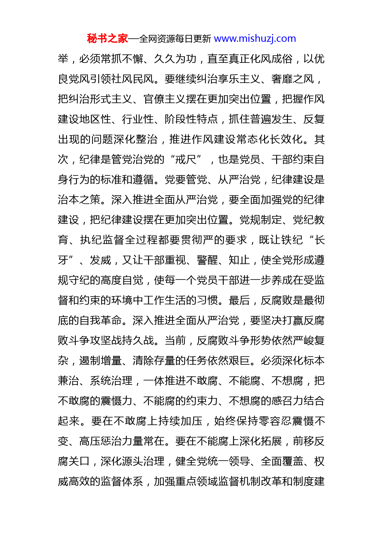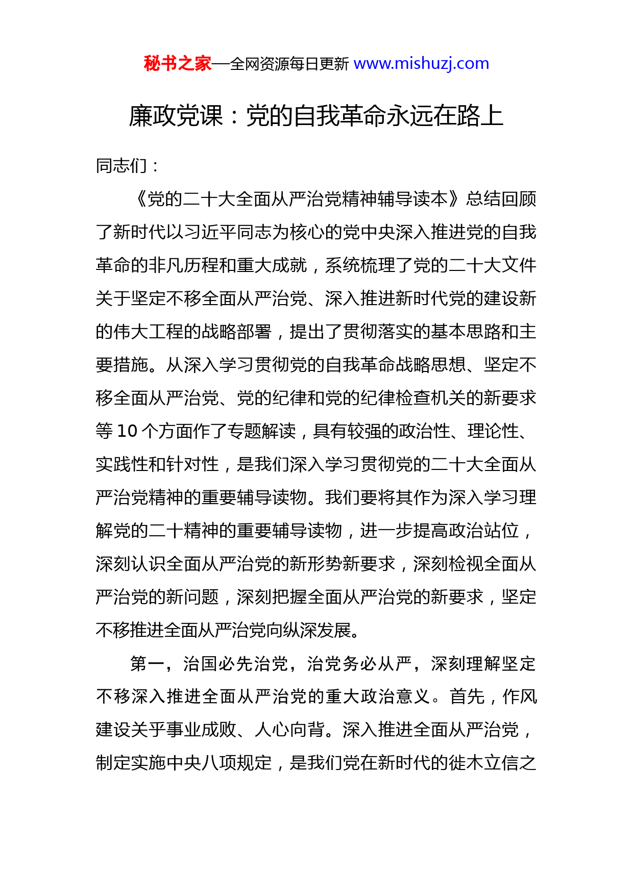 秘书之家—全网资源每日更新www.mishuzj.com廉政党课:党的自我革命永远在路上同志们:《党的二十大全面从严治党精神辅导读本》总结回顾了新时代以习近平同志为核心的党中央深入推进党的自我革命的非凡历程和重大成就,系统梳理了党的二十大文件关于坚定不移全面从严治党、深入推进新时代党的建设新的伟大工程的战略部署,提出了贯彻落实的基本思路和主要措施。从深入学习贯彻党的自我革命战略思想、坚定不移全面从严治党、党的纪律和党的纪律检查机关的新要求等10个方面作了专题解读,具有较强的政治性、理论性、实践性和针对性,是我们深入学习贯彻党的二十大全面从严治党精神的重要辅导读物。我们要将其作为深入学习理解党的二十精神的重要辅导读物,进一步提高政治站位,深刻认识全面从严治党的新形势新要求,深刻检视全面从严治党的新问题,深刻把握全面从严治党的新要求,坚定不移推进全面从严治党向纵深发展。第一,治国必先治党,治党务必从严,深刻理解坚定不移深入推进全面从严治党的重大政治意义。首先,作风建设关乎事业成败、人心向背。深入推进全面从严治党,制定实施中央八项规定,是我们党在新时代的徙木立信之秘书之家—全网资源每日更新www.mishuzj.com举,必须常抓不懈、久久为功,直至真正化风成俗,以优良党风引领社风民风。要继续纠治享乐主义、奢靡之风,把纠治形式主义、官僚主义摆在更加突出位置,把握作风建设地区性、行业性、阶段性特点,抓住普遍发生、反复出现的问题深化整治,推进作风建设常态化长效化。其次,纪律是管党治党的“戒尺”,也是党员、干部约束自身行为的标准和遵循。党要管党、从严治党,纪律建设是治本之策。深入推进全面从严治党,要全面加强党的纪律建设,把纪律建设摆在更加突出位置。党规制定、党纪教育、执纪监督全过程都要贯彻严的要求,既让铁纪“长牙”、发威,又让干部重视、警醒、知止,使全党形成遵规守纪的高度自觉,使每一个党员干部进一步养成在受监督和约束的环境中工作生活的习惯。最后,反腐败是最彻底的自我革命。深入推进全面从严治党,要坚决打赢反腐败斗争攻坚战持久战。当前,反腐败斗争形势依然严峻复杂,遏制增量、清除存量的任务依然艰巨。必须深化标本兼治、系统治理,一体推进不敢腐、不能腐、不想腐,把不敢腐的震慑力、不能腐的约束力、不想腐的感召力结合起来。要在不敢腐上持续加压,始终保持零容忍震慑不变、高压惩治力量常在。要在不能腐上深化拓展,前移反腐关口,深化源头治理,健全党统一领导、全面覆盖、权威高效的监督体系,加强重点领域监督机制改革和制度建秘书之家—全网资源每日更新www.mishuzj.com设,健全防治腐败滋生蔓延的体制机制。要在不想腐上巩固提升,更加注重正本清源、固本培元,加强新时代廉洁文化建设,涵养求真务实、团结奋斗的时代新风。第二,全面系统布局,协同高效推进,适应新时代新征程形势任务需要健全全面从严治党体系。新征程上,我们必须保持“赶考”的清醒和坚定,深入贯彻全面从严治党战略方针,守正创新健全全面从严治党体系。首先,领域过程对象全覆盖,是落实全面从严治党“基础在全面”的基本要求。领域全覆盖,就是全面从严治党要覆盖党的各方面建设,贯穿于各级党组织管党治党谋划、部署、实施、督促、考核、问责等各个环节,贯穿于党的建设各方面工作铺陈展开的每一时段。对象全覆盖,就是全面从严治党要面向全体党员和各级党组织,不能在管党治党上有任何特殊的组织和个人。领域过程对象全覆盖,要求统筹推进全面从严治党,抓紧补短板、强弱项,使各领域相互协同、各环节紧密衔接,避免出现缺项漏项,彻底消除死角盲区,切实把所有党员和党组织都管住管好。其次,教育制度监督齐发力,是落实全面从严治党“关键在严”的基本要求。健全全面从严治党体系,要在“严”上持续用力,营造严的氛围,采取严的措施,不断丰富和深化从严管党治党的方式手段。教育制度监督齐发力,要求全面从严治党综合施治、立体施策,让各项措施和手段各尽所秘书之家—全网资源每日更新www.mishuzj.com能、各展其长、相互配合,同时发力、同向发力、形成合力,切实做到真管真严、敢管敢严、长管长严。最后,标准质量效果共提升,是落实全面从严治党“要害在治”的基本要求。健全全面从严治党体系,要在“治”上更加用力,采取标本兼治、针对性更强的举措,确保全面从严治党各项任务和部署不折不扣落实落地,实现党的建设高质量发展。标准质量效果共提升,要求以标准质量效果为标尺评价全面从严治党优劣得失,高度警惕并坚决纠治管党治党中的形式主义、官僚主义,反对摆花拳绣腿、做表面文章,防止看起来热热闹闹、实际上成效寥寥。要通过真抓实干、务求实效,不断提高全面从严治党水平,使新时代党的建设新的伟大工程为进行伟大斗争、推进伟大事业、实现伟大梦想提供更加坚强的保证。第三,永葆赶考清醒,勇于自我革命,以实际行动践行新时代新担当新作为。面对新征程上的新挑战新考验,我们必须时刻保持解决大党独有难题的清醒和坚定,驰而不息推进全面从严治党,使百年大党在自我革命中不断焕发蓬勃生机,始终成为中国特色社会主义事业的坚强领导核心。作