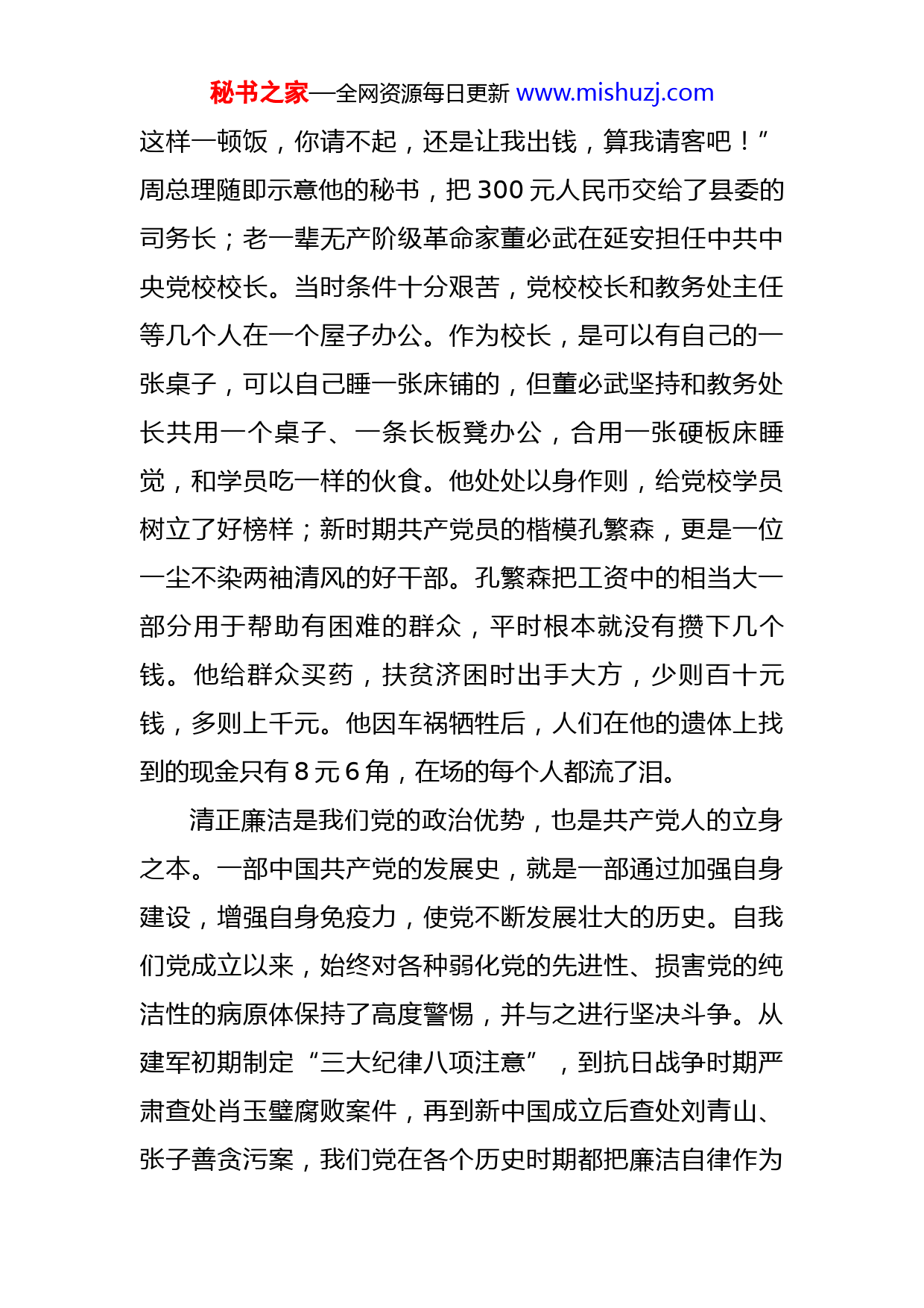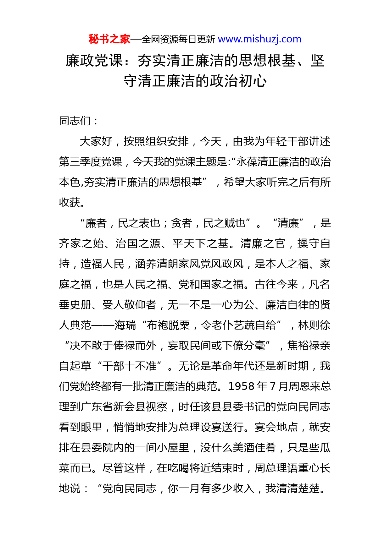 秘书之家—全网资源每日更新www.mishuzj.com廉政党课:夯实清正廉洁的思想根基、坚守清正廉洁的政治初心同志们:大家好,按照组织安排,今天,由我为年轻干部讲述第三季度党课,今天我的党课主题是:“永葆清正廉洁的政治本色,夯实清正廉洁的思想根基”,希望大家听完之后有所收获。“廉者,民之表也;贪者,民之贼也”。“清廉”,是齐家之始、治国之源、平天下之基。清廉之官,操守自持,造福人民,涵养清朗家风党风政风,是本人之福、家庭之福,也是人民之福、党和国家之福。古往今来,凡名垂史册、受人敬仰者,无一不是一心为公、廉洁自律的贤人典范——海瑞“布袍脱粟,令老仆艺蔬自给”,林则徐“决不敢于俸禄而外,妄取民间或下僚分毫”,焦裕禄亲自起草“干部十不准”。无论是革命年代还是新时期,我们党始终都有一批清正廉洁的典范。1958年7月周恩来总理到广东省新会县视察,时任该县县委书记的党向民同志看到眼里,悄悄地安排为总理设宴送行。宴会地点,就安排在县委院内的一间小屋里,没什么美酒佳肴,只是些瓜菜而已。尽管这样,在吃喝将近结束时,周总理语重心长地说:“党向民同志,你一月有多少收入,我清清楚楚。秘书之家—全网资源每日更新www.mishuzj.com这样一顿饭,你请不起,还是让我出钱,算我请客吧!”周总理随即示意他的秘书,把300元人民币交给了县委的司务长;老一辈无产阶级革命家董必武在延安担任中共中央党校校长。当时条件十分艰苦,党校校长和教务处主任等几个人在一个屋子办公。作为校长,是可以有自己的一张桌子,可以自己睡一张床铺的,但董必武坚持和教务处长共用一个桌子、一条长板凳办公,合用一张硬板床睡觉,和学员吃一样的伙食。他处处以身作则,给党校学员树立了好榜样;新时期共产党员的楷模孔繁森,更是一位一尘不染两袖清风的好干部。孔繁森把工资中的相当大一部分用于帮助有困难的群众,平时根本就没有攒下几个钱。他给群众买药,扶贫济困时出手大方,少则百十元钱,多则上千元。他因车祸牺牲后,人们在他的遗体上找到的现金只有8元6角,在场的每个人都流了泪。清正廉洁是我们党的政治优势,也是共产党人的立身之本。一部中国共产党的发展史,就是一部通过加强自身建设,增强自身免疫力,使党不断发展壮大的历史。自我们党成立以来,始终对各种弱化党的先进性、损害党的纯洁性的病原体保持了高度警惕,并与之进行坚决斗争。从建军初期制定“三大纪律八项注意”,到抗日战争时期严肃查处肖玉璧腐败案件,再到新中国成立后查处刘青山、张子善贪污案,我们党在各个历史时期都把廉洁自律作为秘书之家—全网资源每日更新www.mishuzj.com行为准则,进行了一系列行之有效的实践探索。党的十八大以来,以习近平同志为核心的党中央把全面从严治党纳入“四个全面”战略布局,以前所未有的勇气和定力推进党风廉政建设和反腐败斗争,坚定不移“打虎”“拍蝇”“猎狐”,清除了党、国家、军队内部存在的严重隐患,探索出依靠党的自我革命跳出历史周期率的成功路径。廉洁已经成为年轻干部的成长之钙。青年一代有理想、有本领、有担当,国家就有前途,民族就有希望。年轻干部是党和人民事业的接班人,是营造河清海晏政治生态环境的主力军,可以说,年轻干部廉洁,则党的执政根基更牢固,人民生活更幸福。当前,百年变局和世纪疫情交织叠加,实现中华民族伟大复兴面临一系列现实考验,迫切需要广大党员干部特别是年轻干部牢记习近平总书记“清廉是福,贪欲是祸”的谆谆教诲,勇于自我净化、自我完善、自我革新、自我提高,在奋进新时代伟大征程中永葆清正廉洁的政治底色。习近平总书记曾说:“年轻干部必须牢记清廉是福、贪欲是祸的道理,经常对照党的理论和路线方针政策、对照党章党规党纪、对照初心使命,看清一些事情该不该做、能不能干,时刻自重自省,严守纪法规矩。”这一重要论述既寄托着对年轻干部的殷切期望,又蕴含着对革命秘书之家—全网资源每日更新www.mishuzj.com事业后继有人的深远考量,为新时代年轻干部健康成长指明了方向。在2022年春季学期中央党校(国家行政学院)中青年干部培训班开班式上,再次对年轻干部的廉洁成长强调,年轻干部是党和国家事业发展的希望,必须筑牢理想信念根基,守住拒腐防变防线。党的十八大以来,党中央高度重视广大年轻干部的廉洁性,多次使用扣好“第一粒扣子”来比喻引导青年价值观、帮助青少年迈好人生第一个台阶的重要性。年轻干部是党和国家事业发展的希望,夯实清正廉洁思想根基,守住拒腐防变防线。夯实清正廉洁思想根基,要强化理论武装。要坚持以习近平新时代中国特色社会主义思想为指导,以理想信念强基固本,以先进文化启智润心,以高尚道德砥砺品格,惩治震慑、制度约束、提高觉悟一体发力。年轻党员干部要在学懂弄通做实习近平新时代中国特色社会主义思想上下苦功夫、下真功夫,把自己摆进去、把职责摆进去、把工作摆进去,不断增强政治定力抵腐定力。夯实清正廉洁思想根基,要坚定信仰、信念、信心。信仰、信念、信心,任何时候都至关重要,是指引和支撑中国人民站起来、富起来、强起来的强大精神力量。年轻党员干部只有把世界观、人生观、价值观的总开关拧紧了,把思想觉悟、精神境界提高了,