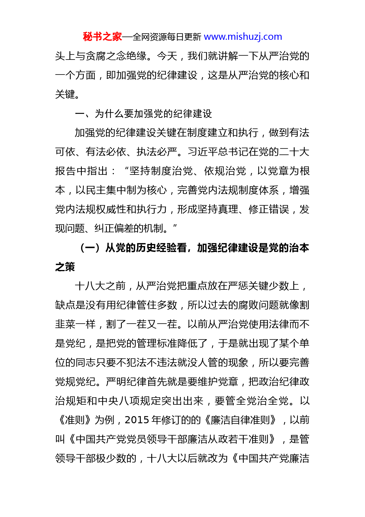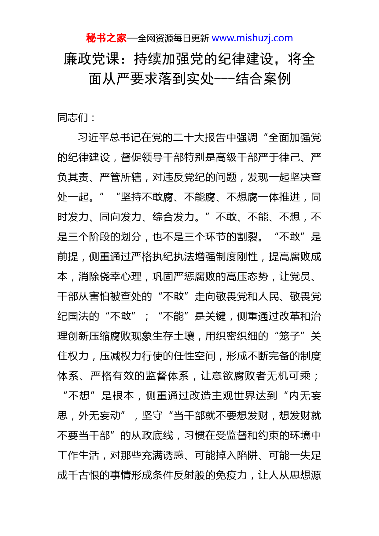 秘书之家—全网资源每日更新www.mishuzj.com廉政党课:持续加强党的纪律建设,将全面从严要求落到实处---结合案例同志们:习近平总书记在党的二十大报告中强调“全面加强党的纪律建设,督促领导干部特别是高级干部严于律己、严负其责、严管所辖,对违反党纪的问题,发现一起坚决查处一起。”“坚持不敢腐、不能腐、不想腐一体推进,同时发力、同向发力、综合发力。”不敢、不能、不想,不是三个阶段的划分,也不是三个环节的割裂。“不敢”是前提,侧重通过严格执纪执法增强制度刚性,提高腐败成本,消除侥幸心理,巩固严惩腐败的高压态势,让党员、干部从害怕被查处的“不敢”走向敬畏党和人民、敬畏党纪国法的“不敢”;“不能”是关键,侧重通过改革和治理创新压缩腐败现象生存土壤,用织密织细的“笼子”关住权力,压减权力行使的任性空间,形成不断完备的制度体系、严格有效的监督体系,让意欲腐败者无机可乘;“不想”是根本,侧重通过改造主观世界达到“内无妄思,外无妄动”,坚守“当干部就不要想发财,想发财就不要当干部”的从政底线,习惯在受监督和约束的环境中工作生活,对那些充满诱惑、可能掉入陷阱、可能一失足成千古恨的事情形成条件反射般的免疫力,让人从思想源秘书之家—全网资源每日更新www.mishuzj.com头上与贪腐之念绝缘。今天,我们就讲解一下从严治党的一个方面,即加强党的纪律建设,这是从严治党的核心和关键。一、为什么要加强党的纪律建设加强党的纪律建设关键在制度建立和执行,做到有法可依、有法必依、执法必严。习近平总书记在党的二十大报告中指出:“坚持制度治党、依规治党,以党章为根本,以民主集中制为核心,完善党内法规制度体系,增强党内法规权威性和执行力,形成坚持真理、修正错误,发现问题、纠正偏差的机制。”(一)从党的历史经验看,加强纪律建设是党的治本之策十八大之前,从严治党把重点放在严惩关键少数上,缺点是没有用纪律管住多数,所以过去的腐败问题就像割韭菜一样,割了一茬又一茬。以前从严治党使用法律而不是党纪,是把党的管理标准降低了,于是就出现了某个单位的同志只要不犯法不违法就没人管的现象,所以要完善党规党纪。严明纪律首先就是要维护党章,把政治纪律政治规矩和中央八项规定突出出来,要管全党治全党。以《准则》为例,2015年修订的的《廉洁自律准则》,以前叫《中国共产党党员领导干部廉洁从政若干准则》,是管领导干部极少数的,十八大以后就改为《中国共产党廉洁秘书之家—全网资源每日更新www.mishuzj.com自律准则》。党的十八大以来,在全面从严治党实践的基础上,通过制定新的法规制度、完善修订已有的法规制度、废止不适应的法规制度、强化制度的执行落实,基本形成了以《党章》为根本,若干配套党内法规为支撑的,基础性、综合性和专门性党内制度并存的党内法规制度体系。这些制度凝结着党的十八大以来管党治党理论和实践创新成果,逐步构建起“不能腐”的有效机制,为全面从严治党提供有力的制度保障。(二)从现实面临的问题看,当前主要的挑战是党的领导弱化和组织涣散、纪律松弛习近平总书记说:“要清醒认识到全面从严治党远未到大功告成的时候,在全面从严治党这个问题上,我们不能有差不多了,该松口气、歇歇脚的想法,不能有打好一仗就一劳永逸的想法,不能有初见成效就见好就收的想法。”党的二十大新闻中心记者招待会上,中央纪委副书记、国家监委副主任肖培介绍,党的十八大以来,全国纪检监察机关立案审查调查中管干部553人,处分厅局级干部2.5万多人、县处级干部18.2万多人。这反映出一个什么问题?就是党员干部中,还有相当一部分人纪律和规矩意识淡薄、心存侥幸。所以我们当前对于四风问题的反弹回潮绝不能忽视,要继续发扬钉钉子精神,认真去抓、认真去管。秘书之家—全网资源每日更新www.mishuzj.com(三)从将来面临的风险看,也必须要严明党的纪律和规矩习近平总书记指出:“我们前所未有地靠近世界舞台的中心,前所未有地接近实现中华民族伟大复兴的目标,前所未有地具有实现这个目标的能力和信心。”这三个“前所未有”是对中国发展大势的深刻把握,是基于中国发展历史方位的重大判断。但同时,习近平总书记也在十九大上强调:“全党要清醒认识到,我们党面临的执政环境是复杂的,影响党的先进性、弱化党的纯洁性的因素也是复杂的,党内存在的思想不纯、组织不纯、作风不纯等突出问题尚未得到根本解决。要深刻认识党面临的执政考验、改革开放考验、市场经济考验、外部环境考验的长期性和复杂性,深刻认识党面临的精神懈怠危险、能力不足危险、脱离群众危险、消极腐败危险的尖锐性和严峻性。”党是领导一切的,我们这么大一个政党,靠什么来管好自己的队伍,靠什么来战胜风险挑战,除了正确的方针政策外,必须严明纪律和规矩。我们提出那么多要求,要多管齐下、标本兼治,靠觉悟不够,必须靠严格落实执行《中国共产党纪律处分条例》,这是我们党抓好纪律建设的根本抓手和重要遵循。二、《中国共产党纪律处分条例》精神解读我们党是一个有着9500多万党员和480多万个基层秘书之家—全网资源每日更新www.mishuzj.com党组织的世界第一大党,无章无法的管理培养锻炼不出纪律严明