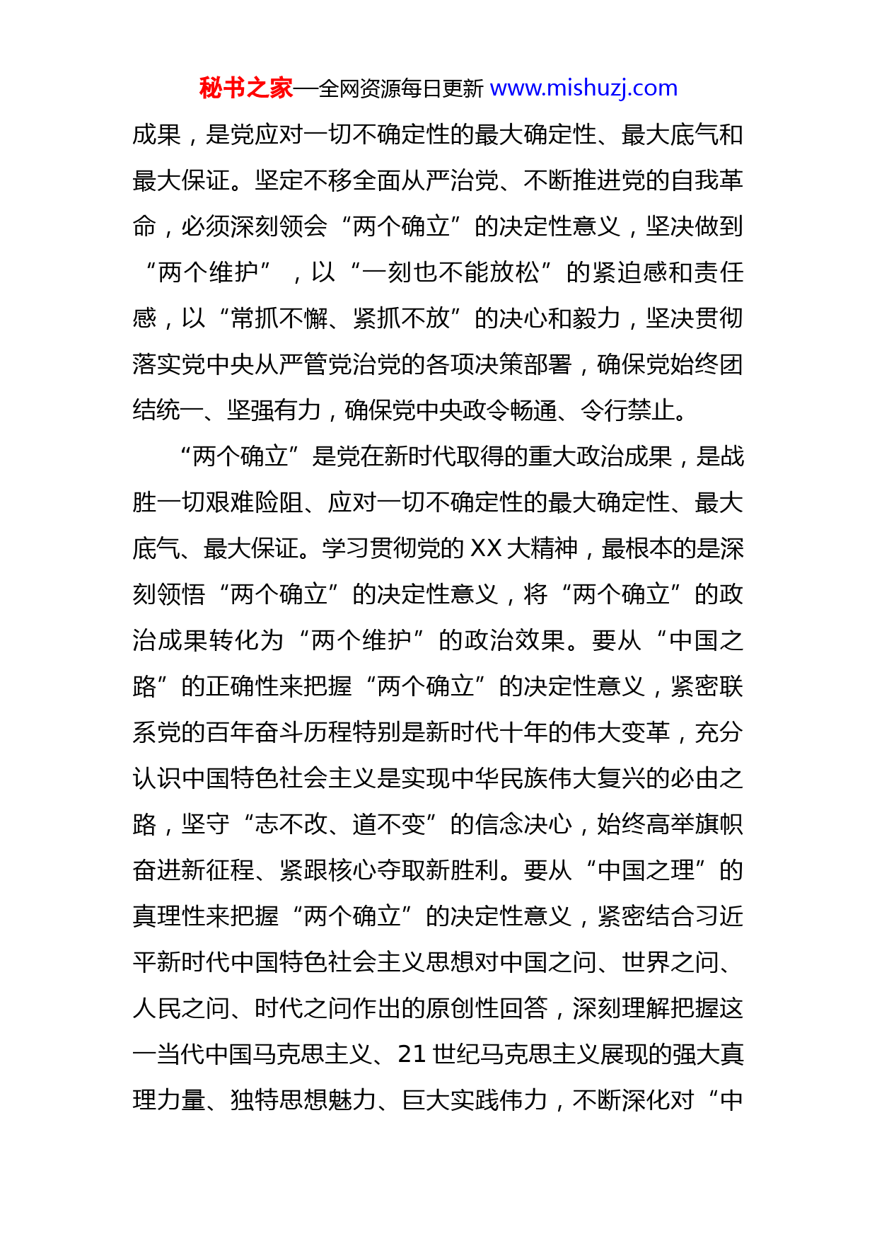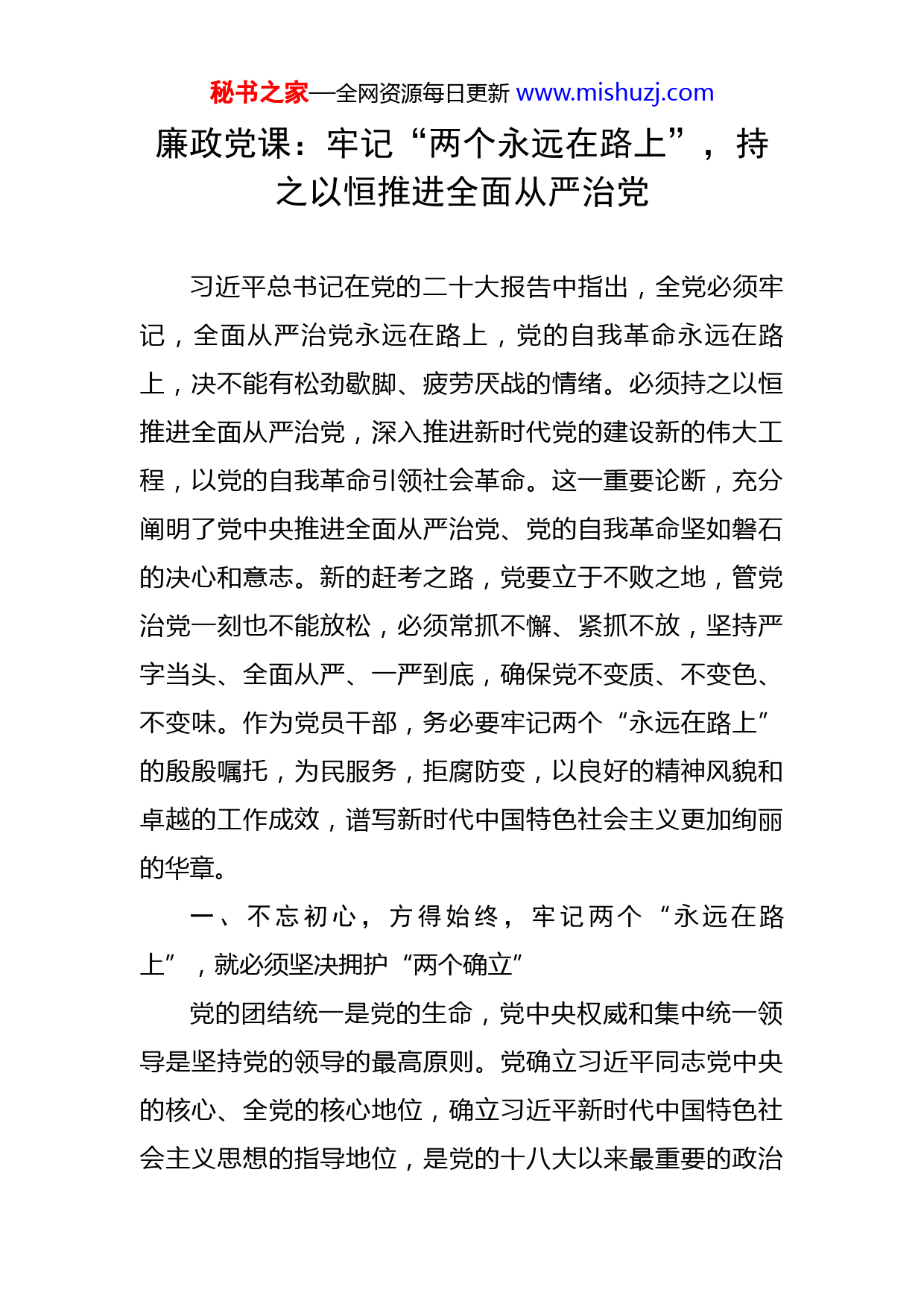秘书之家—全网资源每日更新www.mishuzj.com廉政党课:牢记“两个永远在路上”,持之以恒推进全面从严治党习近平总书记在党的二十大报告中指出,全党必须牢记,全面从严治党永远在路上,党的自我革命永远在路上,决不能有松劲歇脚、疲劳厌战的情绪。必须持之以恒推进全面从严治党,深入推进新时代党的建设新的伟大工程,以党的自我革命引领社会革命。这一重要论断,充分阐明了党中央推进全面从严治党、党的自我革命坚如磐石的决心和意志。新的赶考之路,党要立于不败之地,管党治党一刻也不能放松,必须常抓不懈、紧抓不放,坚持严字当头、全面从严、一严到底,确保党不变质、不变色、不变味。作为党员干部,务必要牢记两个“永远在路上”的殷殷嘱托,为民服务,拒腐防变,以良好的精神风貌和卓越的工作成效,谱写新时代中国特色社会主义更加绚丽的华章。一、不忘初心,方得始终,牢记两个“永远在路上”,就必须坚决拥护“两个确立”党的团结统一是党的生命,党中央权威和集中统一领导是坚持党的领导的最高原则。党确立习近平同志党中央的核心、全党的核心地位,确立习近平新时代中国特色社会主义思想的指导地位,是党的十八大以来最重要的政治秘书之家—全网资源每日更新www.mishuzj.com成果,是党应对一切不确定性的最大确定性、最大底气和最大保证。坚定不移全面从严治党、不断推进党的自我革命,必须深刻领会“两个确立”的决定性意义,坚决做到“两个维护”,以“一刻也不能放松”的紧迫感和责任感,以“常抓不懈、紧抓不放”的决心和毅力,坚决贯彻落实党中央从严管党治党的各项决策部署,确保党始终团结统一、坚强有力,确保党中央政令畅通、令行禁止。“两个确立”是党在新时代取得的重大政治成果,是战胜一切艰难险阻、应对一切不确定性的最大确定性、最大底气、最大保证。学习贯彻党的XX大精神,最根本的是深刻领悟“两个确立”的决定性意义,将“两个确立”的政治成果转化为“两个维护”的政治效果。要从“中国之路”的正确性来把握“两个确立”的决定性意义,紧密联系党的百年奋斗历程特别是新时代十年的伟大变革,充分认识中国特色社会主义是实现中华民族伟大复兴的必由之路,坚守“志不改、道不变”的信念决心,始终高举旗帜奋进新征程、紧跟核心夺取新胜利。要从“中国之理”的真理性来把握“两个确立”的决定性意义,紧密结合习近平新时代中国特色社会主义思想对中国之问、世界之问、人民之问、时代之问作出的原创性回答,深刻理解把握这一当代中国马克思主义、21世纪马克思主义展现的强大真理力量、独特思想魅力、巨大实践伟力,不断深化对“中秘书之家—全网资源每日更新www.mishuzj.com国共产党为什么能,中国特色社会主义为什么行,归根到底是马克思主义行,是中国化时代化的马克思主义行”的认识,以理论上的清醒促进政治上的坚定。要从“中国之治”的优越性来把握“两个确立”的决定性意义,结合“中国之治”和“西方之乱”的鲜明对比,深刻认识新时代伟大变革的取得根本在于习近平总书记掌舵领航、在于习近平新时代中国特色社会主义思想科学指引,切实将忠诚拥护“两个确立”、坚决做到“两个维护”作为最重要的政治规矩来遵循。二、廉洁奉公、勤政为民,牢记两个“永远在路上”,就必须坚持为民造福是最大政绩我们党一百多年来所付出的一切努力、进行的一切斗争、作出的一切牺牲,都是为了人民幸福和民族复兴。初心使命是激励一代代中国共产党人团结带领人民共同奋斗、书写中华民族历史上最恢宏史诗的根本动力。正是由于始终坚守这个初心和使命,我们党才能在极端困境中发展壮大,才能在濒临绝境中突出重围,才能在困顿逆境中毅然奋起。坚定不移全面从严治党、不断推进党的自我革命,必须把牢记初心使命作为永恒课题,对照初心使命不断检视和警醒自己,始终保持党同人民群众的血肉联系,始终同人民想在一起、干在一起,风雨同舟、同甘共苦,始终同人民群众同呼吸、共命运、心连心,赢得人民拥护秘书之家—全网资源每日更新www.mishuzj.com和支持。“业绩都是干出来的,真干才能真出业绩、出真业绩。”为官一任,造福一方,造福一方就是造福于人民,一件一件地解决群众的“操心事、烦心事、揪心事”。干部就要有担当,有多大担当才能干多大事业,尽多大责任才会有多大成就。意气风发、满腔热情地为民造福,才能不辱使命,不负重托。哪里有人民需要,哪里就能做出好事实事,哪里就能创造业绩。什么是好事实事,要从群众切身需要来考量,不能主观臆断,不能简单化、片面化。如果只有热情,而不讲究方式方法,难免好心办成坏事;如果不厘清什么是好事实事,只顾着蛮干,就无法干到群众的心坎上。为此,就要善于倾听群众呼声,与民意保持良性互动。习近平总书记曾强调:“政策好不好,要看乡亲们是哭还是笑。”同样的逻辑,业绩好不好,要看群众实际感受,由群众来评判。动真情,下真功,深入到群众中去;听民意,纳民智,与群众打成一片,才能解决好群众最关心最直接最现实的利益问题、最困难最忧虑最急迫的实际问题。我们要始终把党和人民放在心中最高位置,做一个一心为公、一身正气、一尘不染的人。我们要向优秀党员干部学习看齐,葆有