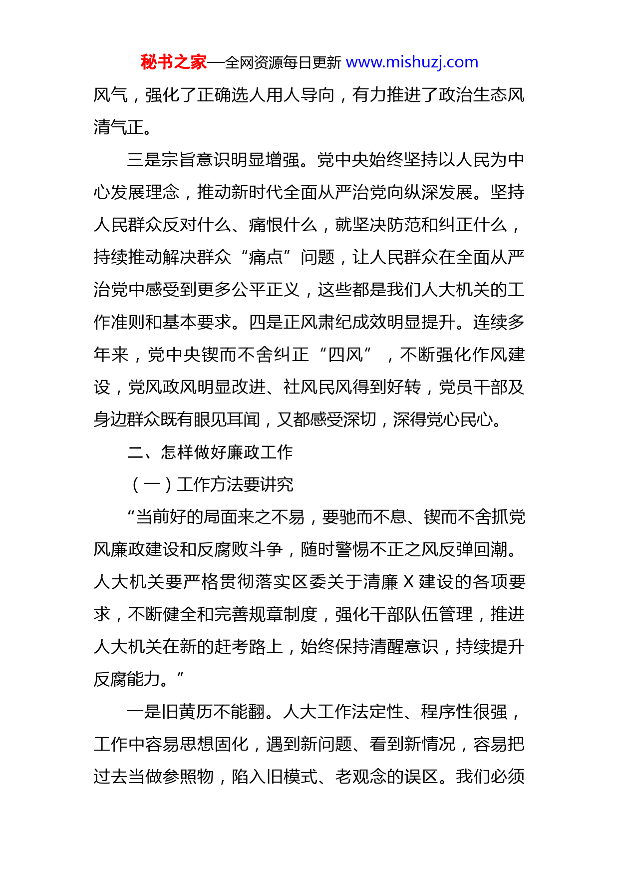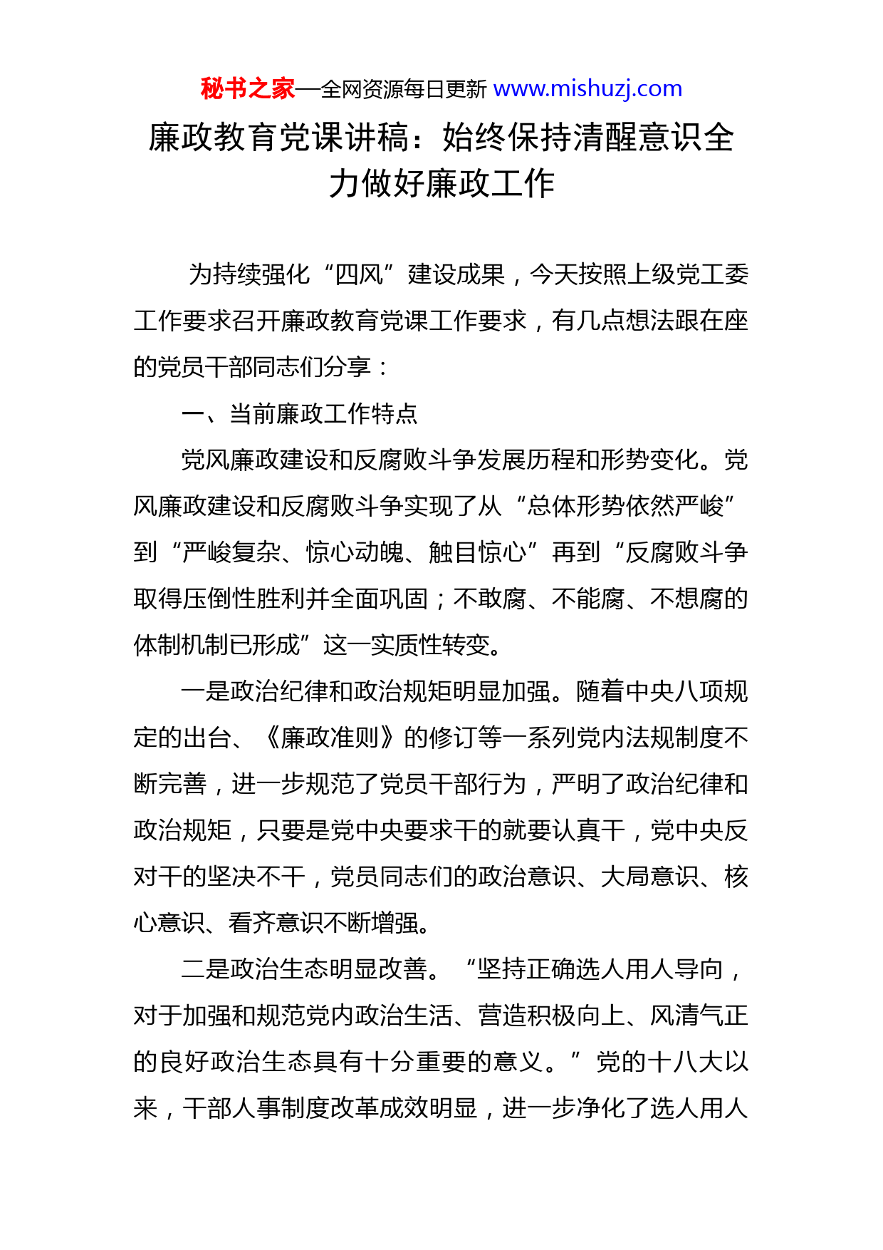 秘书之家—全网资源每日更新www.mishuzj.com廉政教育党课讲稿:始终保持清醒意识全力做好廉政工作为持续强化“四风”建设成果,今天按照上级党工委工作要求召开廉政教育党课工作要求,有几点想法跟在座的党员干部同志们分享:一、当前廉政工作特点党风廉政建设和反腐败斗争发展历程和形势变化。党风廉政建设和反腐败斗争实现了从“总体形势依然严峻”到“严峻复杂、惊心动魄、触目惊心”再到“反腐败斗争取得压倒性胜利并全面巩固;不敢腐、不能腐、不想腐的体制机制已形成”这一实质性转变。一是政治纪律和政治规矩明显加强。随着中央八项规定的出台、《廉政准则》的修订等一系列党内法规制度不断完善,进一步规范了党员干部行为,严明了政治纪律和政治规矩,只要是党中央要求干的就要认真干,党中央反对干的坚决不干,党员同志们的政治意识、大局意识、核心意识、看齐意识不断增强。二是政治生态明显改善。“坚持正确选人用人导向,对于加强和规范党内政治生活、营造积极向上、风清气正的良好政治生态具有十分重要的意义。”党的十八大以来,干部人事制度改革成效明显,进一步净化了选人用人秘书之家—全网资源每日更新www.mishuzj.com风气,强化了正确选人用人导向,有力推进了政治生态风清气正。三是宗旨意识明显增强。党中央始终坚持以人民为中心发展理念,推动新时代全面从严治党向纵深发展。坚持人民群众反对什么、痛恨什么,就坚决防范和纠正什么,持续推动解决群众“痛点”问题,让人民群众在全面从严治党中感受到更多公平正义,这些都是我们人大机关的工作准则和基本要求。四是正风肃纪成效明显提升。连续多年来,党中央锲而不舍纠正“四风”,不断强化作风建设,党风政风明显改进、社风民风得到好转,党员干部及身边群众既有眼见耳闻,又都感受深切,深得党心民心。二、怎样做好廉政工作(一)工作方法要讲究“当前好的局面来之不易,要驰而不息、锲而不舍抓党风廉政建设和反腐败斗争,随时警惕不正之风反弹回潮。人大机关要严格贯彻落实区委关于清廉X建设的各项要求,不断健全和完善规章制度,强化干部队伍管理,推进人大机关在新的赶考路上,始终保持清醒意识,持续提升反腐能力。”一是旧黄历不能翻。人大工作法定性、程序性很强,工作中容易思想固化,遇到新问题、看到新情况,容易把过去当做参照物,陷入旧模式、老观念的误区。我们必须秘书之家—全网资源每日更新www.mishuzj.com以发展的眼光看待新时代人大工作,把人大的政治属性摆在首位,始终把坚持党的领导、人民当家做主、依法治国有机结合起来,依法履职行权,打造让党委满意、群众满意的政治机关、国家权力机关、工作机关和代表机关。二是老办法不管用。工作中,有些同志习惯采取“复制+粘贴”等老办法对付工作,遇到新情况不愿花心思、不肯动脑筋,限制了视野,局限了思维,工作难以有突破有创新。区级人大工作主要涉及监督、重大事项决定、人事任免和代表工作,要针对新特征、新变化、新思潮不断探索创新专题询问、执法检查等方式方法,进一步提升人大监督工作成效;要加大代表工作力度,紧密结合XX实际,创新工作载体,创新服务模式,打造形象品牌,进一步扩大X人大代表工作特色亮点和影响力。三是坏毛病不能惯。纪律关乎作风,规矩影响形象。作为人大机关党员干部更应该以高标准严格要求自己,要筑牢“严管才是厚爱,依规才能平安,未亡羊就要补牢”的思想意识、行动意识,坚决摒弃“按部就班、安于现状、做事拖拉”等坏毛病,时刻紧绷纪律这根弦,紧紧围绕全区发展大局、工作重点,强化服务路径和措施,认真落实各项工作制度,做好本职工作的同时,完成好服务企业、下沉社区等各项任务,以实际行动推进现代化X绿水红钢城建设。秘书之家—全网资源每日更新www.mishuzj.com(二)工作作风有态度一是政治上有姿态。人大机关作为政治机关,必须在政治上有姿态。政治态度上,要旗帜鲜明讲政治,与党中央保持高度一致;政治立场上,要不断增强“四个意识”,坚定“四个自信”,坚决捍卫“两个确立”,以实际行动深刻践行“两个维护”,切实站稳政治立场;政治自觉上,不能说一套做一套,要从思想根源、灵魂深处加强修养,勇于自我革命,自觉践行以人民为中心的理念,自觉发挥好“四个机关”作用。二是工作上在状态。工作上要有敬业意识和职业精神。人大各专工委在工作选题时,要找准切入点,把握针对性,力求解决实际问题;在推动落实时,把情况摸准摸透,把调研做深做实,把建议提准提好,做到谋划一项工作就盯紧一件事情,干一件事情就成一件事情,让每项工作做成、做好、做出高质量,真正为X实现转型发展贡献人大力量。三是生活上有好心态。我们机关党员干部能在一起工作学习十分难得,要摆正心态,加强合作,共同进步。机关工作生活,要有一个好的奉献精神,干部成长总要经历风风雨雨,经过很多岗位历练,党员干部要正确对待进退留转、个人升迁;要有一个好的团队意识,以一颗成全他人的心态,营造良好工作氛围;要有一个好的价值取向,秘书之家—全网资源每日更新www.mishuzj.com约束自我行为,做到与人为善,阳光向上,时刻保持一颗朝气蓬勃的精气神,共同塑造积极乐观、向上向善的人大机关形象。全体党员干部