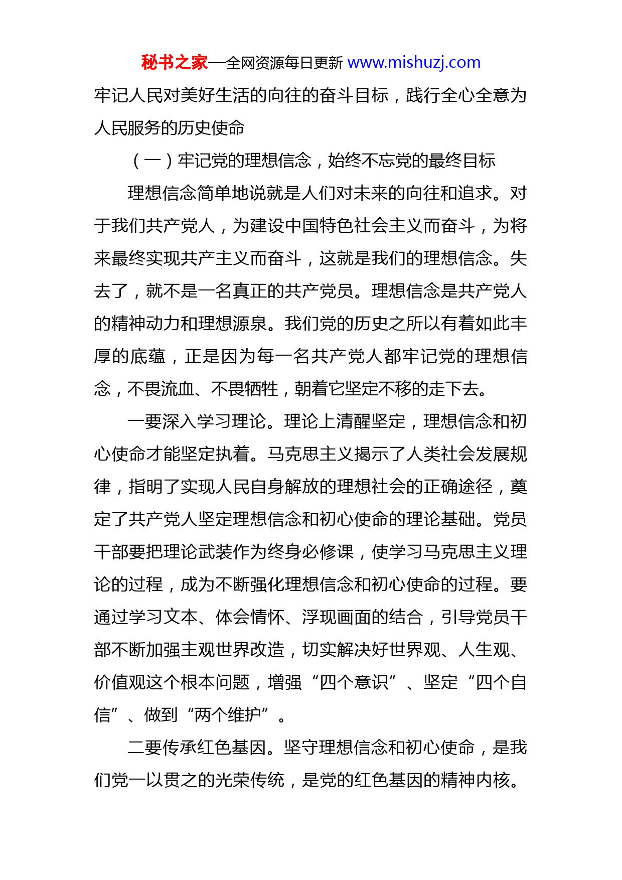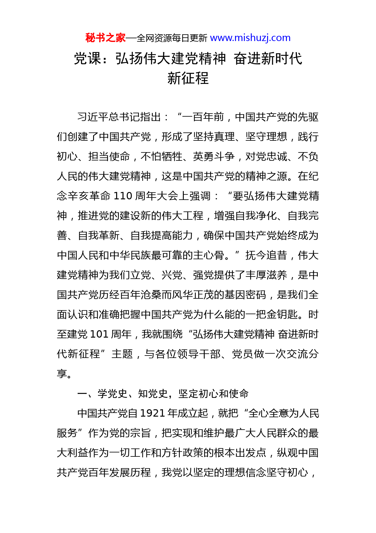 秘书之家—全网资源每日更新www.mishuzj.com党课:弘扬伟大建党精神奋进新时代新征程习近平总书记指出:“一百年前,中国共产党的先驱们创建了中国共产党,形成了坚持真理、坚守理想,践行初心、担当使命,不怕牺牲、英勇斗争,对党忠诚、不负人民的伟大建党精神,这是中国共产党的精神之源。在纪念辛亥革命110周年大会上强调:“要弘扬伟大建党精神,推进党的建设新的伟大工程,增强自我净化、自我完善、自我革新、自我提高能力,确保中国共产党始终成为中国人民和中华民族最可靠的主心骨。”抚今追昔,伟大建党精神为我们立党、兴党、强党提供了丰厚滋养,是中国共产党历经百年沧桑而风华正茂的基因密码,是我们全面认识和准确把握中国共产党为什么能的一把金钥匙。时至建党101周年,我就围绕“弘扬伟大建党精神奋进新时代新征程”主题,与各位领导干部、党员做一次交流分享。一、学党史、知党史,坚定初心和使命中国共产党自1921年成立起,就把“全心全意为人民服务”作为党的宗旨,把实现和维护最广大人民群众的最大利益作为一切工作和方针政策的根本出发点,纵观中国共产党百年发展历程,我党以坚定的理想信念坚守初心,秘书之家—全网资源每日更新www.mishuzj.com牢记人民对美好生活的向往的奋斗目标,践行全心全意为人民服务的历史使命(一)牢记党的理想信念,始终不忘党的最终目标理想信念简单地说就是人们对未来的向往和追求。对于我们共产党人,为建设中国特色社会主义而奋斗,为将来最终实现共产主义而奋斗,这就是我们的理想信念。失去了,就不是一名真正的共产党员。理想信念是共产党人的精神动力和理想源泉。我们党的历史之所以有着如此丰厚的底蕴,正是因为每一名共产党人都牢记党的理想信念,不畏流血、不畏牺牲,朝着它坚定不移的走下去。一要深入学习理论。理论上清醒坚定,理想信念和初心使命才能坚定执着。马克思主义揭示了人类社会发展规律,指明了实现人民自身解放的理想社会的正确途径,奠定了共产党人坚定理想信念和初心使命的理论基础。党员干部要把理论武装作为终身必修课,使学习马克思主义理论的过程,成为不断强化理想信念和初心使命的过程。要通过学习文本、体会情怀、浮现画面的结合,引导党员干部不断加强主观世界改造,切实解决好世界观、人生观、价值观这个根本问题,增强“四个意识”、坚定“四个自信”、做到“两个维护”。二要传承红色基因。坚守理想信念和初心使命,是我们党一以贯之的光荣传统,是党的红色基因的精神内核。秘书之家—全网资源每日更新www.mishuzj.com光荣传统不能丢、丢了就丢了魂,红色基因不能变、变了就会变质变色变味。党的历史上红色资源灿若繁星,每一个历史事件、每一位革命英雄、每一件革命文物、每一种革命精神,都是进行红色教育的鲜活教科书。要深化拓展党史学习教育,注重从党的光辉历程、重大成就、历史经验中,深入挖掘红色教育资源,通过讲党课、看展览、听报告、红色体验、仪式教育等方式和新媒体手段,讲好党的故事、革命的故事、英烈的故事,引导党员干部读出贯穿其中的“理”、“信”、“德”、“行”,加深对中国共产党为什么能、马克思主义为什么行、中国特色社会主义为什么好的认识。三要竭诚为职工服务。全心全意为人民服务是党的根本宗旨,也是党员干部践行理想信念、初心使命的根本出发点和落脚点。共产党人讲理想信念和初心使命,从来不是搞自我“体内循环”,而是要走到人民中、落到为民服务上,通过具体的工作实践和成效,让群众看得见、摸得着、感受得到。要践行以人民为中心的发展思想,认真解决职工群众急难愁盼问题,增强群众的获得感、幸福感、安全感。(二)牢记党的历史经验,始终不忘党的重要法宝历史是一本严肃的教科书,中国共产党百年历史正是一部描述中华民族走出劫难、挺起脊梁的鲜活教材。党史秘书之家—全网资源每日更新www.mishuzj.com记录着新中国从无到有、从小到大、从弱到强、从一个胜利走向另一个胜利。中国共产党带领人民创造了一个又一个辉煌、一个又一个奇迹,这其中的经验和智慧无不凝结于党的历史。学习中国共产党百年历史,可以接受中国共产党最先进的思想、最伟大的理想和最崇高的事业洗礼;可以在百年历史中寻找党的工作法宝。一要“求真”。毛泽东同志曾说过这样一句名言,“世界上怕就怕‘认真’二字,共产党就最讲认真。”实践证明,如果缺乏了认真精神,党的执政潜力就会削弱,什么事情也办不成。党的百年历史本身就是一本求真务实的教科书。“不懂历史的人没有根,淡忘历史的民族没有魂”。学习党史,必须要做到真学、真懂、真信、真用。切忌蜻蜓点水、浅尝辄止,满足于一知半解、断章取义,缺乏系统的、辩证的学习、运用潜力,要认真、系统的学习,全面、正确地把握党的历史发展的主题和主线、主流和本质。二要“求深”。历史穿越时光的隧道,它传递出的情感价值,温润着一代又一代;它传达出的信仰力量,激励着一辈又一辈。学党史,知党史,需要深入学习、深入思考、深入应用。要由许多“小细节”里品出“大关节”来。要潜心读书、用心体会,全面系统的学习党的历史,防止“三天打鱼两天晒网”,杜绝想起来读一点,忙起来秘