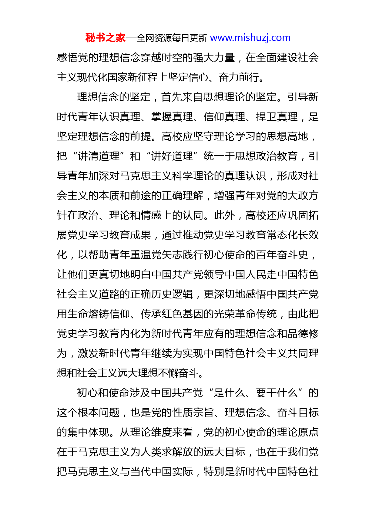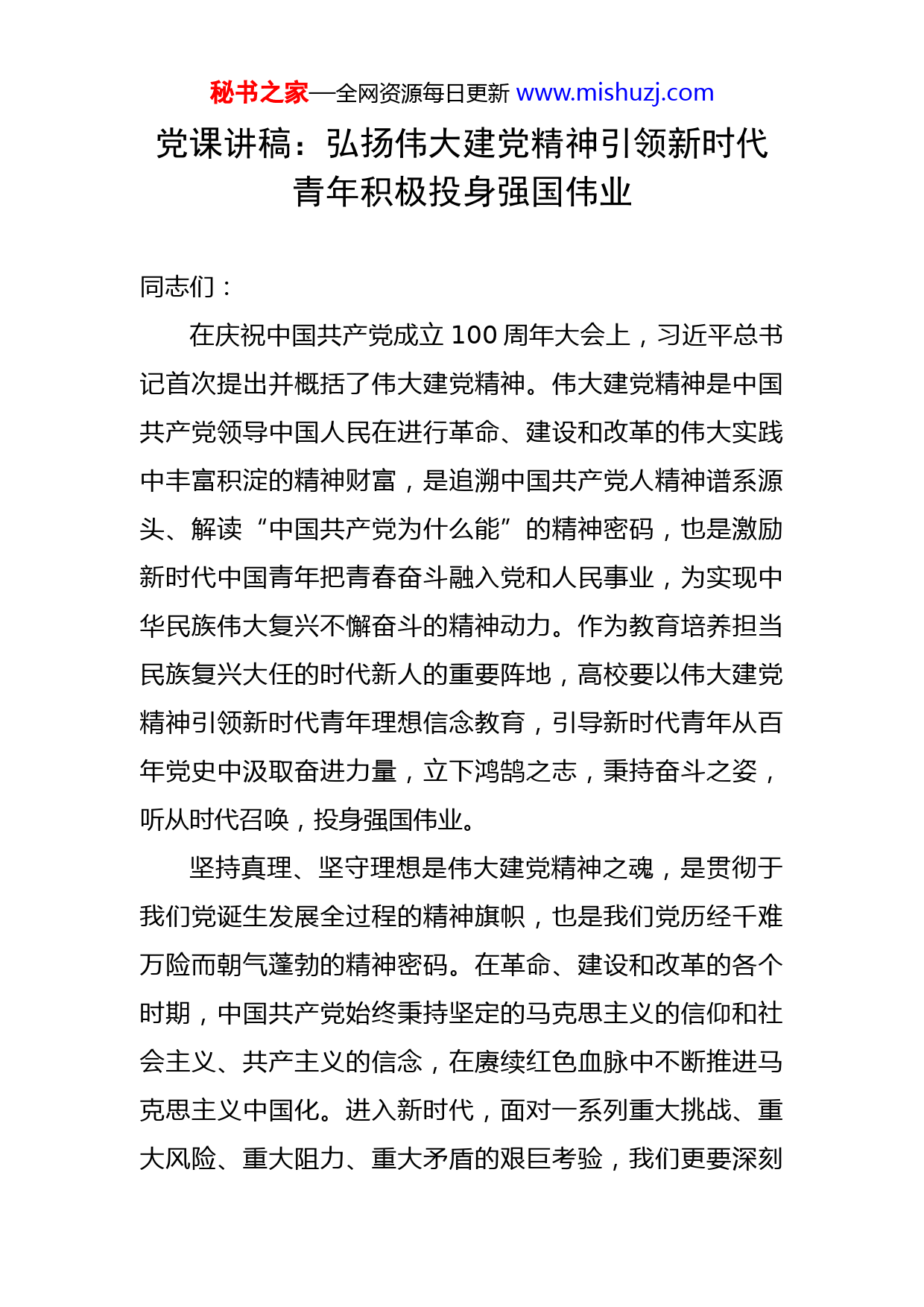 秘书之家—全网资源每日更新www.mishuzj.com党课讲稿:弘扬伟大建党精神引领新时代青年积极投身强国伟业同志们:在庆祝中国共产党成立100周年大会上,习近平总书记首次提出并概括了伟大建党精神。伟大建党精神是中国共产党领导中国人民在进行革命、建设和改革的伟大实践中丰富积淀的精神财富,是追溯中国共产党人精神谱系源头、解读“中国共产党为什么能”的精神密码,也是激励新时代中国青年把青春奋斗融入党和人民事业,为实现中华民族伟大复兴不懈奋斗的精神动力。作为教育培养担当民族复兴大任的时代新人的重要阵地,高校要以伟大建党精神引领新时代青年理想信念教育,引导新时代青年从百年党史中汲取奋进力量,立下鸿鹄之志,秉持奋斗之姿,听从时代召唤,投身强国伟业。坚持真理、坚守理想是伟大建党精神之魂,是贯彻于我们党诞生发展全过程的精神旗帜,也是我们党历经千难万险而朝气蓬勃的精神密码。在革命、建设和改革的各个时期,中国共产党始终秉持坚定的马克思主义的信仰和社会主义、共产主义的信念,在赓续红色血脉中不断推进马克思主义中国化。进入新时代,面对一系列重大挑战、重大风险、重大阻力、重大矛盾的艰巨考验,我们更要深刻秘书之家—全网资源每日更新www.mishuzj.com感悟党的理想信念穿越时空的强大力量,在全面建设社会主义现代化国家新征程上坚定信心、奋力前行。理想信念的坚定,首先来自思想理论的坚定。引导新时代青年认识真理、掌握真理、信仰真理、捍卫真理,是坚定理想信念的前提。高校应坚守理论学习的思想高地,把“讲清道理”和“讲好道理”统一于思想政治教育,引导青年加深对马克思主义科学理论的真理认识,形成对社会主义的本质和前途的正确理解,增强青年对党的大政方针在政治、理论和情感上的认同。此外,高校还应巩固拓展党史学习教育成果,通过推动党史学习教育常态化长效化,以帮助青年重温党矢志践行初心使命的百年奋斗史,让他们更真切地明白中国共产党领导中国人民走中国特色社会主义道路的正确历史逻辑,更深切地感悟中国共产党用生命熔铸信仰、传承红色基因的光荣革命传统,由此把党史学习教育内化为新时代青年应有的理想信念和品德修为,激发新时代青年继续为实现中国特色社会主义共同理想和社会主义远大理想不懈奋斗。初心和使命涉及中国共产党“是什么、要干什么”的这个根本问题,也是党的性质宗旨、理想信念、奋斗目标的集中体现。从理论维度来看,党的初心使命的理论原点在于马克思主义为人类求解放的远大目标,也在于我们党把马克思主义与当代中国实际,特别是新时代中国特色社秘书之家—全网资源每日更新www.mishuzj.com会主义伟大实践结合起来,不断推进全部理论创新的根本主旨。从历史维度来看,初心使命是革命年代中国共产党救亡图存的责任担当,是建设发展时期中国共产党知行合一的动力源泉,也是新时代中国共产党践行以人民为中心的价值追求。青年正处在人生成长的“拔节孕穗期”,引导青年把课堂的“有字”之书与社会实践的“无字”之书融会贯通,帮助他们在学思践悟中自觉树立正确的党史观、国家观和价值观,具有重要意义。高校应当在思想政治教育中始终贯穿“不忘初心、牢记使命”主题教育,一方面组织青年有效地开展政治理论学习,把爱国情感、社会责任、理想信念、职业道德等内容融入到课堂教学和专业学习中,让青年在学习过程中潜移默化地接受思想洗礼和情感陶冶,更好地实现自身思想素质和政治水平的不断提高。另一方面,高校也应当注重“第二课堂”的延伸和拓展,深化对青年的基本国情教育,通过“知行合一”的学习实践,引导青年了解当前国家发展取得的成就和面临的问题,以成就鼓舞青年、以问题激励青年,帮助青年辩证地把握新时代社会主要矛盾的“变”与“不变”,把专业学习和国家建设需要相结合,增强青年大有可为的自信心和责任感,坚定青年为实现中华民族伟大复兴奉献青春的理想信念。秘书之家—全网资源每日更新www.mishuzj.com不怕牺牲、英勇斗争,是中国共产党人意志顽强、作风优良的政治品格,也是中国共产党人在应对各种困难挑战中锤炼出的精神风骨。我们党在斗争中诞生、在斗争中发展、在斗争中壮大,历经沧桑而风华正茂,饱经磨难而生生不息,靠的就是这种精神意志。党的十九届六中全会把“坚持敢于斗争”概括为党百年奋斗的十条历史经验之一。新时代新征程上,只有坚持敢于斗争、,发扬斗争精神、,增强斗争本领,才能战胜前进道路上一切可以预见和难以预见的风险挑战,依靠斗争赢得未来。“实现伟大梦想,必须进行伟大斗争”。当前我国面临的风险和挑战、阻力和矛盾,一点也不比以往任何时期少。面对国外“抹黑”“歪曲”“甩锅”等充满对中国立场和中国原则仇视和挑衅的荒谬言论和偏激行为,面对国内来自经济、政治、文化、社会、生态等各领域新旧矛盾盘根错节的复杂问题和改革形势,高校必须肩负起立德树人、铸魂育人的时代重责,通过发挥课程育人、文化育人、网络育人、实践育人等多重方式的协同作用,帮助青年坚定斗争意识和斗争意志,淬炼斗争精神和斗争本领。高校应特别注重新媒体技术的运用和榜样引领的示范作用。一方面拓展新媒