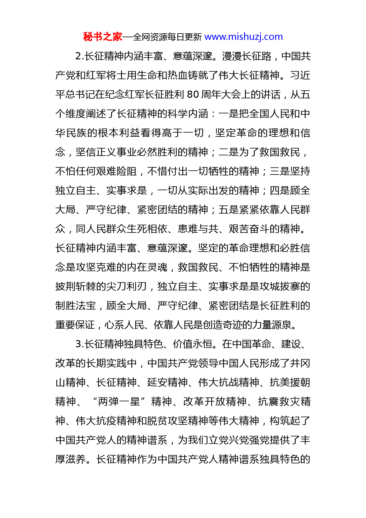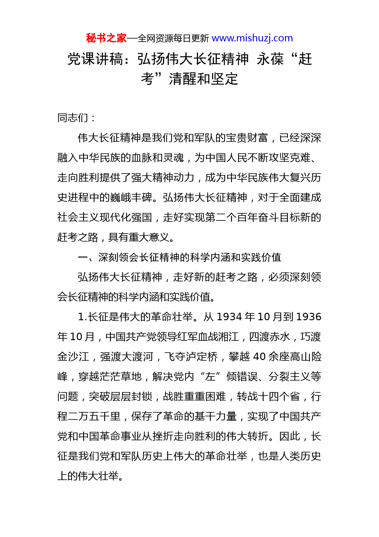 秘书之家—全网资源每日更新www.mishuzj.com党课讲稿:弘扬伟大长征精神永葆“赶考”清醒和坚定同志们:伟大长征精神是我们党和军队的宝贵财富,已经深深融入中华民族的血脉和灵魂,为中国人民不断攻坚克难、走向胜利提供了强大精神动力,成为中华民族伟大复兴历史进程中的巍峨丰碑。弘扬伟大长征精神,对于全面建成社会主义现代化强国,走好实现第二个百年奋斗目标新的赶考之路,具有重大意义。一、深刻领会长征精神的科学内涵和实践价值弘扬伟大长征精神,走好新的赶考之路,必须深刻领会长征精神的科学内涵和实践价值。1.长征是伟大的革命壮举。从1934年10月到1936年10月,中国共产党领导红军血战湘江,四渡赤水,巧渡金沙江,强渡大渡河,飞夺泸定桥,攀越40余座高山险峰,穿越茫茫草地,解决党内“左”倾错误、分裂主义等问题,突破层层封锁,战胜重重困难,转战十四个省,行程二万五千里,保存了革命的基干力量,实现了中国共产党和中国革命事业从挫折走向胜利的伟大转折。因此,长征是我们党和军队历史上伟大的革命壮举,也是人类历史上的伟大壮举。秘书之家—全网资源每日更新www.mishuzj.com2.长征精神内涵丰富、意蕴深邃。漫漫长征路,中国共产党和红军将士用生命和热血铸就了伟大长征精神。习近平总书记在纪念红军长征胜利80周年大会上的讲话,从五个维度阐述了长征精神的科学内涵:一是把全国人民和中华民族的根本利益看得高于一切,坚定革命的理想和信念,坚信正义事业必然胜利的精神;二是为了救国救民,不怕任何艰难险阻,不惜付出一切牺牲的精神;三是坚持独立自主、实事求是,一切从实际出发的精神;四是顾全大局、严守纪律、紧密团结的精神;五是紧紧依靠人民群众,同人民群众生死相依、患难与共、艰苦奋斗的精神。长征精神内涵丰富、意蕴深邃。坚定的革命理想和必胜信念是攻坚克难的内在灵魂,救国救民、不怕牺牲的精神是披荆斩棘的尖刀利刃,独立自主、实事求是是攻城拔寨的制胜法宝,顾全大局、严守纪律、紧密团结是长征胜利的重要保证,心系人民、依靠人民是创造奇迹的力量源泉。3.长征精神独具特色、价值永恒。在中国革命、建设、改革的长期实践中,中国共产党领导中国人民形成了井冈山精神、长征精神、延安精神、伟大抗战精神、抗美援朝精神、“两弹一星”精神、改革开放精神、抗震救灾精神、伟大抗疫精神和脱贫攻坚精神等伟大精神,构筑起了中国共产党人的精神谱系,为我们立党兴党强党提供了丰厚滋养。长征精神作为中国共产党人精神谱系独具特色的秘书之家—全网资源每日更新www.mishuzj.com重要组成部分,不仅是在极其艰苦环境下坚持真理、坚守理想、攻坚克难、不怕牺牲的精神,而且是在逆境挫折中敢于斗争、勇于斗争、敢于胜利的伟大精神。长征已成为历史,但长征精神跨越时空、历久弥新,具有永恒价值,成为实现中华民族伟大复兴的强大精神动力。二、以长征精神领航走好新的赶考之路历史川流不息,精神代代相传。全面建成社会主义现代化强国,实现第二个百年奋斗目标,必须大力弘扬伟大长征精神,发扬革命优良传统,赓续红色血脉,传承红色基因,从长征精神中汲取丰富滋养和前进动力,走好新的赶考之路。1.更加坚定理想信念。革命理想高于天。理想信念是中国共产党人的精神支柱和政治灵魂。长征途中,红军将士视死如归、向死而生、一往无前,靠的是坚定的理想信念和坚强的革命意志。今天,面对实现第二个百年奋斗目标,需要以长征精神引领推动全党更加坚定理想信念,用党的创新理论凝神铸魂,坚持以马克思列宁主义、毛泽东思想、邓小平理论、“三个代表”重要思想、科学发展观、习近平新时代中国特色社会主义思想武装头脑,教育引导党员干部坚定马克思主义信仰,坚定共产主义远大理想和中国特色社会主义共同理想,以坚定的理想信念补足精神之“钙”、铸牢信仰之基,增强“四个意识”,坚定秘书之家—全网资源每日更新www.mishuzj.com“四个自信”,做到“两个维护”。2.应对各种风险挑战。习近平总书记在庆祝中国共产党成立100周年大会上的讲话中代表党和人民庄严宣告,“我们实现了第一个百年奋斗目标”,“现在,中国共产党团结带领中国人民又踏上了实现第二个百年奋斗目标新的赶考之路”。全面建成社会主义现代化强国是一项伟大事业,具有开创性、艰巨性、复杂性,绝对不是轻轻松松、敲锣打鼓就能实现的。新的赶考之路上,我们将面临越来越复杂的风险挑战,还要跨越许多“雪山”“草地”,进行具有许多新的历史特点的伟大斗争,攻克前进道路上的“娄山关”“腊子口”。因此,弘扬伟大长征精神,准确把握我国社会主要矛盾变化带来的新要求,深刻认识国内外环境带来的新矛盾新挑战,敢于斗争、善于斗争,逢山开道、遇水架桥,勇于战胜一切风险挑战,不断夺取伟大斗争的新胜利。3.坚定不移走自己的路。长征胜利表明,坚持把马克思主义基本原理同中国革命具体实际相结合,一切从实际出发,独立自主地探索中国革命道路,坚定不移走自己的路,是革命事业胜利的法宝。习近平总书记指出:“走自己的路,是党的全部理论和实践立足点,更是党百年奋斗得出的历史结论。”坚持和发展中国特色社会主义,必须保持政治定力,立足中国国情,坚定不移走中国式