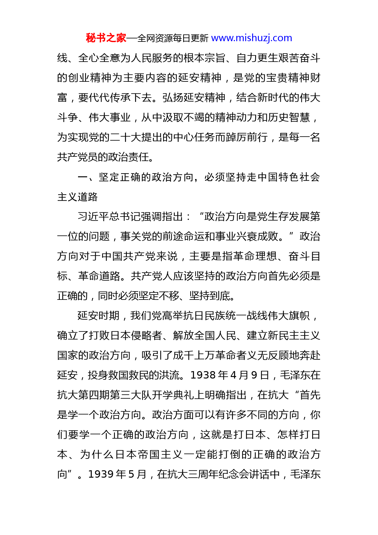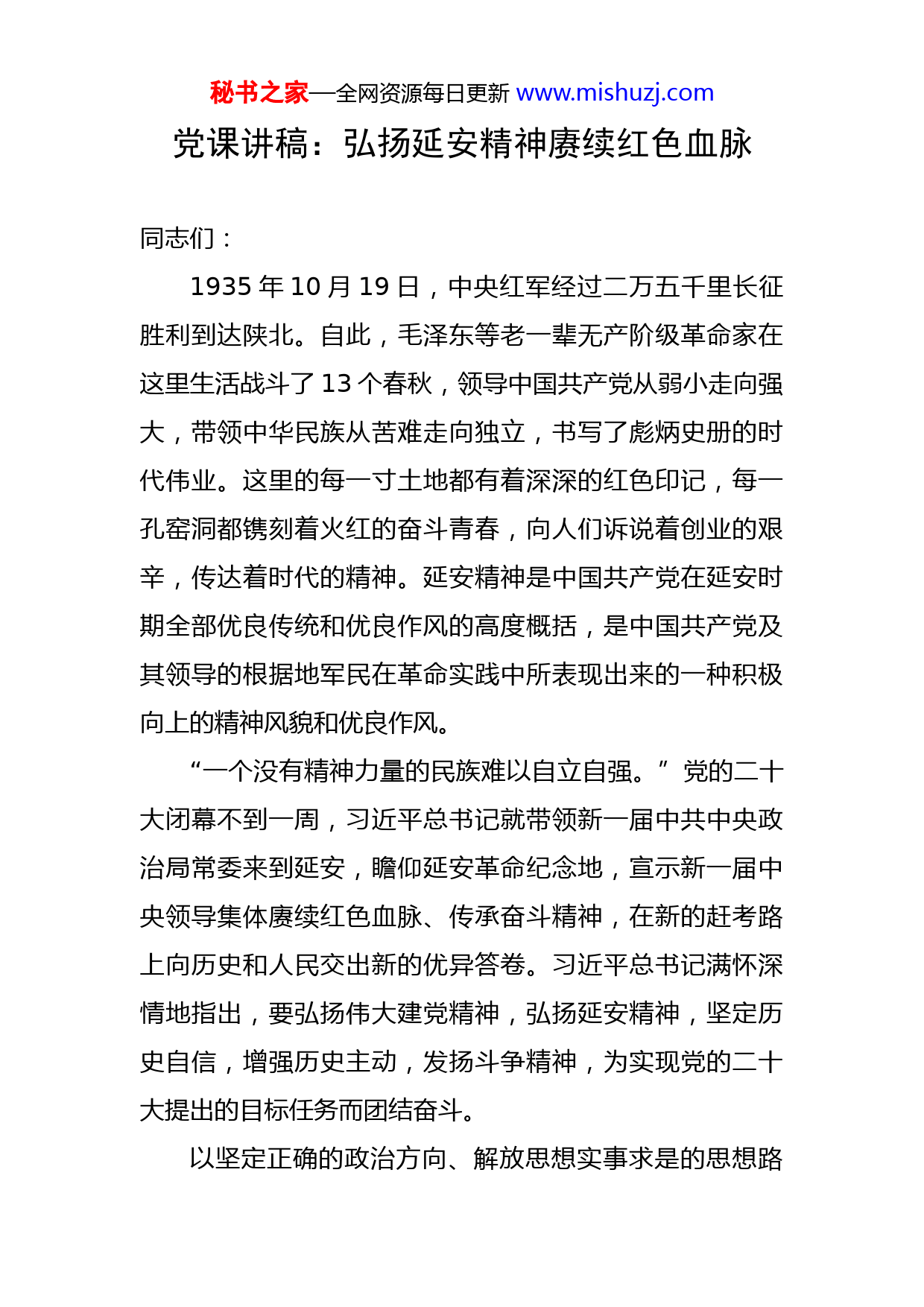 秘书之家—全网资源每日更新www.mishuzj.com党课讲稿:弘扬延安精神赓续红色血脉同志们:1935年10月19日,中央红军经过二万五千里长征胜利到达陕北。自此,毛泽东等老一辈无产阶级革命家在这里生活战斗了13个春秋,领导中国共产党从弱小走向强大,带领中华民族从苦难走向独立,书写了彪炳史册的时代伟业。这里的每一寸土地都有着深深的红色印记,每一孔窑洞都镌刻着火红的奋斗青春,向人们诉说着创业的艰辛,传达着时代的精神。延安精神是中国共产党在延安时期全部优良传统和优良作风的高度概括,是中国共产党及其领导的根据地军民在革命实践中所表现出来的一种积极向上的精神风貌和优良作风。“一个没有精神力量的民族难以自立自强。”党的二十大闭幕不到一周,习近平总书记就带领新一届中共中央政治局常委来到延安,瞻仰延安革命纪念地,宣示新一届中央领导集体赓续红色血脉、传承奋斗精神,在新的赶考路上向历史和人民交出新的优异答卷。习近平总书记满怀深情地指出,要弘扬伟大建党精神,弘扬延安精神,坚定历史自信,增强历史主动,发扬斗争精神,为实现党的二十大提出的目标任务而团结奋斗。以坚定正确的政治方向、解放思想实事求是的思想路秘书之家—全网资源每日更新www.mishuzj.com线、全心全意为人民服务的根本宗旨、自力更生艰苦奋斗的创业精神为主要内容的延安精神,是党的宝贵精神财富,要代代传承下去。弘扬延安精神,结合新时代的伟大斗争、伟大事业,从中汲取不竭的精神动力和历史智慧,为实现党的二十大提出的中心任务而踔厉前行,是每一名共产党员的政治责任。一、坚定正确的政治方向,必须坚持走中国特色社会主义道路习近平总书记强调指出:“政治方向是党生存发展第一位的问题,事关党的前途命运和事业兴衰成败。”政治方向对于中国共产党来说,主要是指革命理想、奋斗目标、革命道路。共产党人应该坚持的政治方向首先必须是正确的,同时必须坚定不移、坚持到底。延安时期,我们党高举抗日民族统一战线伟大旗帜,确立了打败日本侵略者、解放全国人民、建立新民主主义国家的政治方向,吸引了成千上万革命者义无反顾地奔赴延安,投身救国救民的洪流。1938年4月9日,毛泽东在抗大第四期第三大队开学典礼上明确指出,在抗大“首先是学一个政治方向。政治方面可以有许多不同的方向,你们要学一个正确的政治方向,这就是打日本、怎样打日本、为什么日本帝国主义一定能打倒的正确的政治方向”。1939年5月,在抗大三周年纪念会讲话中,毛泽东秘书之家—全网资源每日更新www.mishuzj.com全面论述了抗大的教育方针,即“坚定正确的政治方向,艰苦奋斗的工作作风,灵活机动的战略战术”。在此,“坚定正确的政治方向”是抗大教育的第一条方针。坚定正确的政治方向,必须补好精神上的“钙”。毛泽东曾说:“《共产党宣言》我看了不下一百遍,遇到问题我就翻阅马克思的《共产党宣言》。”习近平总书记多次借用“革命理想高于天”的名言,教育全党同志要坚定理想信念,因为共产党员“有了坚定的理想信念,站位就高了,眼界就宽了,心胸就开阔了”,就能在纷繁复杂的国际、国内形势中“不畏浮云遮望眼”,面对各种风浪考验“我自岿然不动”,始终坚持正确的政治方向。坚定理想信念,就是要学习延安时期老一辈革命家那种“做到老,学到老,革命到老”的精神,从每时每刻做起,“吾日三省吾身”;从点滴小事做起,“勿以善小而不为,勿以恶小而为之”,慎独慎微慎初;从一言一行做起,如切如磋、如琢如磨,日积月累,久久为功。坚定正确的政治方向,必须坚持走中国特色社会主义道路。习近平总书记强调:“无论搞革命、搞建设、搞改革,道路问题都是最根本的问题。”踏上实现第二个百年奋斗目标的新征程,中国共产党必须在习近平新时代中国特色社会主义思想的指引下,带领全国各族人民走中国式现代化道路,夺取新时代中国特色社会主义的伟大新胜秘书之家—全网资源每日更新www.mishuzj.com利。全党同志要更加自觉地增强道路自信、理论自信、制度自信、文化自信,既不走封闭僵化的老路,也不走改旗易帜的邪路,坚决贯彻党的基本理论、基本路线、基本方略,坚决落实党中央决策部署,保持政治定力,不断提高政治判断力、政治领悟力、政治执行力,始终做到胸怀“国之大者”,坚持实干兴邦,把老一辈革命家开创的伟大事业继续推向前进。坚持解放思想、实事求是的二、思想路线,必须坚持真理、修正错误我们党是靠实事求是起家的,也是靠实事求是走向胜利和创造辉煌的。习近平总书记指出:“解放思想,实事求是,凝结着辩证唯物主义和历史唯物主义的世界观、方法论。”1941年5月19日,毛泽东在延安干部会议上作《改造我们的学习》报告,对实事求是作出了经典阐述:“实事”就是客观存在着的一切事物,“是”就是客观事物的内部联系,即规律性,“求”就是我们去研究。回顾我们党走过的百年历程,我们清楚地看到,什么时候坚持实事求是,党就能形成符合客观实际、体现发展规律、顺应人民意愿的正确路线方针政策,党和人民事业就能不断取得胜利;反之,党和人民事业就会受到损失甚至遭受严重挫折。延安时期,我们党在总结大革命、土地革命战争时期历史经验和深刻教训的基础上,逐步摆脱了把