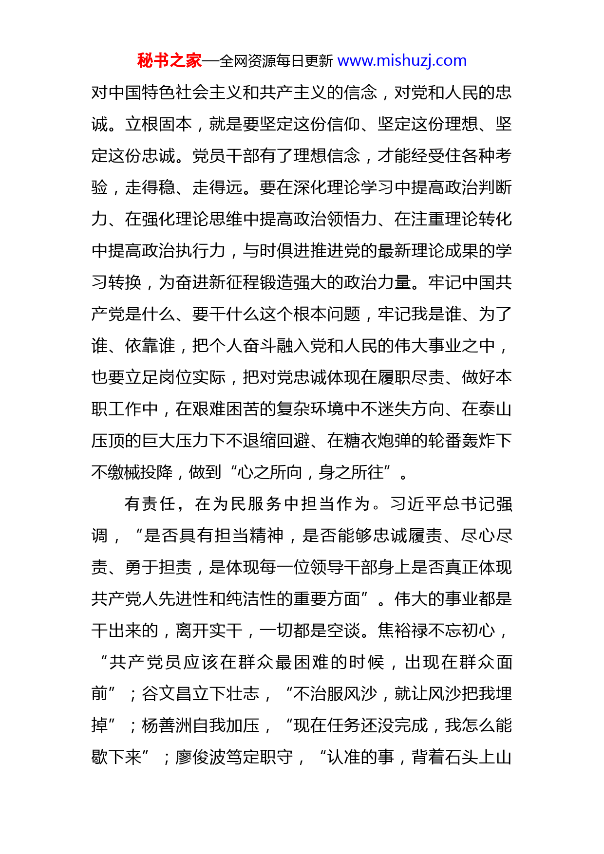 秘书之家—全网资源每日更新www.mishuzj.com微党课讲稿:争做新时代的“三有”年轻干部习近平总书记在庆祝中国共产主义青年团成立100周年大会上强调,年轻干部要“不断锤炼意志力、坚忍力、自制力,做一个一心为公、一身正气、一尘不染的人”。总书记这一重要论述饱含深情,充满期待,是年轻干部健康成长的方向引领和根本遵循。广大年轻干部要从谆谆教诲中汲取奋进力量,立足“两个大局”,心怀“国之大者”,时刻牢记新时代赋予我们的历史责任,把为民服务、对党忠诚、实干担当践行到日常工作中,体现在细枝末节处。有信仰,用对党忠诚诠释理想信念坚定。理想信念是共产党人精神上的“钙”,没有理想信念,精神上就会“缺钙”,就会得“软骨病”。历史和实践反复证明,一个政党有了远大理想和崇高追求,就会坚强有力,无坚不摧,无往不胜,就能经受一次次挫折而又一次次奋起;一名干部有了坚定的理想信念,站位就高了,心胸就开阔了,就能坚持正确政治方向,做到“风雨不动安如山”。习近平总书记多次强调要立根固本,并多次引用“万物的其本者生,百事得其道者成”、“本根不摇,则枝叶茂荣”的古语。共产党人的本,就是对马克思主义的信仰,秘书之家—全网资源每日更新www.mishuzj.com对中国特色社会主义和共产主义的信念,对党和人民的忠诚。立根固本,就是要坚定这份信仰、坚定这份理想、坚定这份忠诚。党员干部有了理想信念,才能经受住各种考验,走得稳、走得远。要在深化理论学习中提高政治判断力、在强化理论思维中提高政治领悟力、在注重理论转化中提高政治执行力,与时俱进推进党的最新理论成果的学习转换,为奋进新征程锻造强大的政治力量。牢记中国共产党是什么、要干什么这个根本问题,牢记我是谁、为了谁、依靠谁,把个人奋斗融入党和人民的伟大事业之中,也要立足岗位实际,把对党忠诚体现在履职尽责、做好本职工作中,在艰难困苦的复杂环境中不迷失方向、在泰山压顶的巨大压力下不退缩回避、在糖衣炮弹的轮番轰炸下不缴械投降,做到“心之所向,身之所往”。有责任,在为民服务中担当作为。习近平总书记强调,“是否具有担当精神,是否能够忠诚履责、尽心尽责、勇于担责,是体现每一位领导干部身上是否真正体现共产党人先进性和纯洁性的重要方面”。伟大的事业都是干出来的,离开实干,一切都是空谈。焦裕禄不忘初心,“共产党员应该在群众最困难的时候,出现在群众面前”;谷文昌立下壮志,“不治服风沙,就让风沙把我埋掉”;杨善洲自我加压,“现在任务还没完成,我怎么能歇下来”;廖俊波笃定职守,“认准的事,背着石头上山秘书之家—全网资源每日更新www.mishuzj.com也要干”……这些共产党人正是有强烈的事业心责任感,才会产生无穷无尽的力量,与风沙斗、与荒山斗、与贫困斗,最终留下造福百姓的不朽政绩、美好政声。当前,我市正处于改革发展的关键时期,全市党员干部要不忘初心、牢记使命,在知行合一中主动担当作为,争做起而行之的行动者,攻坚克难的奋斗者。要始终认清人民的幸福生活就是“国之大者”,既要着眼当下,多做一些让老百姓看得见、摸得着、得实惠的实事,也要着眼长远,多做一些作铺垫、打基础、利长远的好事。要有拼劲、闯劲和韧劲。积极下沉一线,融入到人民群众当中,听民声、解民忧、办实事,善于把想法变思路,思路变行动,努力奋斗,争做脚踏实地的实干家;要勇于打破思想瓶颈,善于自我革新,接受新观点、新事物,时常保持创新意识,不断转变思路,探索工作方式,争做开拓进取的创新者,担当作为的奋斗者。有泥土,在不懈奋斗中书写无悔青春。“中国梦是历史的、现实的,也是未来的;是我们这一代的,更是青年一代的。”越是美好的未来,越需要我们付出艰辛努力,中华民族的伟大复兴,绝不是轻轻松松、敲锣打鼓就能实现的,扎根人民、奉献国家才是“强国一代”的正确选择。“纸上得来终觉浅,绝知此事要躬行”,“闭门造车”易滋生“不接地气、纸上谈兵”的不良作风。年轻干秘书之家—全网资源每日更新www.mishuzj.com部不能把自己“困”于办公室,满足于看看文件上上网、搞搞材料翻翻书。要主动深入基层,扎根基层、服务群众,坚定为民初心不动摇。多说“群众话”,了解群众的心里事,让党和国家的各项惠民利民政策延伸到寻常百姓家。脚沾“泥土香”,深入田间地头、群众家里,了解发现群众的真正诉求。急群众之所急,想群众之所想。到疫情防控坚守一线,核酸检测不落一人;从雨季上门查看房屋稳固,到冬季上门叮嘱取暖安全。一路走来,一步一个踏实的脚印,设身处地为群众着想,倾听群众心声,了解百姓冷暖,从而更好地认识世情、国情、党情、民情,更好地同群众想在一起、站在一起、干在一起吗,不搞“花架子”,不做“面子工程”,以更加清晰的工作思路、更加务实的工作举措,更加优良的工作作风,切实增强推动落实、加快发展的思想自觉和行动自觉。