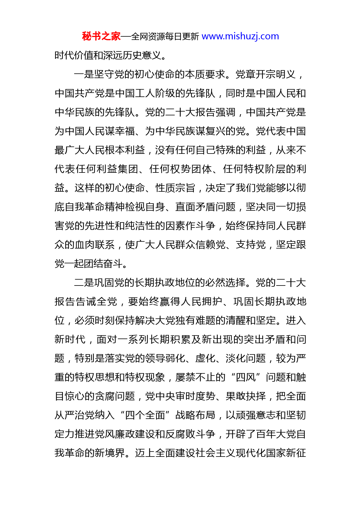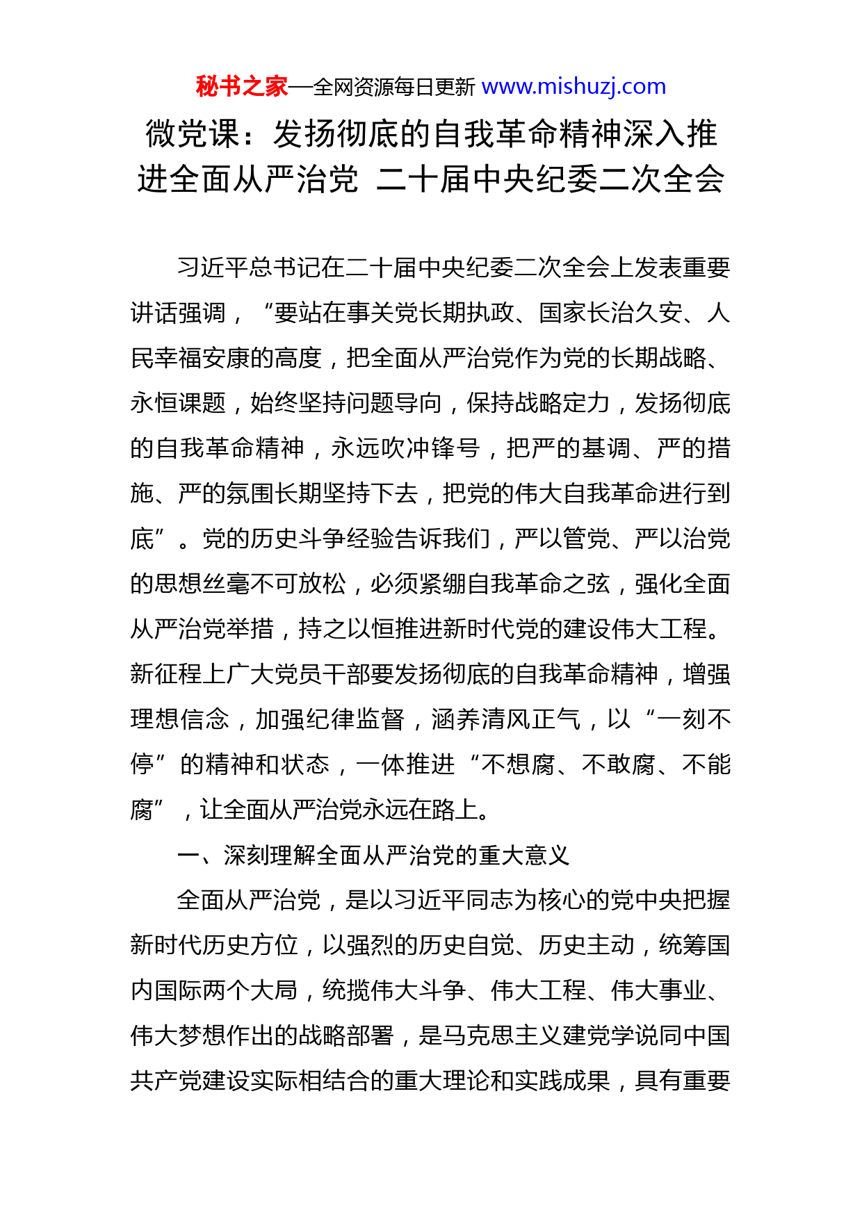 秘书之家—全网资源每日更新www.mishuzj.com微党课:发扬彻底的自我革命精神深入推进全面从严治党二十届中央纪委二次全会习近平总书记在二十届中央纪委二次全会上发表重要讲话强调,“要站在事关党长期执政、国家长治久安、人民幸福安康的高度,把全面从严治党作为党的长期战略、永恒课题,始终坚持问题导向,保持战略定力,发扬彻底的自我革命精神,永远吹冲锋号,把严的基调、严的措施、严的氛围长期坚持下去,把党的伟大自我革命进行到底”。党的历史斗争经验告诉我们,严以管党、严以治党的思想丝毫不可放松,必须紧绷自我革命之弦,强化全面从严治党举措,持之以恒推进新时代党的建设伟大工程。新征程上广大党员干部要发扬彻底的自我革命精神,增强理想信念,加强纪律监督,涵养清风正气,以“一刻不停”的精神和状态,一体推进“不想腐、不敢腐、不能腐”,让全面从严治党永远在路上。一、深刻理解全面从严治党的重大意义全面从严治党,是以习近平同志为核心的党中央把握新时代历史方位,以强烈的历史自觉、历史主动,统筹国内国际两个大局,统揽伟大斗争、伟大工程、伟大事业、伟大梦想作出的战略部署,是马克思主义建党学说同中国共产党建设实际相结合的重大理论和实践成果,具有重要秘书之家—全网资源每日更新www.mishuzj.com时代价值和深远历史意义。一是坚守党的初心使命的本质要求。党章开宗明义,中国共产党是中国工人阶级的先锋队,同时是中国人民和中华民族的先锋队。党的二十大报告强调,中国共产党是为中国人民谋幸福、为中华民族谋复兴的党。党代表中国最广大人民根本利益,没有任何自己特殊的利益,从来不代表任何利益集团、任何权势团体、任何特权阶层的利益。这样的初心使命、性质宗旨,决定了我们党能够以彻底自我革命精神检视自身、直面矛盾问题,坚决同一切损害党的先进性和纯洁性的因素作斗争,始终保持同人民群众的血肉联系,使广大人民群众信赖党、支持党,坚定跟党一起团结奋斗。二是巩固党的长期执政地位的必然选择。党的二十大报告告诫全党,要始终赢得人民拥护、巩固长期执政地位,必须时刻保持解决大党独有难题的清醒和坚定。进入新时代,面对一系列长期积累及新出现的突出矛盾和问题,特别是落实党的领导弱化、虚化、淡化问题,较为严重的特权思想和特权现象,屡禁不止的“四风”问题和触目惊心的贪腐问题,党中央审时度势、果敢抉择,把全面从严治党纳入“四个全面”战略布局,以顽强意志和坚韧定力推进党风廉政建设和反腐败斗争,开辟了百年大党自我革命的新境界。迈上全面建设社会主义现代化国家新征秘书之家—全网资源每日更新www.mishuzj.com程,我们处在一个既充满挑战也充满希望的时代,必将遇到许多可以预料和难以预料的风险考验,必须增强忧患意识,做到居安思危,坚定不移把全面从严治党向纵深推进,确保党和国家长治久安。三是实现中华民族伟大复兴的根本保障。党的二十大报告指出,中国特色社会主义最本质的特征是中国共产党领导,中国特色社会主义制度的最大优势是中国共产党领导。党要团结带领人民进行伟大斗争、推进伟大事业、实现伟大梦想,必须把党建设好建设强。进入新时代,不断取得更多制度性成果和更大治理效能,坚定不移走好中国特色反腐败之路。在“两个一百年”奋斗目标历史交汇的重大时刻,党中央旗帜鲜明坚持和加强党的全面领导,坚定不移全面从严治党,校正了党和国家事业的前进航向,凝聚起团结奋斗的磅礴伟力,为实现第一个百年奋斗目标、赢得新时代中国特色社会主义历史性胜利提供了根本保证。展望新征程新任务,中华民族复兴伟业前途光明、任重道远,必须坚持全面从严治党不动摇,永葆党的先进纯洁和强大生命力。二、准确把握全面从严治党的鲜明特点党的二十大报告对新时代全面从严治党伟大实践作了深刻总结,突出强调坚持打铁必须自身硬,以“得罪千百人、不负十四亿”的使命担当祛疴治乱,反腐败斗争取得秘书之家—全网资源每日更新www.mishuzj.com压倒性胜利并全面巩固,党的自我净化、自我完善、自我革新、自我提高能力显著增强,管党治党宽松软状况得到根本扭转,风清气正的党内政治生态不断形成和发展,走过百年奋斗历程的中国共产党在革命性锻造中更加坚强有力。一是坚持政治建设为统领,确保全党集中统一。党的二十大报告指出,中国共产党是最高政治领导力量,坚持党中央集中统一领导是最高政治原则。进入新时代,我们党把政治建设作为根本性建设,严明政治纪律,强化政治监督,推动全党深刻领悟“两个确立”的决定性意义,增强“四个意识”,坚定“四个自信”,做到“两个维护”,把党的领导落实到统筹推进“五位一体”总体布局和协调推进“四个全面”战略布局之中,确保党中央权威和集中统一领导,确保党发挥总揽全局、协调各方的领导核心作用,我们这个拥有9600多万名党员的马克思主义政党更加团结统一。二是坚持落实中央八项规定精神不动摇,以钉钉子精神纠治“四风”、树立新风。党的二十大报告强调,党风问题关系执政党的生死存亡。新时代全面从严治党从制定和落实中央八项规定开局破题,锲而不舍、久久为功,抓铁有痕、踏石留印,刹住了一些长期没有刹住的歪风,纠治了