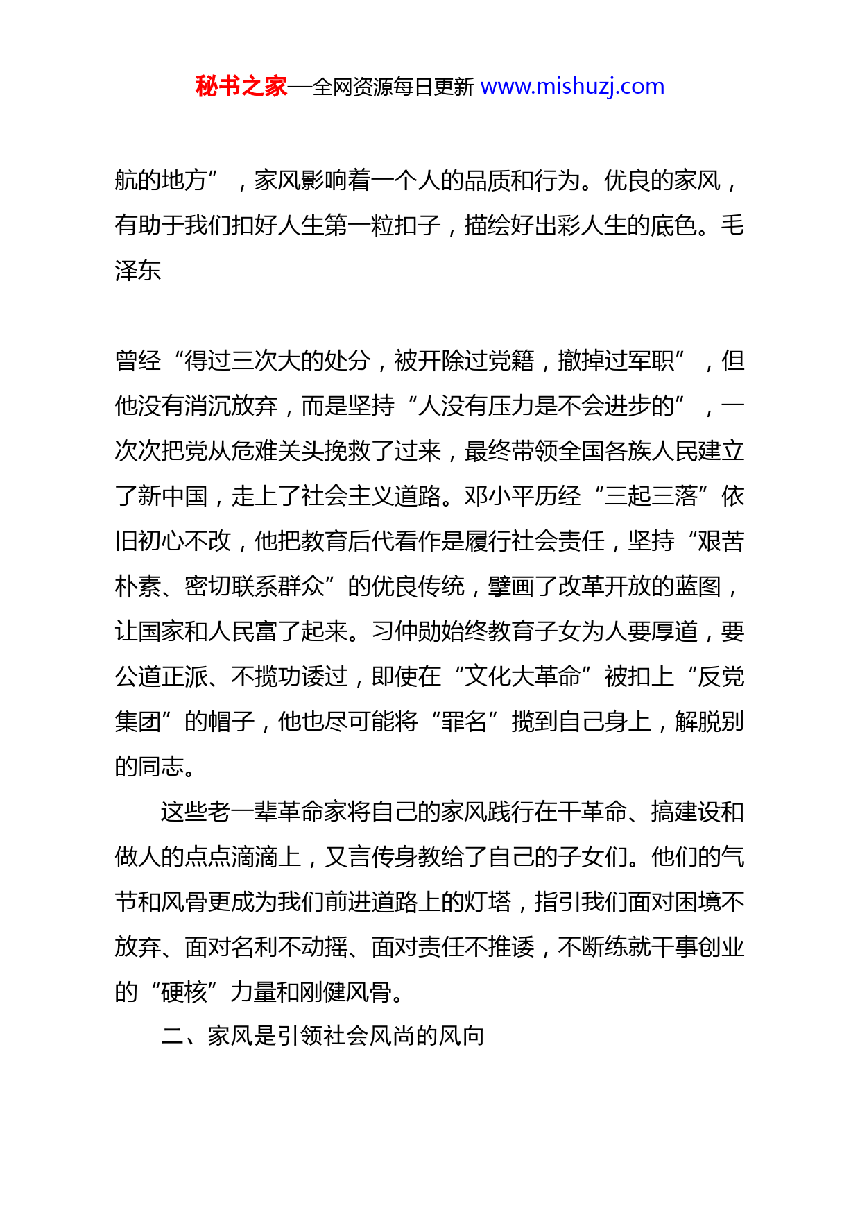 秘书之家—全网资源每日更新www.mishuzj.com微党课:让优良家风点亮万家灯火忠厚传家久,诗书济世长。从《大学》中格物、致知、诚意、正心、修身、齐家、治国、平天下“八目”看,欲要“治国”必先“齐家”。家庭、家教、家风,伴随着我们民族几千年的发展历程,烙印在了我们每个人的基因中。回望历史,我们有孟母三迁、岳母刺字的感人故事,也有诸葛亮诫子格言、颜氏家训、朱子家训等名篇佳作,既重言传更重身教,成了留给后人的宝贵财富。《老一辈革命家和先进模范人物好家风故事集》选取了毛泽东、周恩来、刘少奇等34位老一辈革命家和马永顺、钱学森、张富清等25位先进模范人物的家风故事共计117篇。这本书于小事中见大道,于微言中寓大义。学完让我更加深切地感受到,家庭家风是我们身体的居所和灵魂的归宿,千千万万个家庭的家风好,社会风气才会和谐美好,国家风貌才能昂扬向上。一、家风是磨砺个人风骨的磨刀石习近平总书记强调,做人,不仅要崇德向善,还要坚守骨气和气节,要有点男子汉的“血性”。家庭是一个人“梦想启秘书之家—全网资源每日更新www.mishuzj.com航的地方”,家风影响着一个人的品质和行为。优良的家风,有助于我们扣好人生第一粒扣子,描绘好出彩人生的底色。毛泽东曾经“得过三次大的处分,被开除过党籍,撤掉过军职”,但他没有消沉放弃,而是坚持“人没有压力是不会进步的”,一次次把党从危难关头挽救了过来,最终带领全国各族人民建立了新中国,走上了社会主义道路。邓小平历经“三起三落”依旧初心不改,他把教育后代看作是履行社会责任,坚持“艰苦朴素、密切联系群众”的优良传统,擘画了改革开放的蓝图,让国家和人民富了起来。习仲勋始终教育子女为人要厚道,要公道正派、不揽功诿过,即使在“文化大革命”被扣上“反党集团”的帽子,他也尽可能将“罪名”揽到自己身上,解脱别的同志。这些老一辈革命家将自己的家风践行在干革命、搞建设和做人的点点滴滴上,又言传身教给了自己的子女们。他们的气节和风骨更成为我们前进道路上的灯塔,指引我们面对困境不放弃、面对名利不动摇、面对责任不推诿,不断练就干事创业的“硬核”力量和刚健风骨。二、家风是引领社会风尚的风向秘书之家—全网资源每日更新www.mishuzj.com标党的十八大以来,习近平总书记反复强调,家风好,就能家道兴盛、和顺美满;家风差,难免殃及子孙、贻害社会。毛泽东让子女“补上劳动大学这一课”,告诫子女们学习和事业要向上看,但生活要向下看。周恩来教育晚辈们“到祖国最需要的地方去”“要求别人做到的,自己首先要做到,不能有丝毫的特殊”“三代裤”、“金银饭”、国产表、旧衣服,成了他留给晚辈们最宝贵的财富。刘少奇亲自给大女儿所在党支部写信,不同意其预备期满转正。朱德教育子女要功高不自居、位高不自私、德高不自显。面对亲戚朋友的请托,老一辈革命家和先进模范人物选择了回绝,他们心系祖国和人民,严禁搞特殊,对晚辈们的要求非常严格,不准亲人用公车、吃小灶,真正体现了“恋亲,但不为亲徇私;念旧,但不为旧谋利;济亲,但不以公济私”,树立了大公无私的风气,更引领了艰苦奋斗、自立自强、公平公正的社会风尚。反观近些年我们党查处的这些腐败分子,往往都是由家庭腐败开局,父子兵、夫妻档、兄弟帮屡见不鲜,他们把公权力变成“私人订制”,沦落成了金钱和欲望的奴隶,丢掉了骨气秘书之家—全网资源每日更新www.mishuzj.com和气节,最终难逃家毁人散、身败名裂的结局。由中我们更能看出,家风也是我们个人作风的重要体现,必须要修身正己,注重家庭、注重家教、注重家风,为子女留下宝贵的精神财富。三、家风是塑造民族风韵的基本盘优良家风建设,聚焦的是小家,着眼的却是大家。一个社会由不同的家庭组成,一个民族的发展轨迹由无数个家庭的传承写就。家国情怀是我们民族的深沉底蕴,无数革命先辈和先进人物秉承“不因年少不望远、不因位卑忘忧国,不因力弱惜出力”的理念,为国家富强和民族复兴,躬身入局、矢志奋斗。蔡和森带领一家三代人克服种种困难努力求学,投身革命事业的故事,令无数人为之感动振奋。钱学森放弃国外优厚待遇毅然回到祖国建设新中国,标注了航空报国的新高度。他姓“钱”但不爱钱,他用自己的稿费为学生购买计算尺,他毕生都在践行“利在天下必谋之”的家训。常香玉变卖房产、辛苦义演为国家捐献战斗机。时传祥三代人坚守“宁肯一人脏,换来万家净”的服务人民的宗旨。焦裕禄因为儿子焦国庆看了一场“白戏”建议县委起草了不准任何干部特殊化的通知。各行各业人的家风最终融汇成了我们民族独特的风韵。正是这一特质,使我们能够战胜一切艰难险阻,在苦难中书写辉秘书之家—全网资源每日更新www.mishuzj.com煌,于困境中开辟新境界。四、家风是成就国家风貌的催化剂天下之本在国,国之本在家。家是最小国,国是千万家。家风的“家”,既是家庭的“家”,更是国家的“家”。毛泽东在母亲冥诞时在火炉边召开的家庭会议中提出,“为了建立美好的家,让千千万万人有一个好家,我们只得离开这个家。”此后,毛家先后有六位烈士相继为革命英勇牺牲,但毛主席从未后悔当年那次家庭会议的决定。他在送别堂弟毛泽连时提