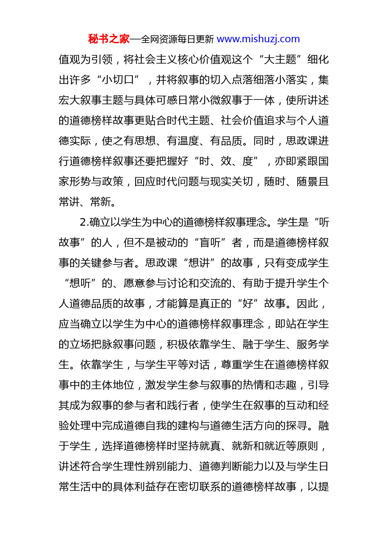 秘书之家—全网资源每日更新www.mishuzj.com思政教师培训材料:讲好道德榜样故事习近平总书记提倡用讲故事的方式传颂榜样,在历史背景的宏观视域、历史过程的整体维度以及历史叙事的时代局限等诸多现实困境中,思想政治理论课(以下简称“思政课”)要讲好道德榜样故事,推动实现用榜样的力量对学生进行德育,就需要我们在进行道德榜样叙事时,坚持政治建设导向、破立结合导向、技术赋能导向及实践转化导向。一、政治建设导向:坚持价值性和生本性的统一政治建设导向,注重的是价值性和生本性的统一。这一导向要求思政课进行道德榜样叙事时既要坚持正确的政治方向,又要以学生为本,做到牢记初心,以社会主义核心价值观为引领,保证道德榜样叙事与社会发展的历史进程、国家主流意识形态一致,与马克思主义理论逻辑一致。1.坚持以社会主义核心价值观为引领。思政课进行道德榜样叙事,是为了“培养一代又一代拥护中国共产党领导和我国社会主义制度、立志为中国特色社会主义事业奋斗终身的有用人才”,因而须以习近平新时代中国特色社会主义思想为根本遵循,以构建社会主义核心价值体系为重要任务。为此,道德榜样叙事自然也要以社会主义核心价秘书之家—全网资源每日更新www.mishuzj.com值观为引领,将社会主义核心价值观这个“大主题”细化出许多“小切口”,并将叙事的切入点落细落小落实,集宏大叙事主题与具体可感日常小微叙事于一体,使所讲述的道德榜样故事更贴合时代主题、社会价值追求与个人道德实际,使之有思想、有温度、有品质。同时,思政课进行道德榜样叙事还要把握好“时、效、度”,亦即紧跟国家形势与政策,回应时代问题与现实关切,随时、随景且常讲、常新。2.确立以学生为中心的道德榜样叙事理念。学生是“听故事”的人,但不是被动的“盲听”者,而是道德榜样叙事的关键参与者。思政课“想讲”的故事,只有变成学生“想听”的、愿意参与讨论和交流的、有助于提升学生个人道德品质的故事,才能算是真正的“好”故事。因此,应当确立以学生为中心的道德榜样叙事理念,即站在学生的立场把脉叙事问题,积极依靠学生、融于学生、服务学生。依靠学生,与学生平等对话,尊重学生在道德榜样叙事中的主体地位,激发学生参与叙事的热情和志趣,引导其成为叙事的参与者和践行者,使学生在叙事的互动和经验处理中完成道德自我的建构与道德生活方向的探寻。融于学生,选择道德榜样时坚持就真、就新和就近等原则,讲述符合学生理性辨别能力、道德判断能力以及与学生日常生活中的具体利益存在密切联系的道德榜样故事,以提秘书之家—全网资源每日更新www.mishuzj.com升学生对道德榜样及其故事的亲近感、认同感、获得感与满足感,努力为学生解决实际道德困惑和思想难题。服务学生,在道德榜样叙事中将“陈情”与“说理”相结合,不给出特定故事的“标准答案”,而是通过倾听引导、辩论研讨、比较澄清,告诉学生应该肯定和赞扬什么,必须反对和否定什么,为学生提供积极、健康和充满智慧的精神食粮,提升其道德审美能力和审美境界,满足学生的成长成才发展和对美好生活的向往。二、破立结合导向:坚持建设性与批判性的统一破立结合导向,注重的是建设性与批判性的统一。这一导向要求,思政课进行道德榜样叙事要善于“对弈”,将对历史经典道德榜样叙事的“立”和对道德榜样历史虚无主义叙事的“破”结合起来,做到既凝练经典道德榜样的伟大精神内核,重构历史经典道德榜样叙事,同时,又能科学辨识并有效抵御道德榜样的历史虚无主义叙事。1.凝练精神、重构历史经典道德榜样叙事。道德榜样是某个阶段社会道德的写照,镌刻着特定的时代色彩和发展印记,其示范、引领、调整和鼓励作用渐趋弱化是社会发展的必然趋势。但是,总有些经典道德榜样能够冲破历史时空牵制,以其独特的人格魅力和可贵的精神品质,产生持续深远的影响力、感召力和实践指导性,为人民群众提供精神支撑和道德滋养。基于此,在立足、关切、回应新秘书之家—全网资源每日更新www.mishuzj.com时代价值呼唤的基础上,应当对经典道德榜样进行精神凝练和叙事重构,完成经典道德榜样叙事的现代性转化,从生活细节中挖掘经典道德榜样的鲜活个性,展现经典道德榜样的鲜明特质和精神风采,使人们对经典道德榜样心存“温情与敬意”,感受到经典道德榜样身上所蕴含的坚定理想信念和崇高精神境界,并在与经典道德榜样的碰撞、沟通和审视的过程中,完成两者之间的跨时空对话和深度思想交流,身体力行地将榜样精神、道德基因传承下去。2.科学辨识道德榜样的历史虚无主义叙事。思政课进行道德榜样叙事,要有敢于斗争的风骨、气节、操守、胆魄,勇于对历史虚无主义“亮剑”,客观还原历史虚无主义涉及的道德榜样故事的历史背景及真相,组织学生参与讨论、交流并进行科学辨识,努力提升学生的理解力、认知力和批判力,不断化解历史虚无主义的渗透力、攻击力和拆解力。同时,还要提升历史道德榜样叙事的现代性。道德榜样可能是历史的,但他们身上所承载的精神并不独属于某个时代,而是人类共同的财富且能够为人类所共享。但是,这种叙事传递必须符合时代特质,保证叙事主题和呈现方式的现代性。这就要求