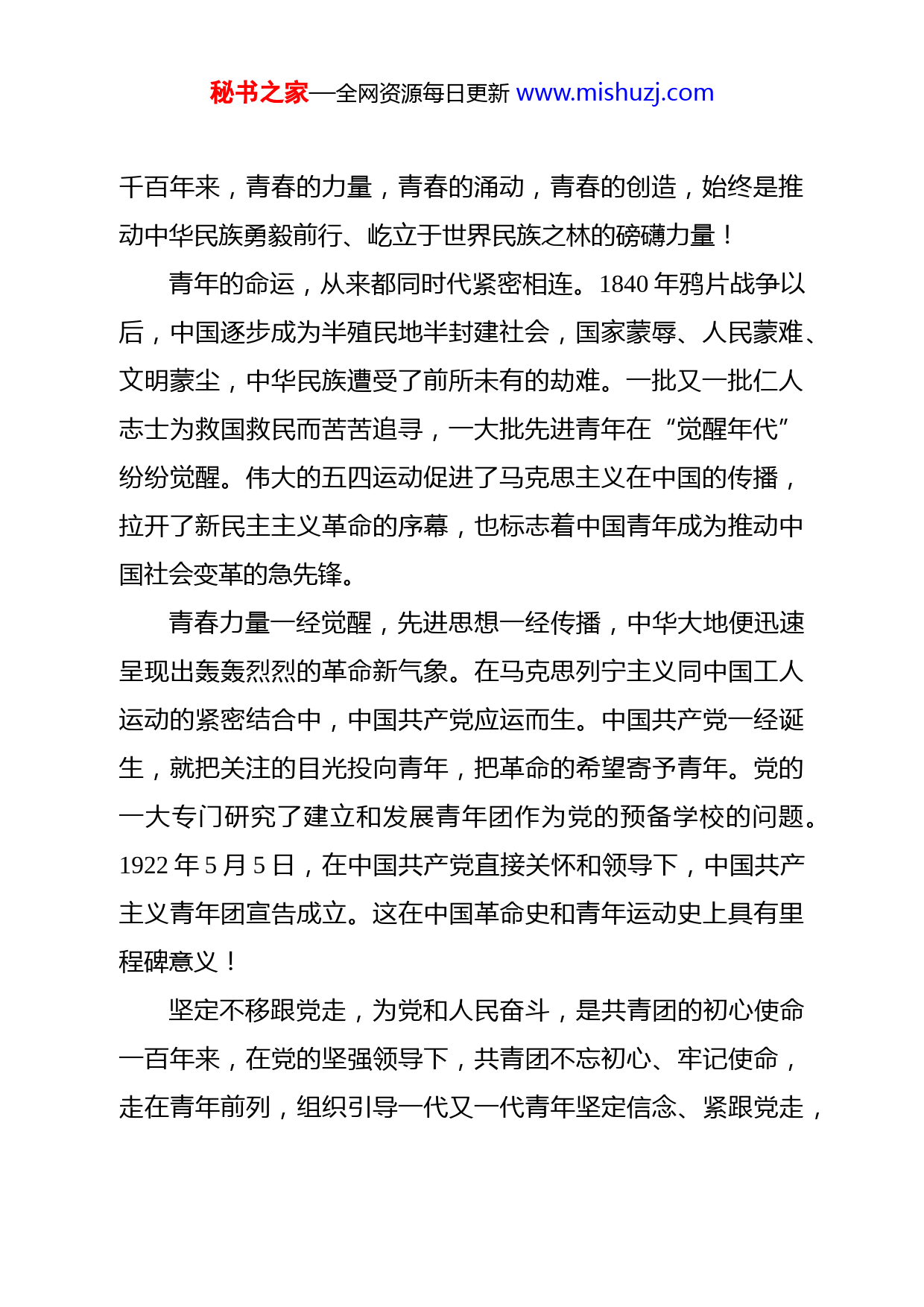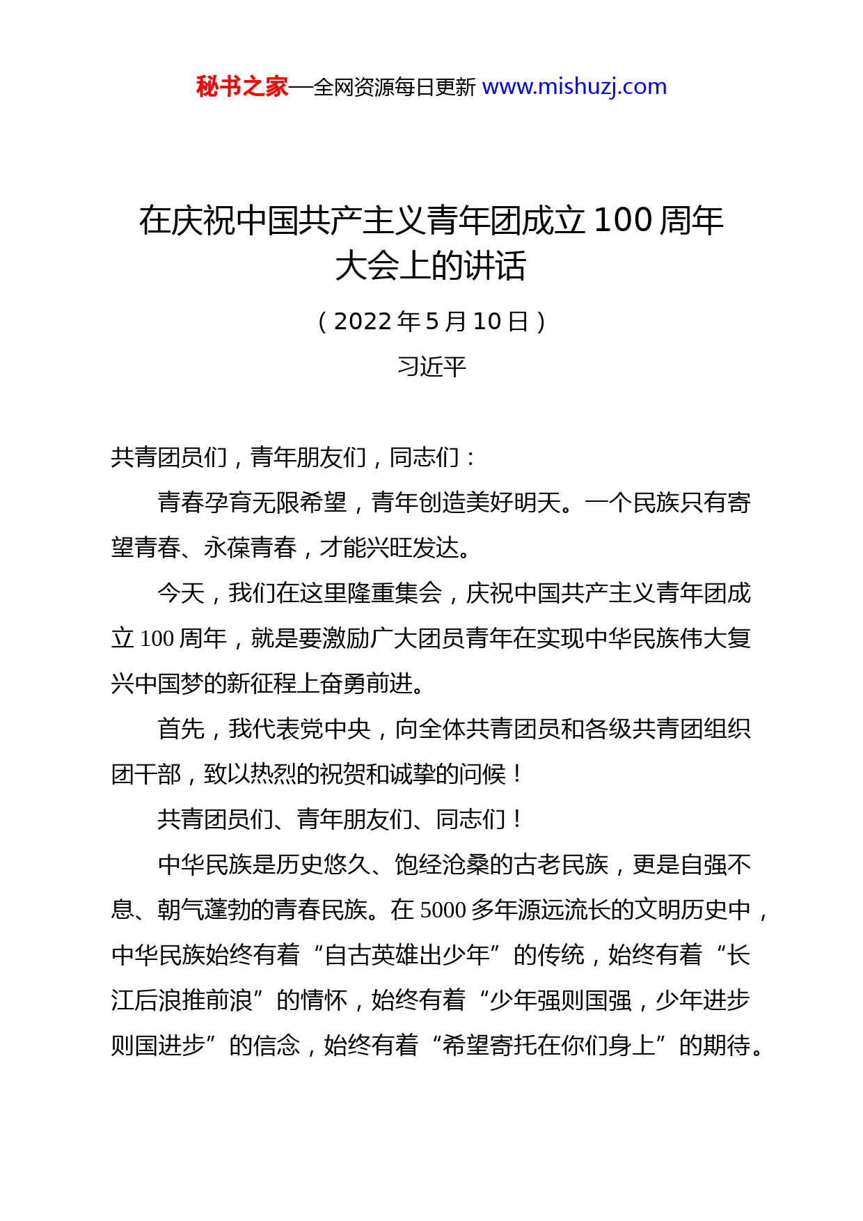 秘书之家—全网资源每日更新www.mishuzj.com在庆祝中国共产主义青年团成立100周年大会上的讲话(2022年5月10日)习近平共青团员们,青年朋友们,同志们:青春孕育无限希望,青年创造美好明天。一个民族只有寄望青春、永葆青春,才能兴旺发达。今天,我们在这里隆重集会,庆祝中国共产主义青年团成立100周年,就是要激励广大团员青年在实现中华民族伟大复兴中国梦的新征程上奋勇前进。首先,我代表党中央,向全体共青团员和各级共青团组织团干部,致以热烈的祝贺和诚挚的问候!共青团员们、青年朋友们、同志们!中华民族是历史悠久、饱经沧桑的古老民族,更是自强不息、朝气蓬勃的青春民族。在5000多年源远流长的文明历史中,中华民族始终有着“自古英雄出少年”的传统,始终有着“长江后浪推前浪”的情怀,始终有着“少年强则国强,少年进步则国进步”的信念,始终有着“希望寄托在你们身上”的期待。秘书之家—全网资源每日更新www.mishuzj.com千百年来,青春的力量,青春的涌动,青春的创造,始终是推动中华民族勇毅前行、屹立于世界民族之林的磅礴力量!青年的命运,从来都同时代紧密相连。1840年鸦片战争以后,中国逐步成为半殖民地半封建社会,国家蒙辱、人民蒙难、文明蒙尘,中华民族遭受了前所未有的劫难。一批又一批仁人志士为救国救民而苦苦追寻,一大批先进青年在“觉醒年代”纷纷觉醒。伟大的五四运动促进了马克思主义在中国的传播,拉开了新民主主义革命的序幕,也标志着中国青年成为推动中国社会变革的急先锋。青春力量一经觉醒,先进思想一经传播,中华大地便迅速呈现出轰轰烈烈的革命新气象。在马克思列宁主义同中国工人运动的紧密结合中,中国共产党应运而生。中国共产党一经诞生,就把关注的目光投向青年,把革命的希望寄予青年。党的一大专门研究了建立和发展青年团作为党的预备学校的问题。1922年5月5日,在中国共产党直接关怀和领导下,中国共产主义青年团宣告成立。这在中国革命史和青年运动史上具有里程碑意义!坚定不移跟党走,为党和人民奋斗,是共青团的初心使命一百年来,在党的坚强领导下,共青团不忘初心、牢记使命,走在青年前列,组织引导一代又一代青年坚定信念、紧跟党走,秘书之家—全网资源每日更新www.mishuzj.com为争取民族独立、人民解放和实现国家富强、人民幸福而贡献力量,谱写了中华民族伟大复兴进程中激昂的青春乐章。新民主主义革命时期,共青团广泛传播马克思主义,用先进思想启迪青年觉醒、凝聚青春力量,团结带领广大团员青年踊跃投身反帝反封建的工人运动、农民运动、学生运动,积极参加党领导的革命武装,在打倒军阀、抗日救亡、推翻国民党反动统治的伟大斗争中冲锋陷阵,展现出不怕牺牲、浴血斗争的精神风貌。刀光剑影,枪林弹雨,广大团员青年对党忠贞不渝,经受住了生与死的考验,为中国革命胜利贡献了青春、建立了重要功勋!社会主义革命和建设时期,共青团积极参与中华民族有史以来最为广泛而深刻的社会变革,组建青年突击队、青年垦荒队、青年扫盲队,开展学雷锋活动,团结带领广大团员青年激发“敢教日月换新天”的豪情,喊出“把青春献给祖国”的响亮口号,向科学进军,向困难进军,向荒原进军,展现出敢于拼搏、辛勤劳动的精神风貌。艰难困苦,千难万险,广大团员青年主动作为、勇挑重担,哪里最困难、哪里就有团的旗帜,哪里有需要、哪里就有团员青年的身影,为祖国建设贡献了青春、建立了重要功勋!改革开放和社会主义现代化建设新时期,共青团适应党和秘书之家—全网资源每日更新www.mishuzj.com国家工作中心战略转移,解放思想,锐意进取,广泛开展争当新长征突击手、“五讲四美三热爱”、希望工程、青年志愿者、青年文明号、保护母亲河等一大批青春气息浓烈的创造性活动,团结带领广大团员青年发出“团结起来、振兴中华”的时代强音,在现代化建设各条战线上勇立潮头,展现出敢闯敢干、引领风尚的精神风貌。革故鼎新,建设四化,广大团员青年勇作改革闯将,开风气之先,为改革开放和社会主义现代化建设贡献了青春、建立了重要功勋!中国特色社会主义新时代,共青团积极投身伟大斗争、伟大工程、伟大事业、伟大梦想波澜壮阔的实践,坚持守正创新、踔厉奋发,全面深化自身改革,团结带领广大团员青年在脱贫攻坚战场摸爬滚打,在科技攻关岗位奋力攀登,在抢险救灾前线冲锋陷阵,在疫情防控一线披甲出征,在奥运竞技赛场奋勇争先,在保卫祖国哨位威武守护,在党和人民最需要的时刻冲得出来、顶得上去,展现出自信自强、刚健有为的精神风貌。“清澈的爱,只为中国”,成为当代中国青年发自内心的最强音。伟大梦想,伟大使命,广大团员青年自觉担当重任,深入基层一线,让青春在实现中华民族伟大复兴的中国梦中绽放异彩,为党和国家事业取得历史性成就、发生历史性变革贡献了青春、建立了重要功勋!秘书之家—全网资源每日更新www.mishuzj.com时代各有不同,青春一脉相承。一百年来,中国共青团始终与党同心、跟党奋斗,团结带领广大团员青年把忠诚书写在党和人民事业中,把青春播撒在民族复兴的征程上,把光荣镌刻在历史行进的史册里。历史和实践充分证明,中国共青团不愧为中国青年运动的先锋队,不愧为党的忠实助手和可靠后备军!共青团员