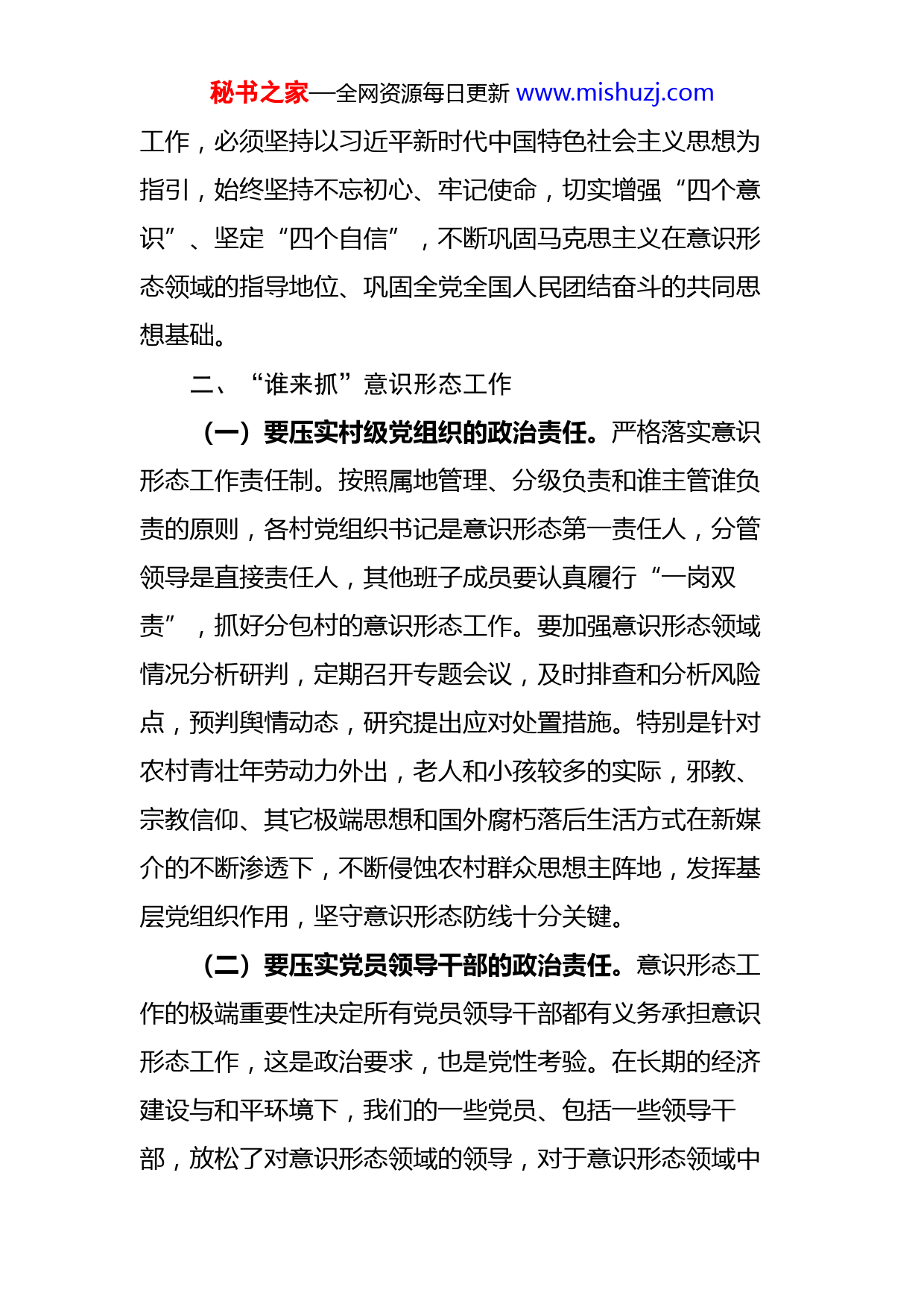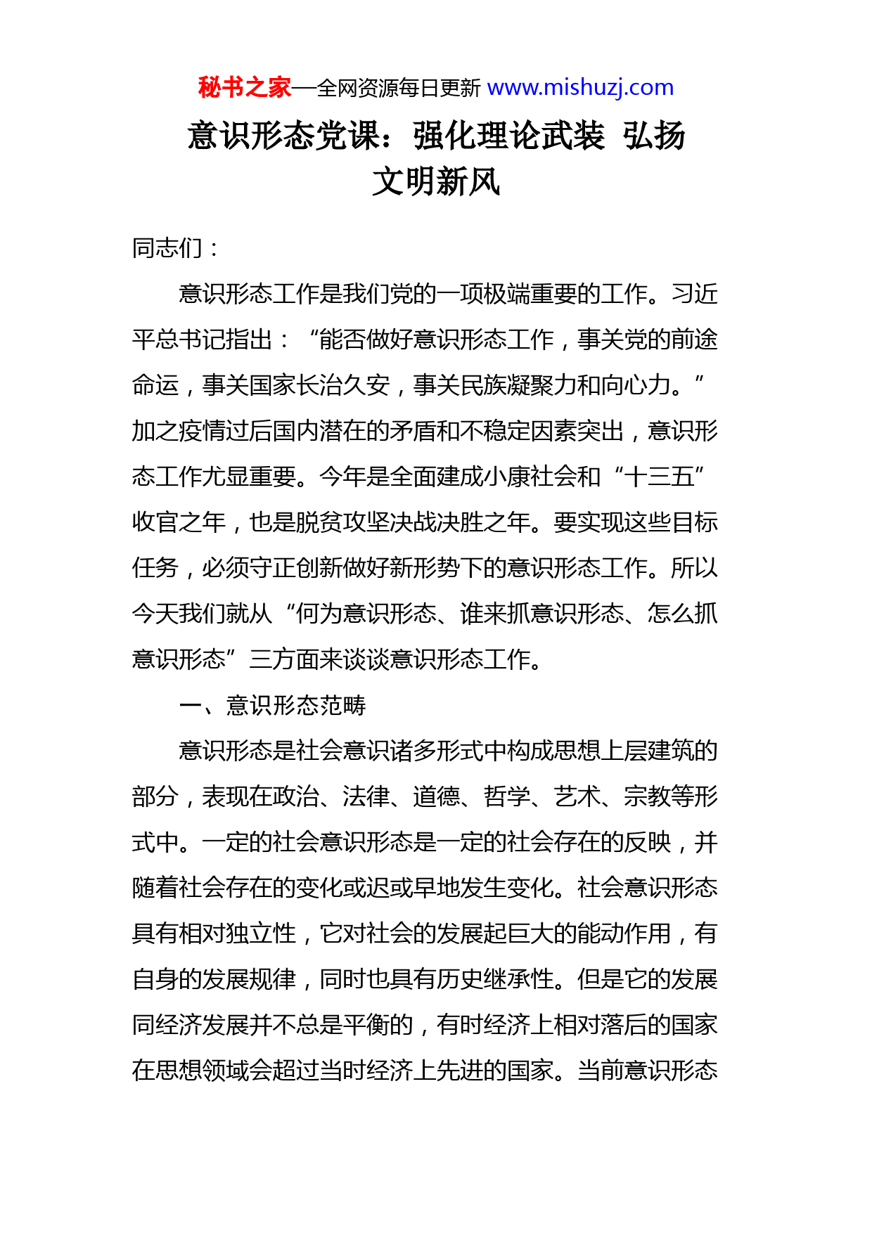 秘书之家—全网资源每日更新www.mishuzj.com意识形态党课:强化理论武装弘扬文明新风同志们:意识形态工作是我们党的一项极端重要的工作。习近平总书记指出:“能否做好意识形态工作,事关党的前途命运,事关国家长治久安,事关民族凝聚力和向心力。”加之疫情过后国内潜在的矛盾和不稳定因素突出,意识形态工作尤显重要。今年是全面建成小康社会和“十三五”收官之年,也是脱贫攻坚决战决胜之年。要实现这些目标任务,必须守正创新做好新形势下的意识形态工作。所以今天我们就从“何为意识形态、谁来抓意识形态、怎么抓意识形态”三方面来谈谈意识形态工作。一、意识形态范畴意识形态是社会意识诸多形式中构成思想上层建筑的部分,表现在政治、法律、道德、哲学、艺术、宗教等形式中。一定的社会意识形态是一定的社会存在的反映,并随着社会存在的变化或迟或早地发生变化。社会意识形态具有相对独立性,它对社会的发展起巨大的能动作用,有自身的发展规律,同时也具有历史继承性。但是它的发展同经济发展并不总是平衡的,有时经济上相对落后的国家在思想领域会超过当时经济上先进的国家。当前意识形态秘书之家—全网资源每日更新www.mishuzj.com工作,必须坚持以习近平新时代中国特色社会主义思想为指引,始终坚持不忘初心、牢记使命,切实增强“四个意识”、坚定“四个自信”,不断巩固马克思主义在意识形态领域的指导地位、巩固全党全国人民团结奋斗的共同思想基础。二、“谁来抓”意识形态工作(一)要压实村级党组织的政治责任。严格落实意识形态工作责任制。按照属地管理、分级负责和谁主管谁负责的原则,各村党组织书记是意识形态第一责任人,分管领导是直接责任人,其他班子成员要认真履行“一岗双责”,抓好分包村的意识形态工作。要加强意识形态领域情况分析研判,定期召开专题会议,及时排查和分析风险点,预判舆情动态,研究提出应对处置措施。特别是针对农村青壮年劳动力外出,老人和小孩较多的实际,邪教、宗教信仰、其它极端思想和国外腐朽落后生活方式在新媒介的不断渗透下,不断侵蚀农村群众思想主阵地,发挥基层党组织作用,坚守意识形态防线十分关键。(二)要压实党员领导干部的政治责任。意识形态工作的极端重要性决定所有党员领导干部都有义务承担意识形态工作,这是政治要求,也是党性考验。在长期的经济建设与和平环境下,我们的一些党员、包括一些领导干部,放松了对意识形态领域的领导,对于意识形态领域中秘书之家—全网资源每日更新www.mishuzj.com的风险、苗头性问题缺乏判断。党员领导干部首先要讲政治,坚定不移站稳政治立场,增强“四个意识”,坚定“四个自信”,做到“两个维护”,自觉在思想上政治上行动上同党中央保持高度一致,确保中央、省委、咸阳市委及彬州市委重大决策部署不折不扣贯彻落实,达到党性和人民性的有机统一。(三)要压实阵地管理的政治责任。宣传思想阵地,正确的思想舆论不去占领,必然被错误的思想舆论占领。真实和理性的东西少了,谎言和谬误就会丛生。因此,坚守意识形态阵地,是做好新形势下意识形态工作的紧迫任务和必然要求。要坚持主管主办和属地管理原则,切实加强对教育系统、宗教领域、文化市场、讲座讲坛、“两微一端”等重点部位和薄弱环节的监督管理。严格落实网络意识形态工作责任制,依法管网治网,坚决管控有害信息,有力批驳错误思潮。持续开展反非法反违禁和“扫黄打非”系列行动、舆论环境专项整治等行为。强化风险意识、坚持底线思维,始终保持高度警惕,不断完善重点信息发布、突发舆情应对、舆论风险评估、舆论环境整治等舆论监测处置工作机制,做好突发事件舆情处置工作,最大限度压缩噪音杂音,努力占据防范化解重大风险主动和有利地位。三、“怎么抓”意识形态工作秘书之家—全网资源每日更新www.mishuzj.com(一)要强化理论武装。建设具有强大凝聚力和引领力的社会主义意识形态,最根本的是坚持用党的创新理论武装头脑,坚持马克思主义在意识形态领域指导地位的根本制度。习近平新时代中国特色社会主义思想是马克思主义中国化的最新成果,是中国特色社会主义理论体系的重要组成部分,是被实践证明了的科学真理,是进行伟大斗争、建设伟大工程、推进伟大事业、实现伟大梦想的实践指南,是我们必须长期坚持的指导思想。我们要加强思想淬炼,学懂弄通做实习近平新时代中国特色社会主义思想,努力掌握这一思想中蕴含的马克思主义立场观点方法。坚持读原著、学原文、悟原理,推动党的创新理论学习走深走实。开展常态化宣讲、全覆盖宣讲、专家宣讲、群众宣讲、网络宣讲、文艺宣讲,赋予创新理论可触可感的温度鲜度,推动干部群众在学深学透上有新体悟、在求实求新上有新成效。聚焦理论热点,深化研究阐释,把透彻的理论讲透彻,把鲜活的理论讲鲜活,推动党的创新理论时代化大众化。用好“学习强国”学习平台,真正用党的创新理论武装头脑、指导实践、推动工作。当前尤其是要认真组织学习《习近平谈治国理政》第三卷,做到全面系统学、深入思考学、联系实际学,筑牢信仰之基、补足精神之钙、把稳思想之舵,进一步增强干部群众政治认同、思想认同、理论认同、情感